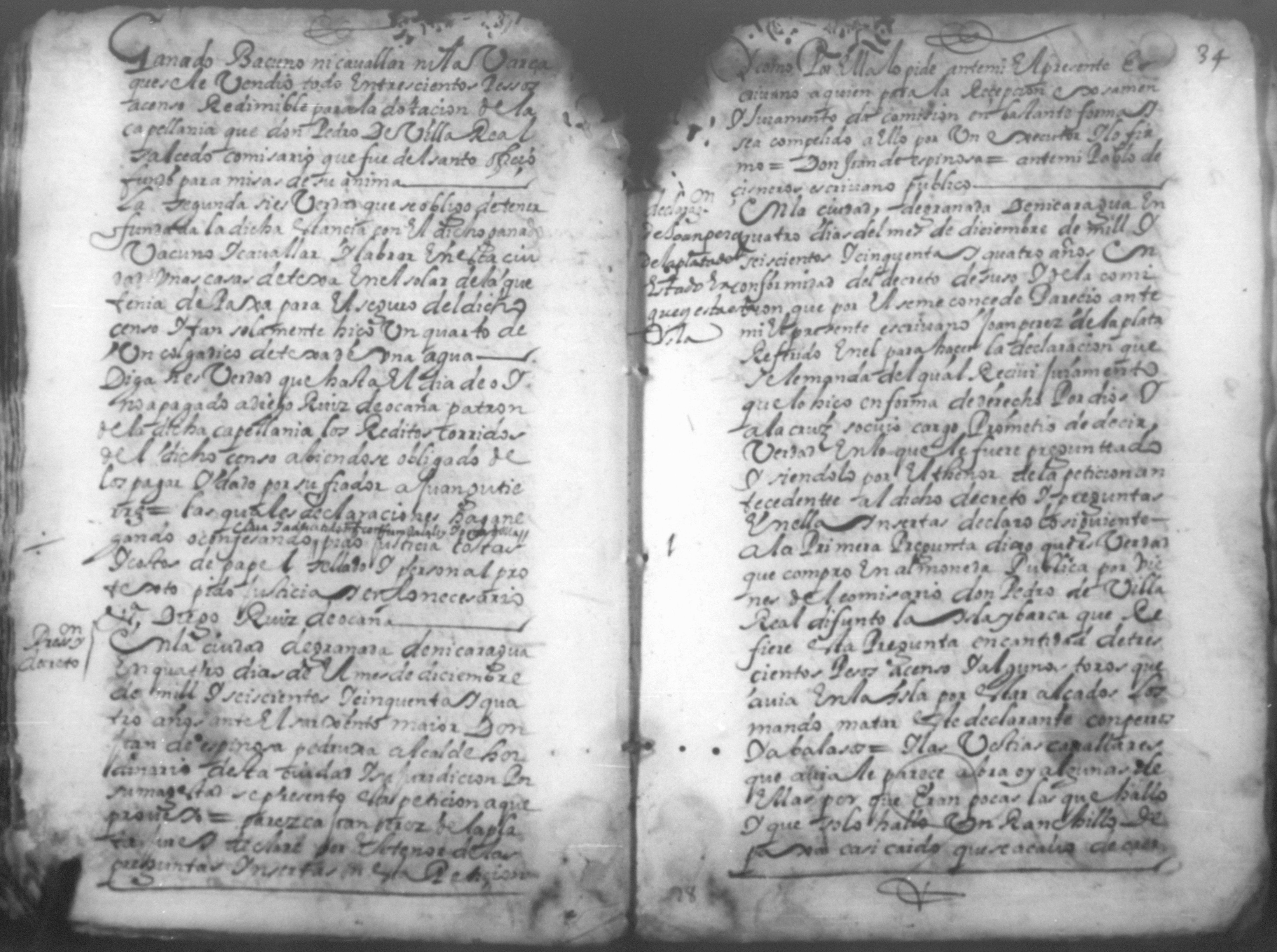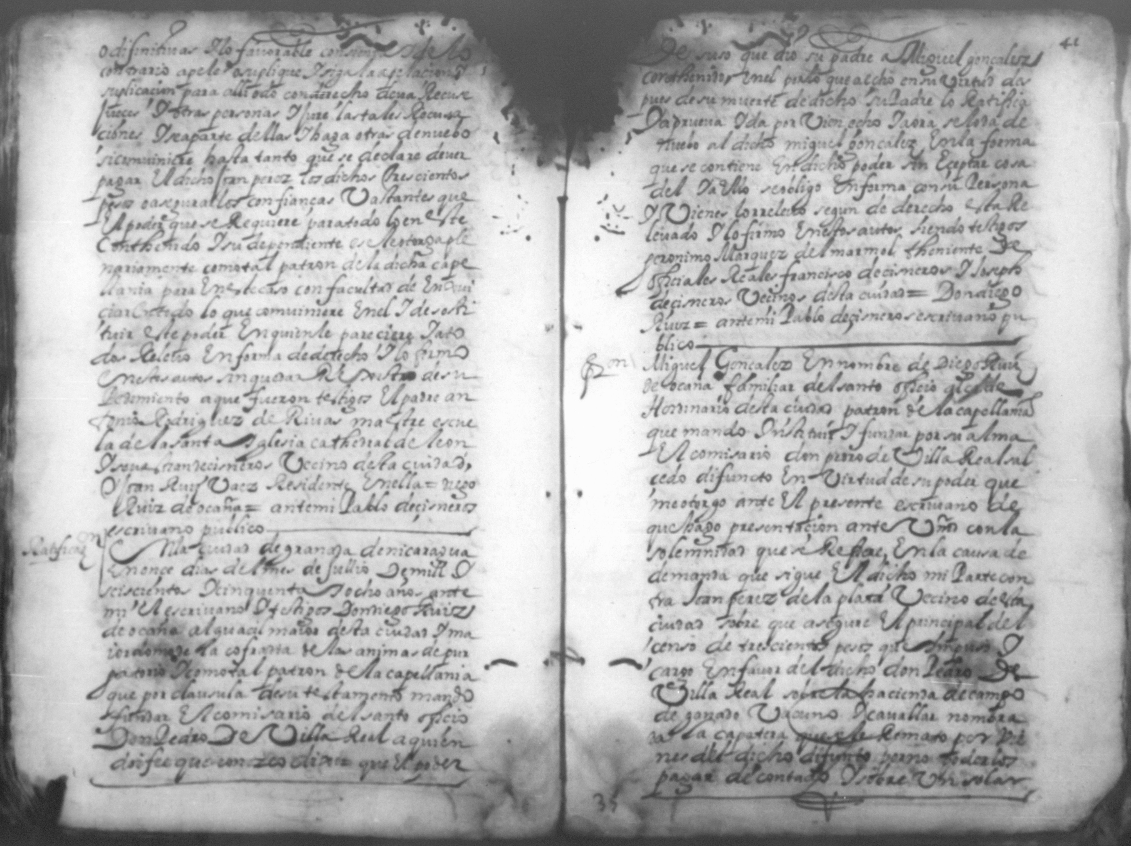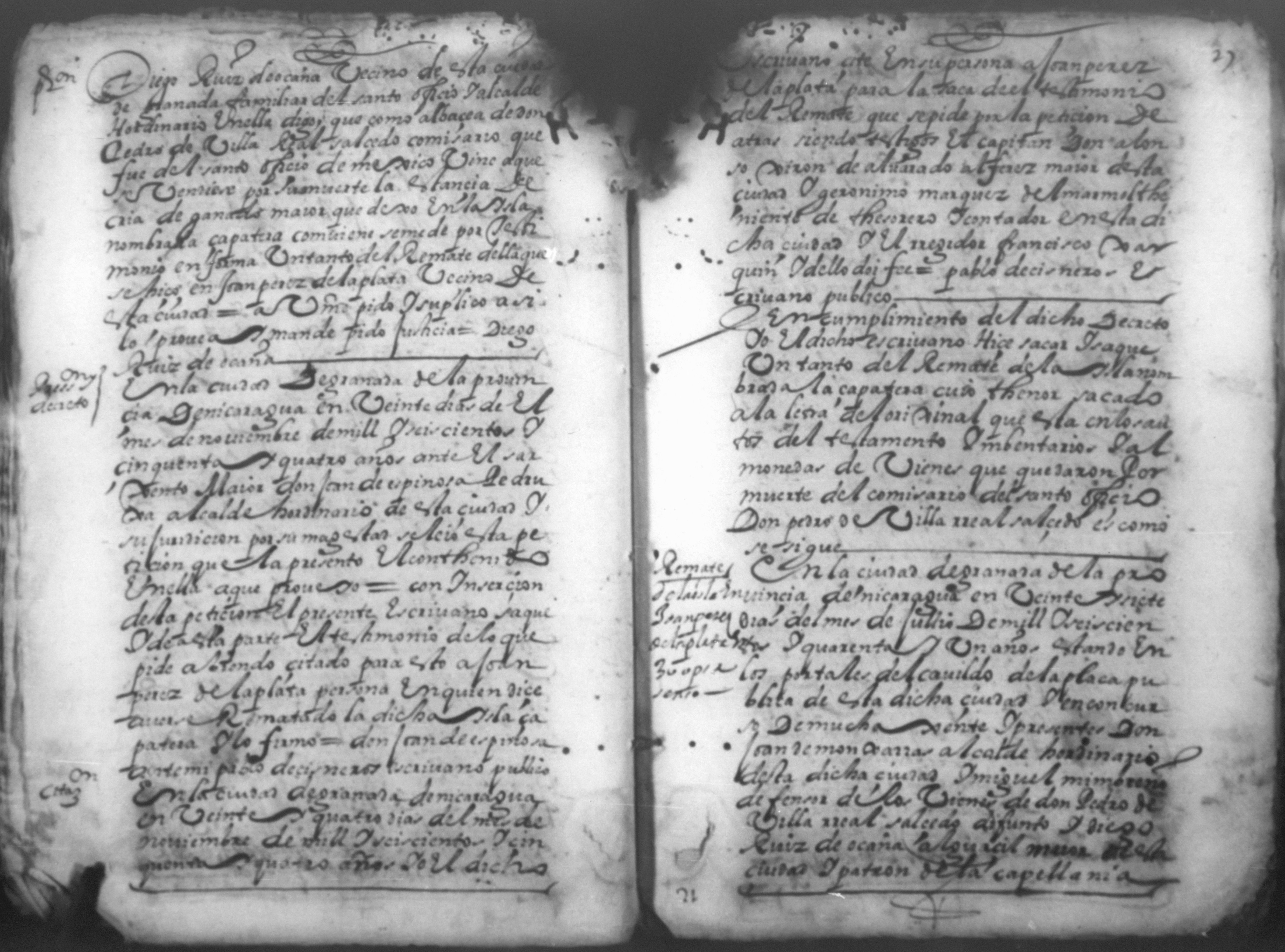 Temática: Civil de Granada. Año de 1654. Don Diego Ruiz de Ocaña, demanda ejecutivamente a Juan Pérez de la Plata y Juan Gutierrez, su fiador por los reditos de una cantidad que prestó al primero del capital de una capellanía fundada por don Pedro de Villa Real