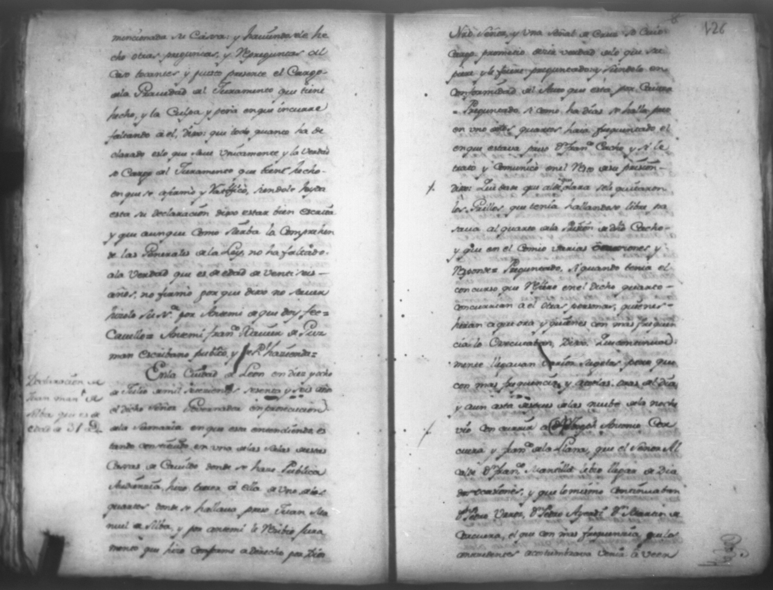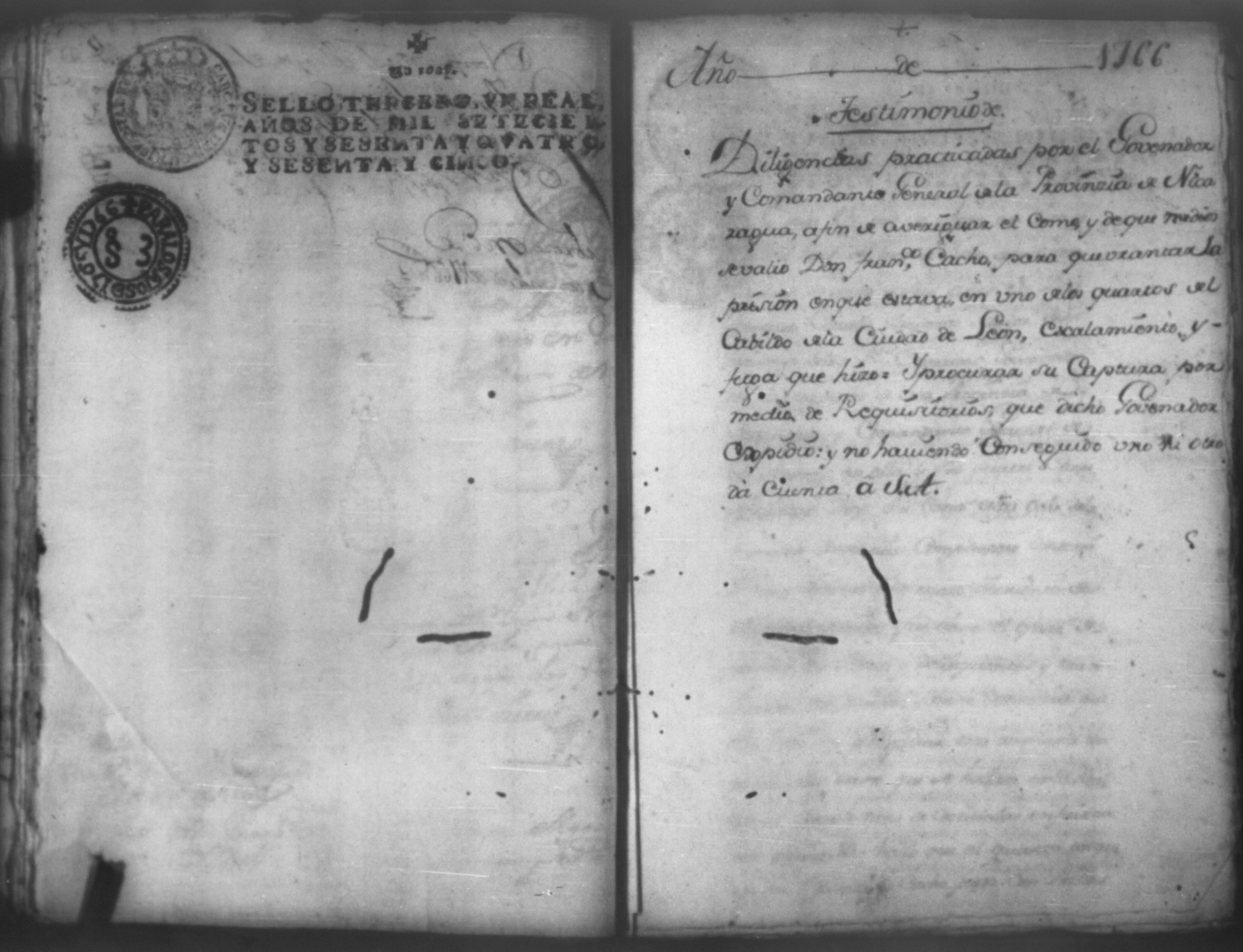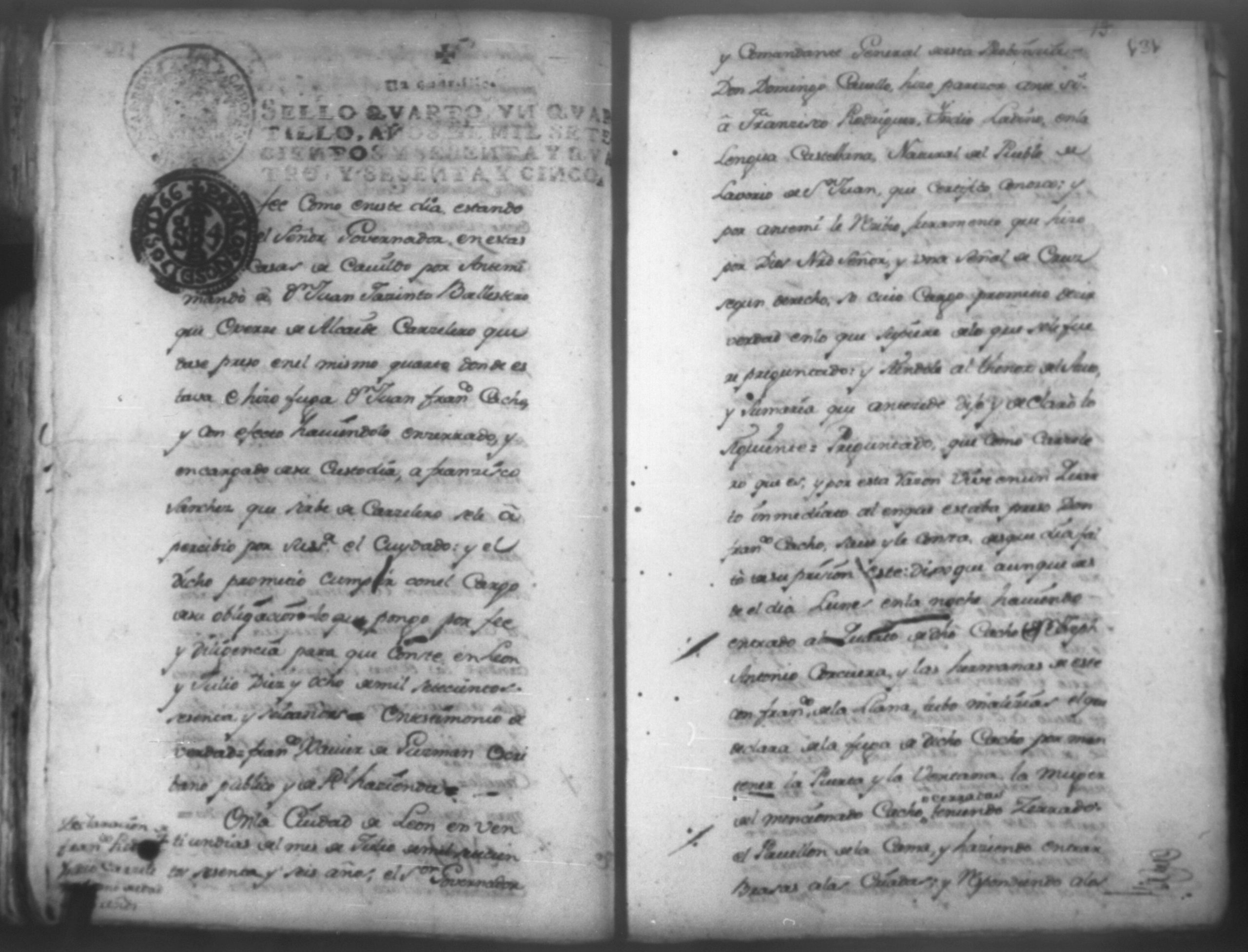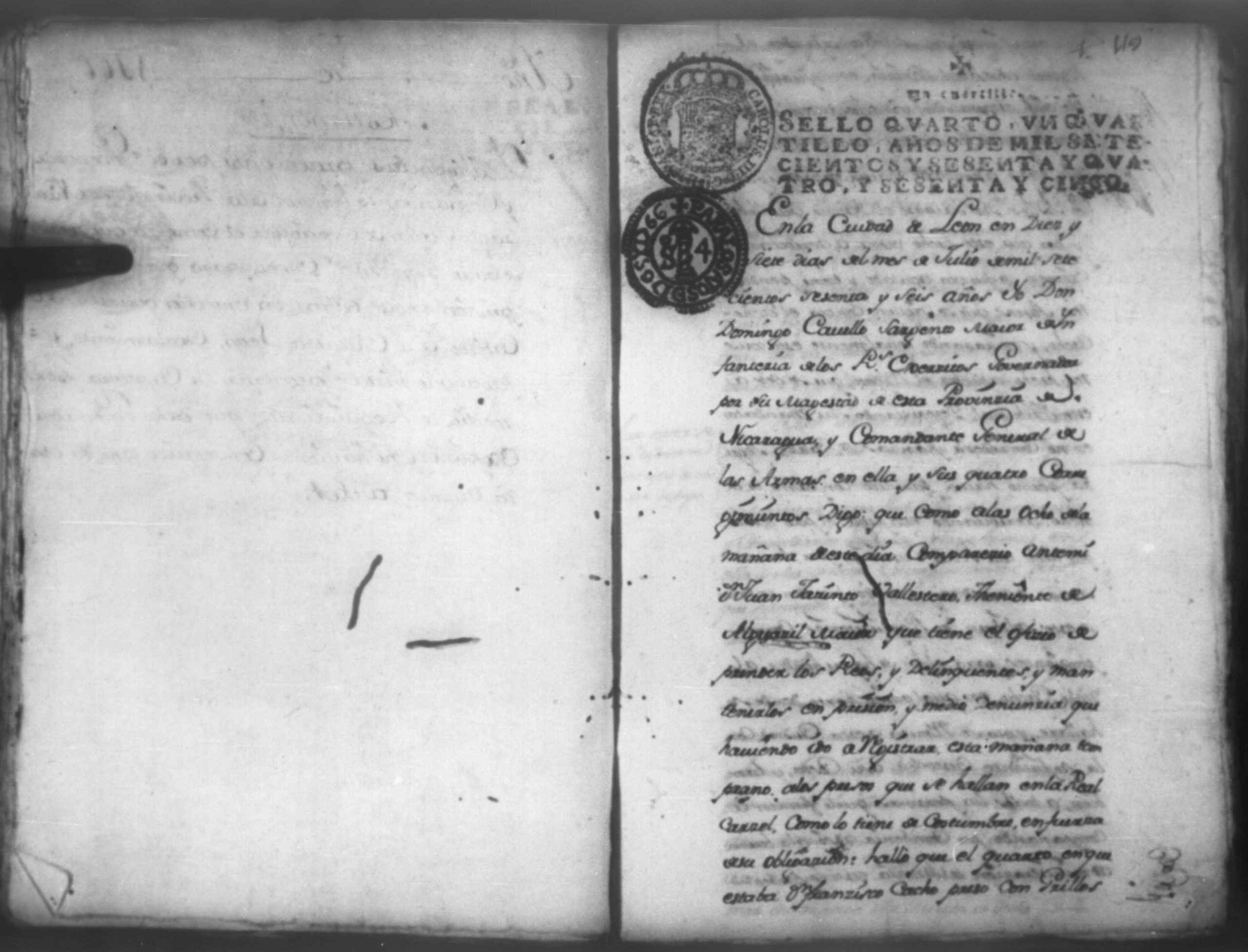 Temática: En la ciudad de Leon, Don Pedro Chamorro por aviso que le hiciero que Don Francisco Cacho vecino de esta ciudad de León queria matar a su mujer Doña Juana Garcia de la Llana mando con un criado a Don Juan Francisco Cabeza de Baca, Alcalde Ordinario segundo voto de esta referida ciudad de Leon a fin de que le auxilie para impedir la [...] denuncia que se la habia hecho