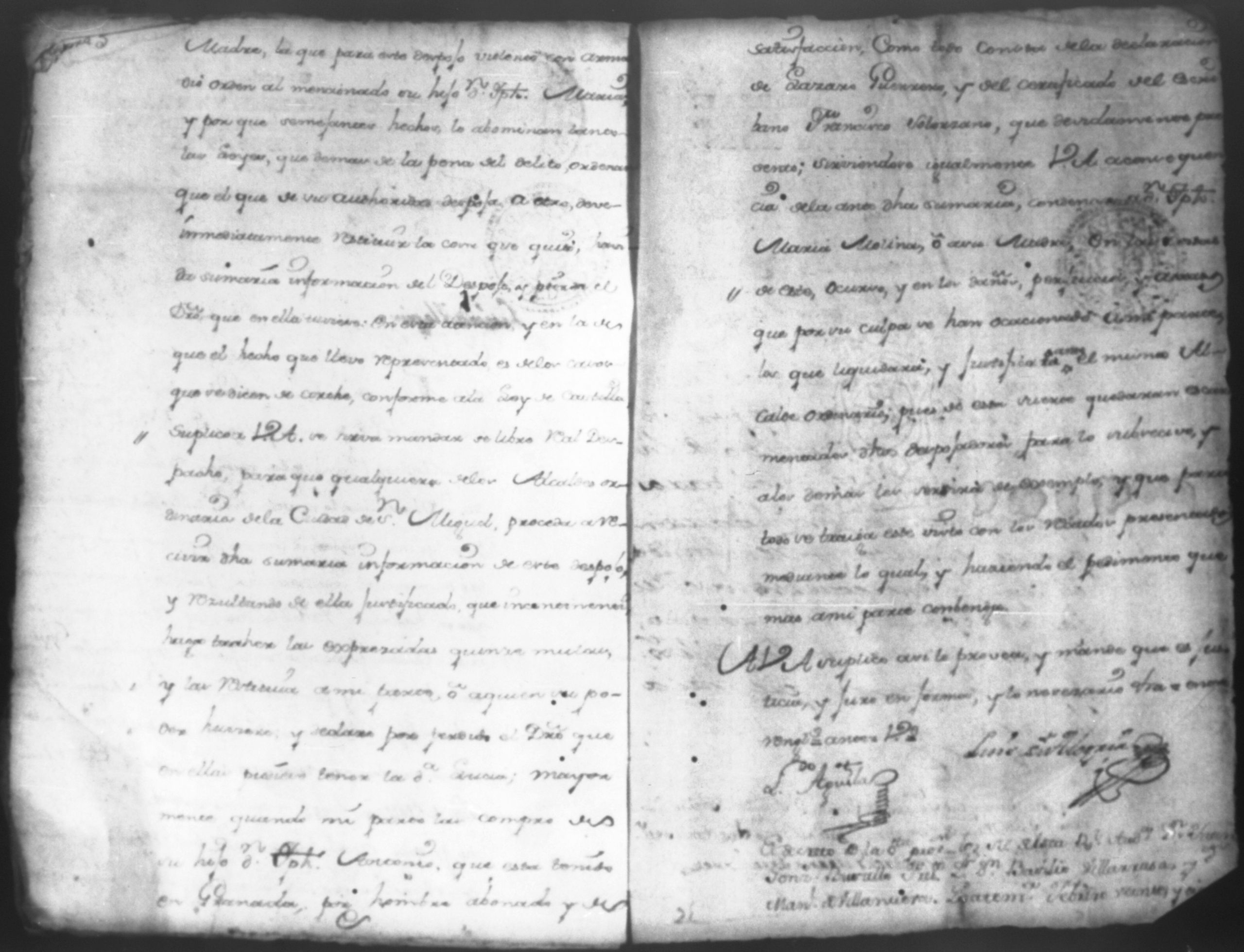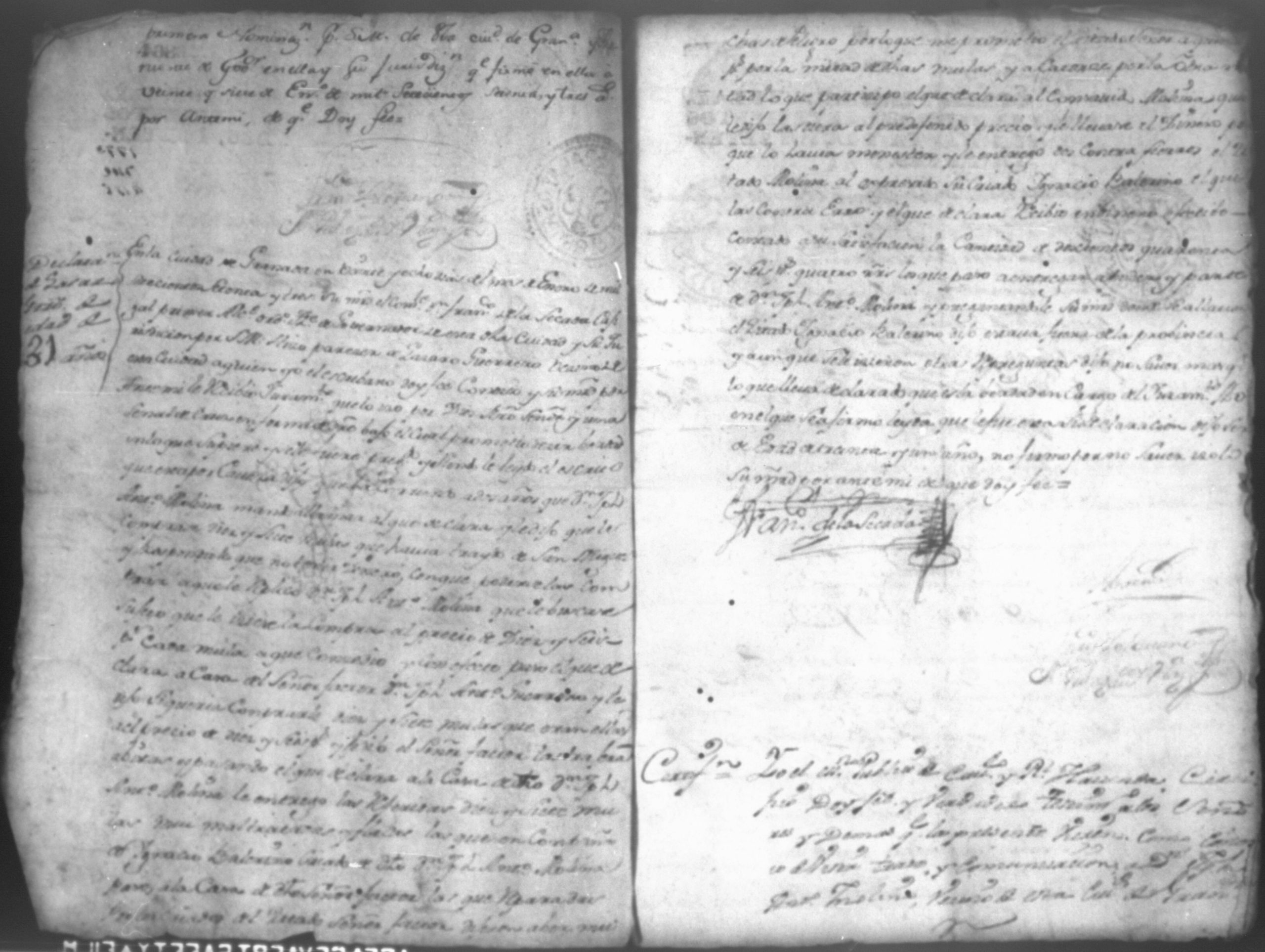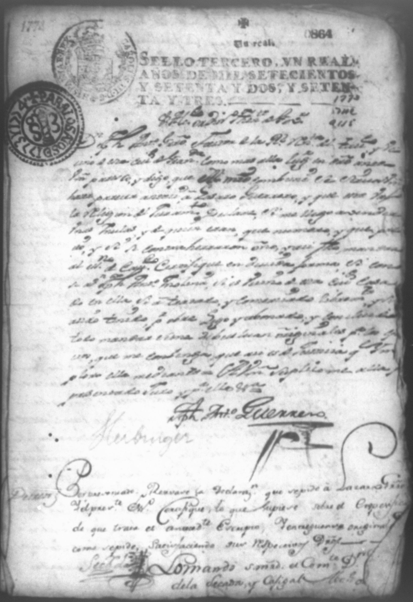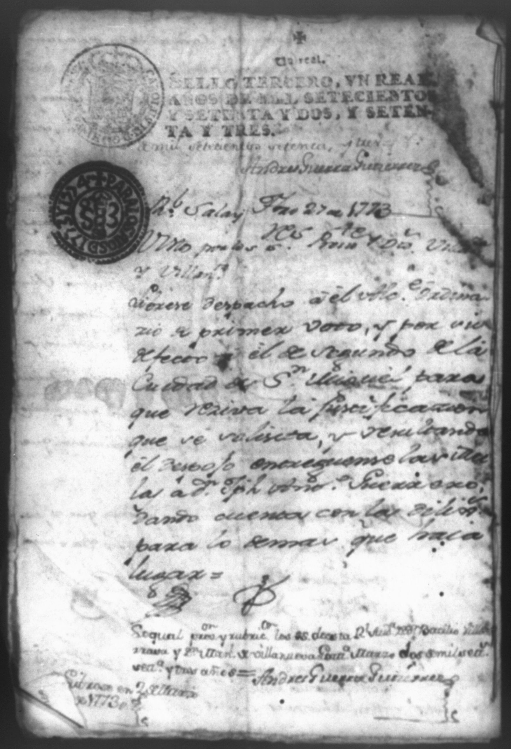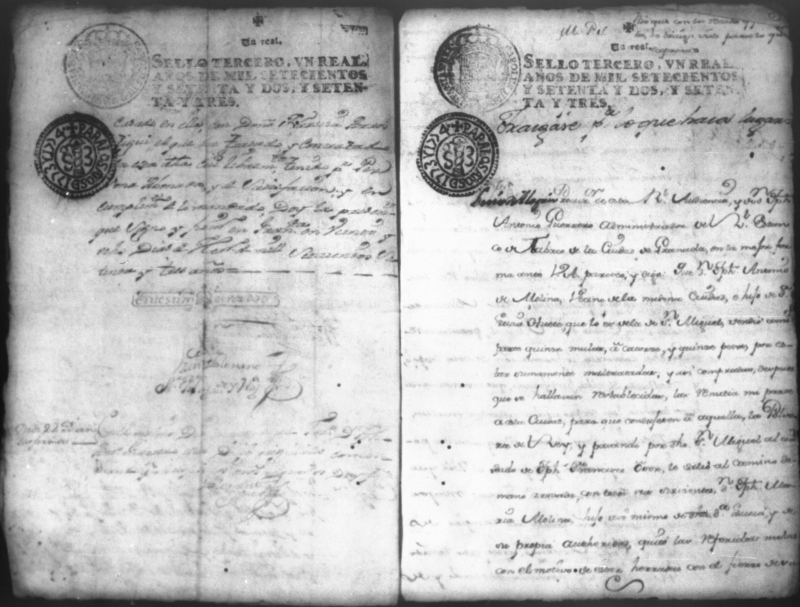 Temática: Don Joseph Antonio Guerrero, Administrador del Real Estanco de tabajo de la ciudad de Granada en la mejor forma ante V. A. paresco y digo que Don Joseph Antonio de Molina vecino de la misma ciudad, vendio a mi parte quince mulas a catorce y quince pesos. Se libra despacho al Alcalde Ordinario de primer voto de la ciudad de San Miguel para y ... el despojo entregando las mulas a Don Joseph Antonio Guerrero dando cuenta con las diligencias para lo demas que haya lugar