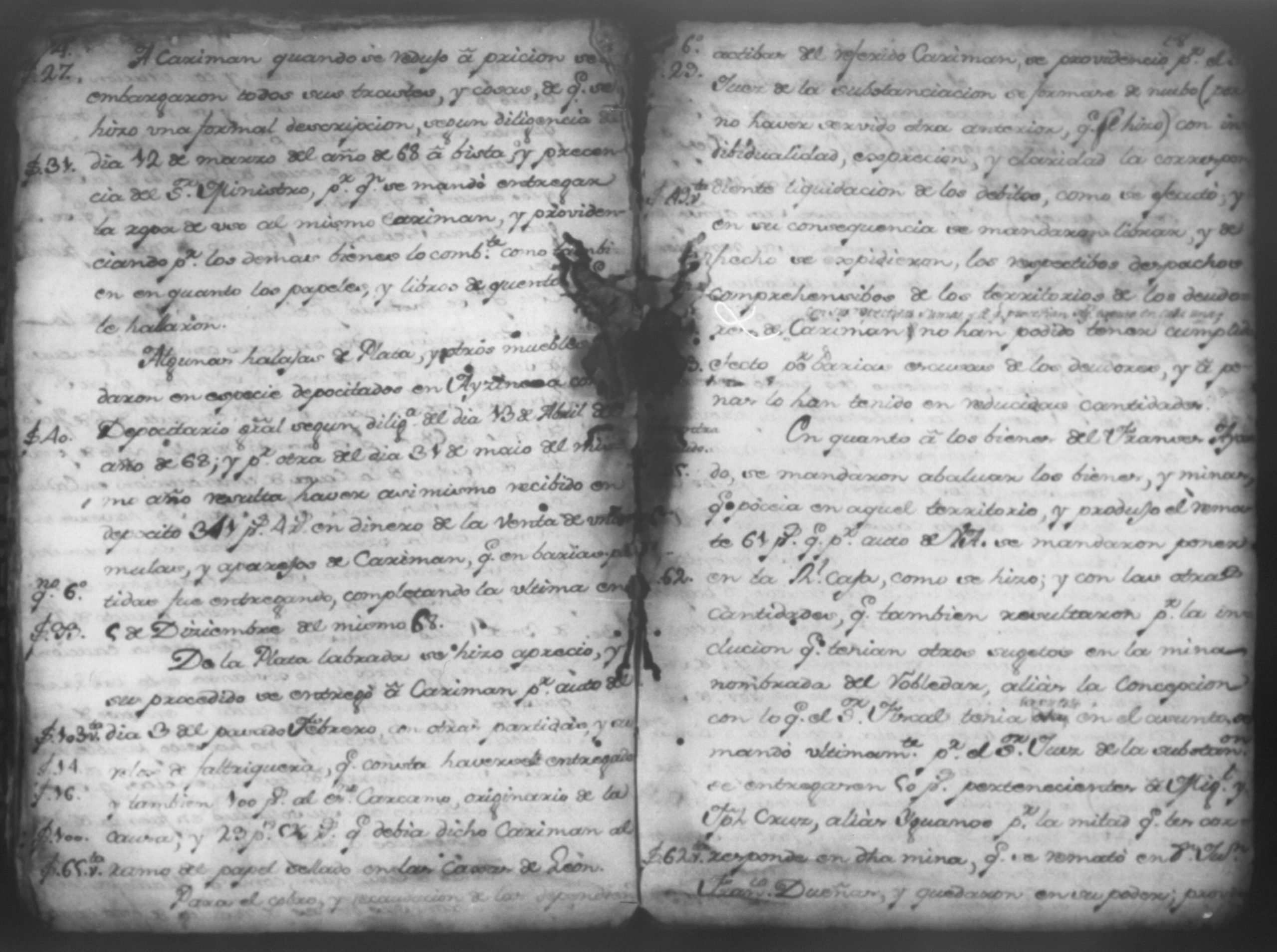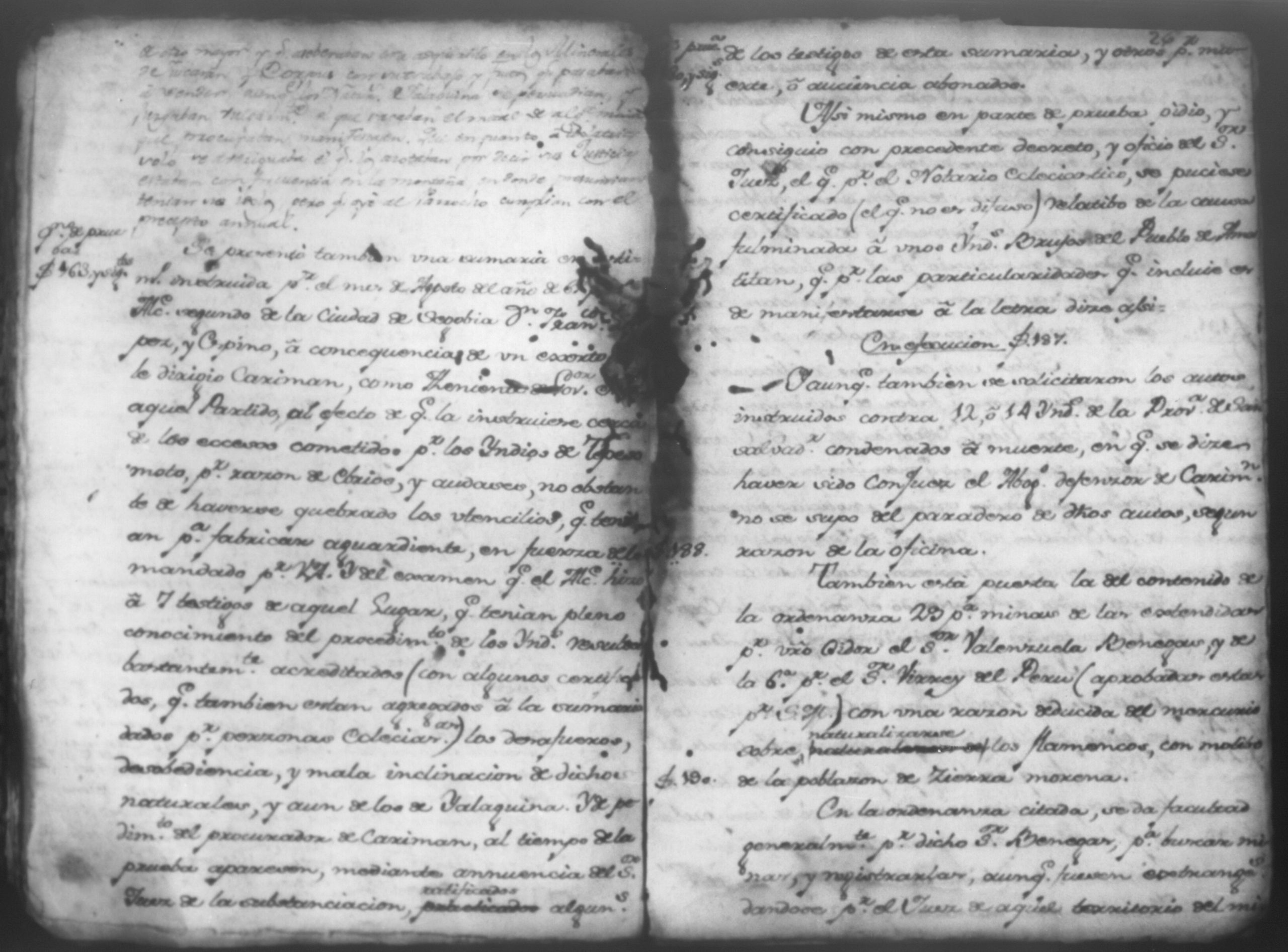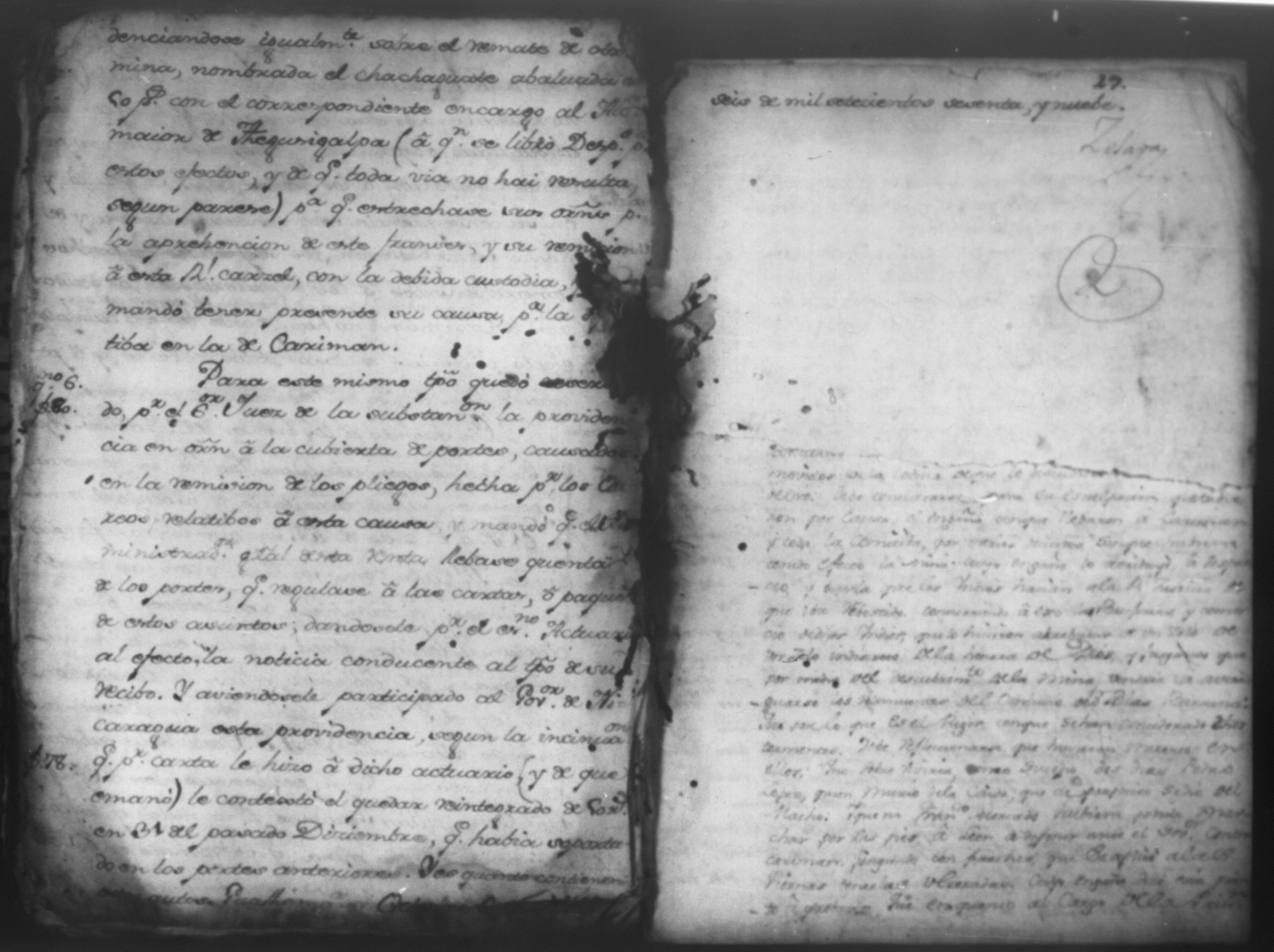 Temática: Año de 1771. Don Andres Cariman, Alcalde Ordinario de la Segovia y Don Philiberto [Groso], se ha seguido causa criminal en esta Real Audiencia en grado de cierta por la muerte que resulto en Pedro Lopez, indio, sobre el descubrimiento de una mina, cuyos autos dieron principio por los seguidos a pedimiento de la mulata Maria Geronima de Herrera viuda de Blas Barahona