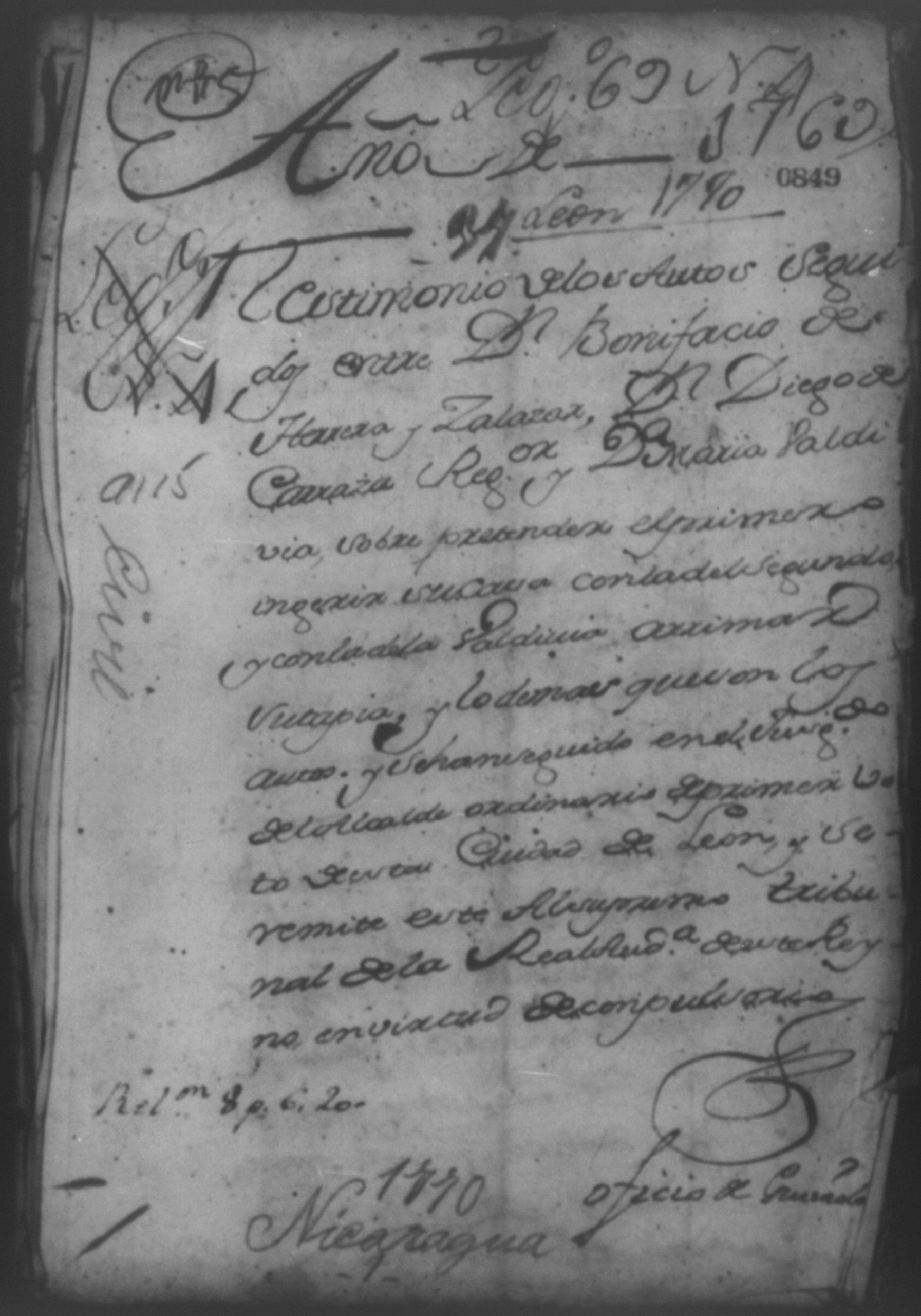 Temática: Leon 1770. Año de 1769. Testimonio de los autos seguidos entre Don Bonifacio de Herrera y Zalazar, Don Diego de Carraza Regidor y Doña María Valdivia, sobre pretender el primero ingerir su causa con la del segundo y con la de la Valdivia arrimar su tapia y lo demas que son los autos y se han seguido en el Juzgado del Alcalde ordinario de primer voto de esta Ciudad de Leon y se remite este al supremo tribunal de la Real Audiencia de este Reyno en virtud de compulasorio.