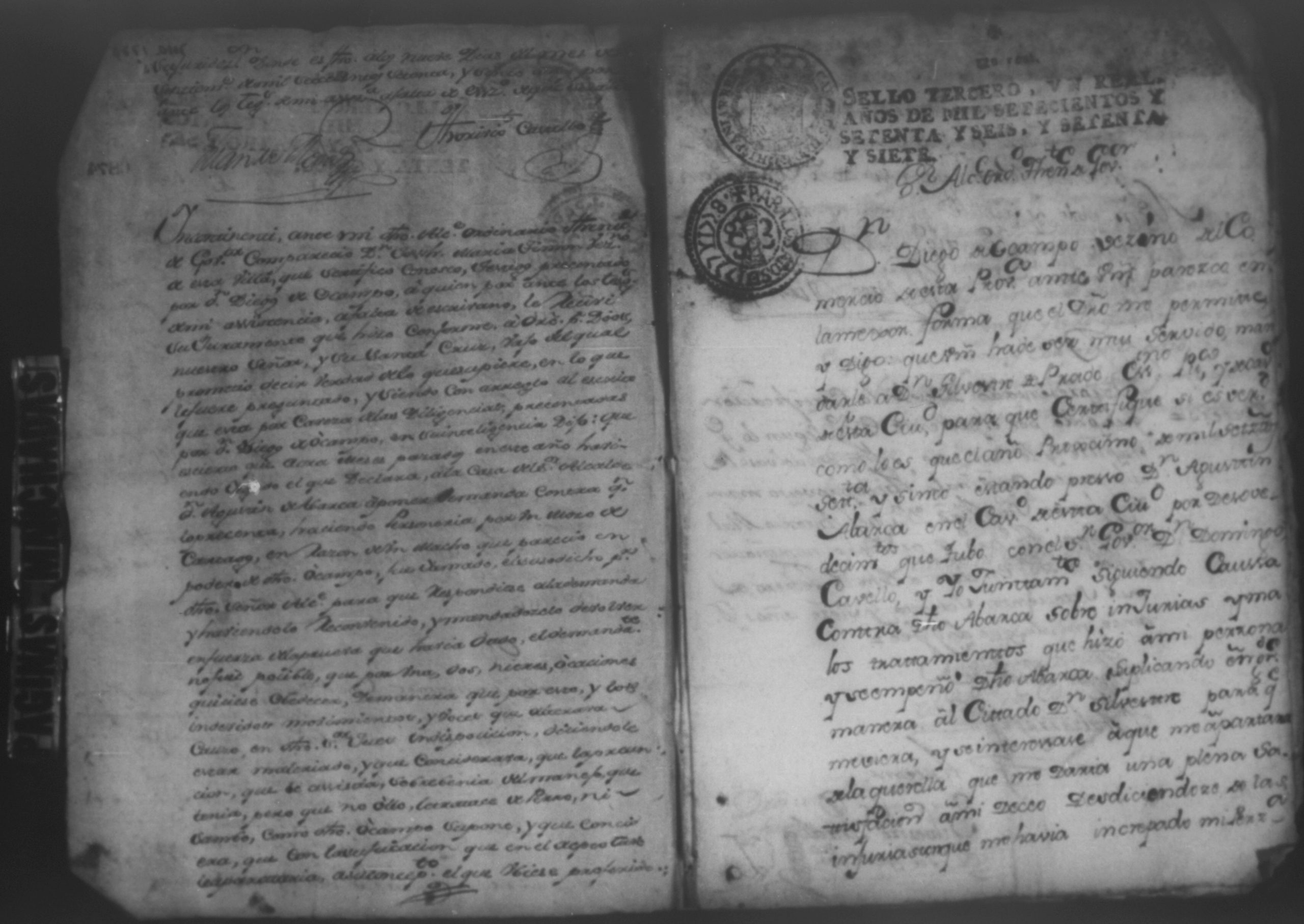 Temática: Don Diego de Ocampo, siguiendo causa contra Don Agustin Abarca sobre injurias y malos tratamiento que hizo a mi persona y se empeño dicho Abarca suplicando que me apartare de la querella.