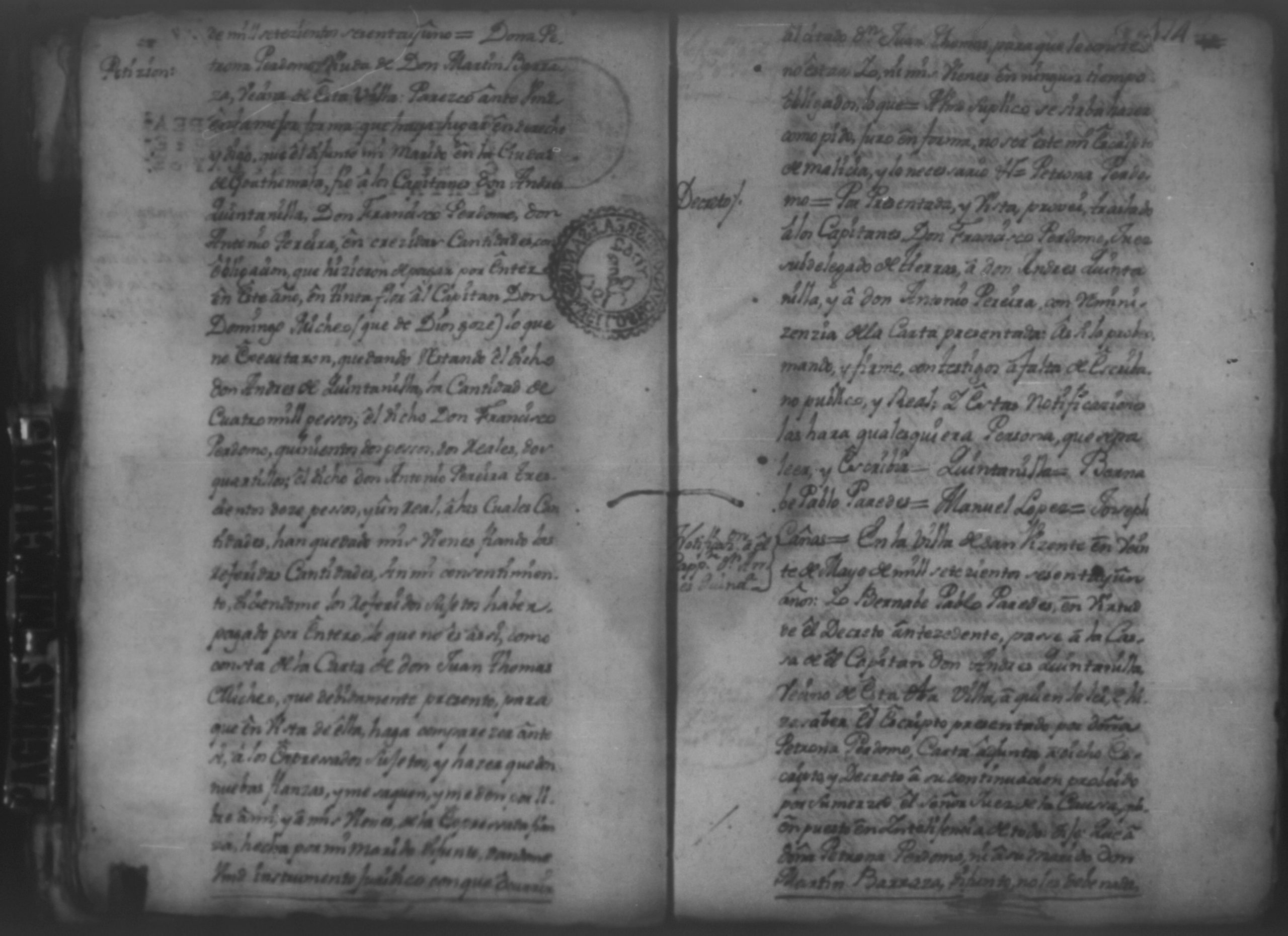 Temática: Año 1762. Executivo por Don Francisco Ignacio Chamoro, cavallero de Avito contra Don Andres de Quintanilla y concurso a sus bienes