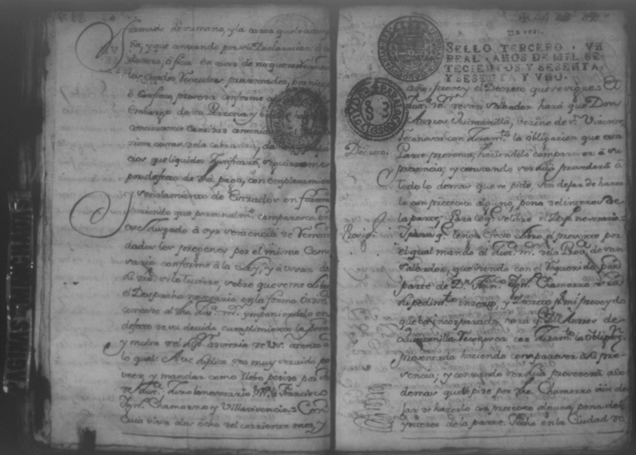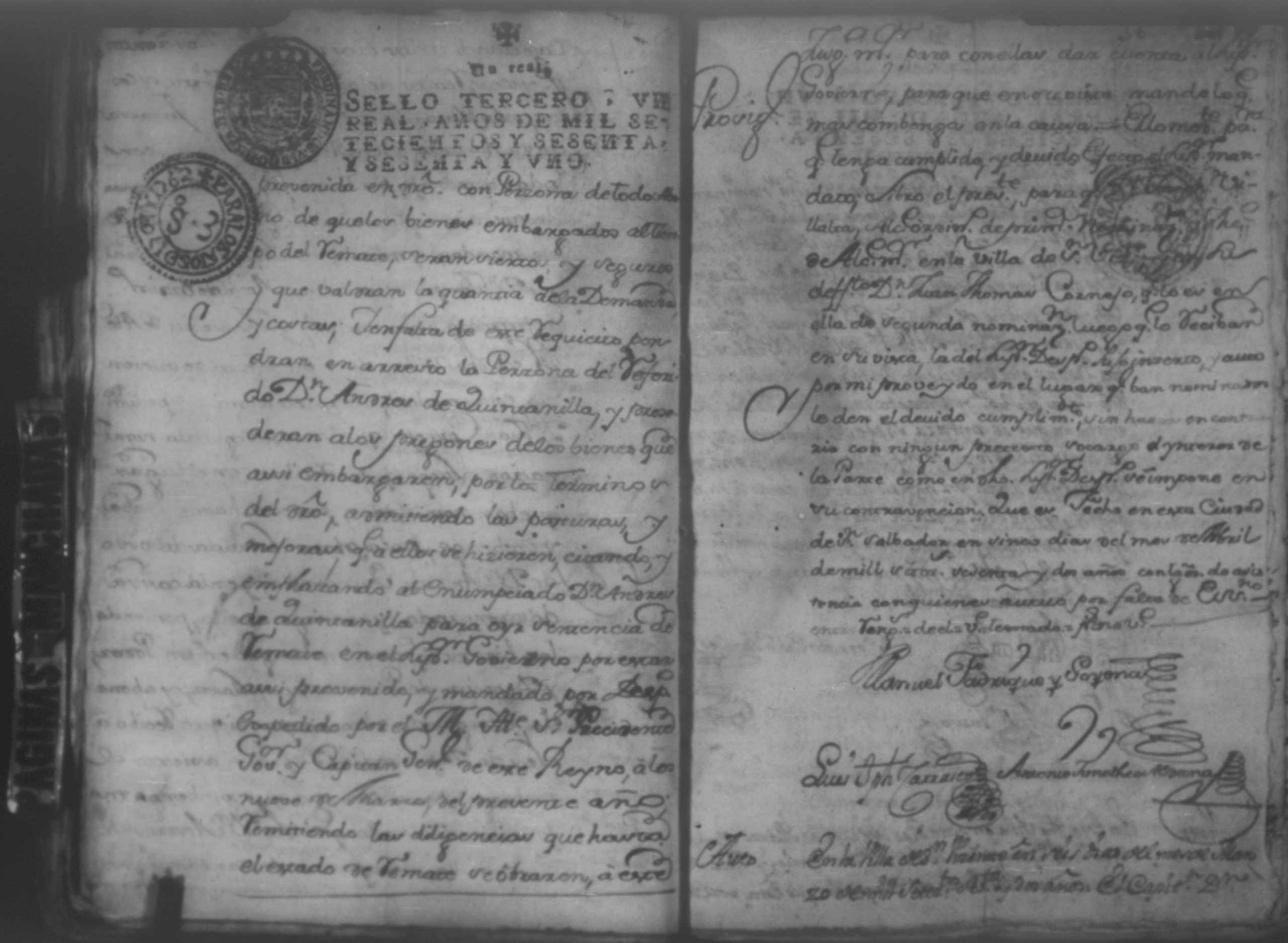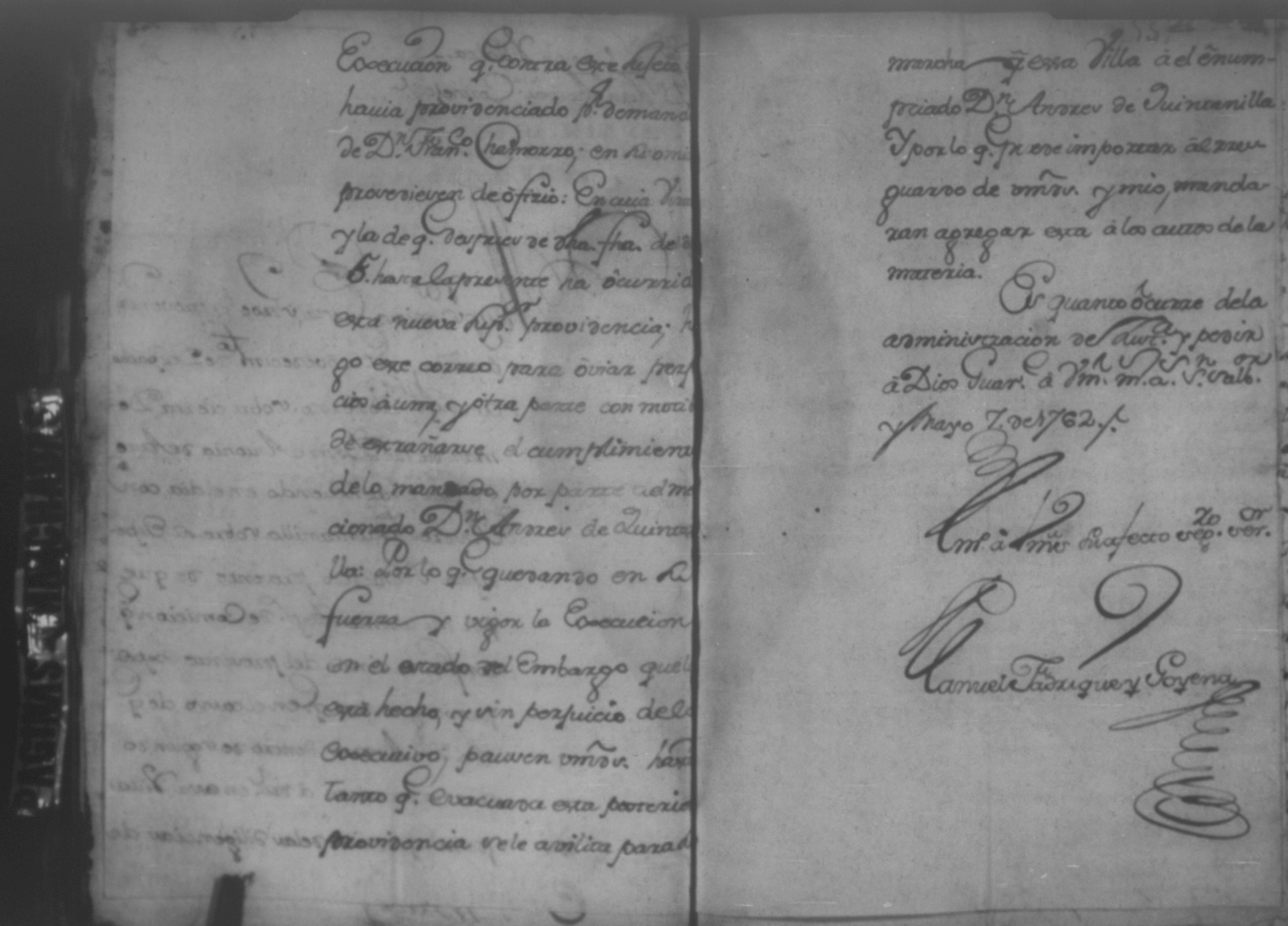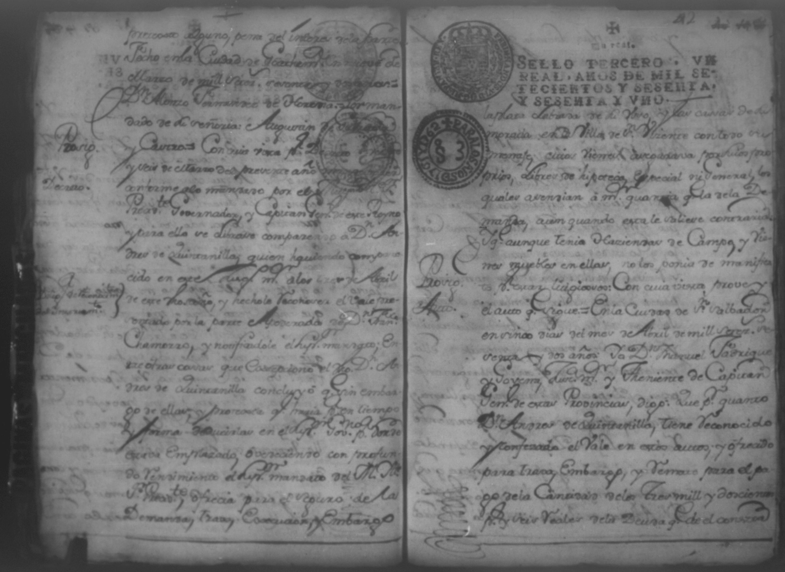 Temática: Año 1762. Executivo por Don Francisco Ignacio Chamoro, cavallero de Avito contra Don Andres de Quintanilla y concurso a sus bienes