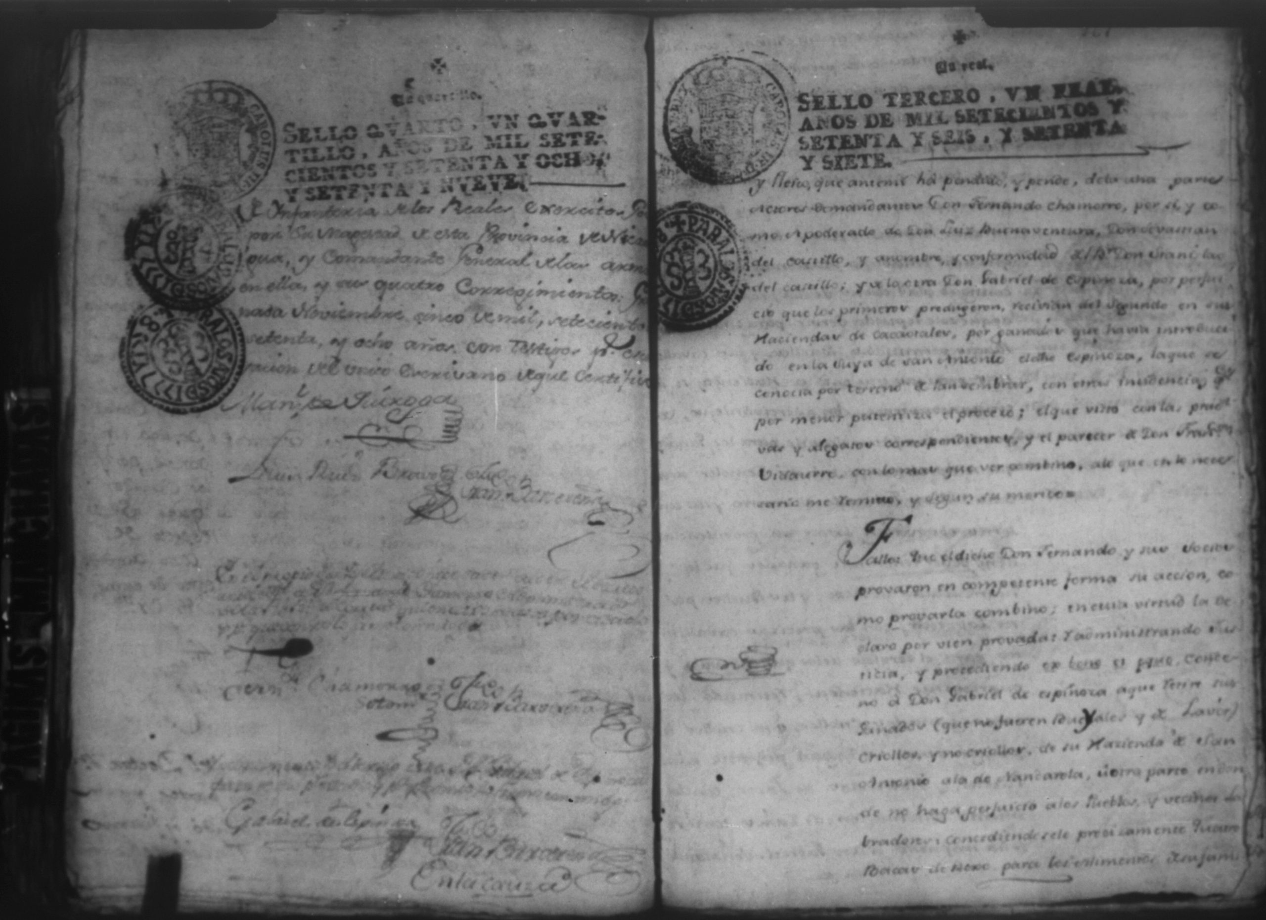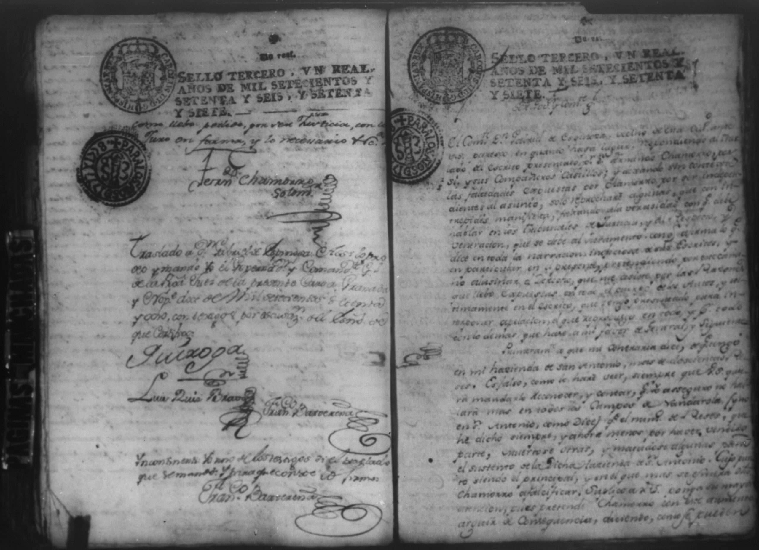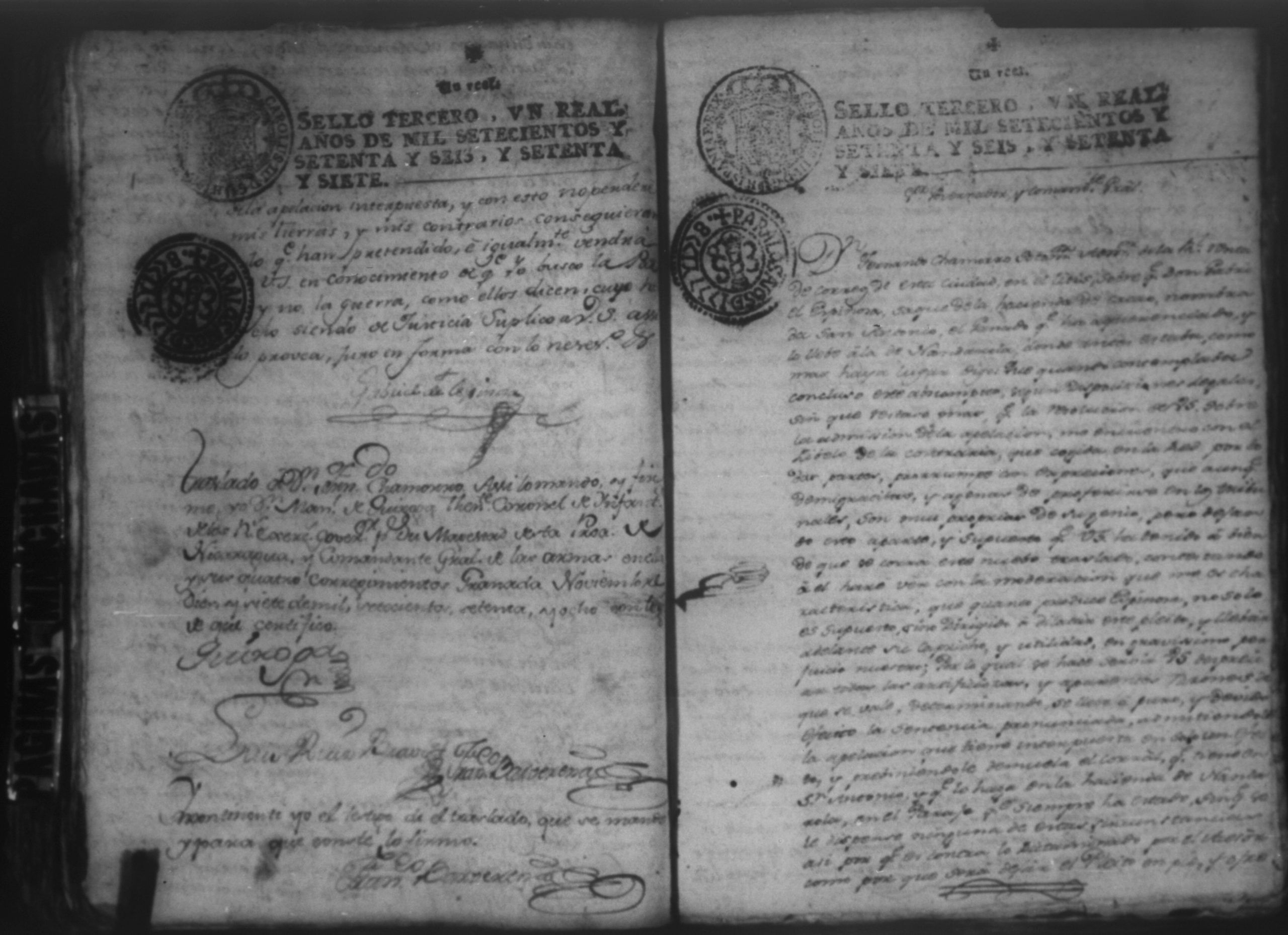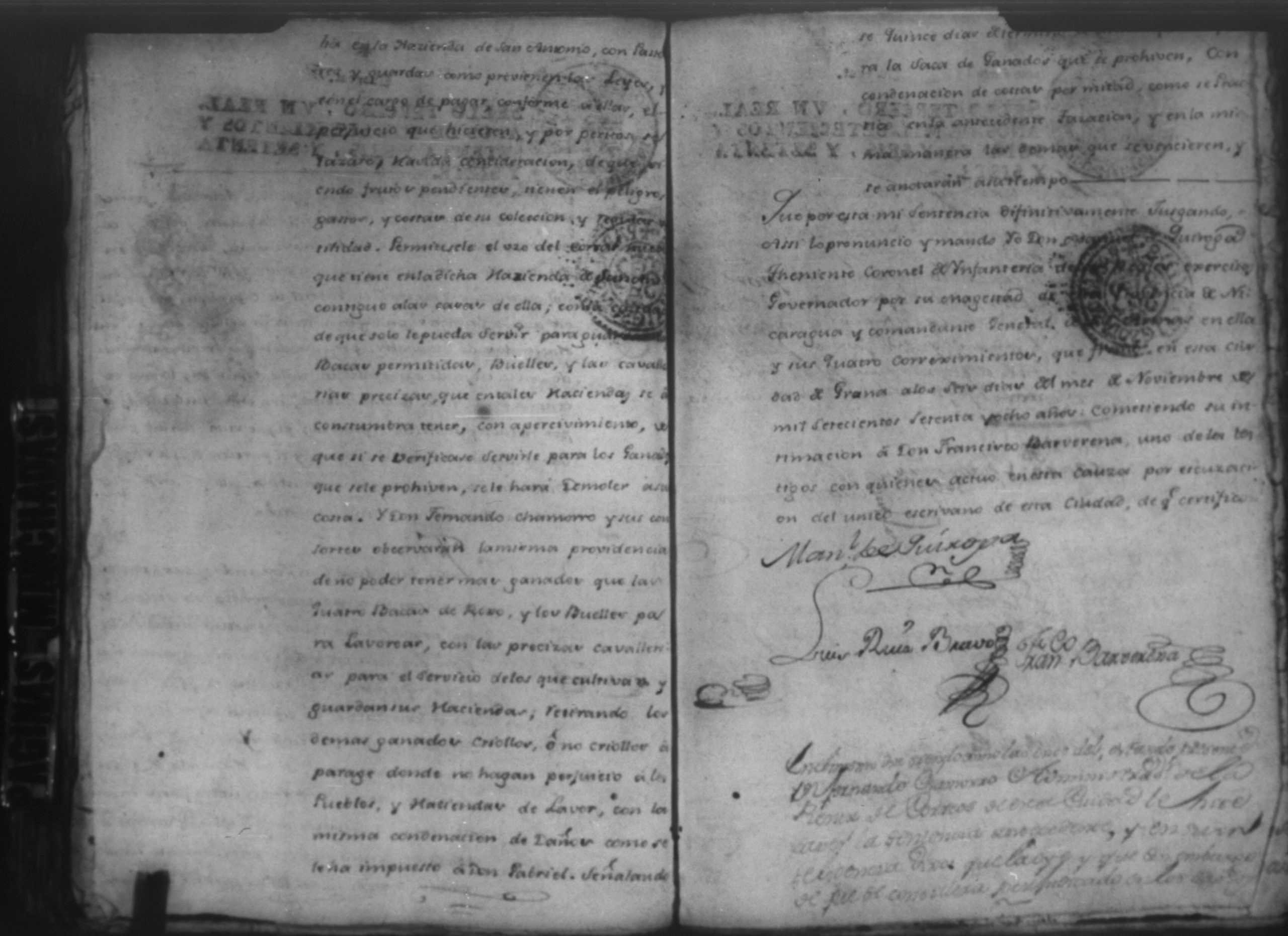 Temática: Audiencia Leon 1779. Autos seguidos en grado de apelación por Don Gabriel de Espinosa con Don Fernando Chamorro y su consorte el presbitero Don Estanislao Don Luiz Ventura y Don Sebastian del Castillo vecino de la ciudad de Granada sobre la despoblación y retiro del ganado mayor del citio de Don Antonio por los perjuicios que causa a los confinantes. Oficios de Guerra.