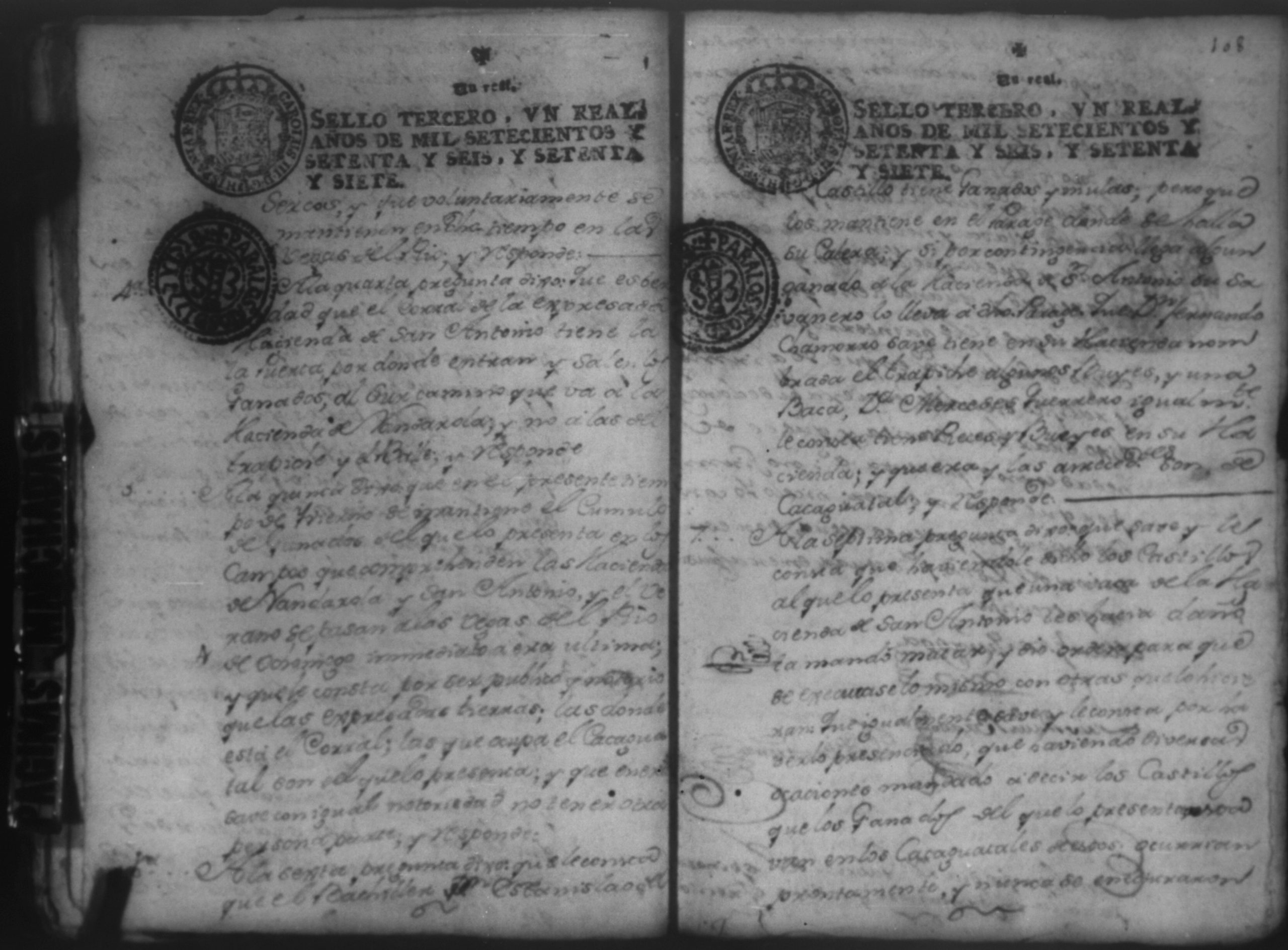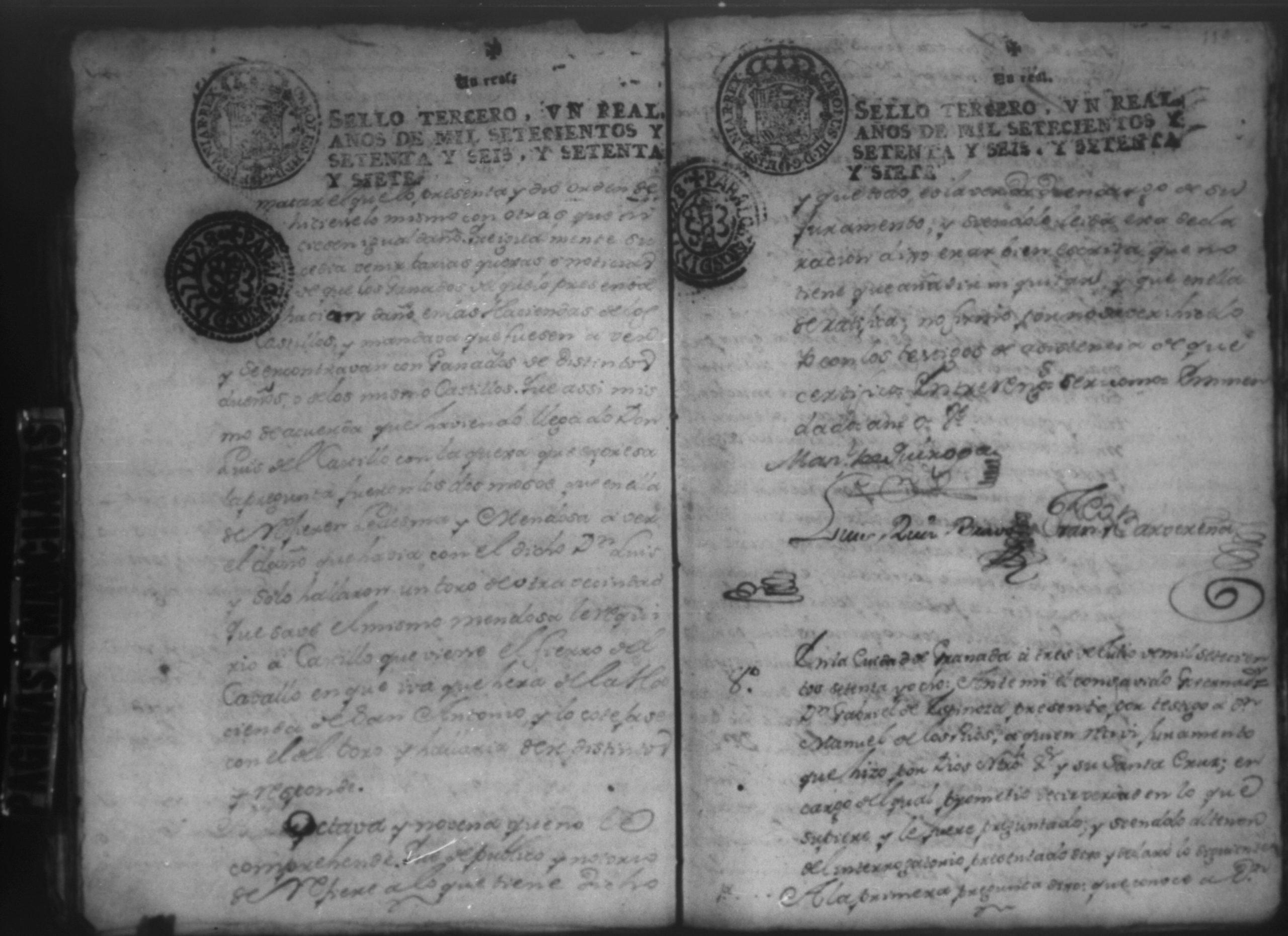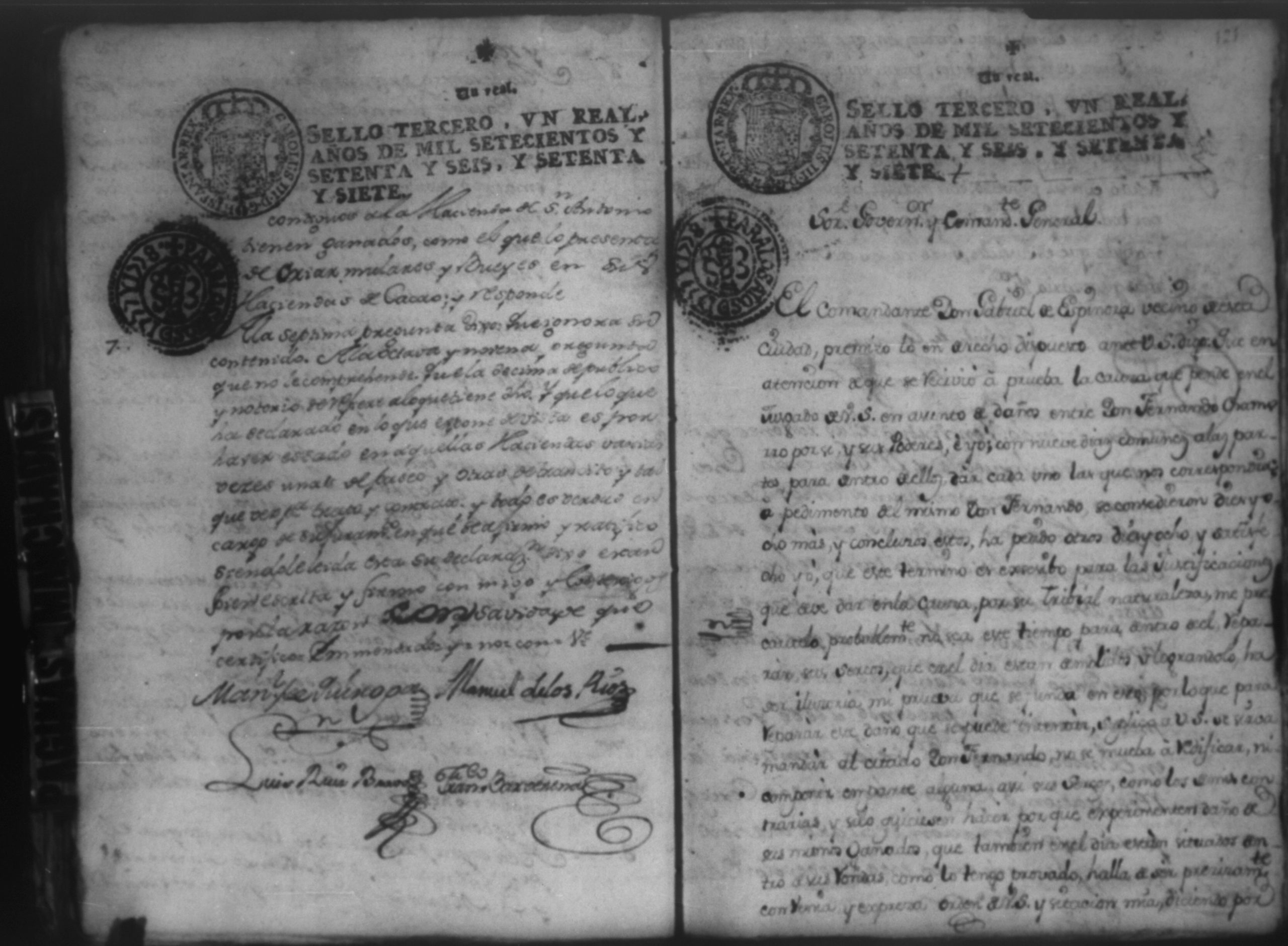 Temática: Audiencia Leon 1779. Autos seguidos en grado de apelación por Don Gabriel de Espinosa con Don Fernando Chamorro y su consorte el presbitero Don Estanislao Don Luiz Ventura y Don Sebastian del Castillo vecino de la ciudad de Granada sobre la despoblación y retiro del ganado mayor del citio de Don Antonio por los perjuicios que causa a los confinantes. Oficios de Guerra.