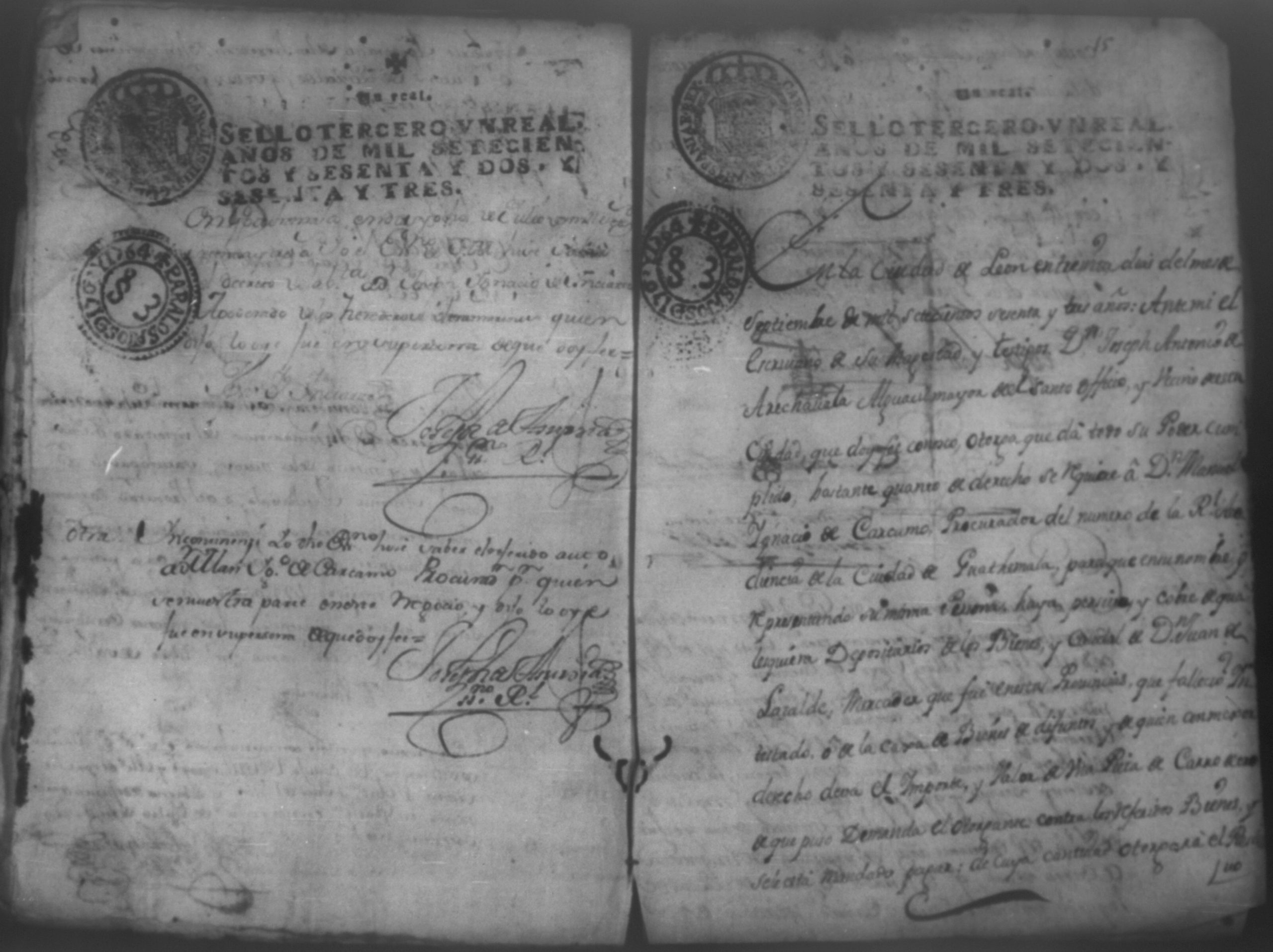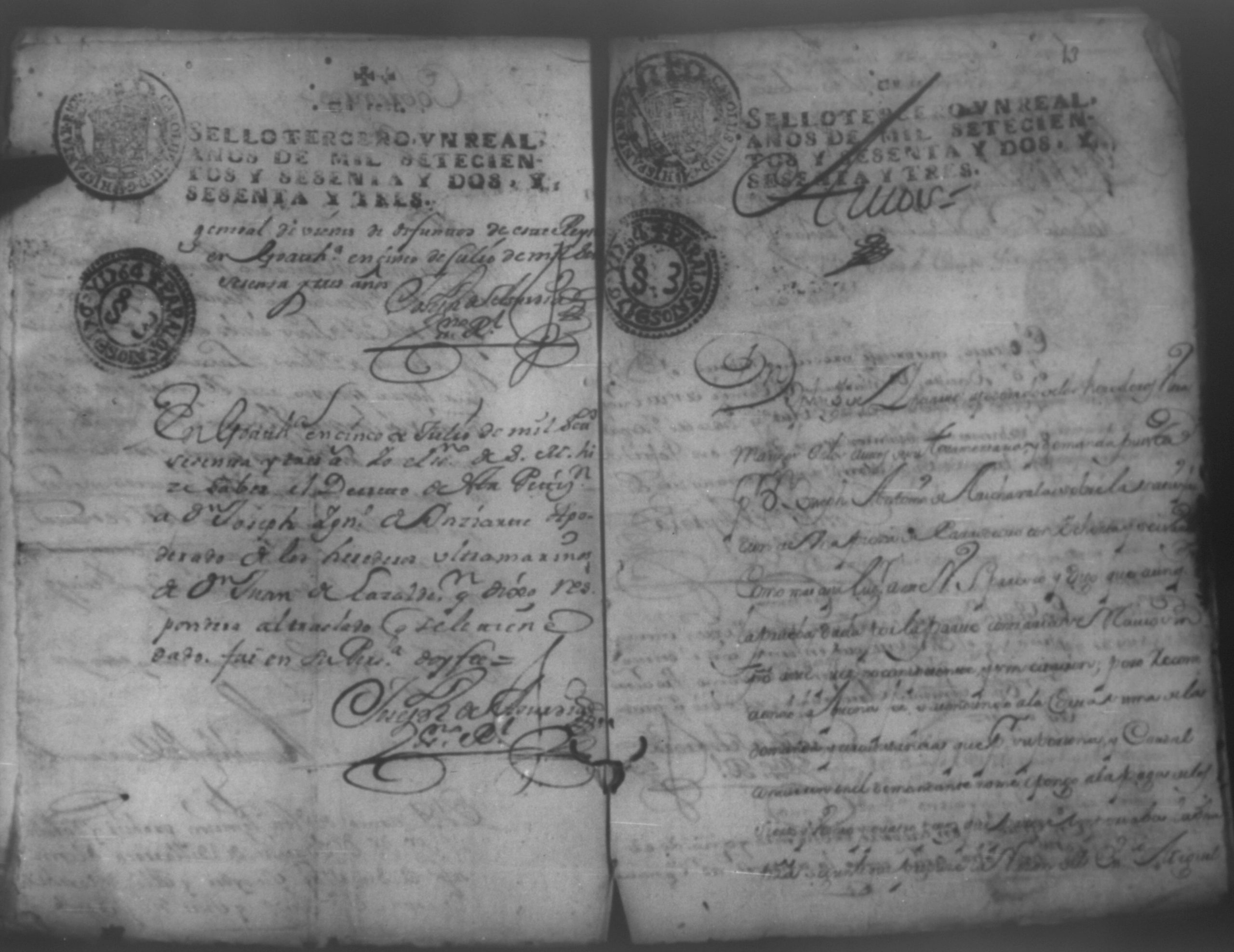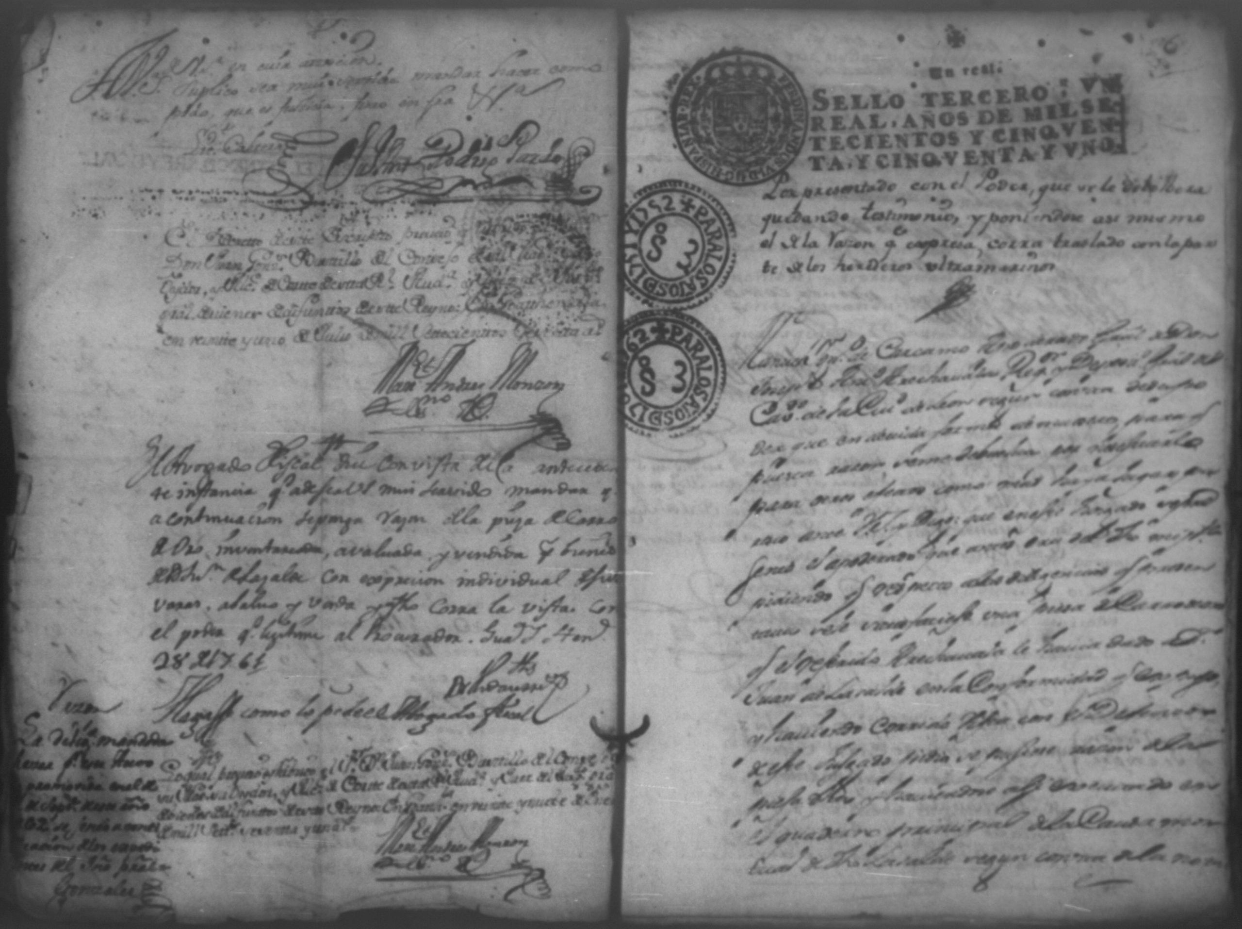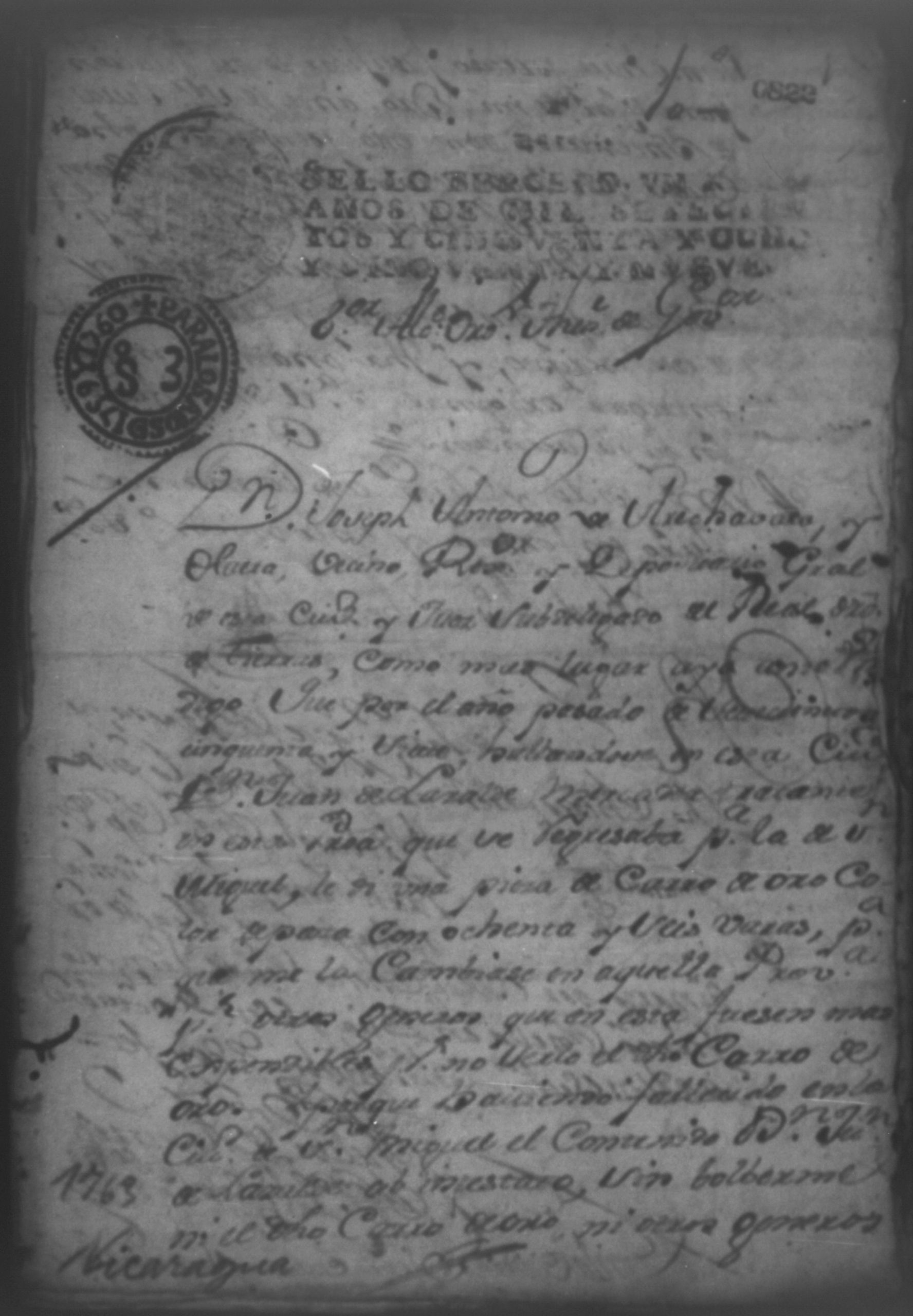 Temática: 1763. Don Joseph Antonio de Arechavala y Olacia vecino Receptor y Depositario General desta ciudad y Juez subdelegado del Real derecho de Tierras, como mas lugar aya ante Vuestra Majestad y digo que por el año de pasado de setecientos cinquenta y siete hallandose en esta ciudad Don Juan de Laralde ...que se regresaba para la de San Miguel, le di una pieza de carro de oro color de [plata] con ochenta y seis varas para que me los cambiase en aquella provincia por varios generos