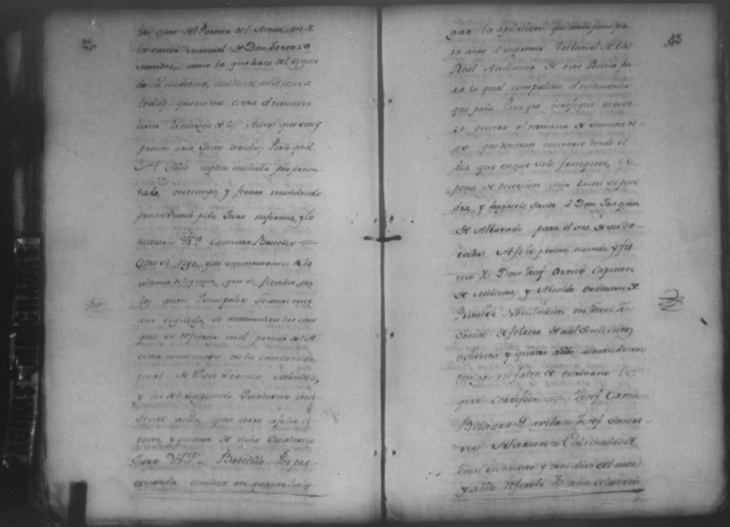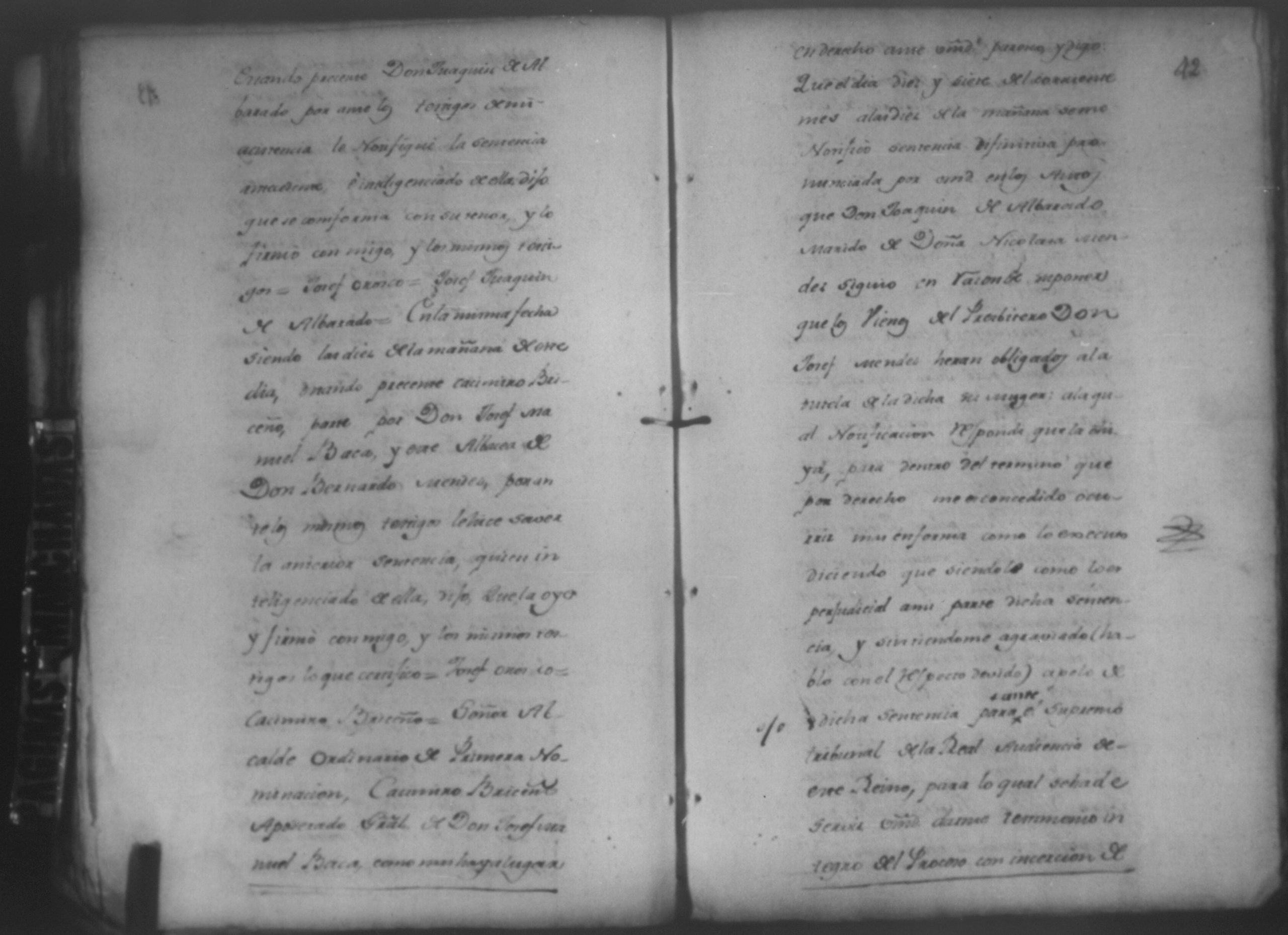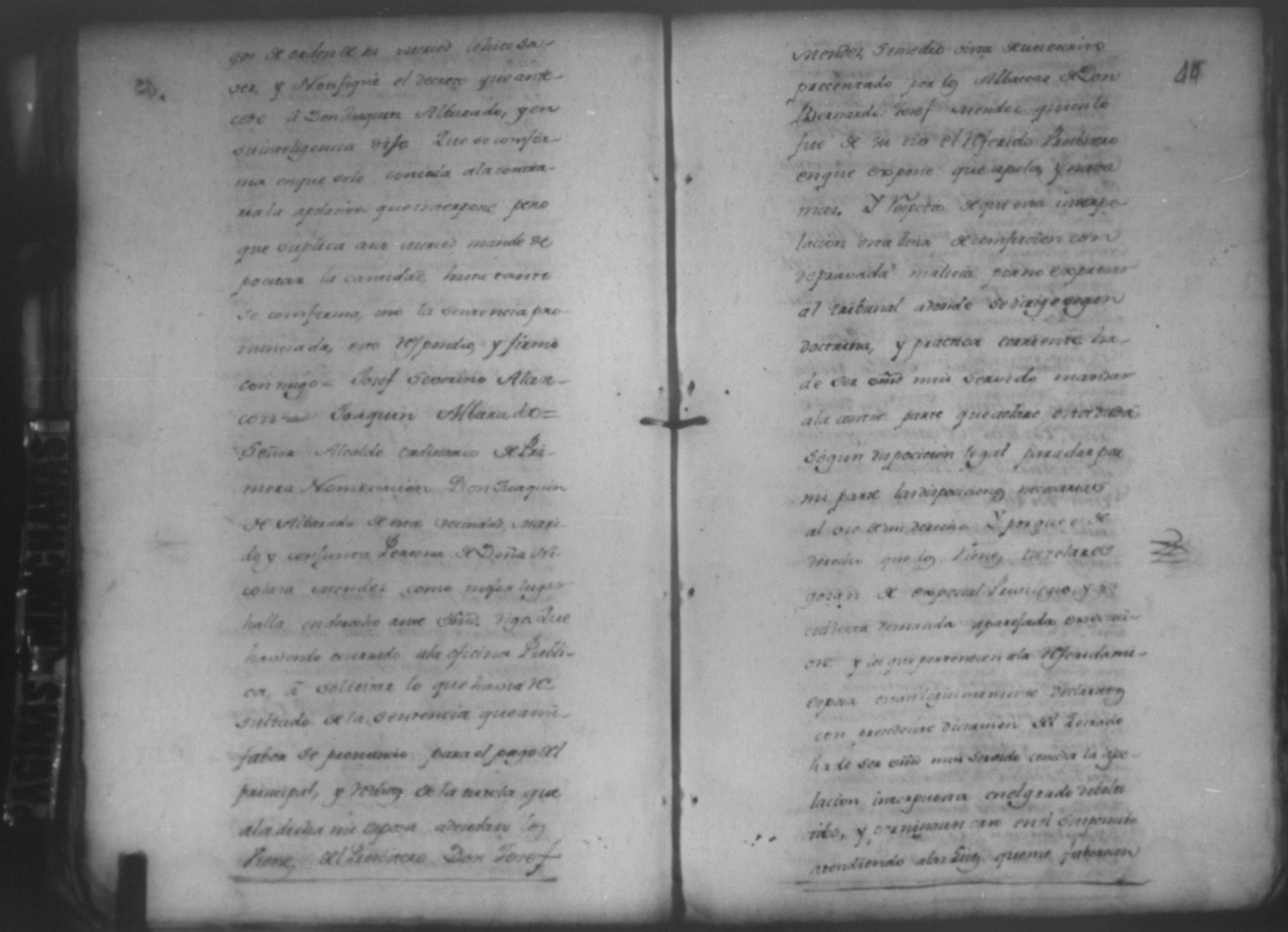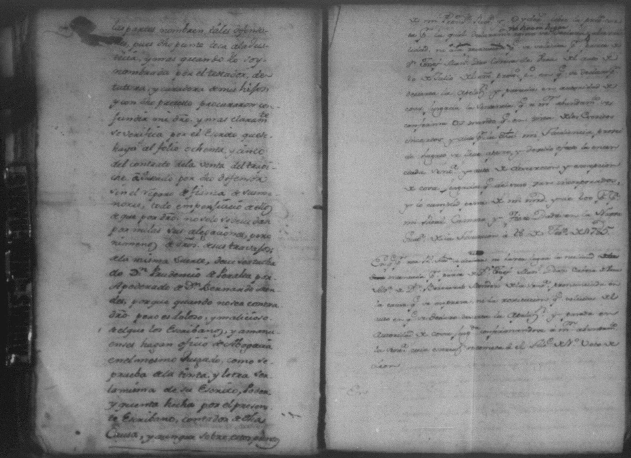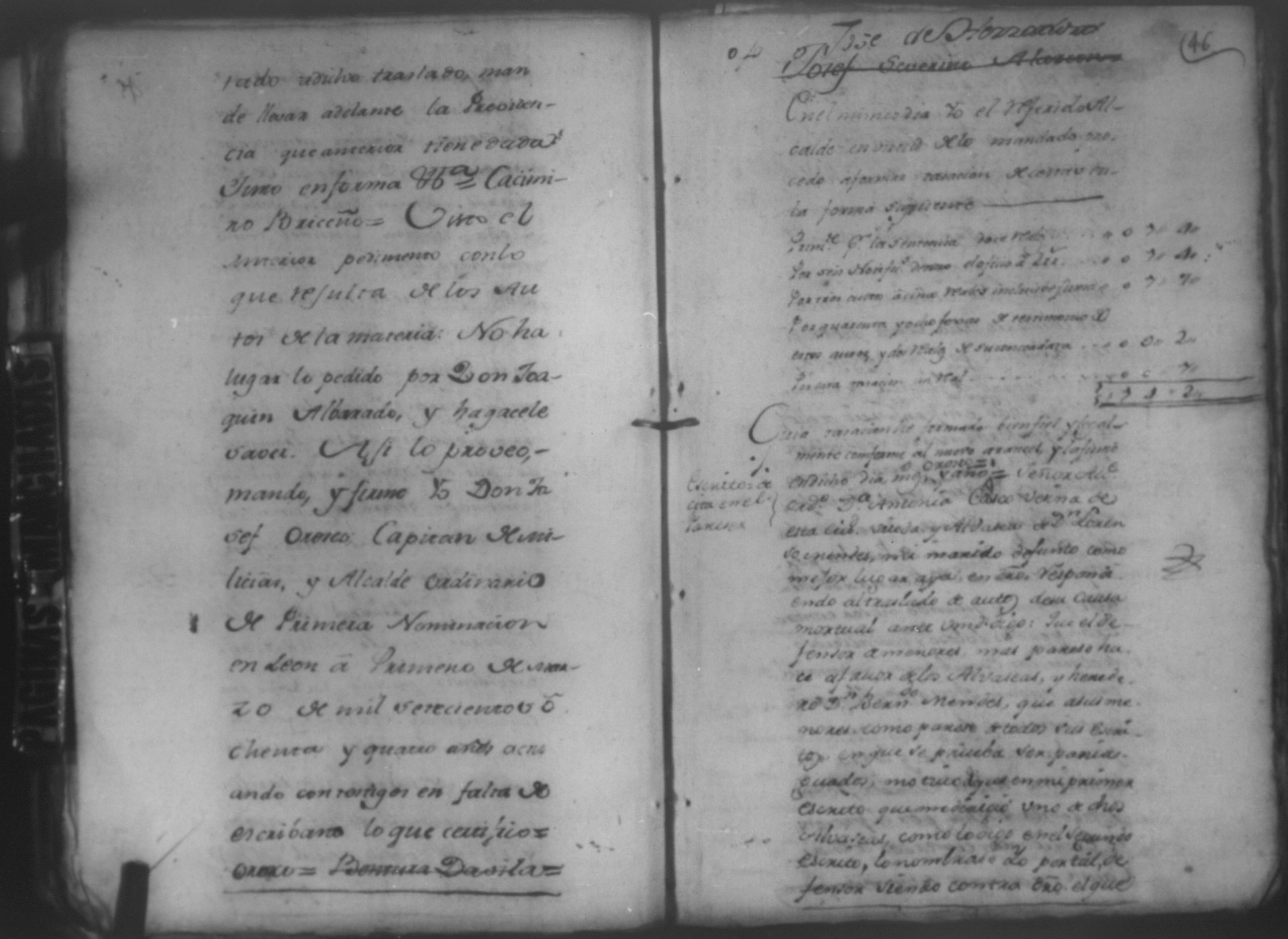 Temática: León, 1785. Testimonio de los Autos que se trajeron por Apelación de lo determinado por el alcalde ordinario de primer voto de León en la ynstancia de don Juaquin Alvarado marido y conjunta persona de doña Nicolasa Méndez de Figueroa contra don Manuel Díaz Caveza de Baca por quinientos pesos y reditos tantos de la testamentaria de don Bernardo Méndez
