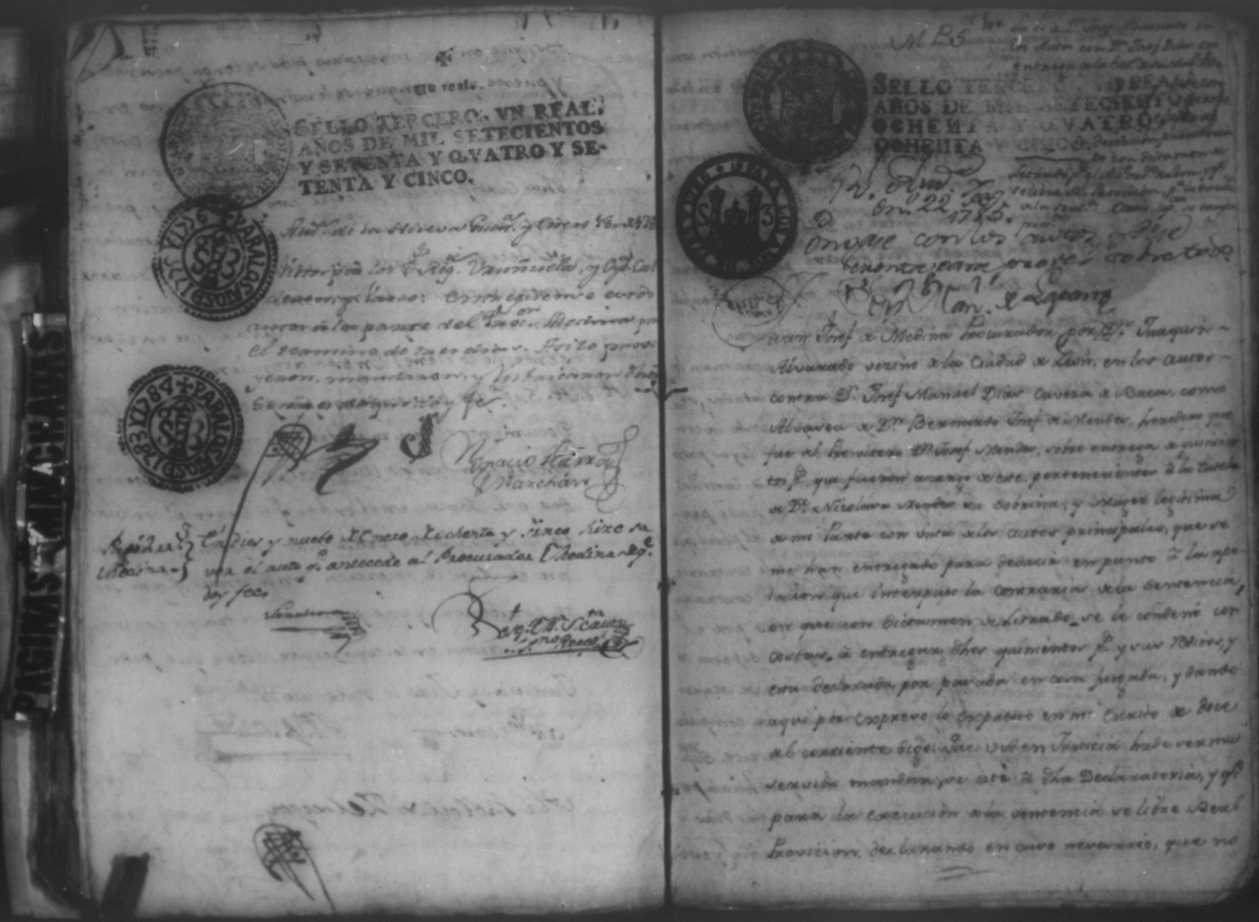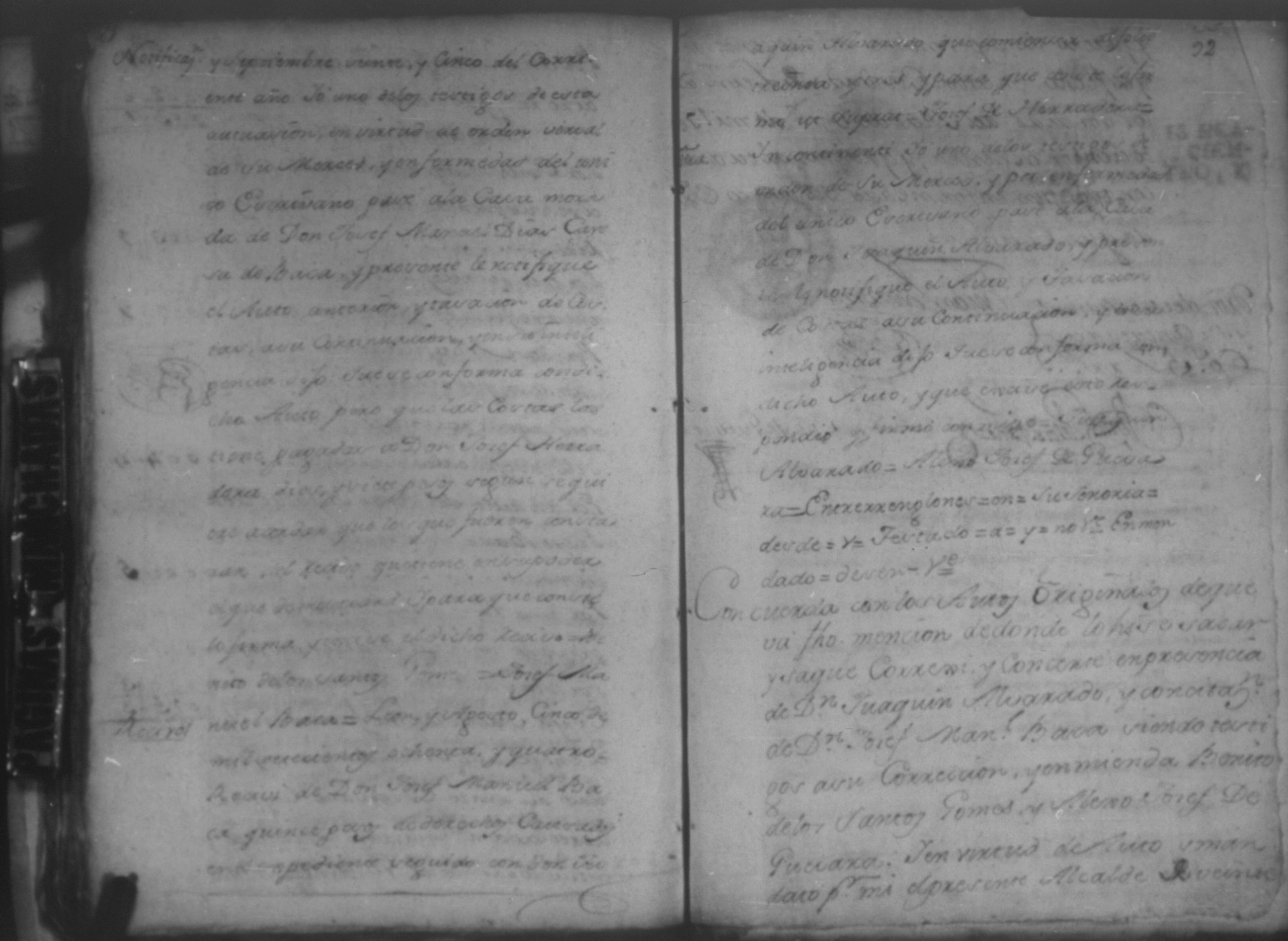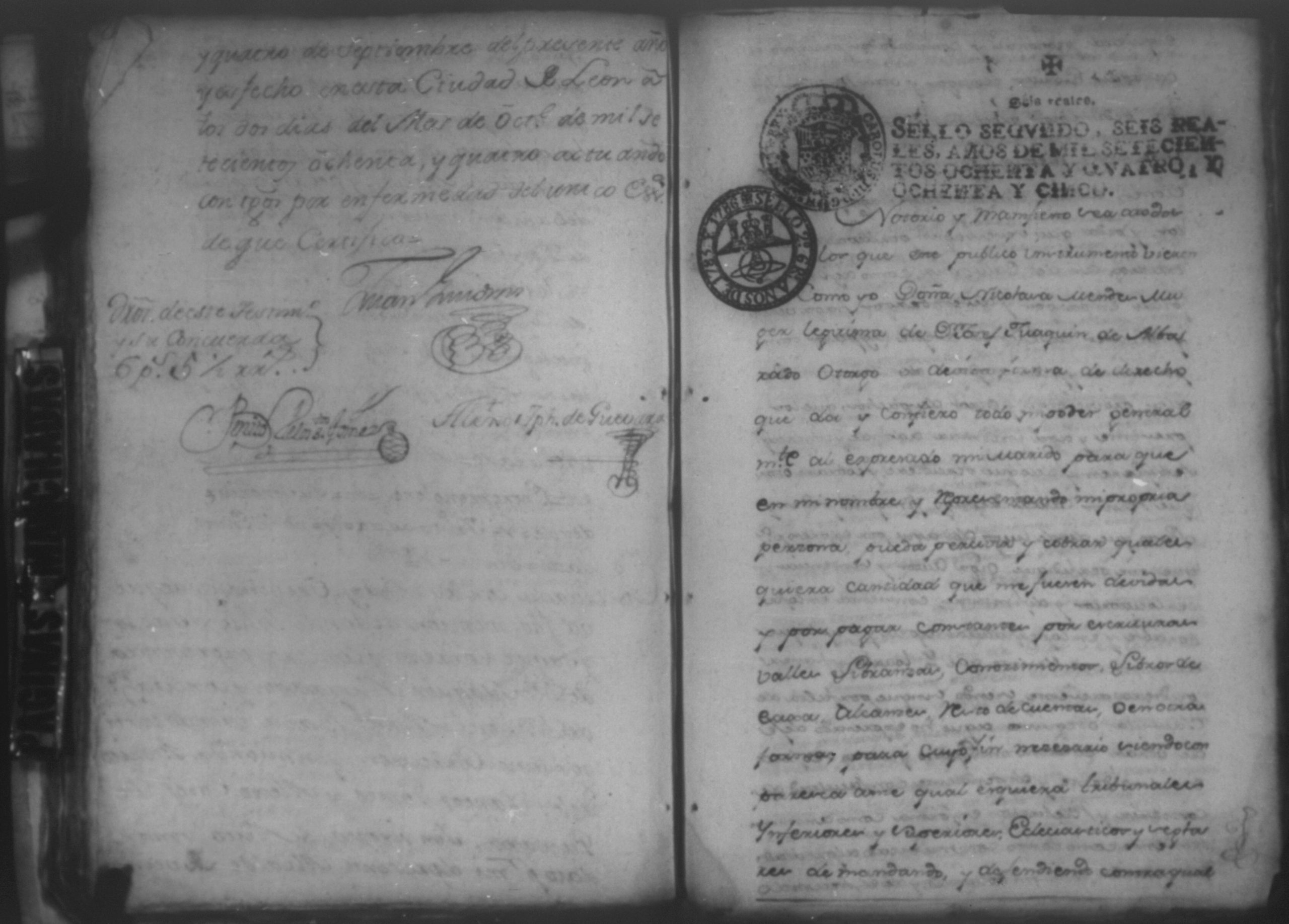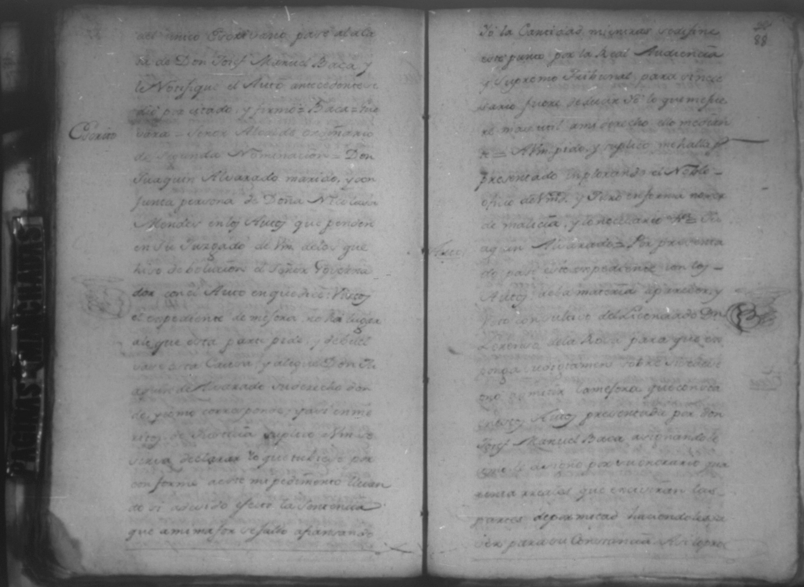 Temática: León, 1785. Testimonio de los Autos que se trajeron por Apelación de lo determinado por el alcalde ordinario de primer voto de León en la ynstancia de don Juaquin Alvarado marido y conjunta persona de doña Nicolasa Méndez de Figueroa contra don Manuel Díaz Caveza de Baca por quinientos pesos y reditos tantos de la testamentaria de don Bernardo Méndez