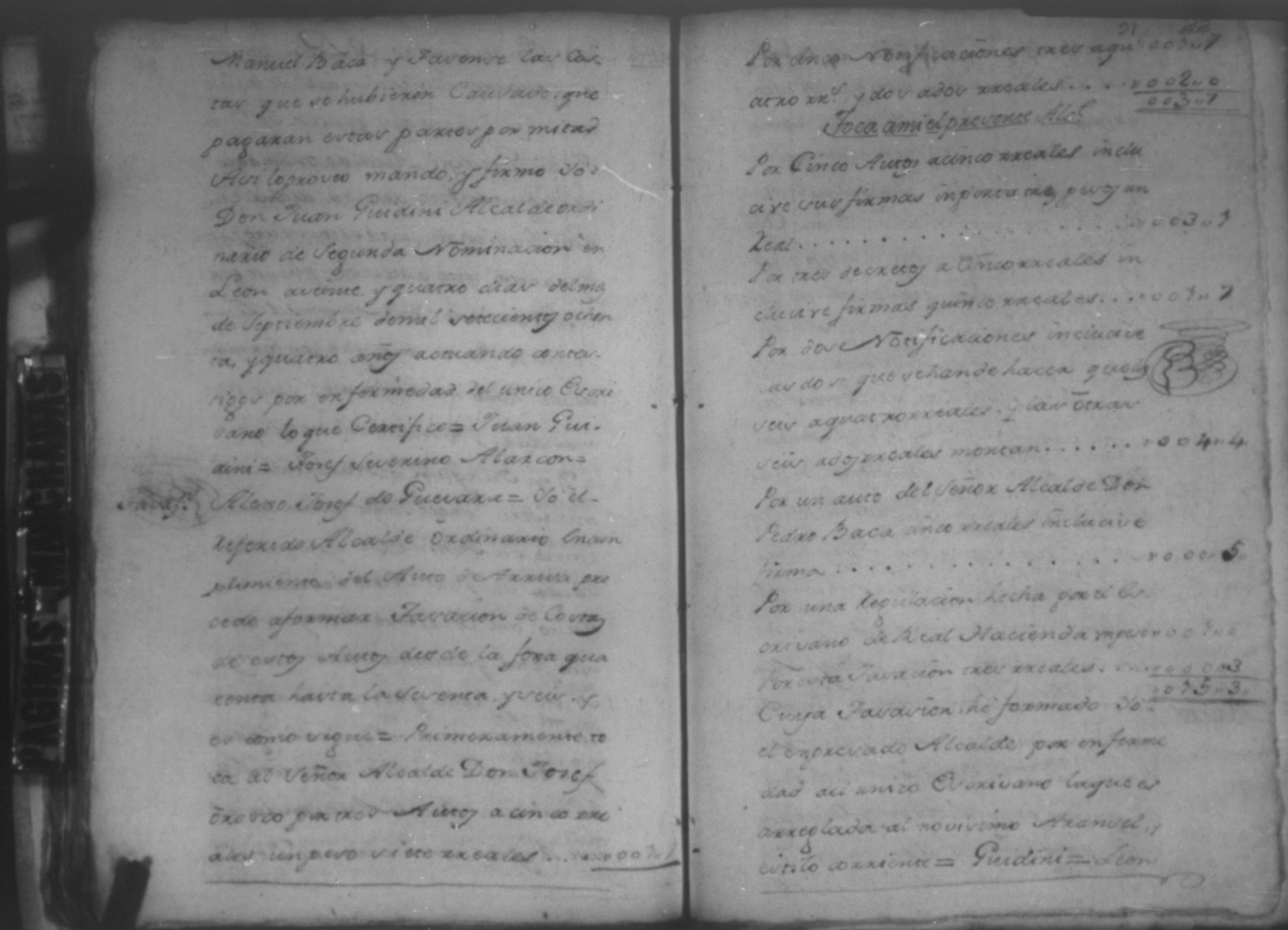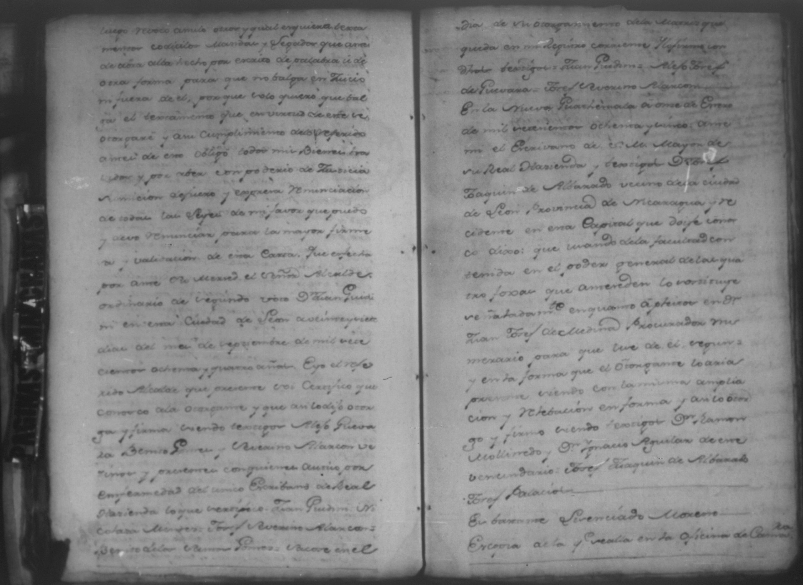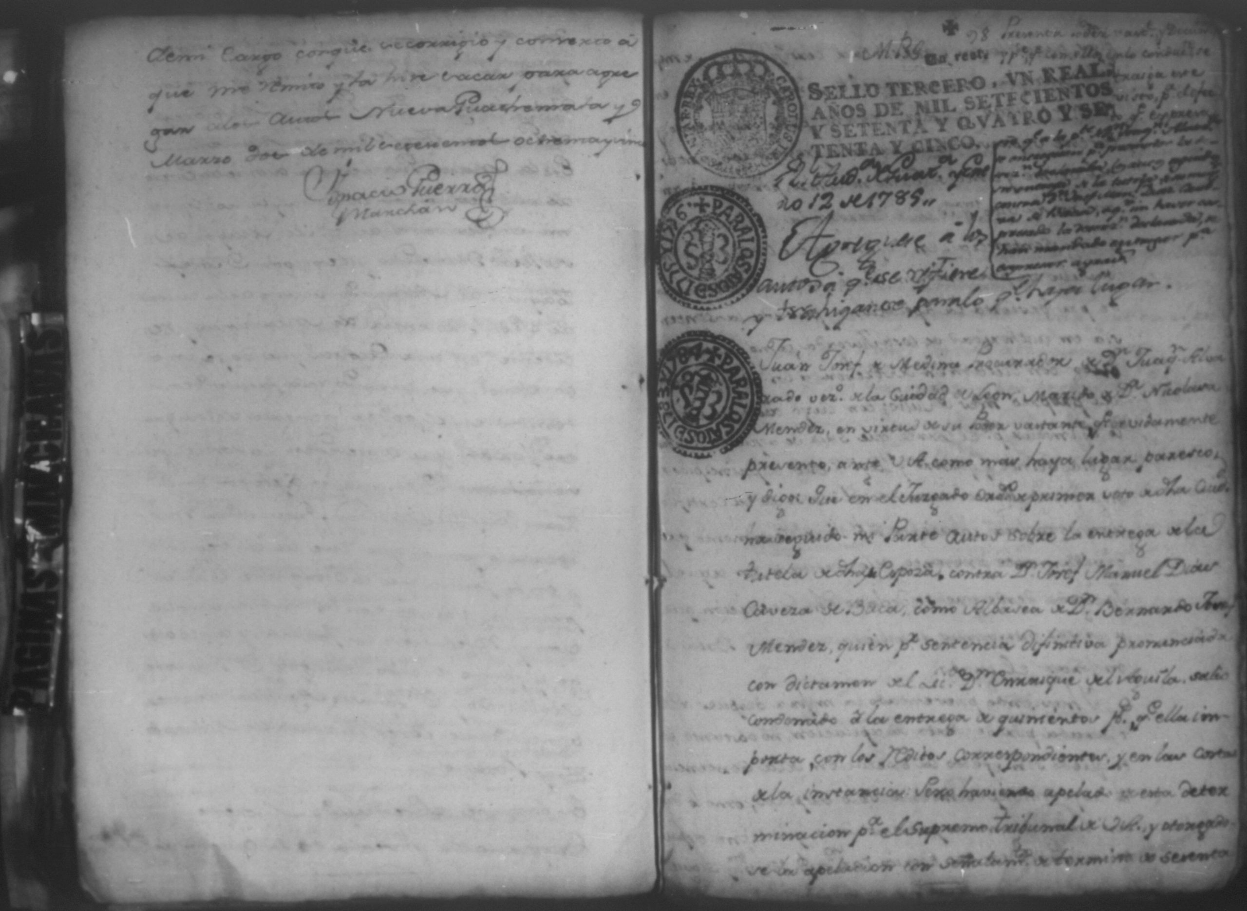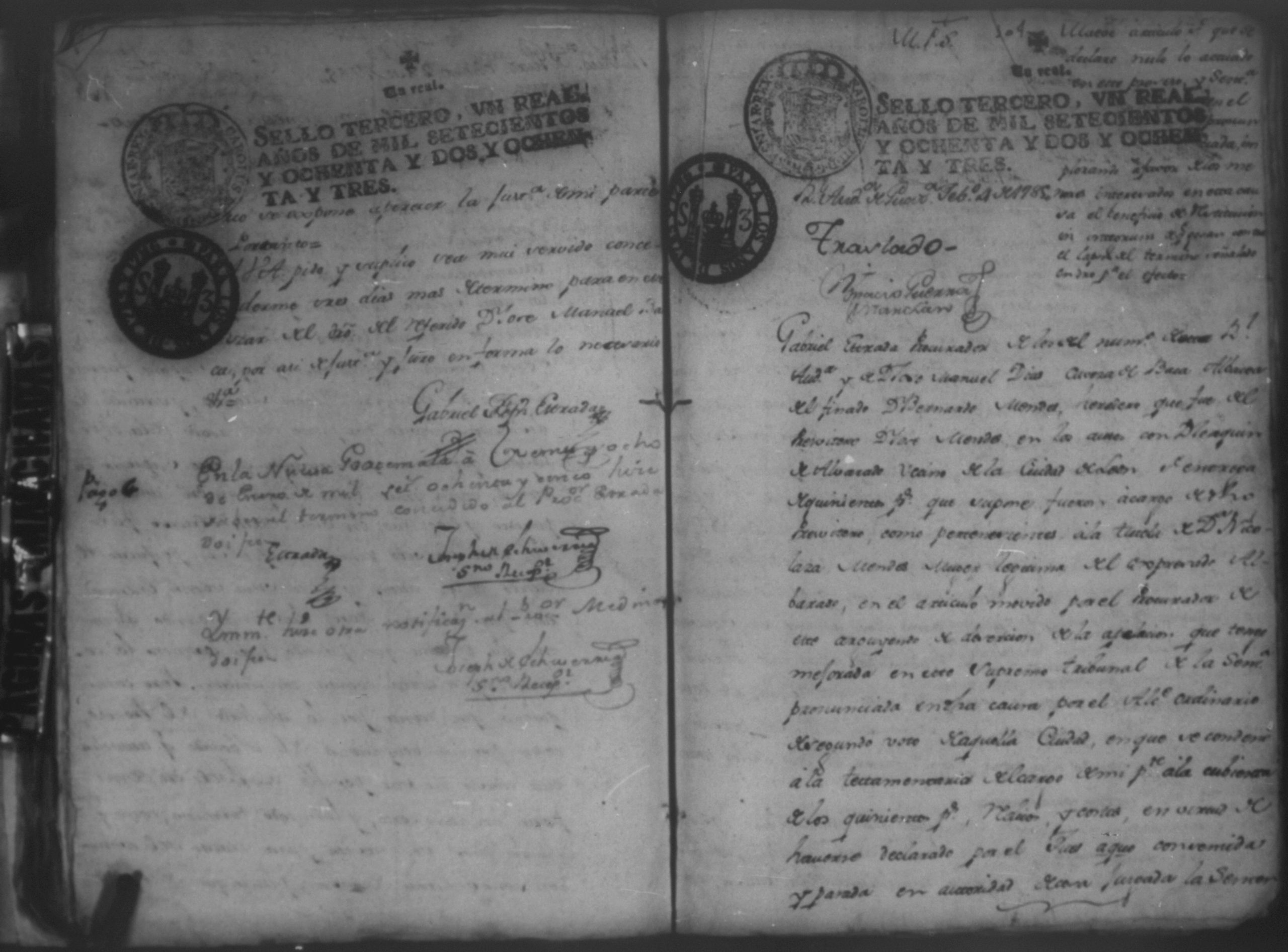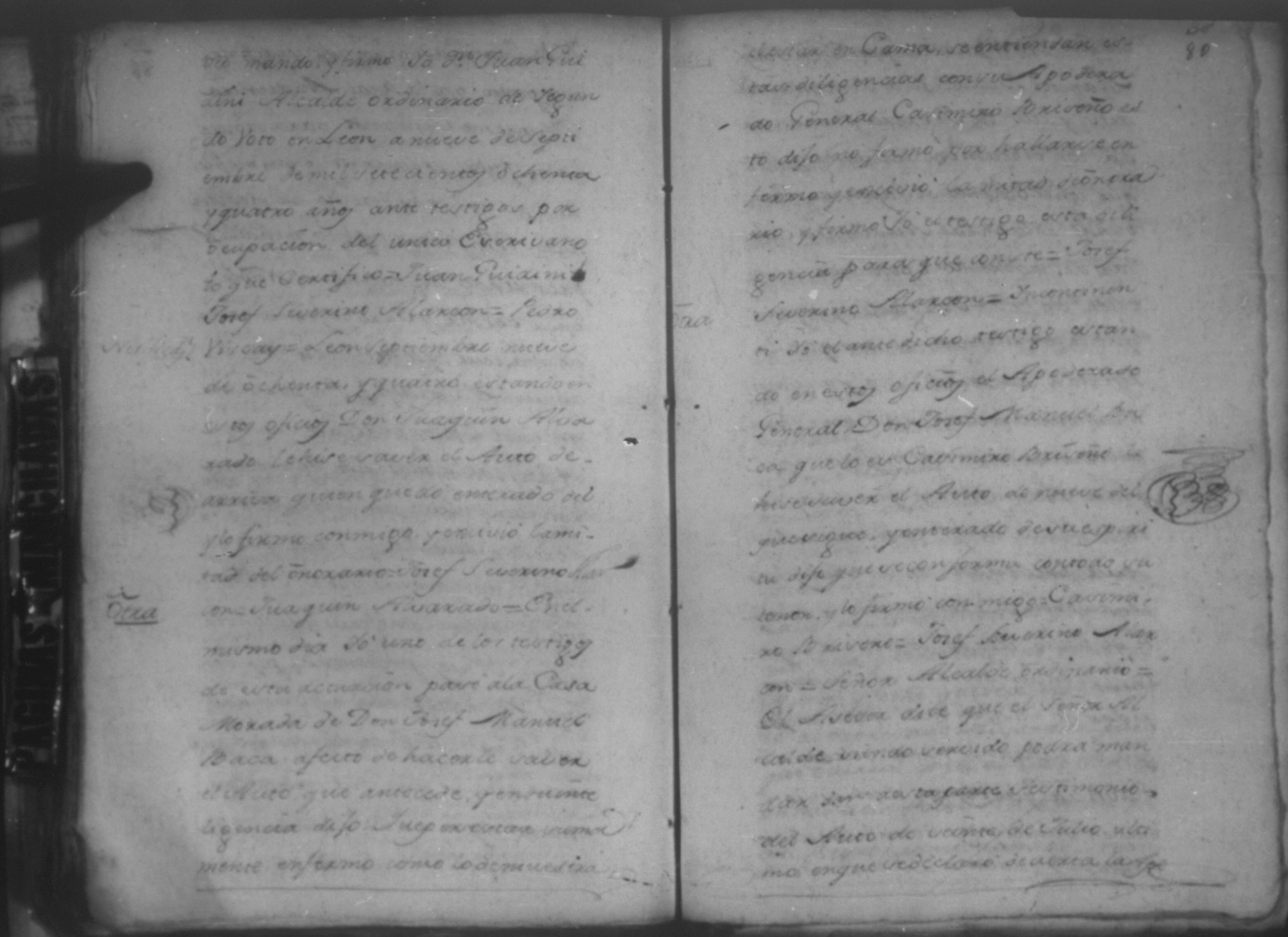 Temática: León, 1785. Testimonio de los Autos que se trajeron por Apelación de lo determinado por el alcalde ordinario de primer voto de León en la ynstancia de don Juaquin Alvarado marido y conjunta persona de doña Nicolasa Méndez de Figueroa contra don Manuel Díaz Caveza de Baca por quinientos pesos y reditos tantos de la testamentaria de don Bernardo Méndez