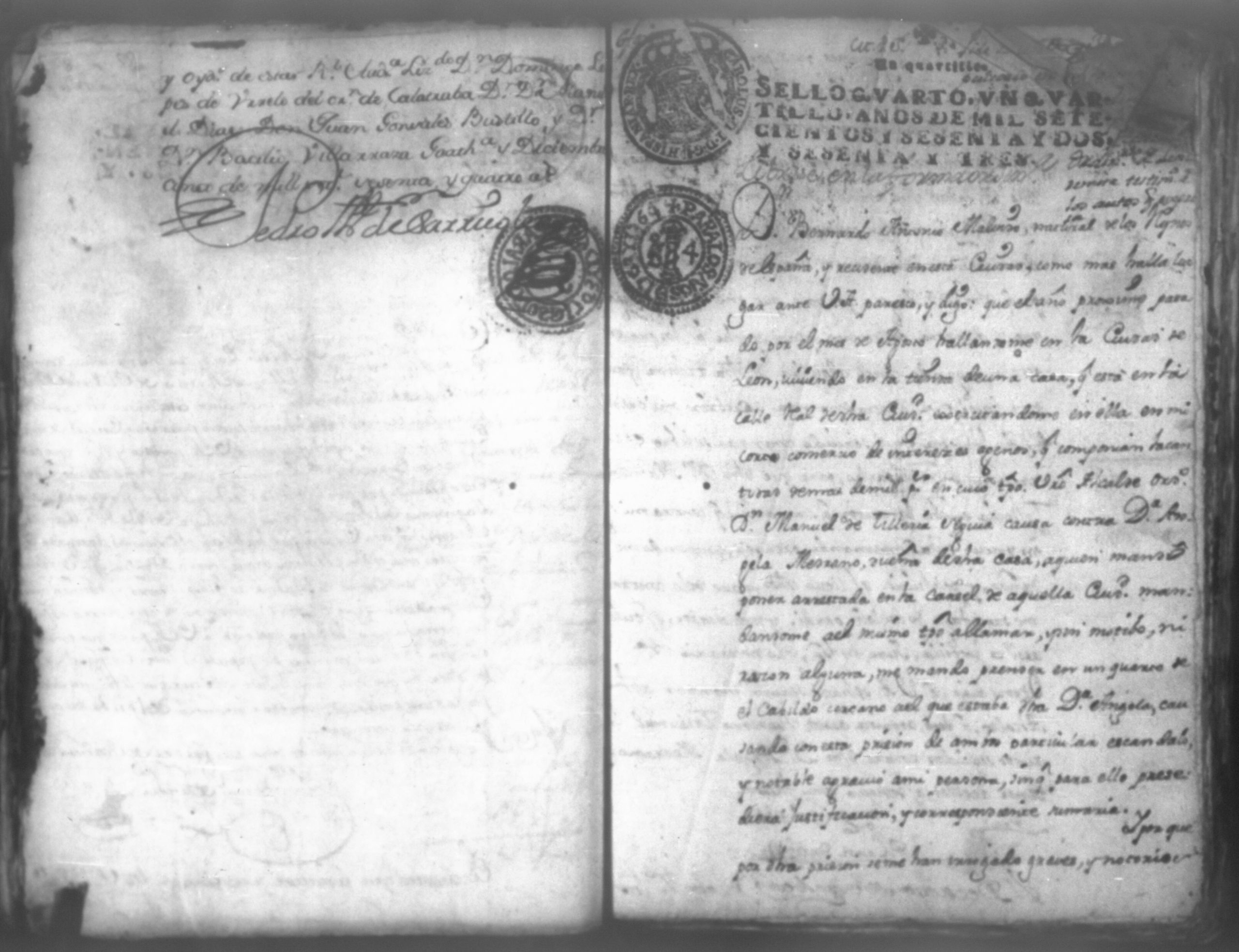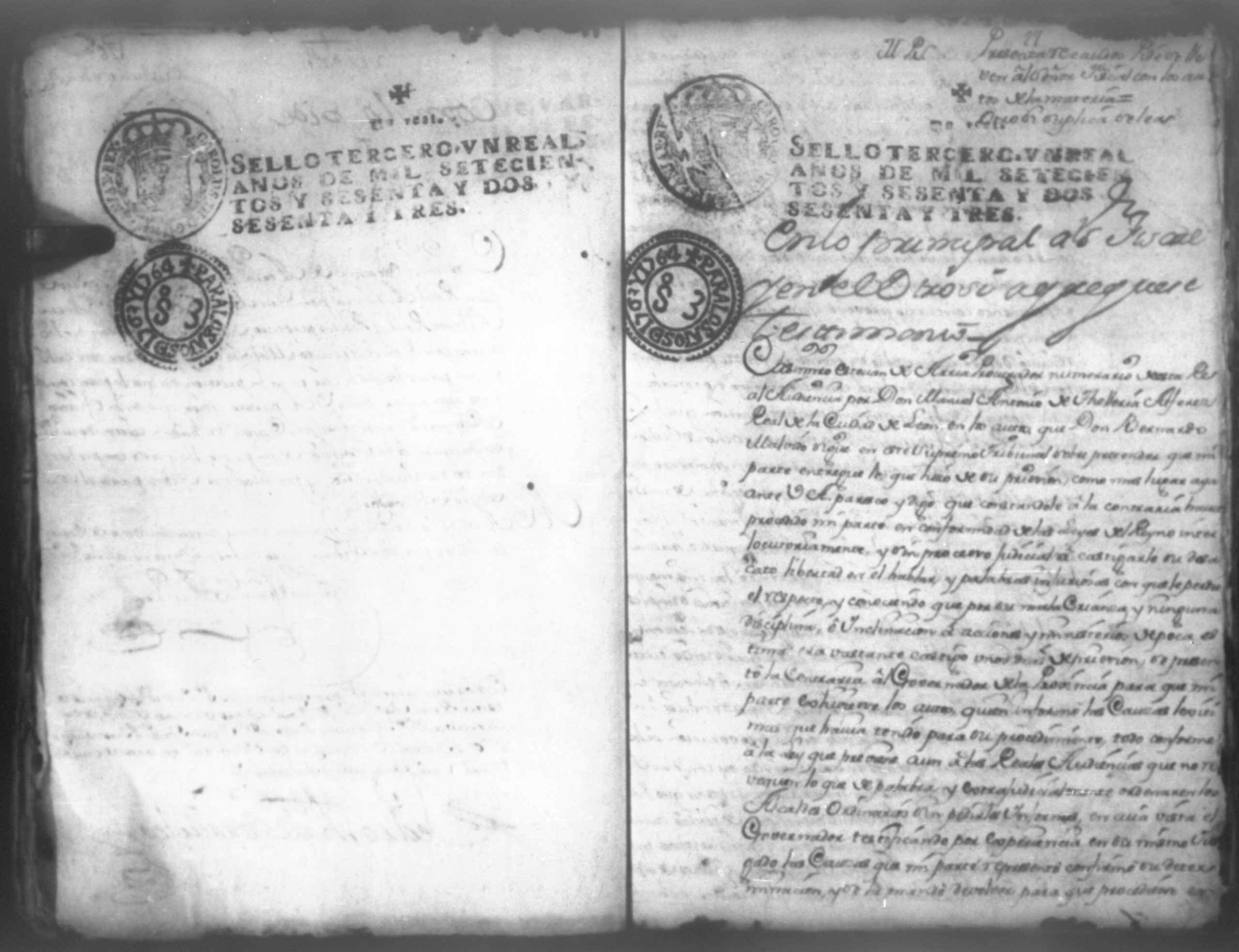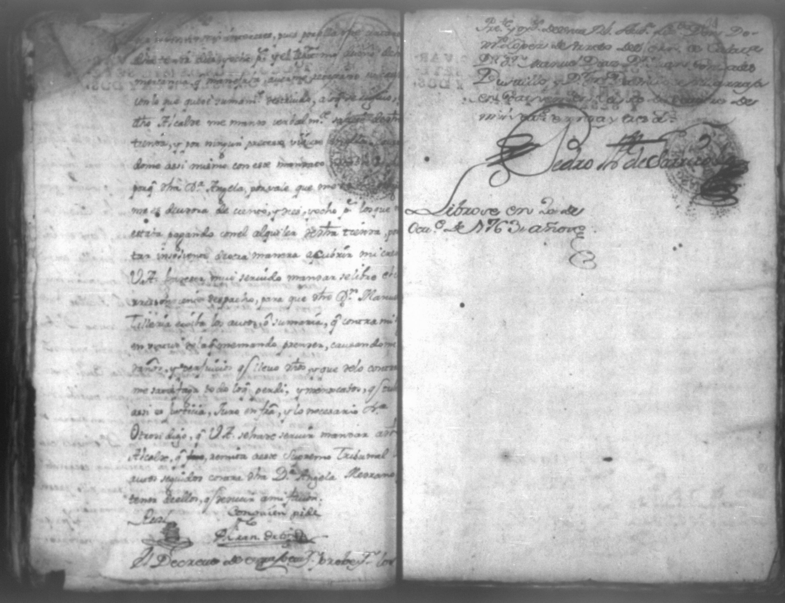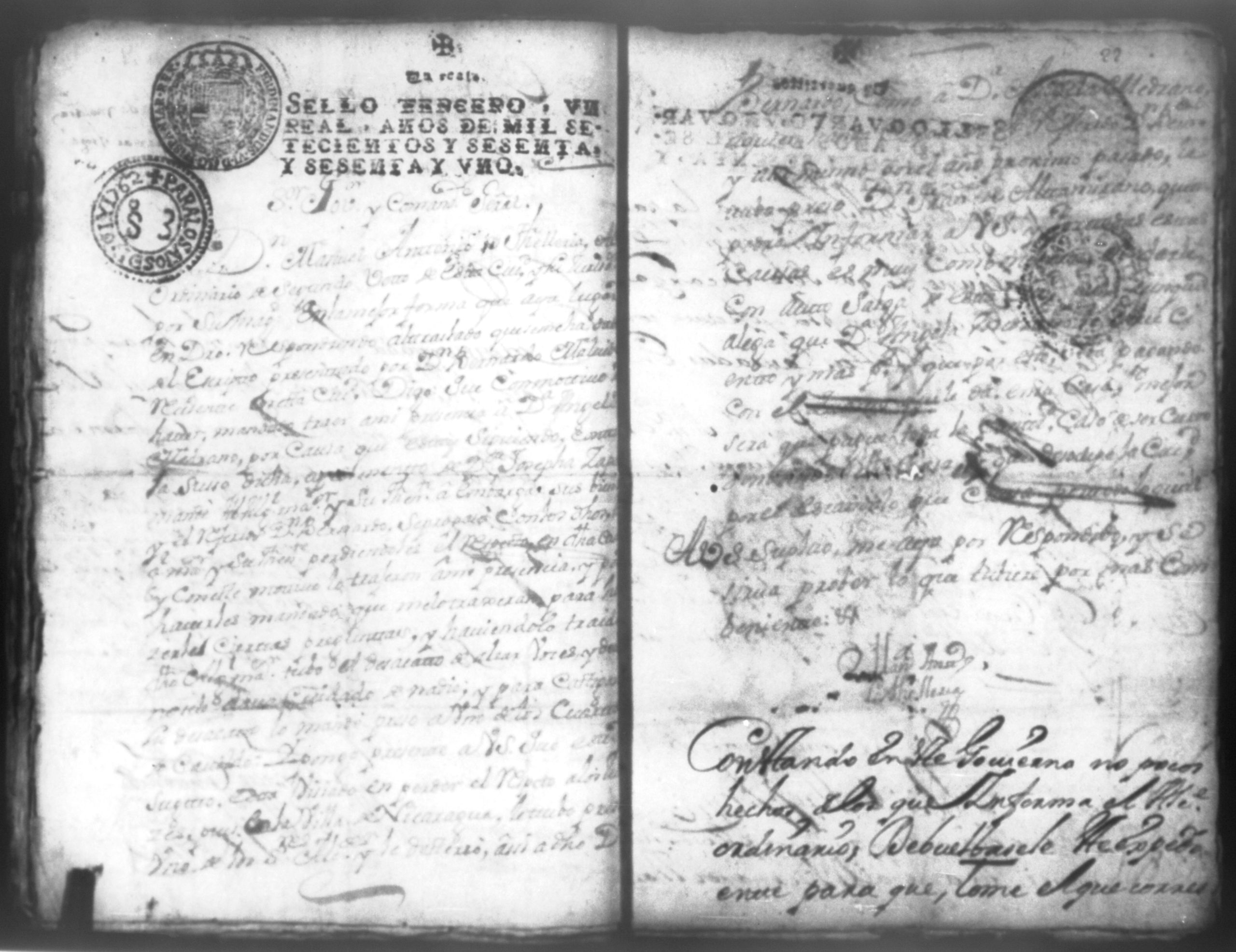 Temática: Don Manuel Antonio de Thelleria Alferes Mayor […] de Cano desta ciudad Ante Vuestra Majestad paresco y digo: que ami derecho combiene se sirva Vuestra Majestad hacer comparecer ante si al Capitan Don Francisco Altamirano y Velasco y a Don Francisco de Oses y debajo de la [relicencia] del juramento. Criminal. 1763. Contra Bernardo de Malvido.