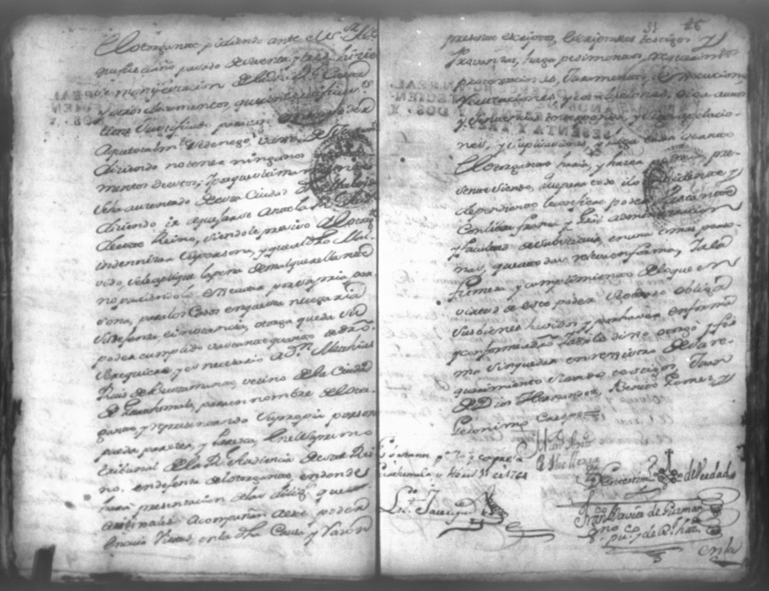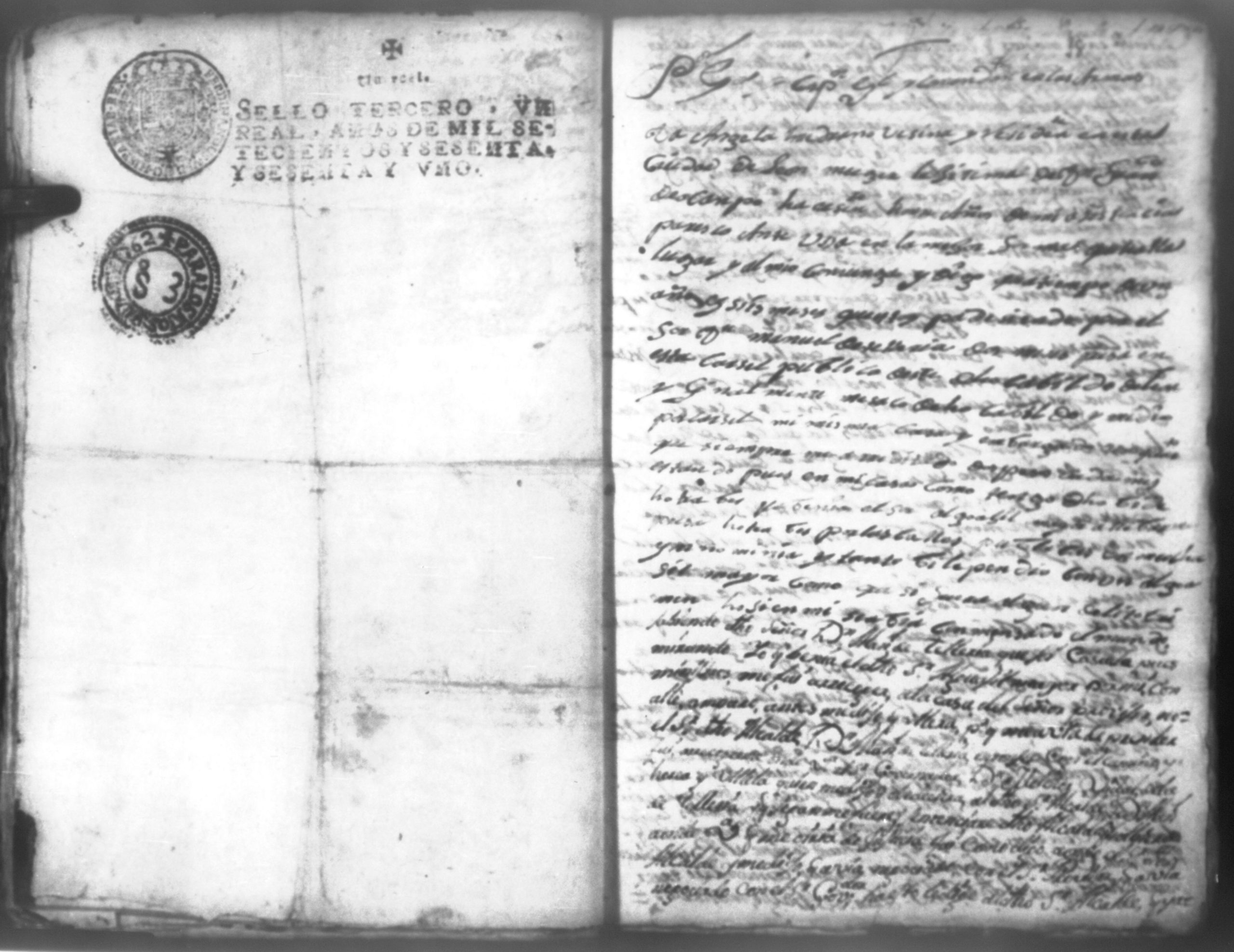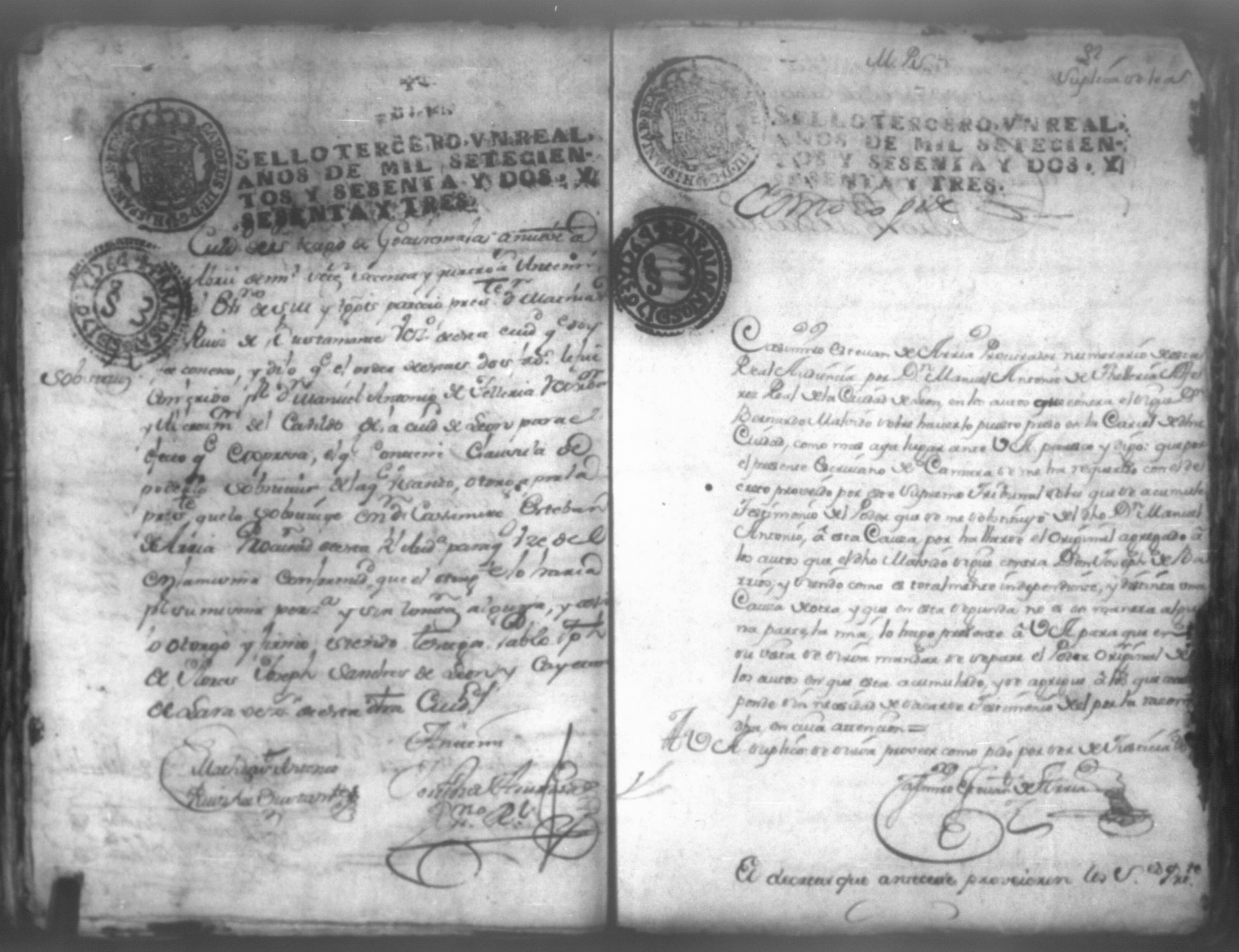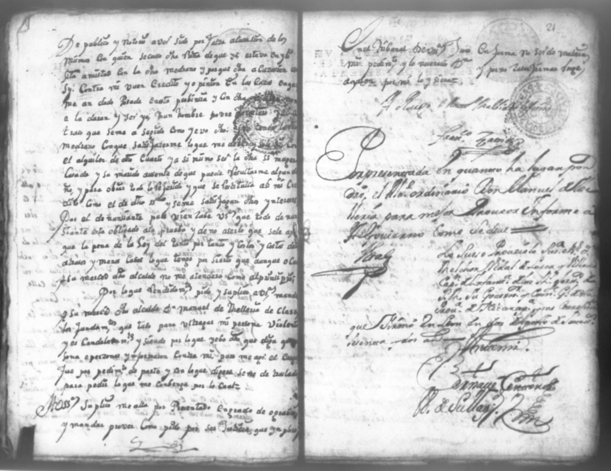 Temática: Don Manuel Antonio de Thelleria Alferes Mayor […] de Cano desta ciudad Ante Vuestra Majestad paresco y digo: que ami derecho combiene se sirva Vuestra Majestad hacer comparecer ante si al Capitan Don Francisco Altamirano y Velasco y a Don Francisco de Oses y debajo de la [relicencia] del juramento. Criminal. 1763. Contra Bernardo de Malvido.