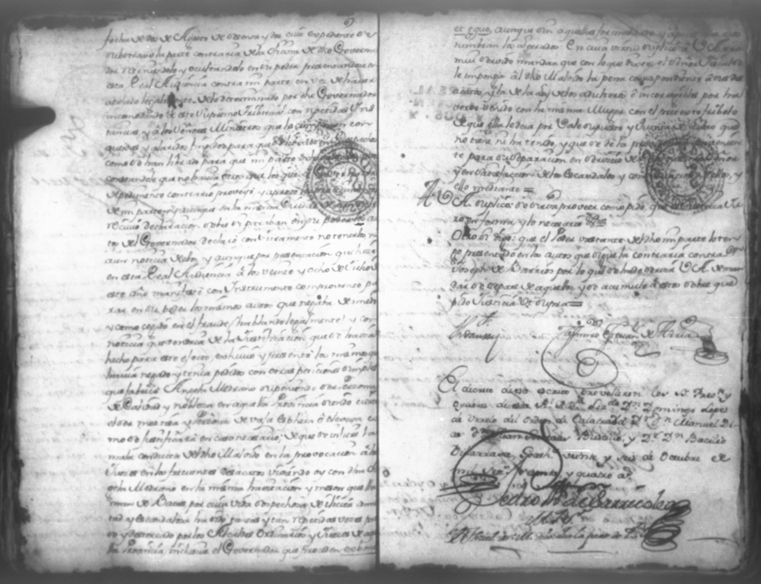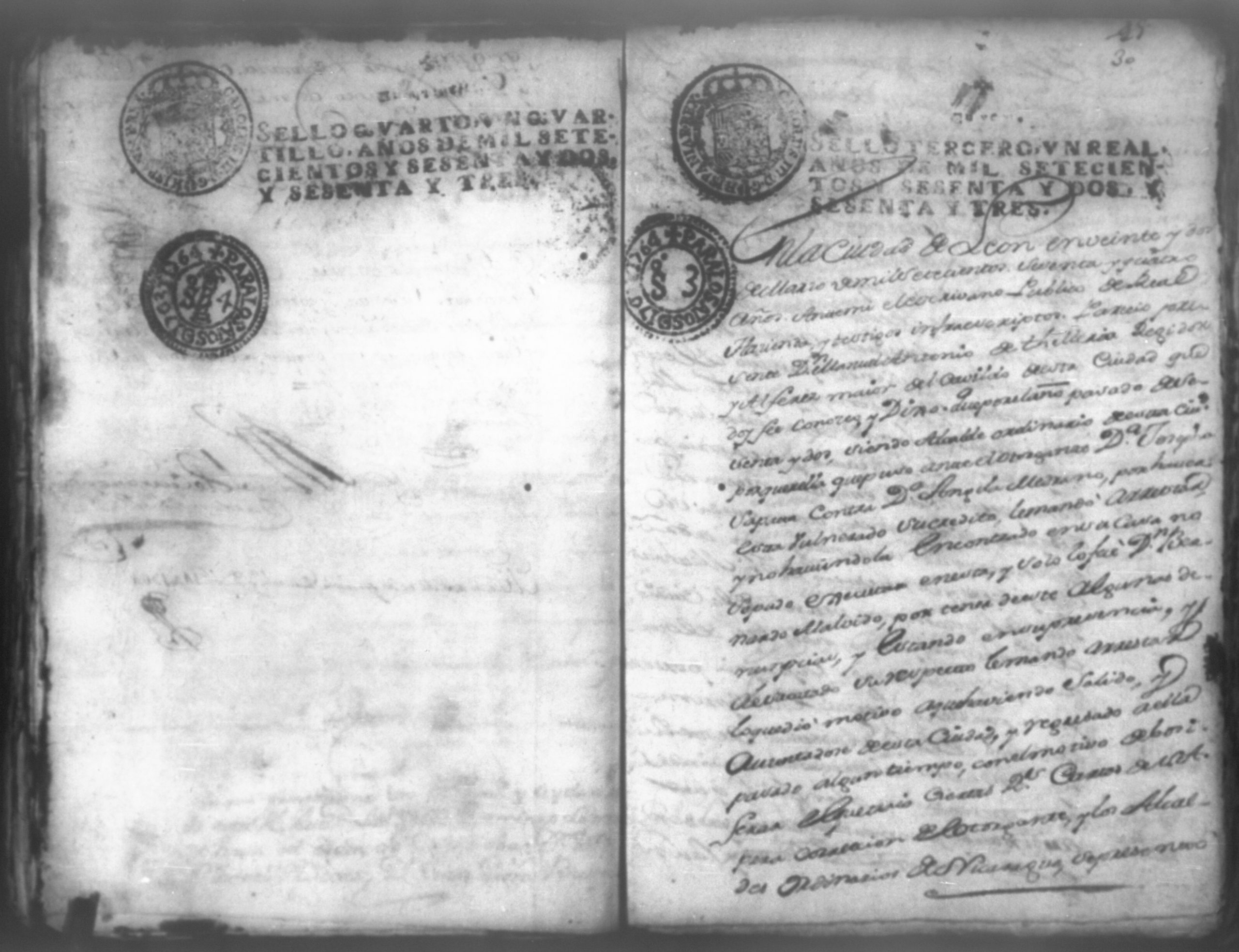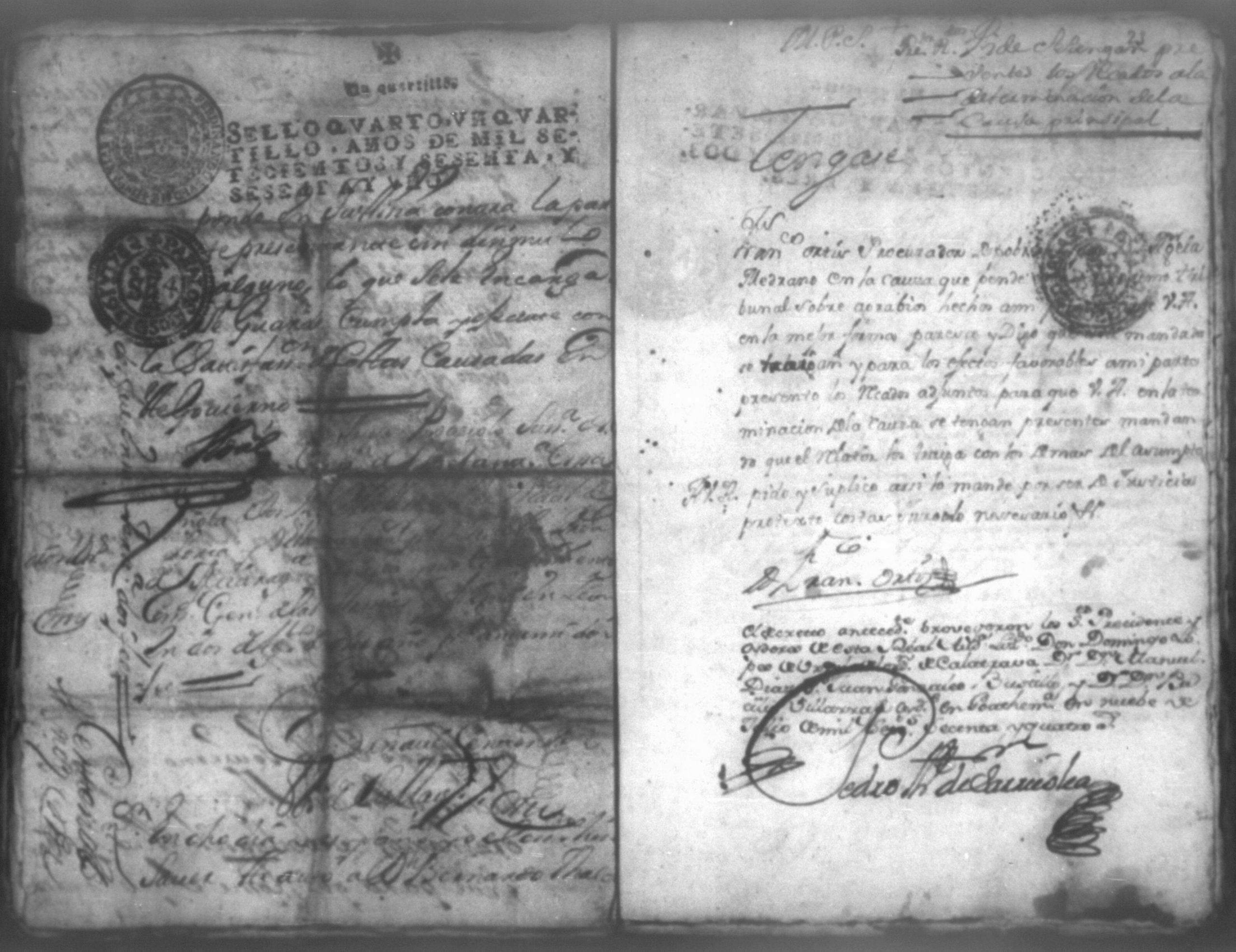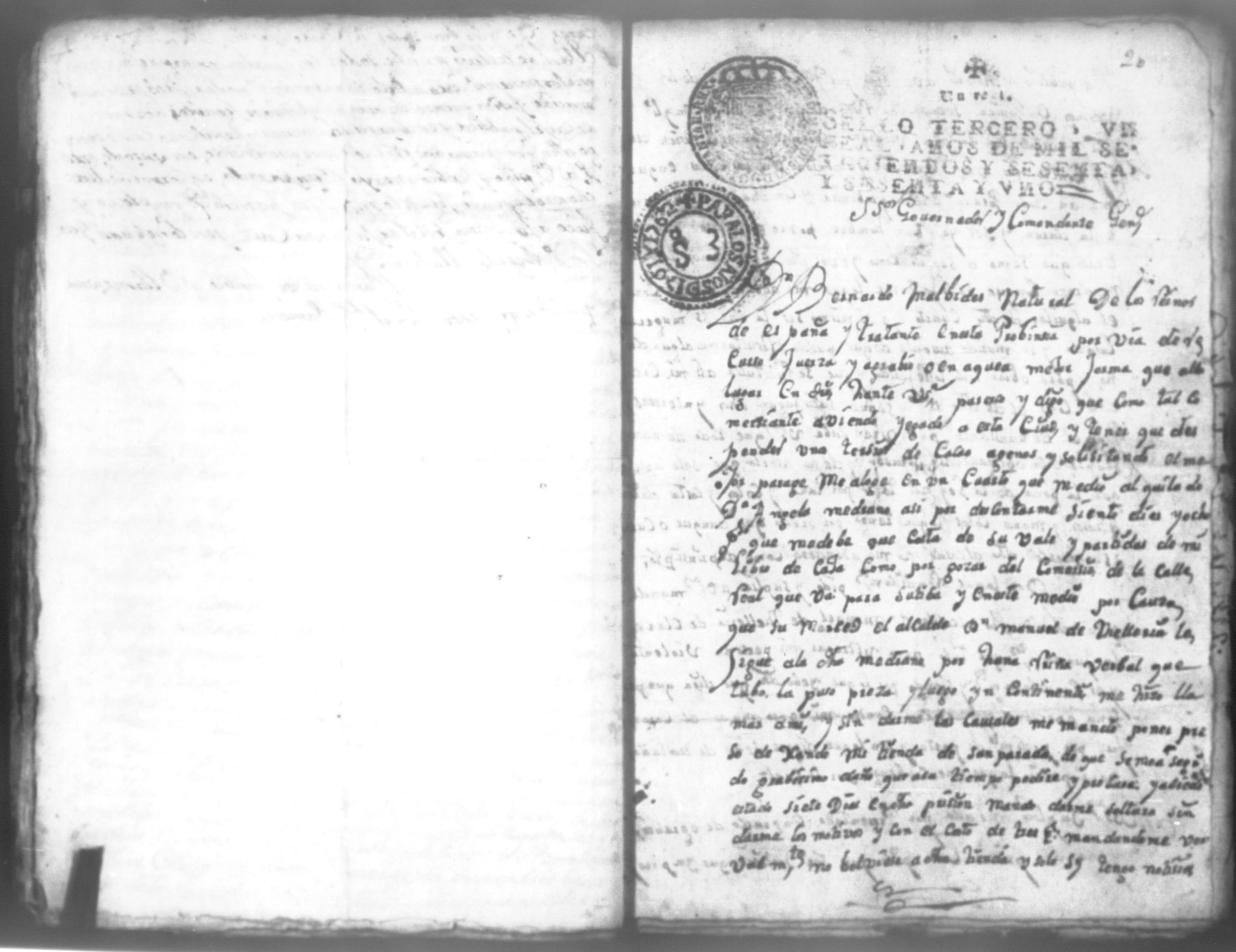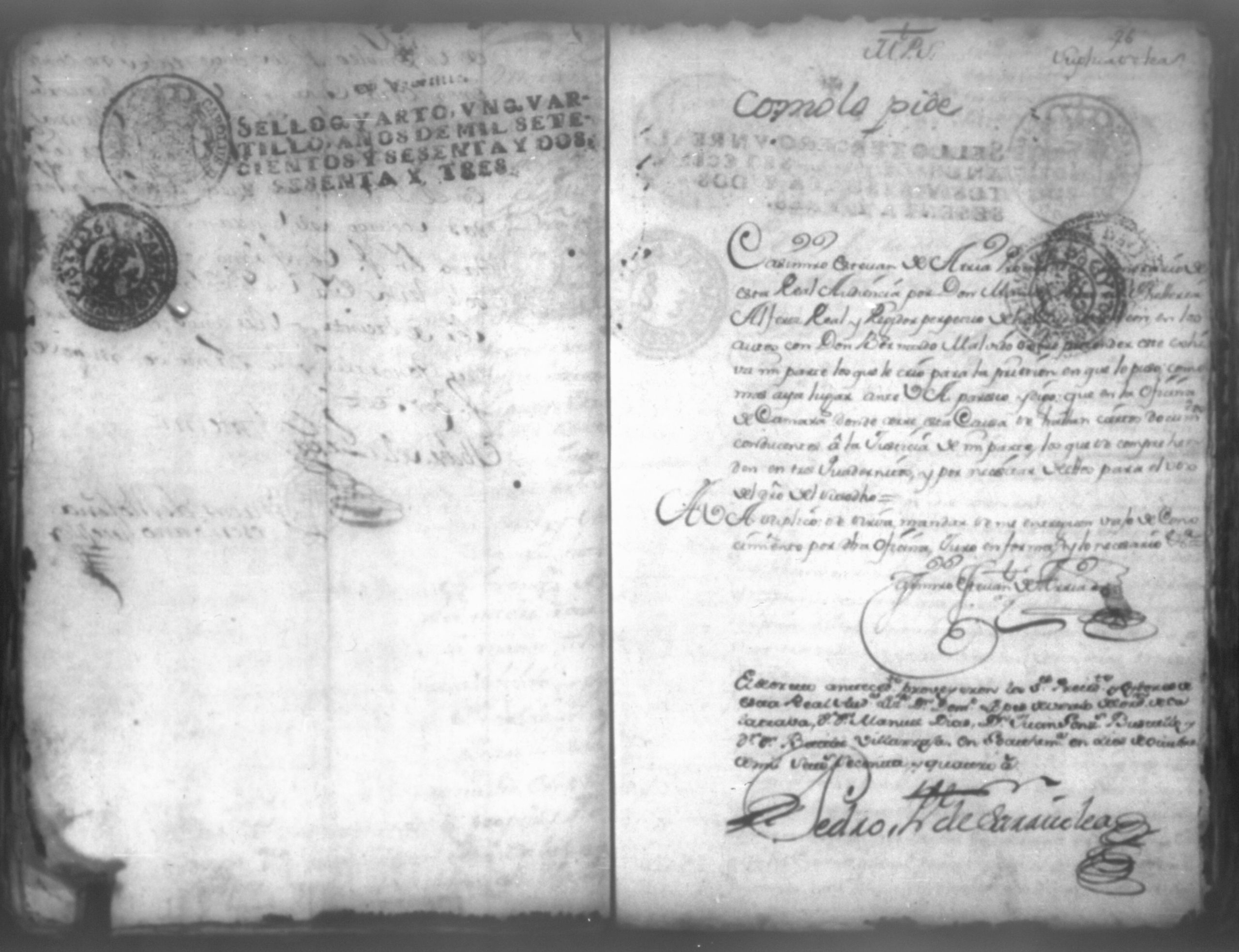 Temática: Don Manuel Antonio de Thelleria Alferes Mayor […] de Cano desta ciudad Ante Vuestra Majestad paresco y digo: que ami derecho combiene se sirva Vuestra Majestad hacer comparecer ante si al Capitan Don Francisco Altamirano y Velasco y a Don Francisco de Oses y debajo de la [relicencia] del juramento. Criminal. 1763. Contra Bernardo de Malvido.