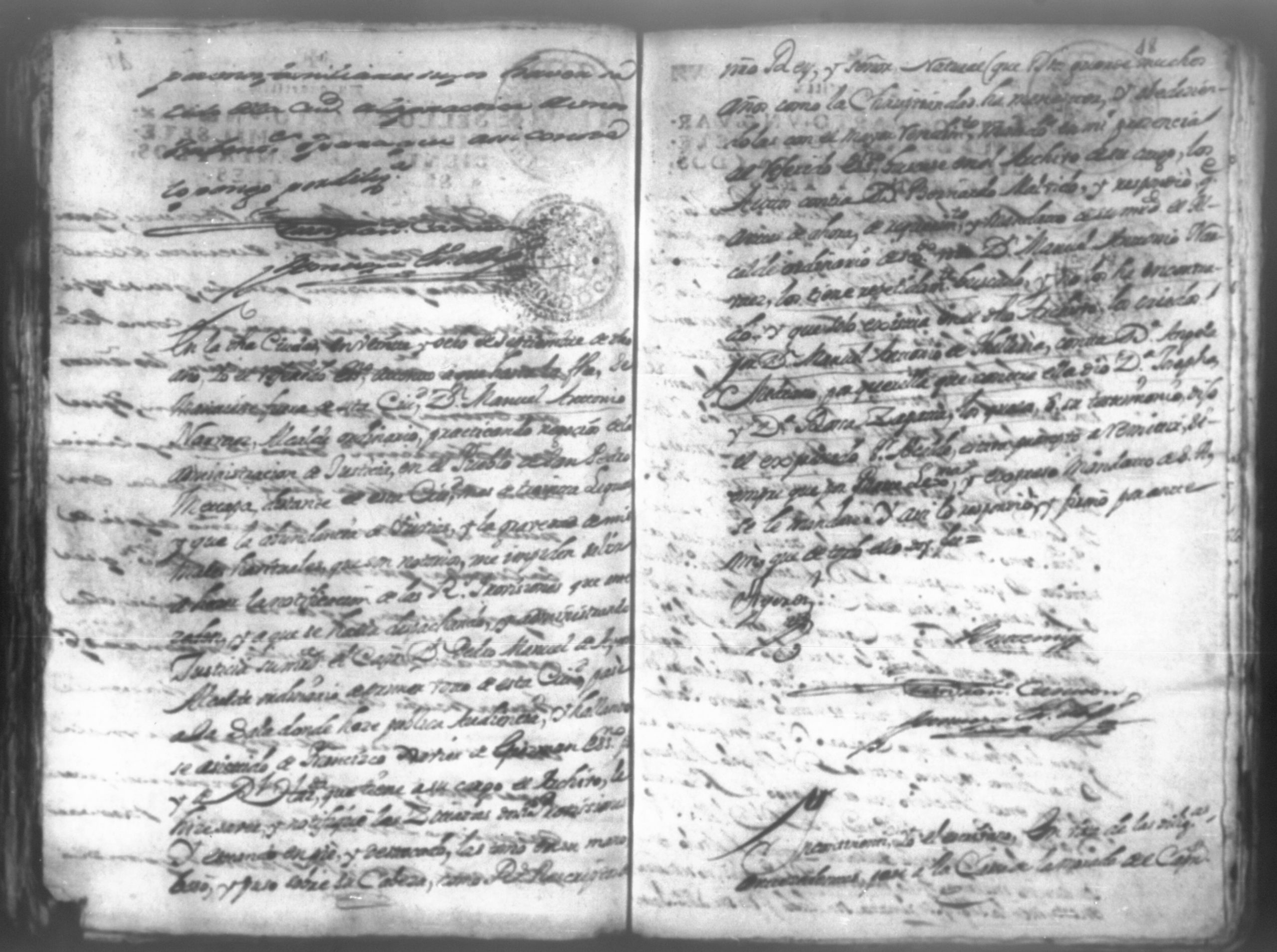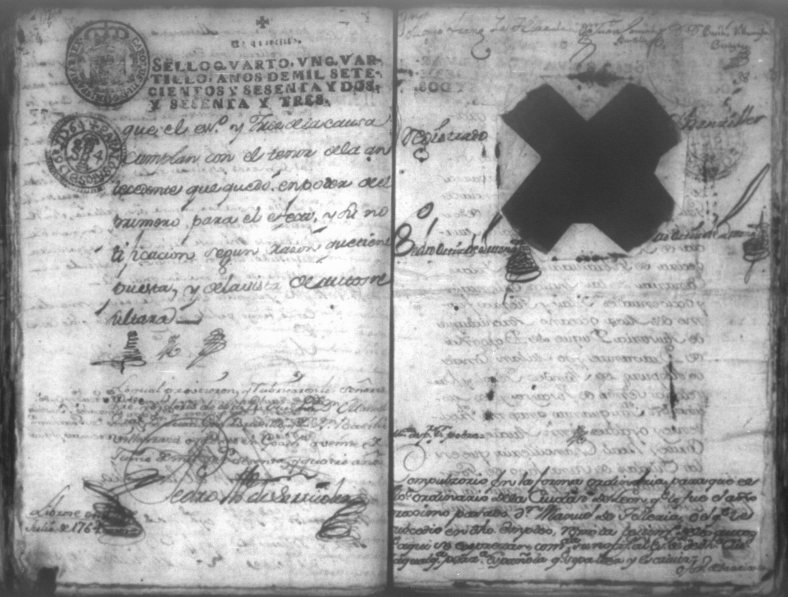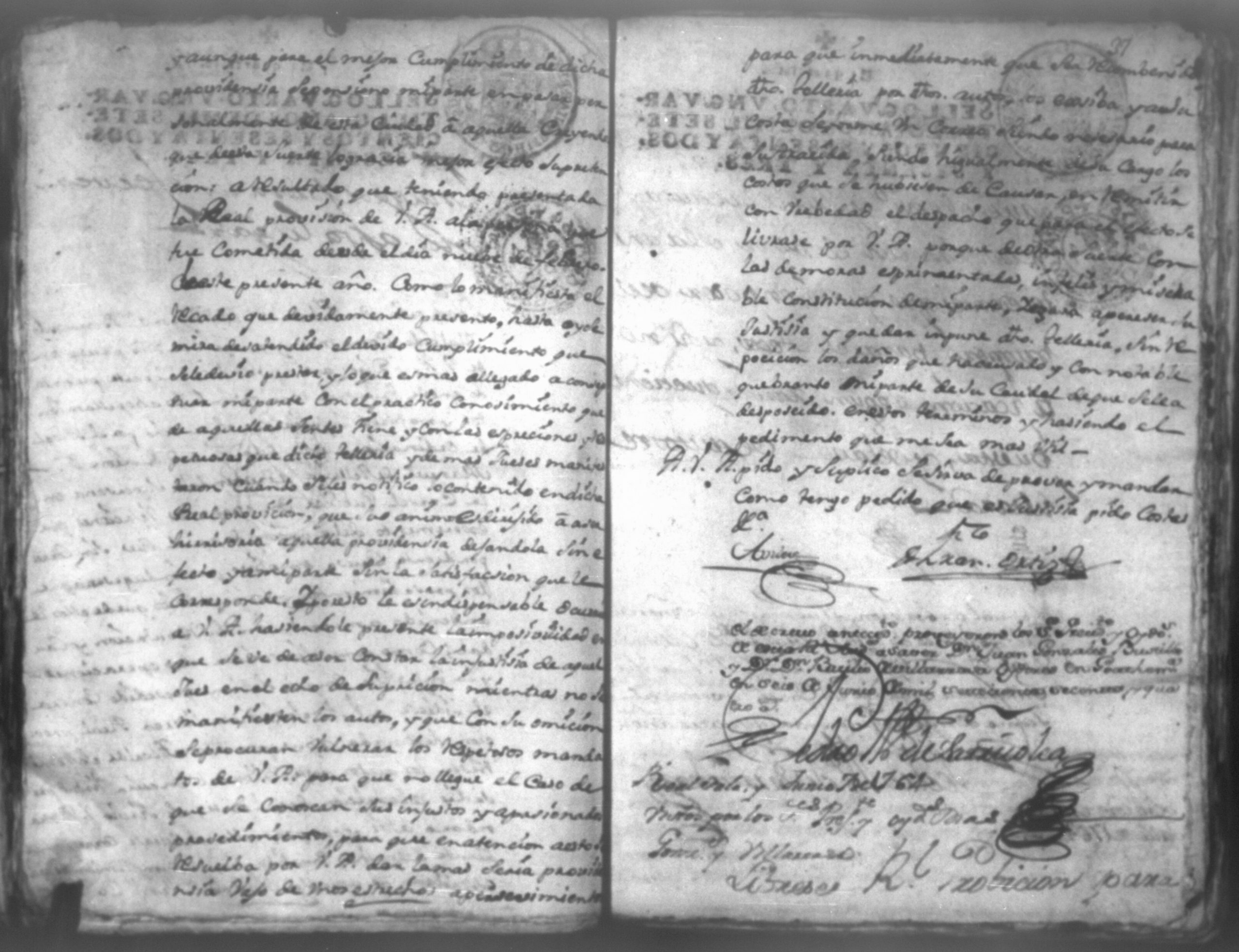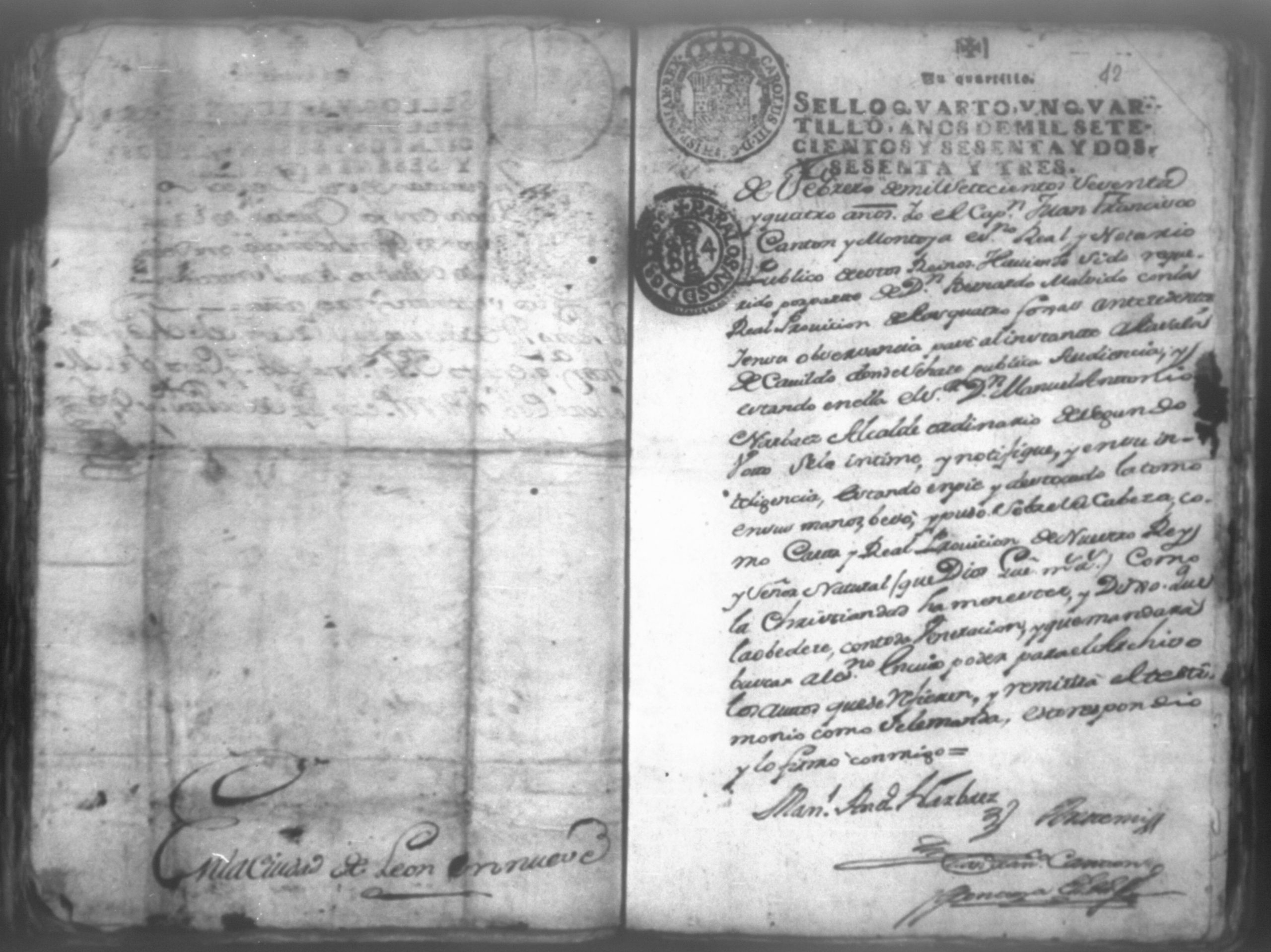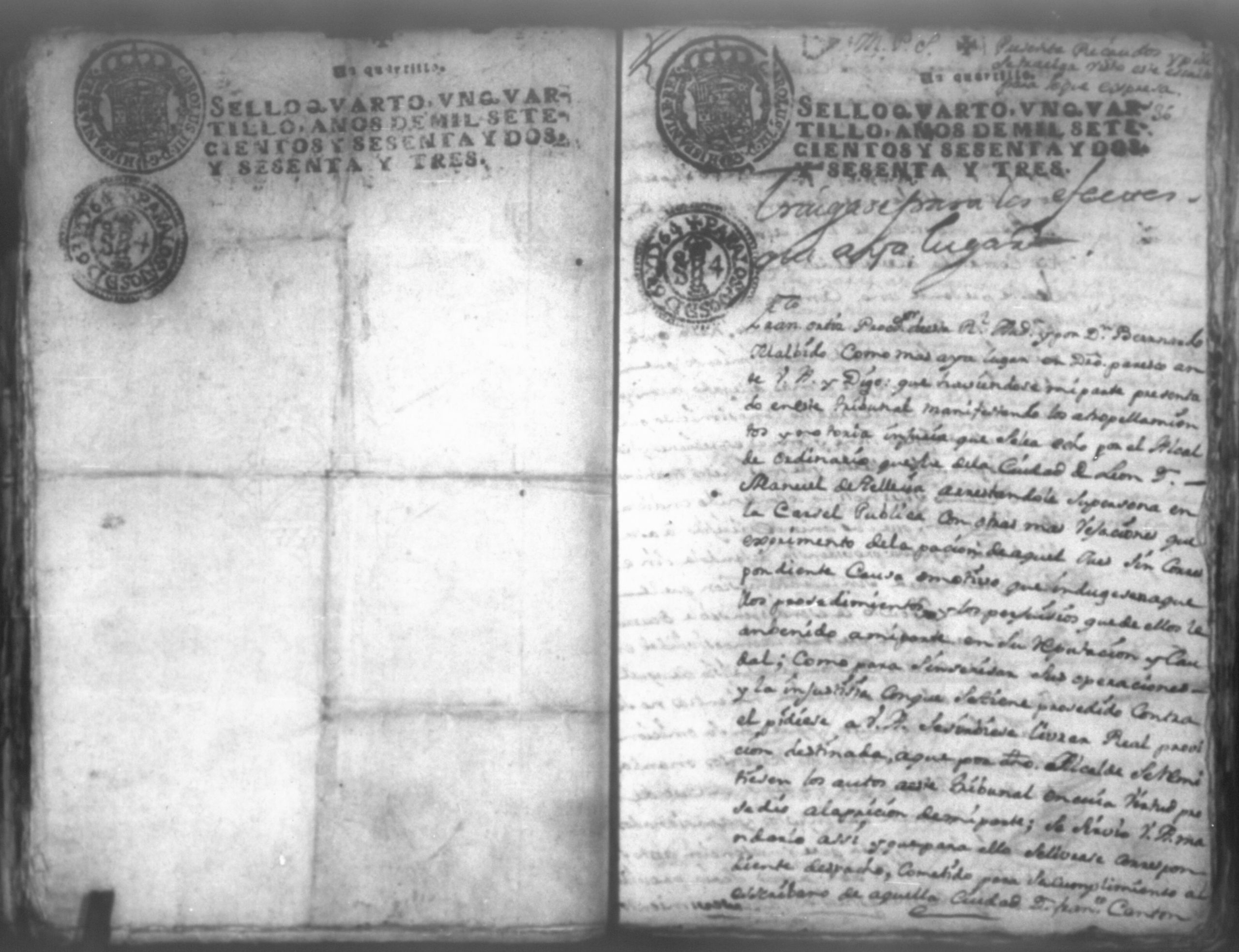 Temática: Don Manuel Antonio de Thelleria Alferes Mayor […] de Cano desta ciudad Ante Vuestra Majestad paresco y digo: que ami derecho combiene se sirva Vuestra Majestad hacer comparecer ante si al Capitan Don Francisco Altamirano y Velasco y a Don Francisco de Oses y debajo de la [relicencia] del juramento. Criminal. 1763. Contra Bernardo de Malvido.