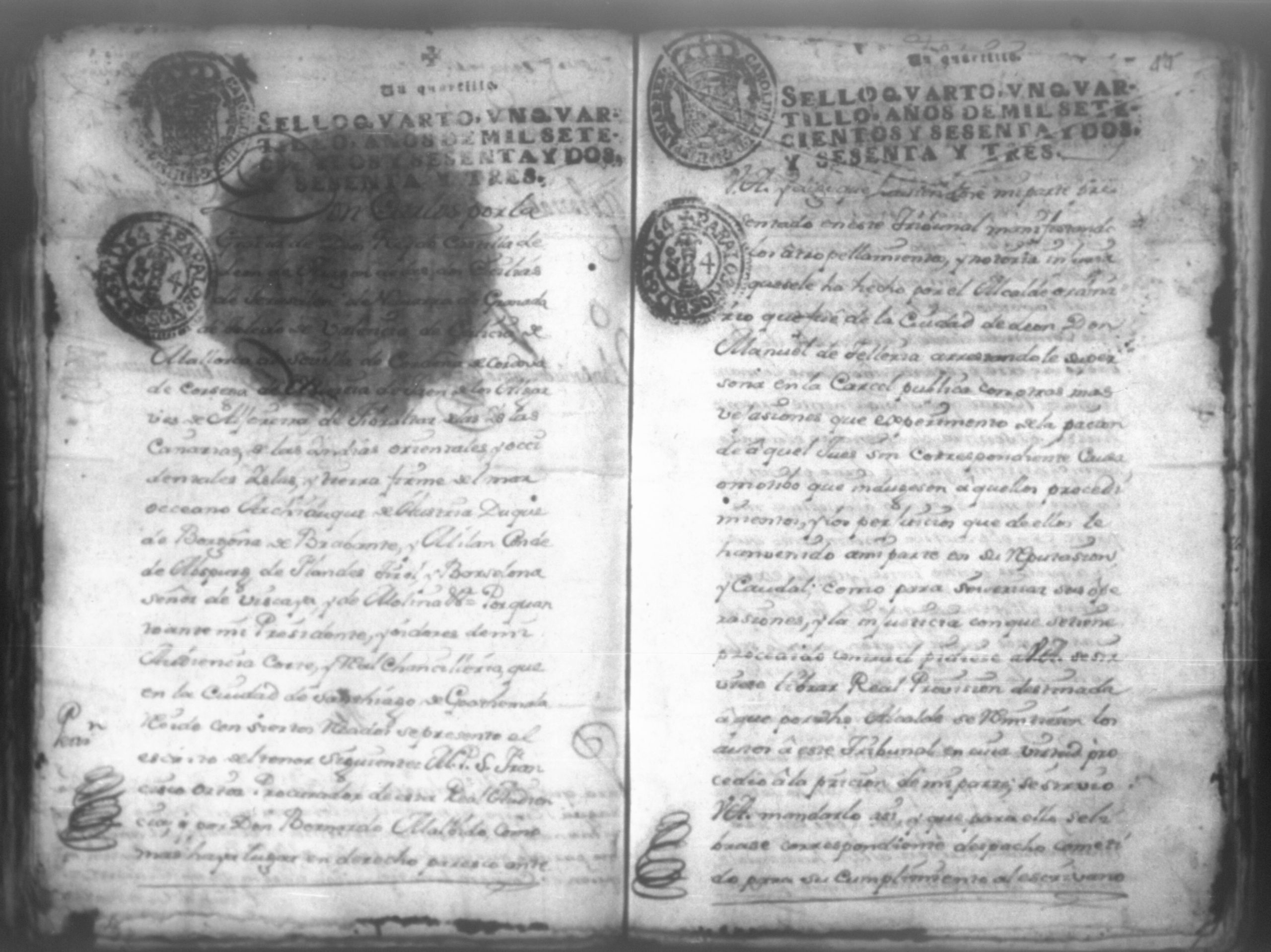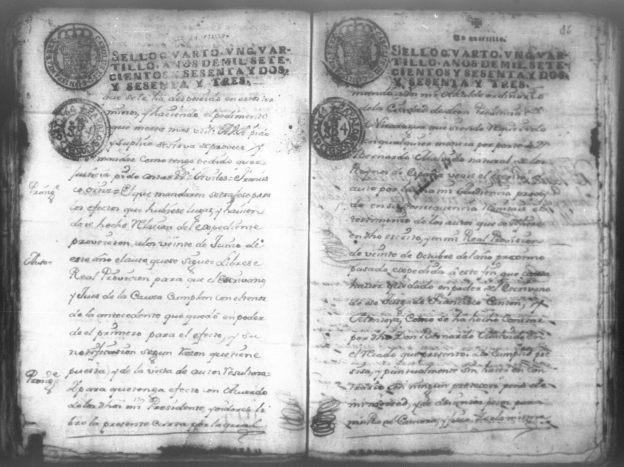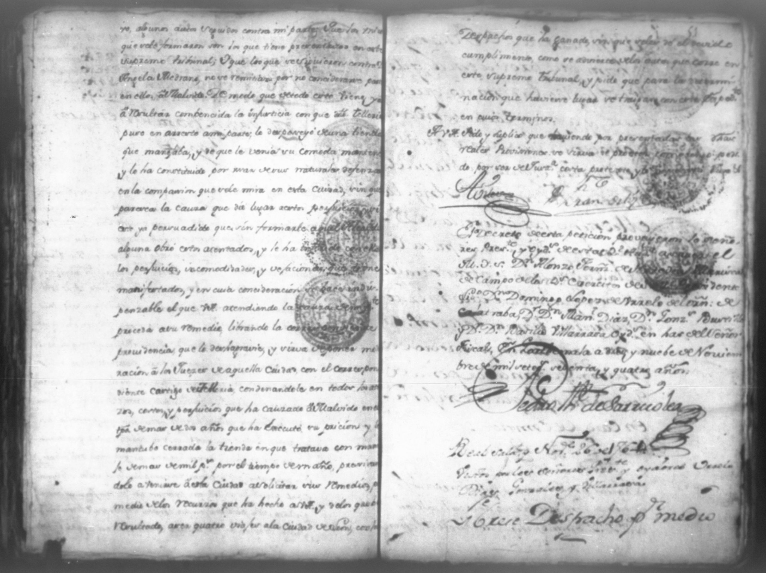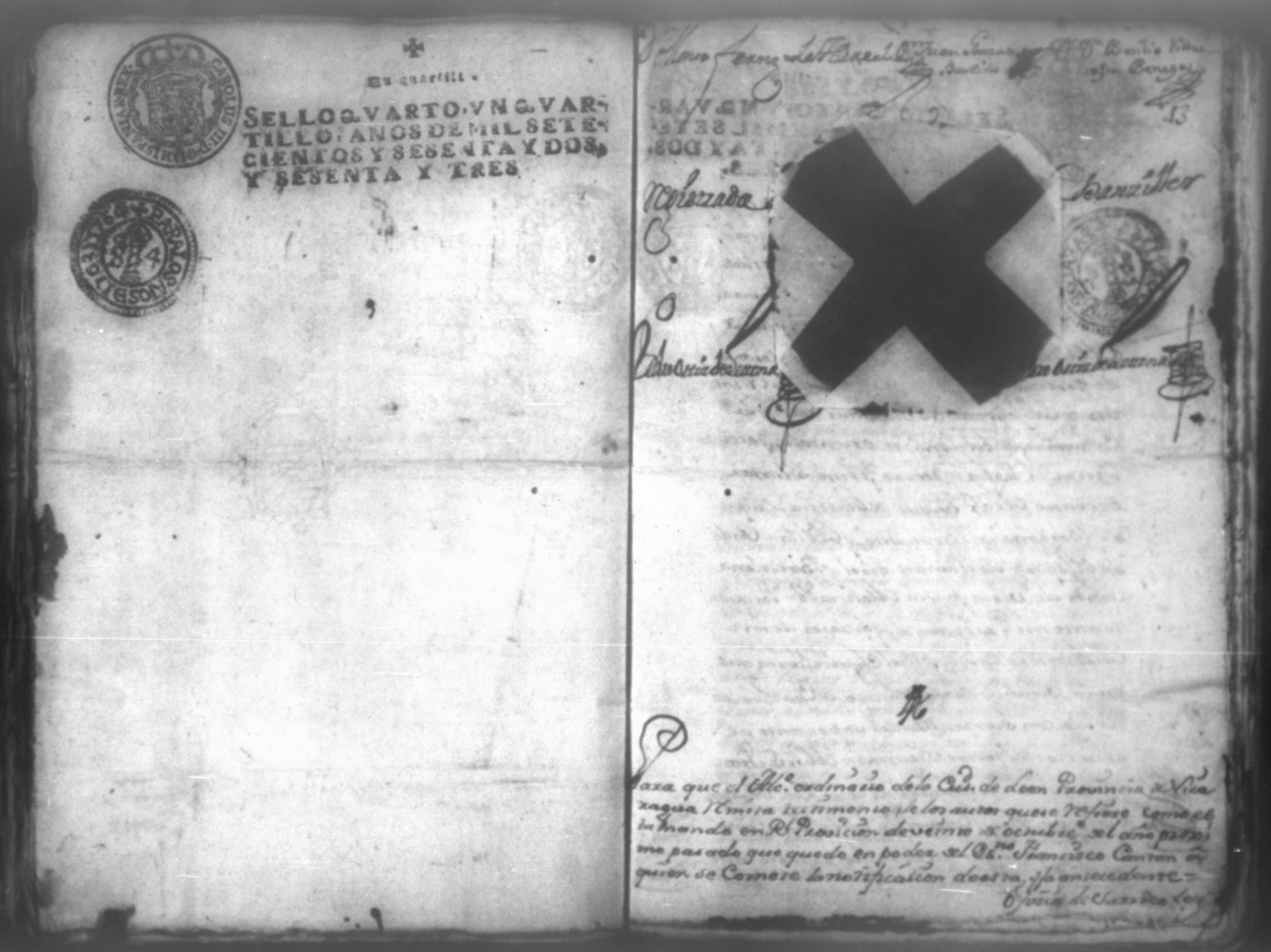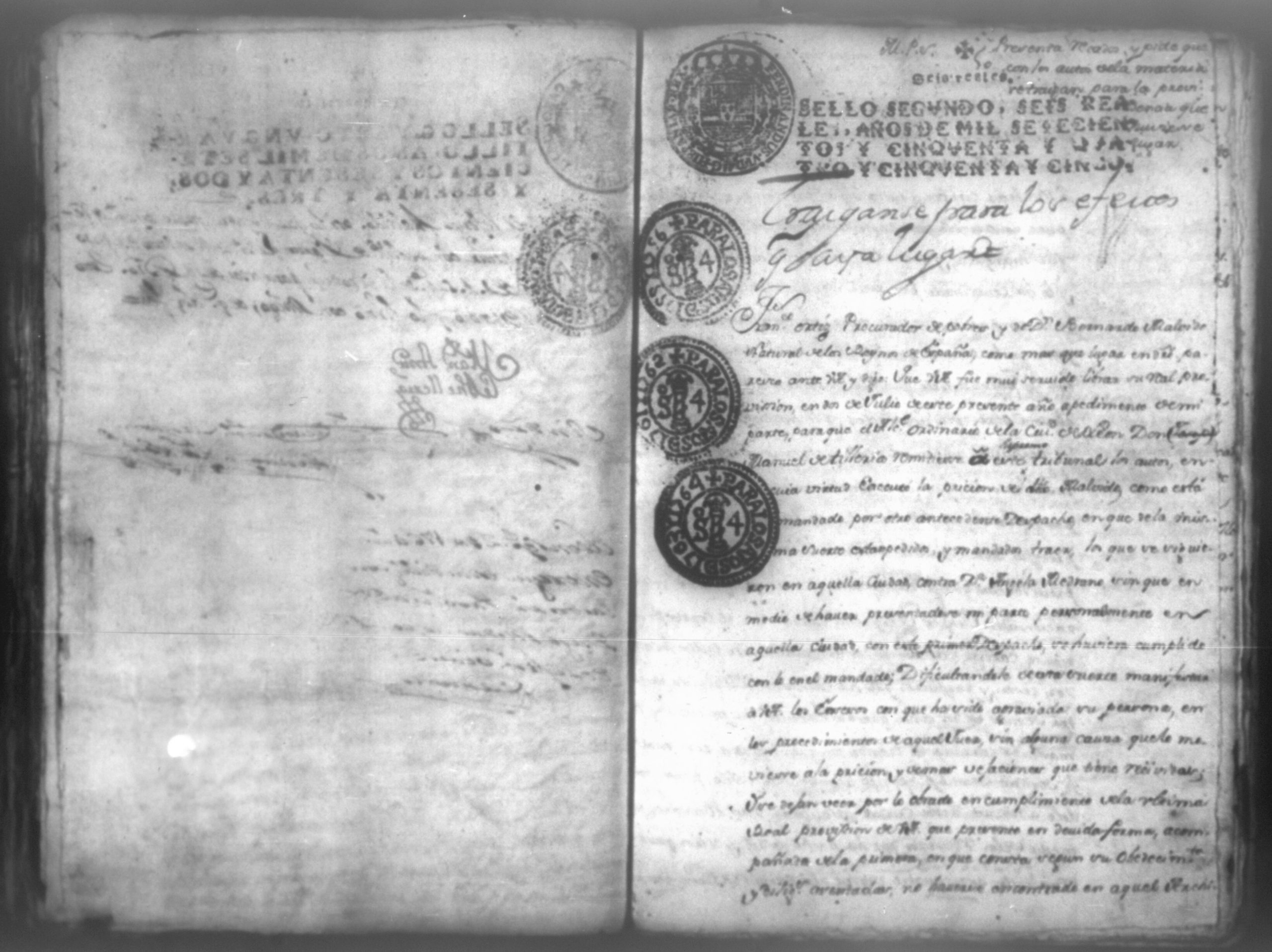 Temática: Don Manuel Antonio de Thelleria Alferes Mayor […] de Cano desta ciudad Ante Vuestra Majestad paresco y digo: que ami derecho combiene se sirva Vuestra Majestad hacer comparecer ante si al Capitan Don Francisco Altamirano y Velasco y a Don Francisco de Oses y debajo de la [relicencia] del juramento. Criminal. 1763. Contra Bernardo de Malvido.