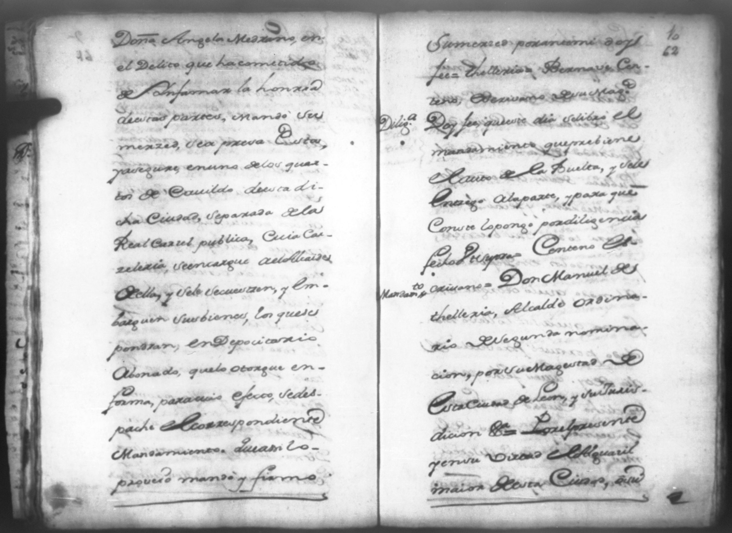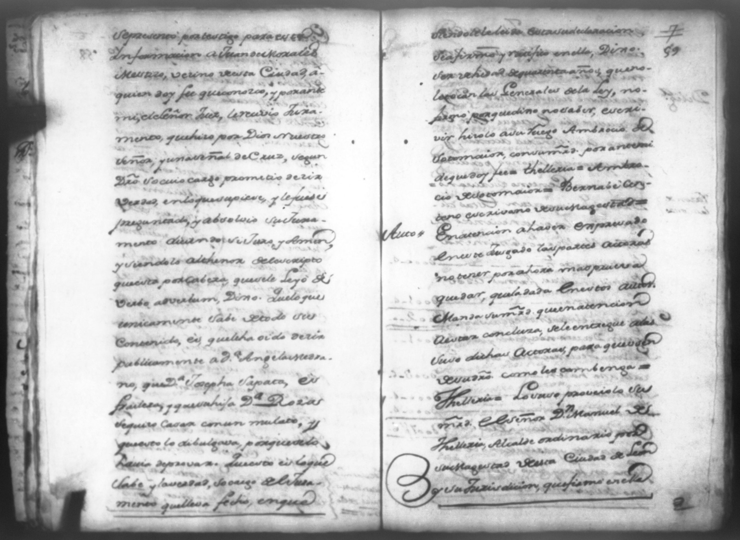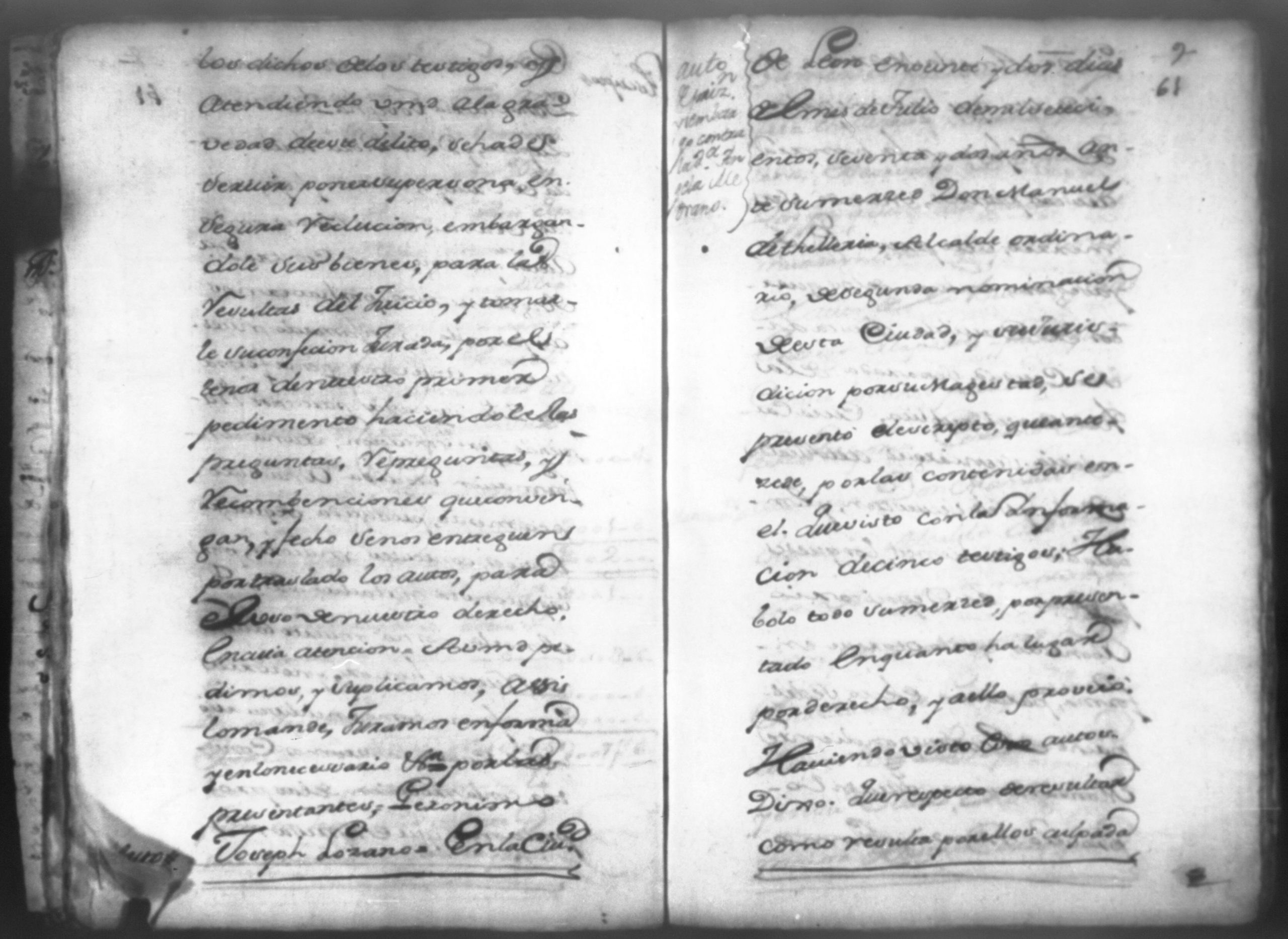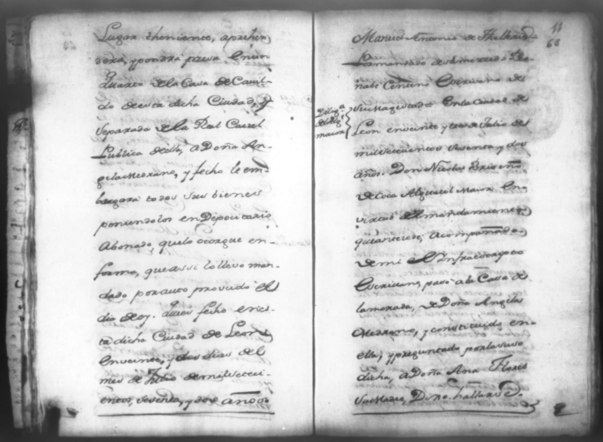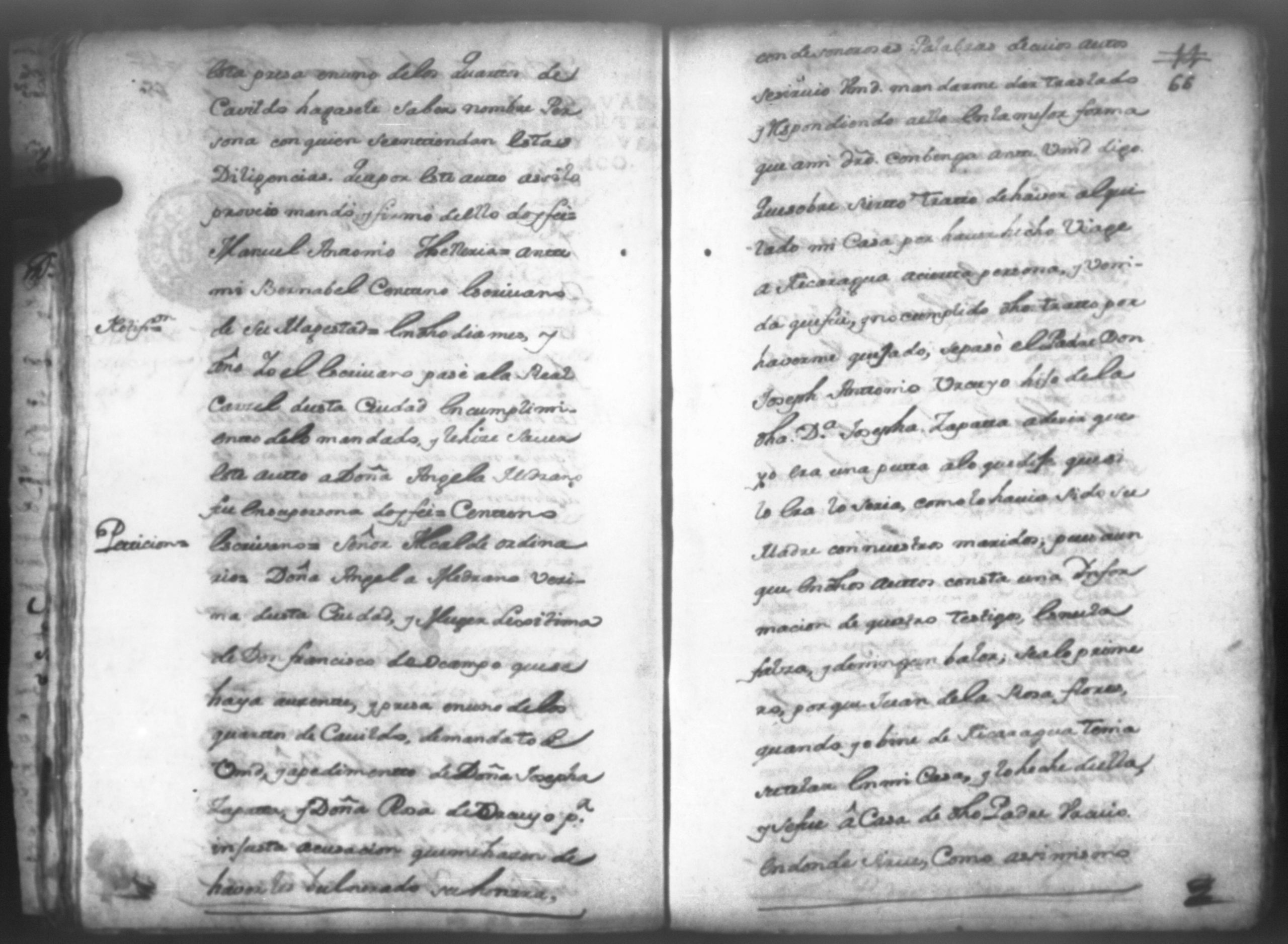 Temática: Don Manuel Antonio de Thelleria Alferes Mayor […] de Cano desta ciudad Ante Vuestra Majestad paresco y digo: que ami derecho combiene se sirva Vuestra Majestad hacer comparecer ante si al Capitan Don Francisco Altamirano y Velasco y a Don Francisco de Oses y debajo de la [relicencia] del juramento. Criminal. 1763. Contra Bernardo de Malvido.