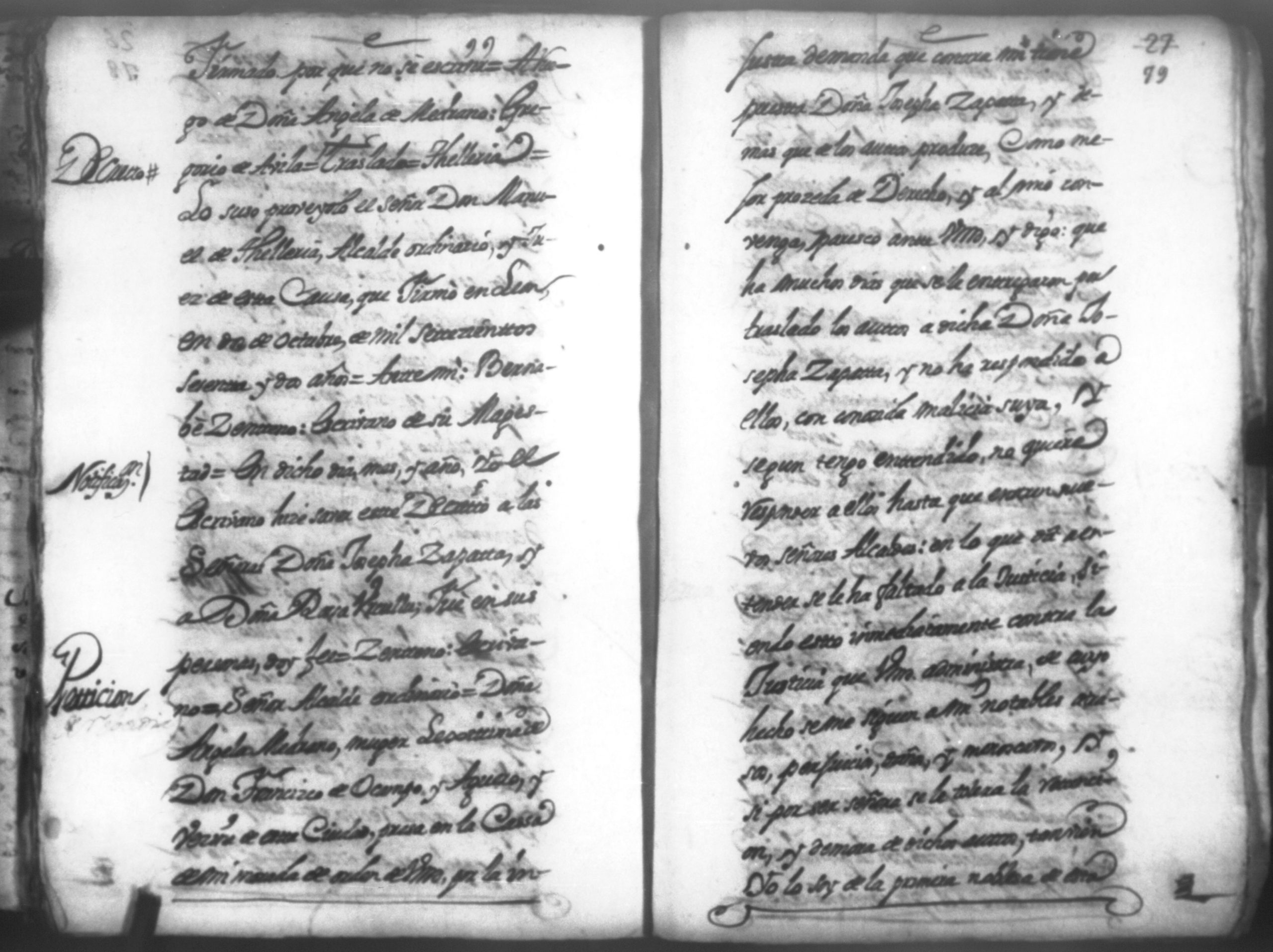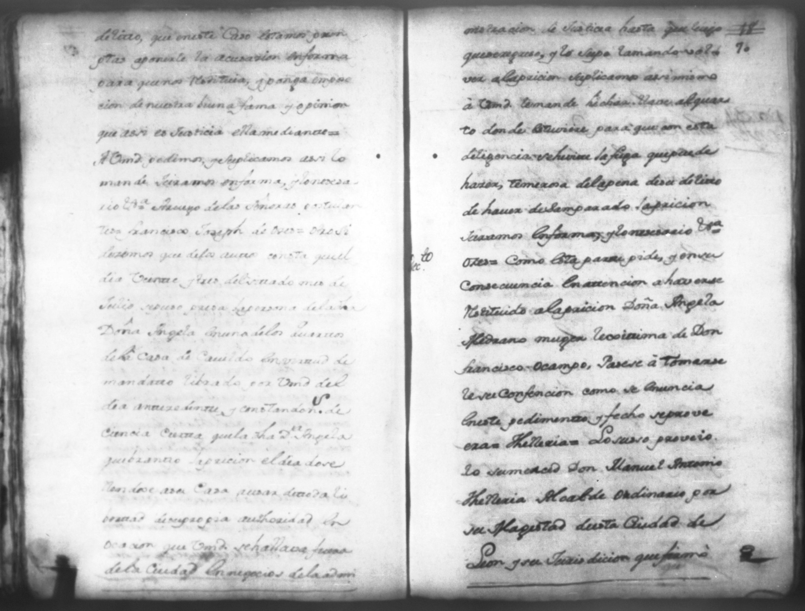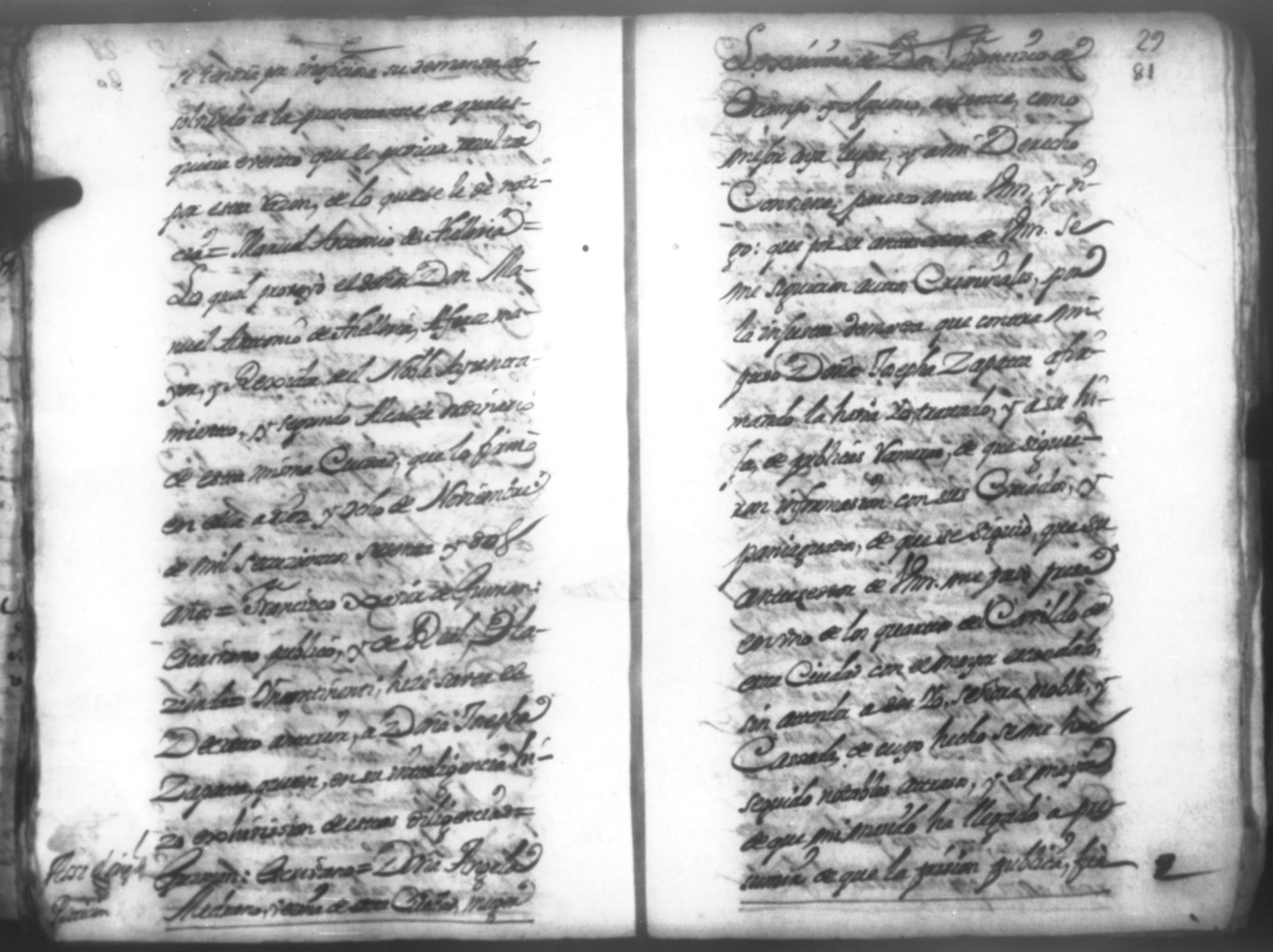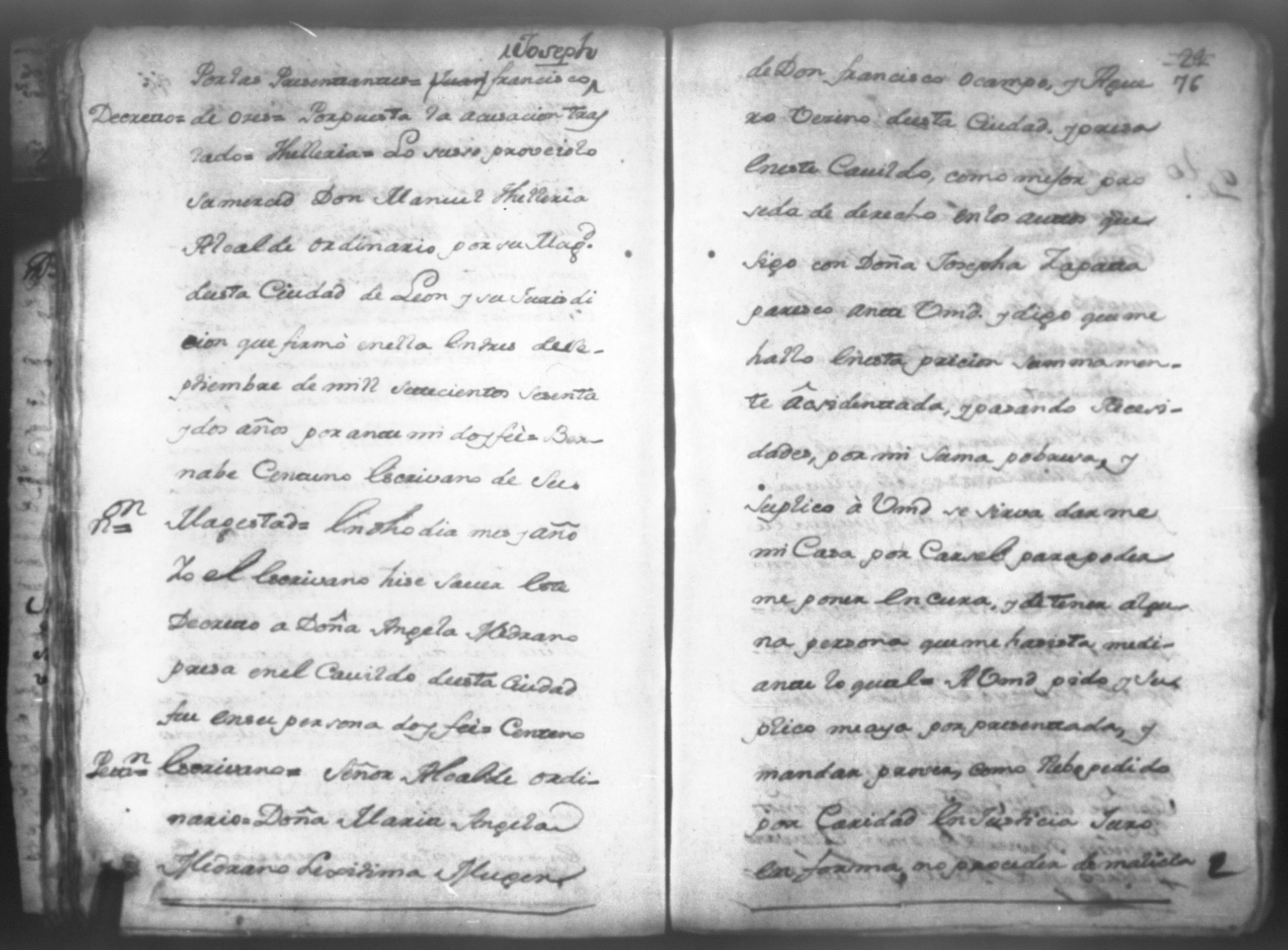 Temática: Don Manuel Antonio de Thelleria Alferes Mayor […] de Cano desta ciudad Ante Vuestra Majestad paresco y digo: que ami derecho combiene se sirva Vuestra Majestad hacer comparecer ante si al Capitan Don Francisco Altamirano y Velasco y a Don Francisco de Oses y debajo de la [relicencia] del juramento. Criminal. 1763. Contra Bernardo de Malvido.