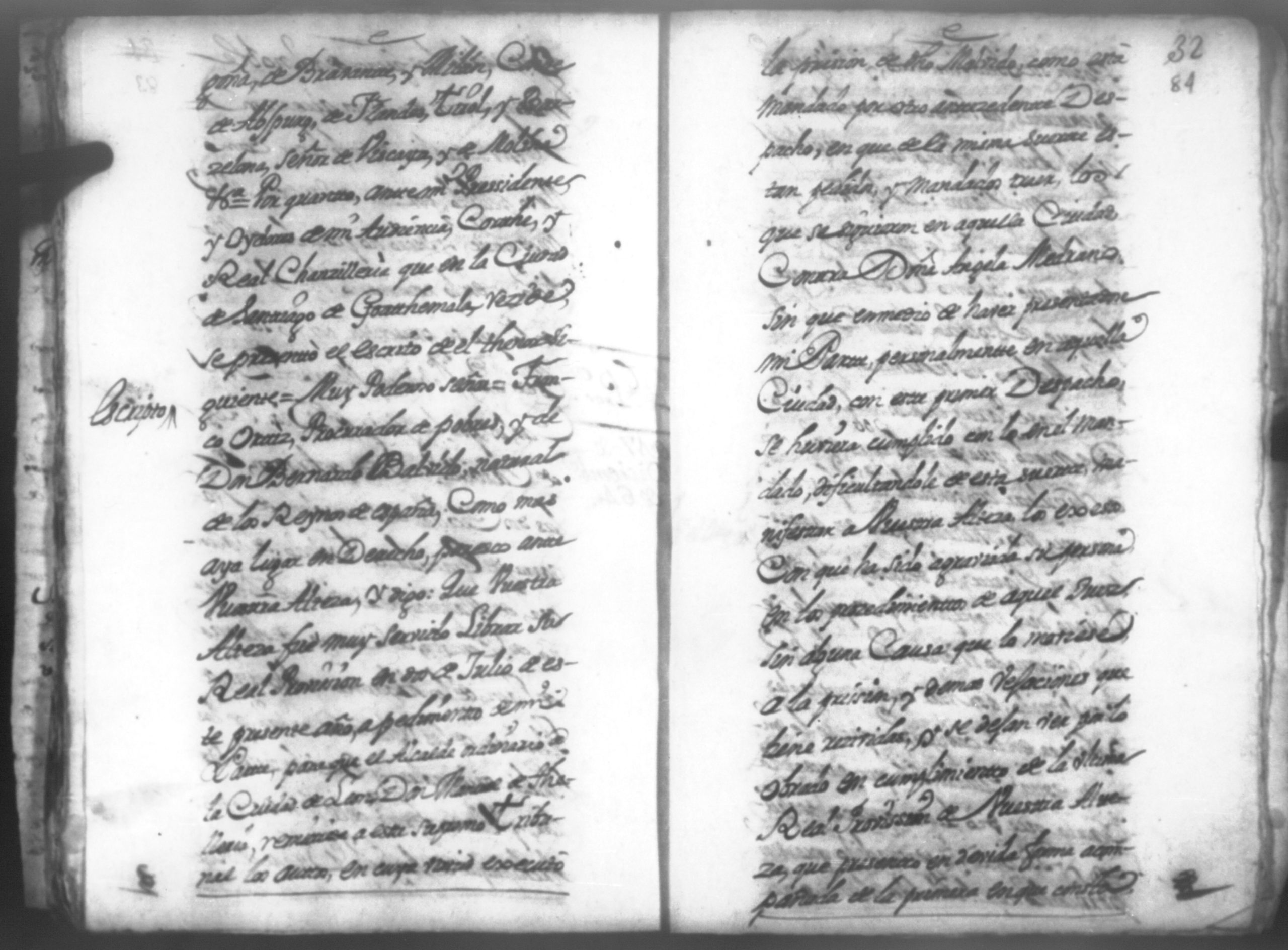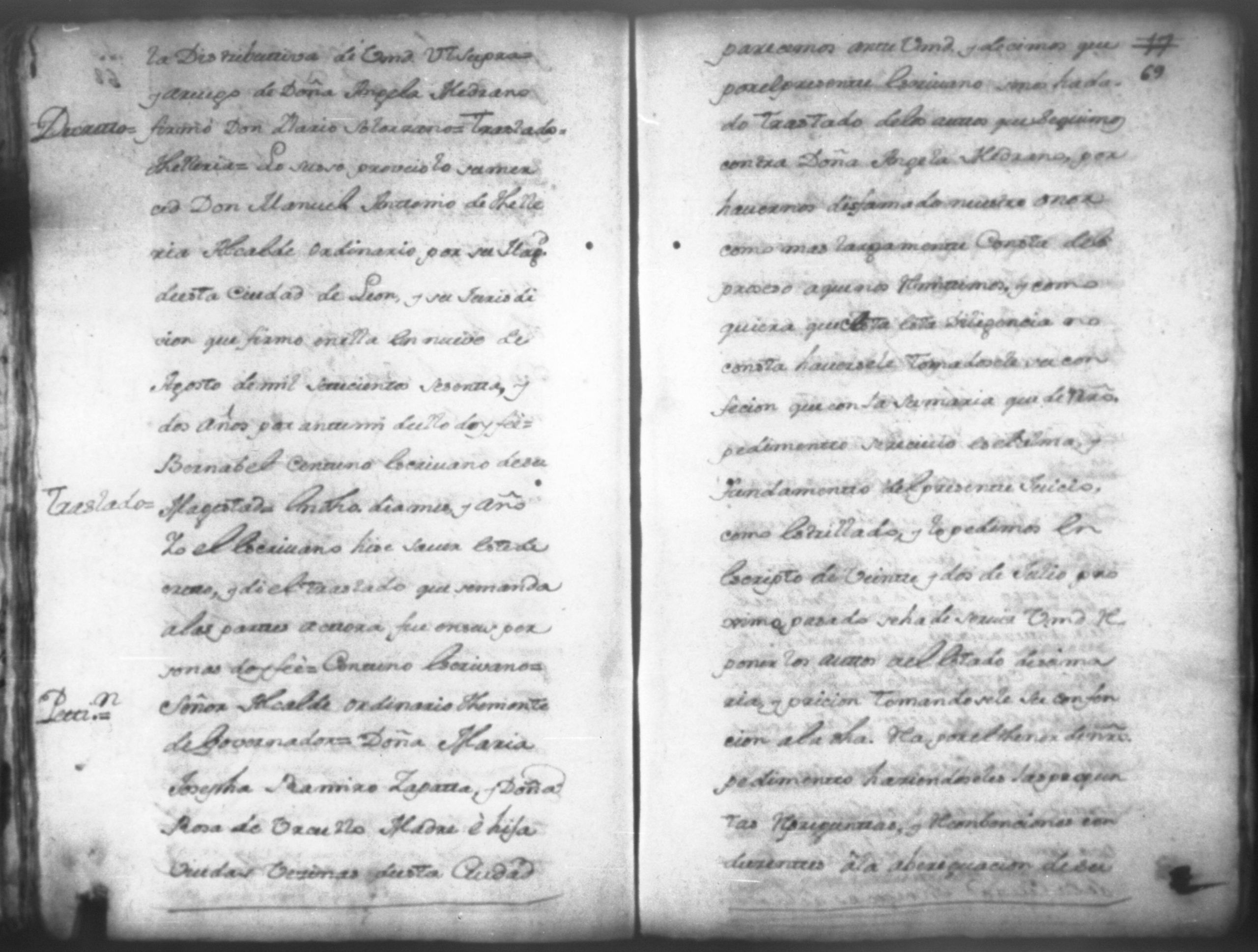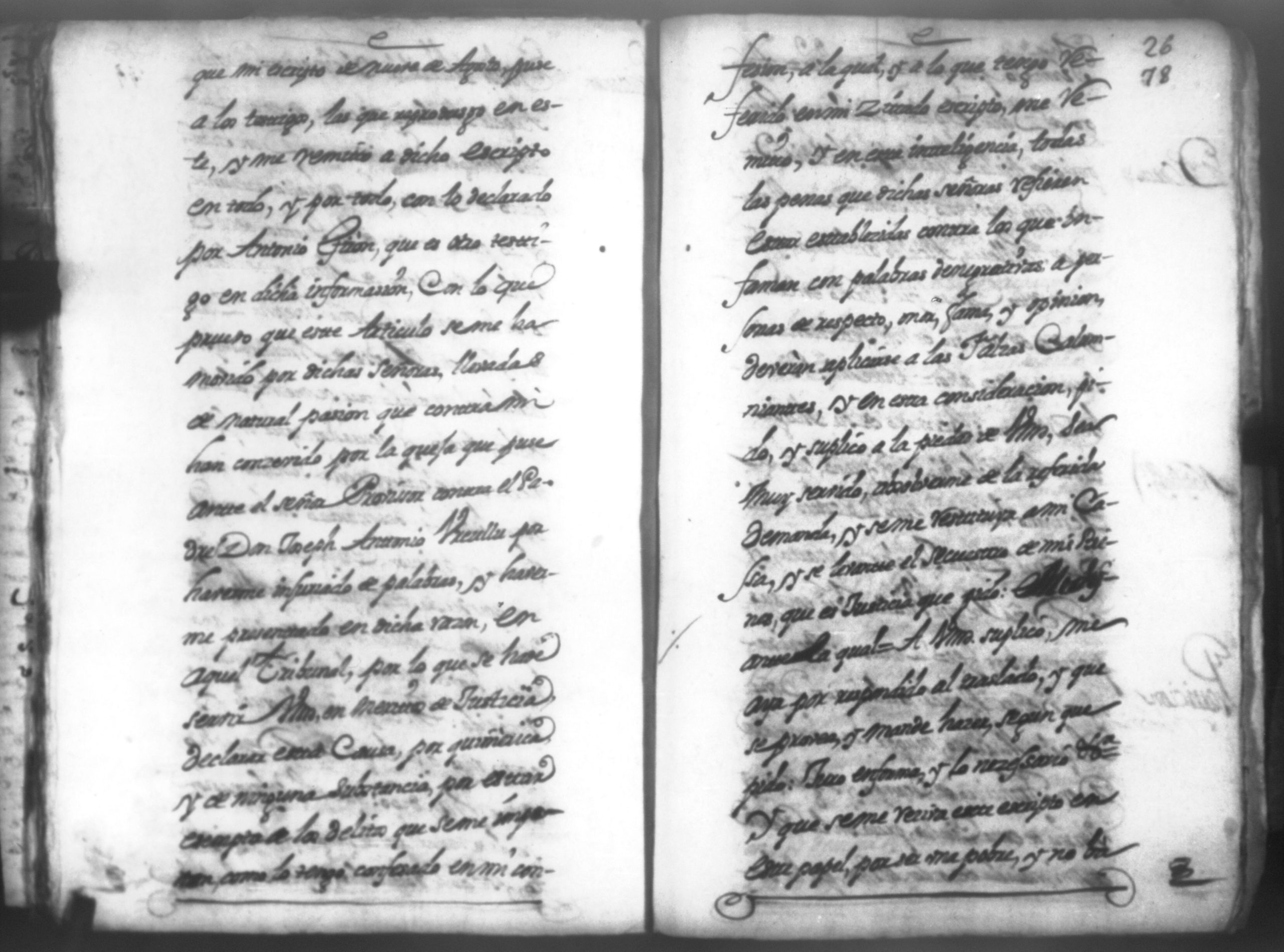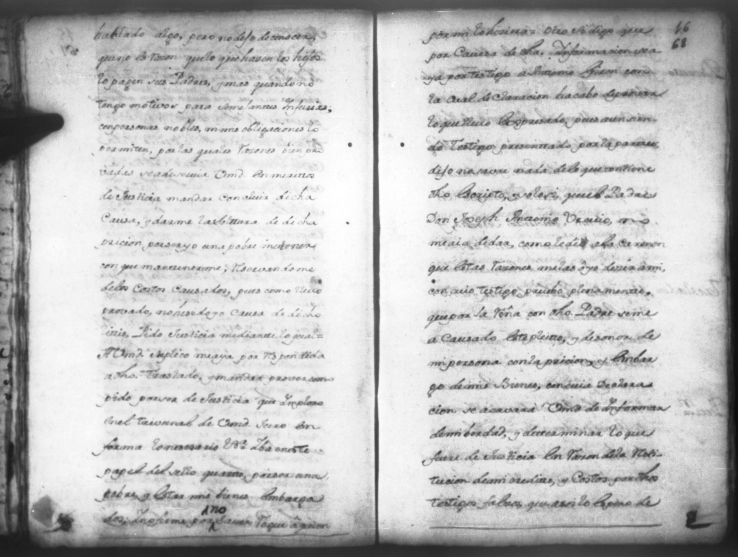 Temática: Don Manuel Antonio de Thelleria Alferes Mayor […] de Cano desta ciudad Ante Vuestra Majestad paresco y digo: que ami derecho combiene se sirva Vuestra Majestad hacer comparecer ante si al Capitan Don Francisco Altamirano y Velasco y a Don Francisco de Oses y debajo de la [relicencia] del juramento. Criminal. 1763. Contra Bernardo de Malvido.