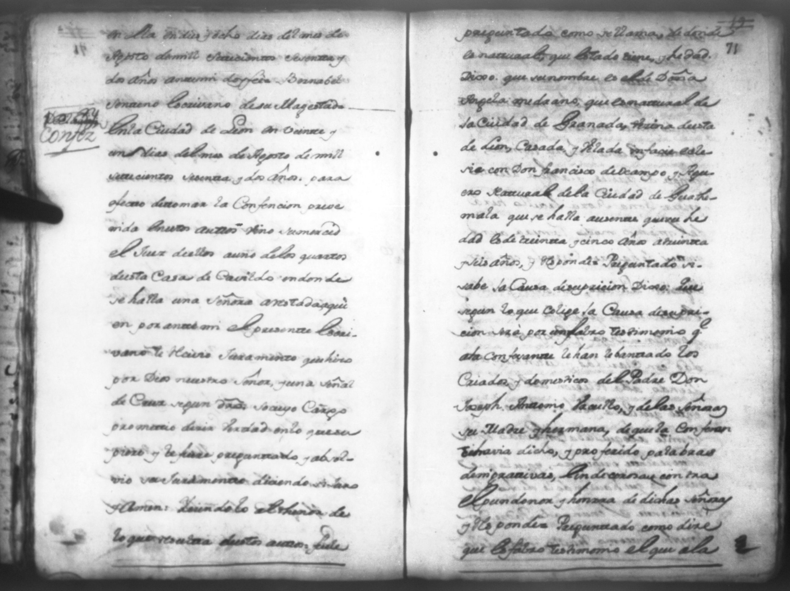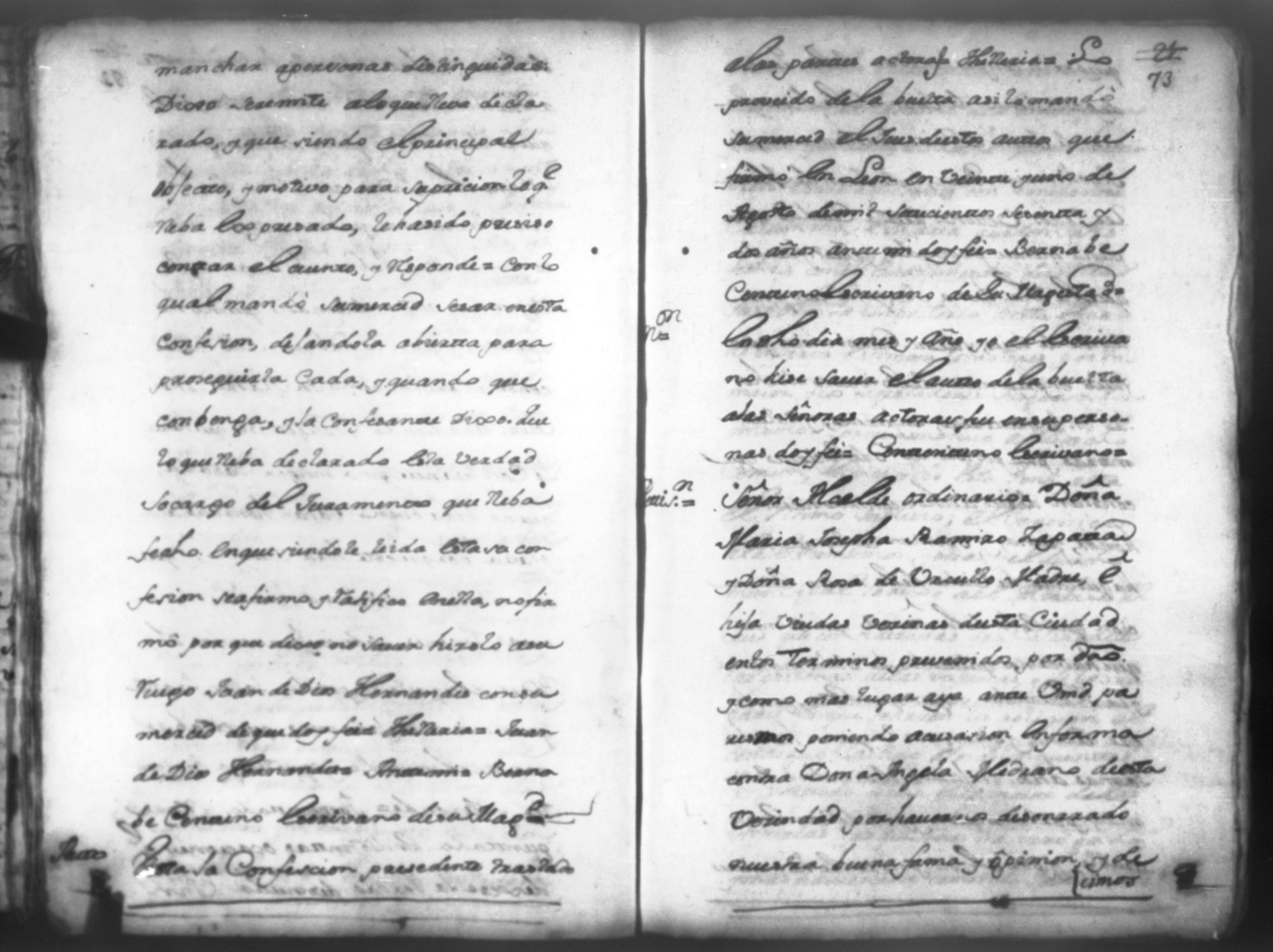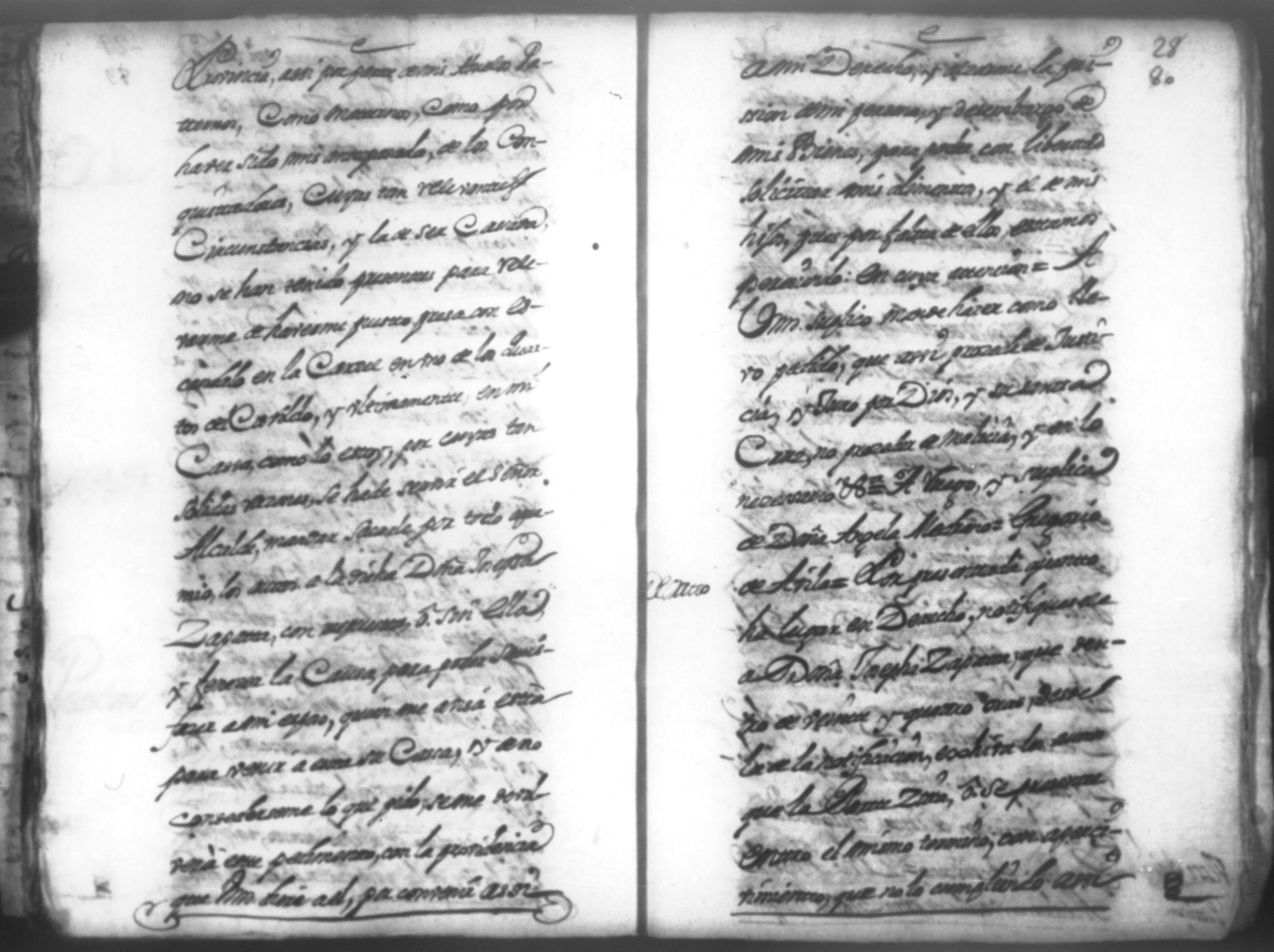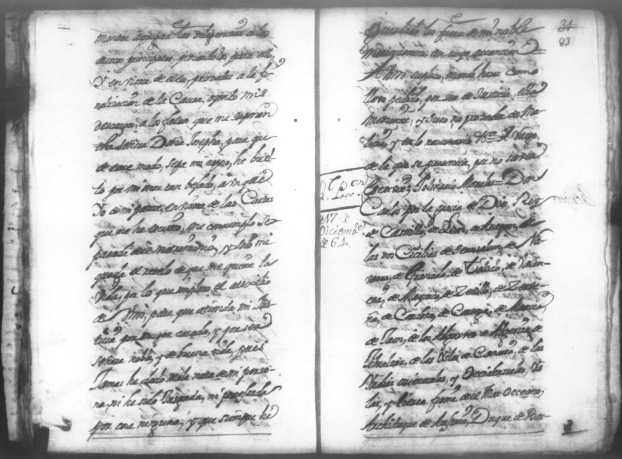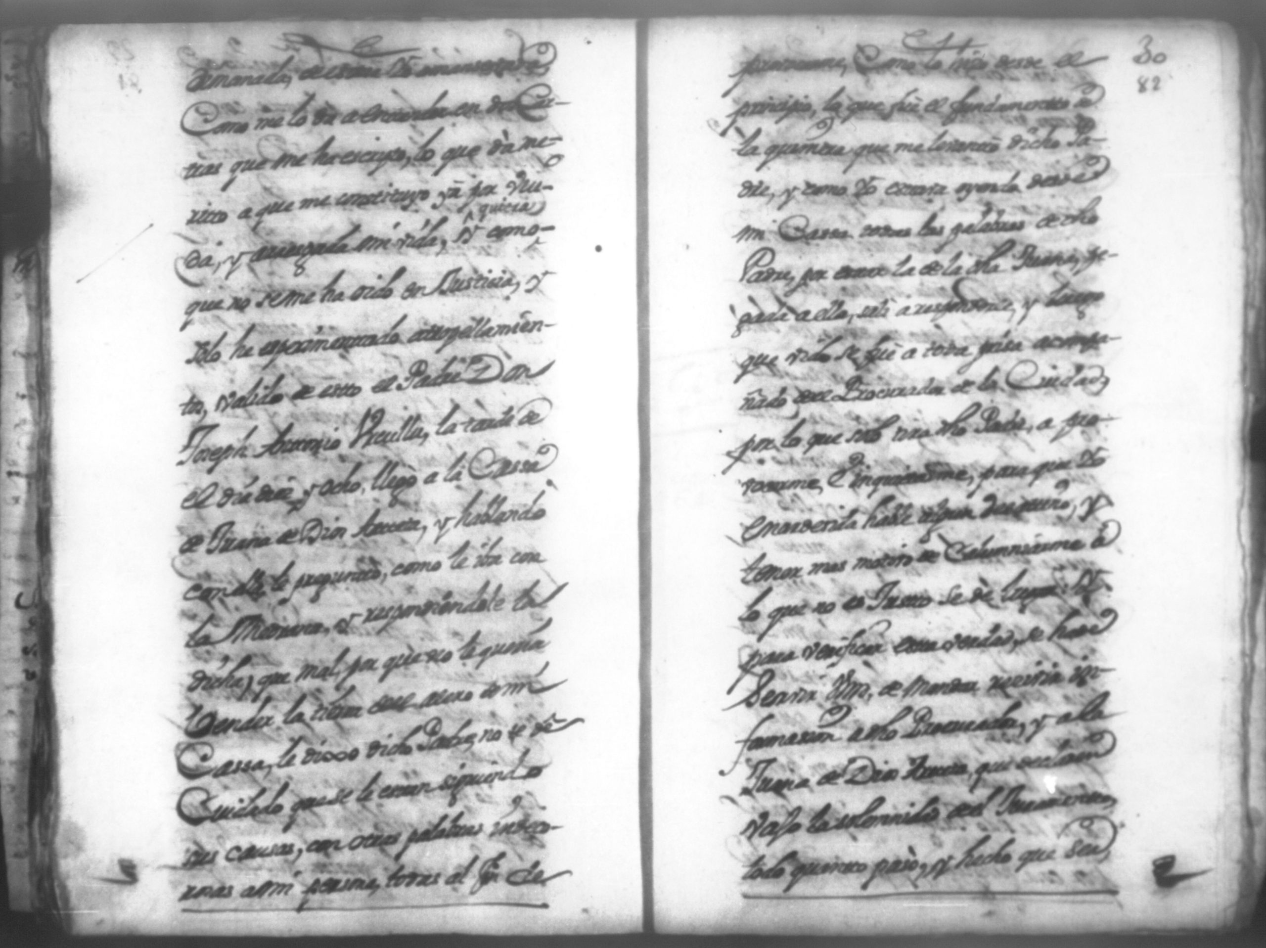 Temática: Don Manuel Antonio de Thelleria Alferes Mayor […] de Cano desta ciudad Ante Vuestra Majestad paresco y digo: que ami derecho combiene se sirva Vuestra Majestad hacer comparecer ante si al Capitan Don Francisco Altamirano y Velasco y a Don Francisco de Oses y debajo de la [relicencia] del juramento. Criminal. 1763. Contra Bernardo de Malvido.