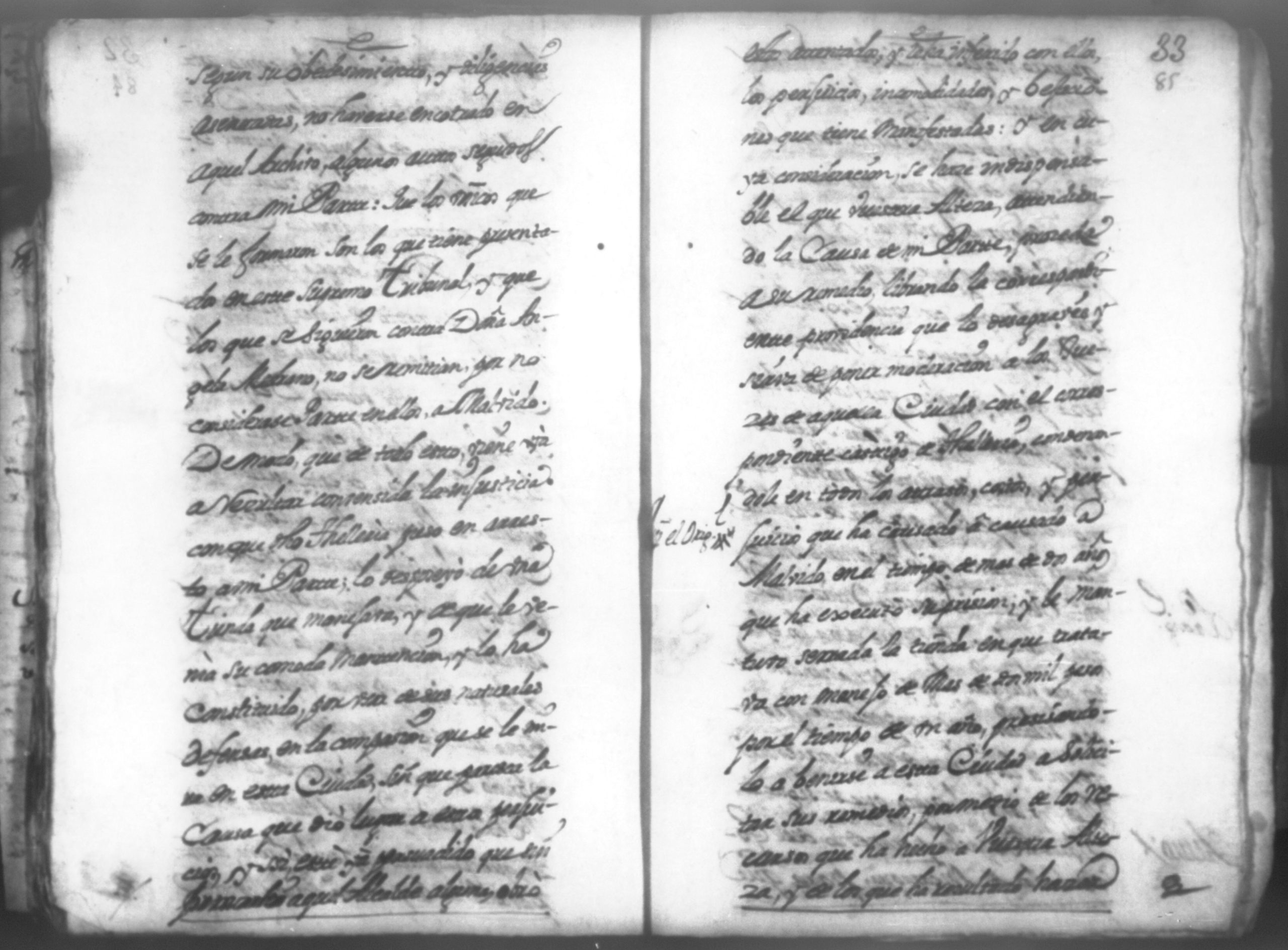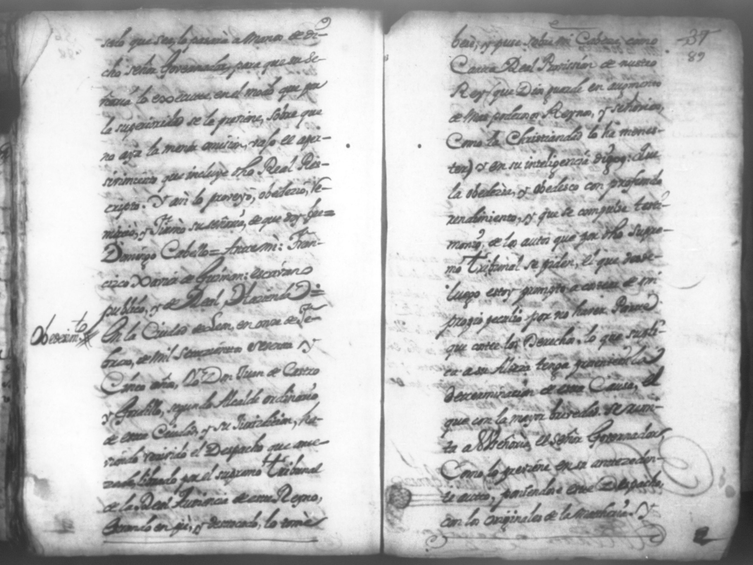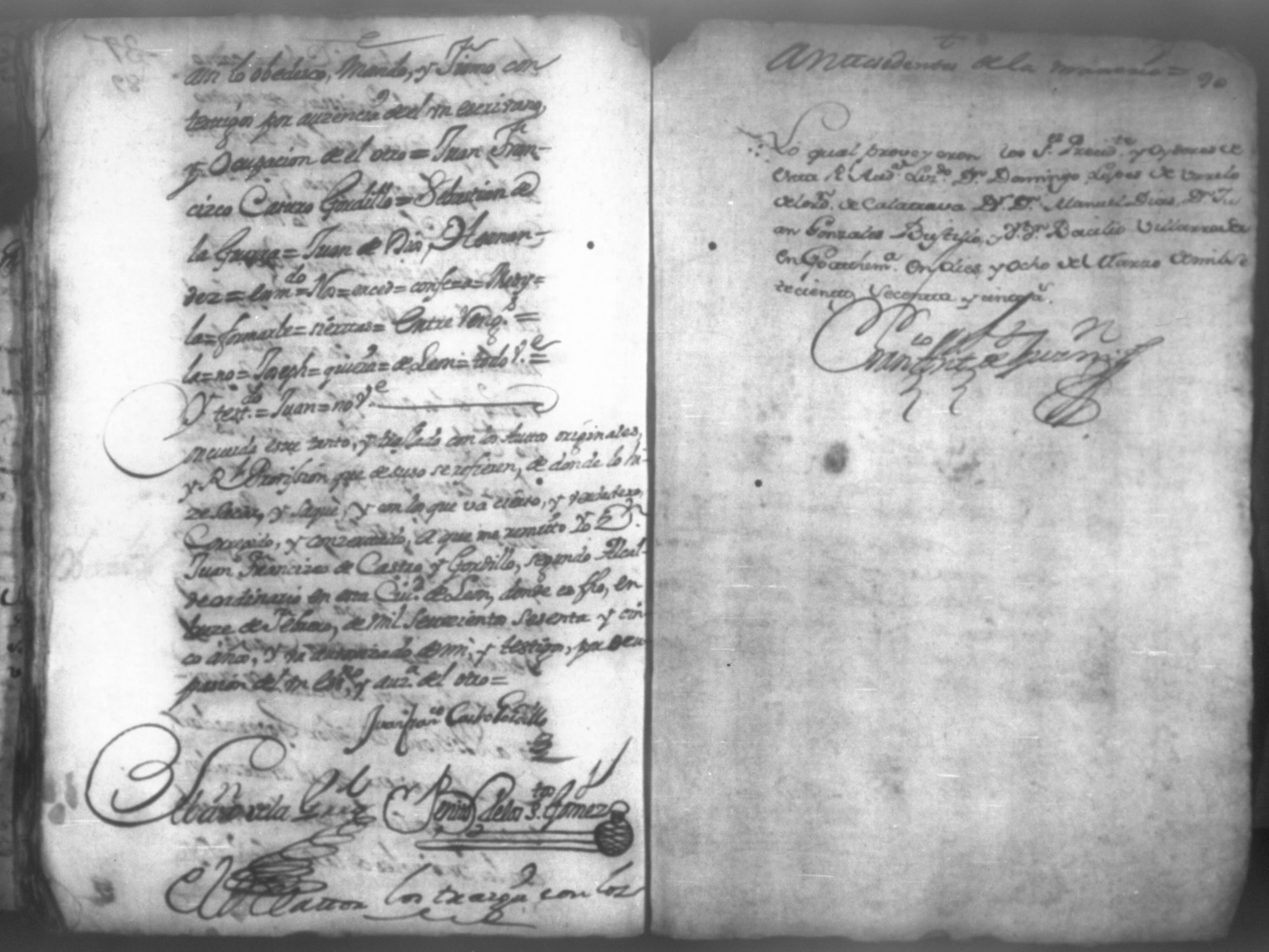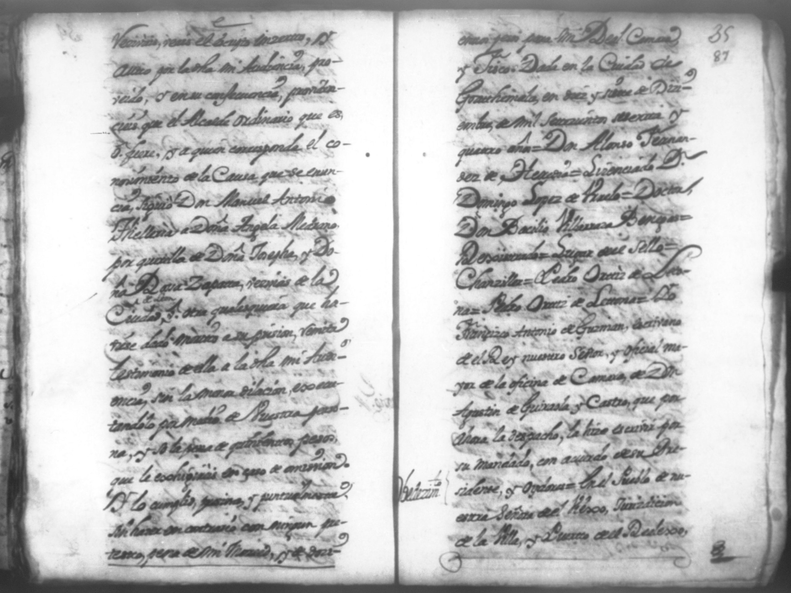 Temática: Don Manuel Antonio de Thelleria Alferes Mayor […] de Cano desta ciudad Ante Vuestra Majestad paresco y digo: que ami derecho combiene se sirva Vuestra Majestad hacer comparecer ante si al Capitan Don Francisco Altamirano y Velasco y a Don Francisco de Oses y debajo de la [relicencia] del juramento. Criminal. 1763. Contra Bernardo de Malvido.
