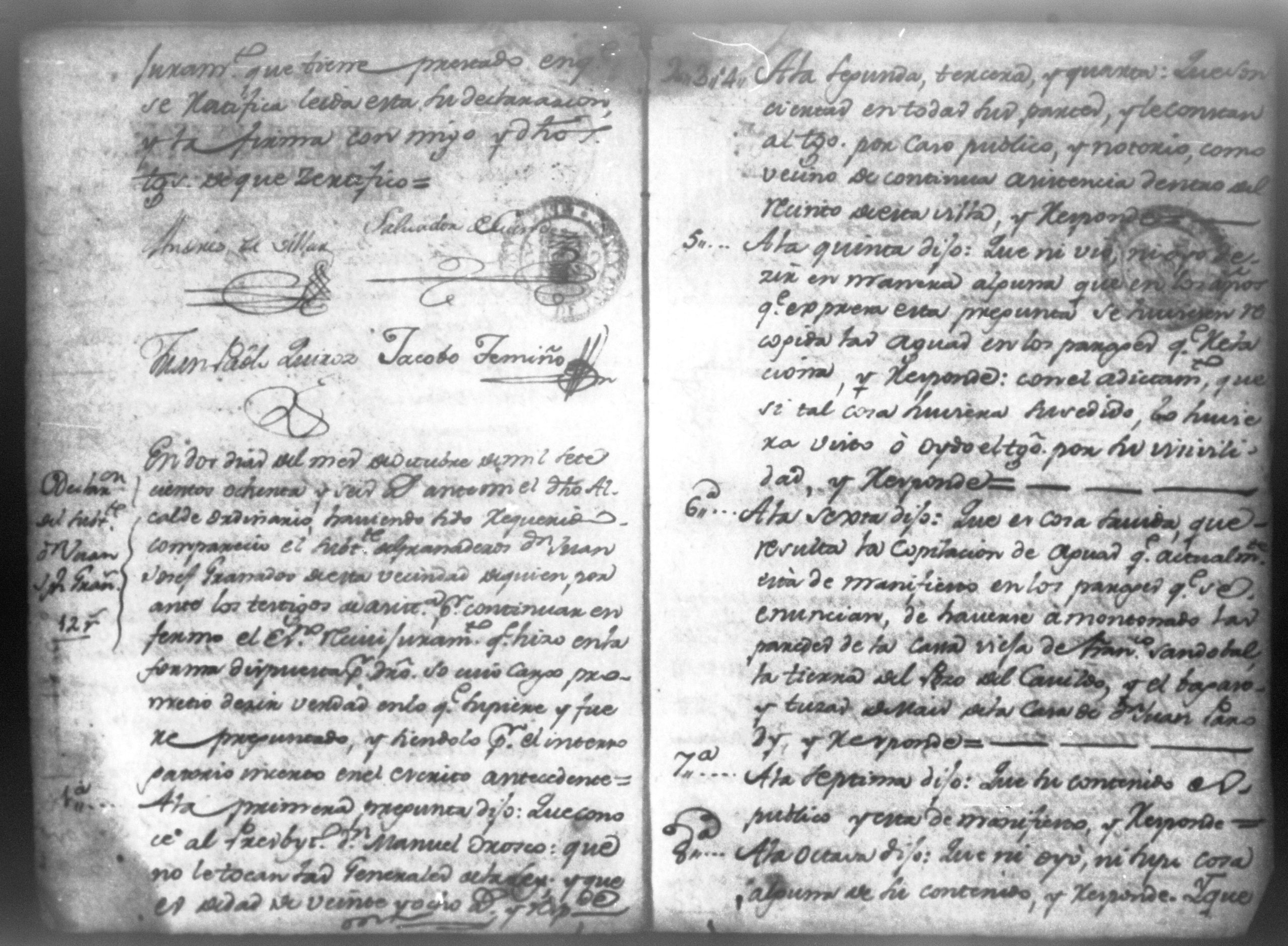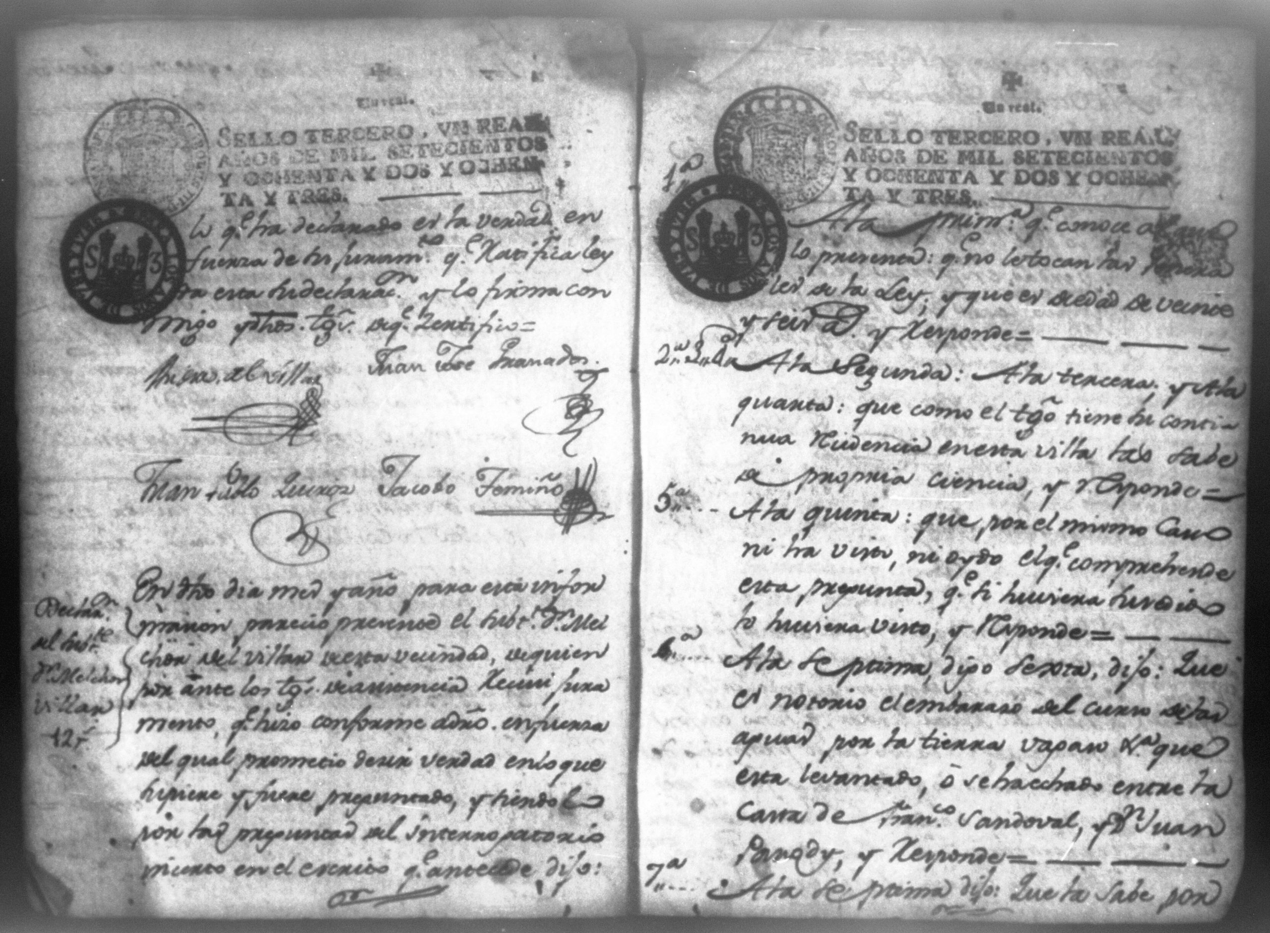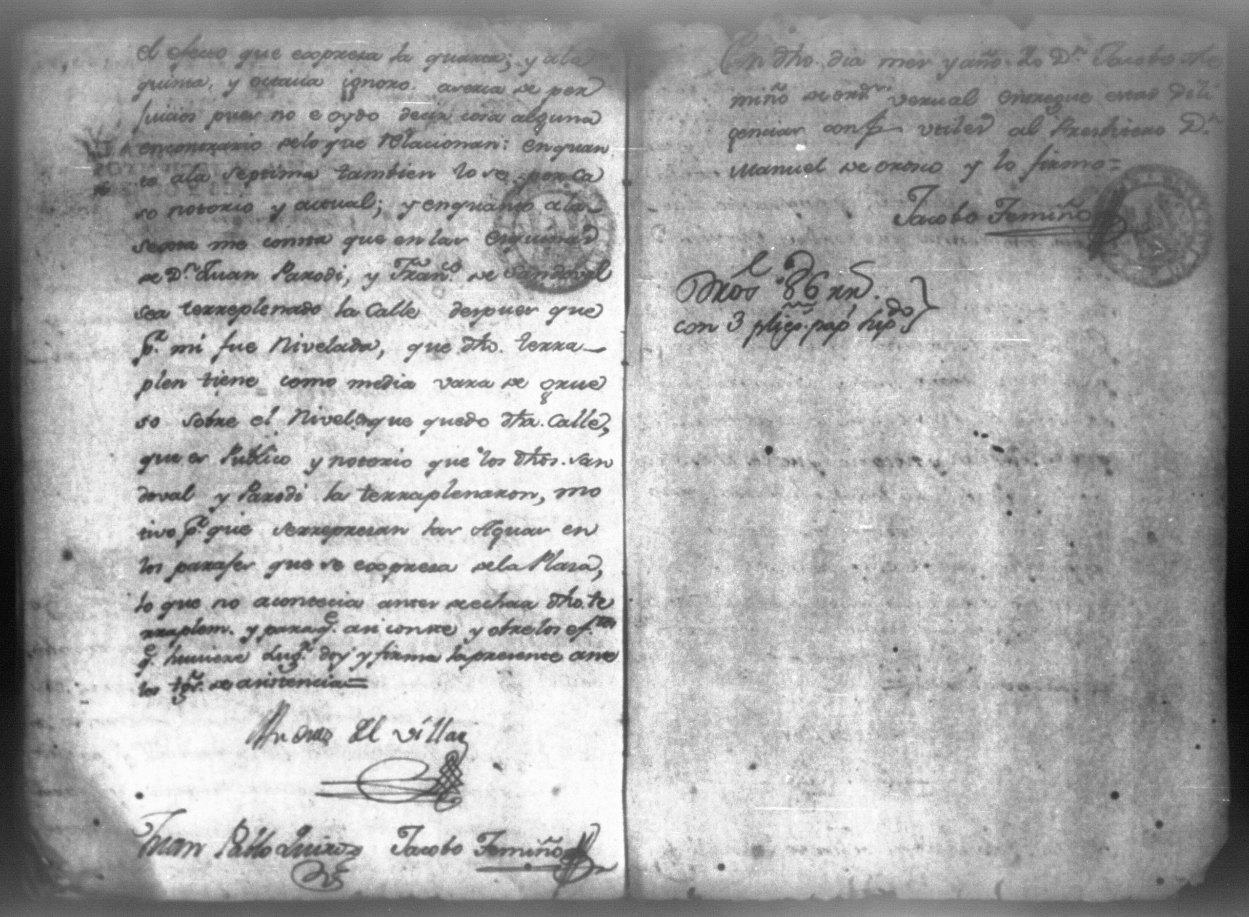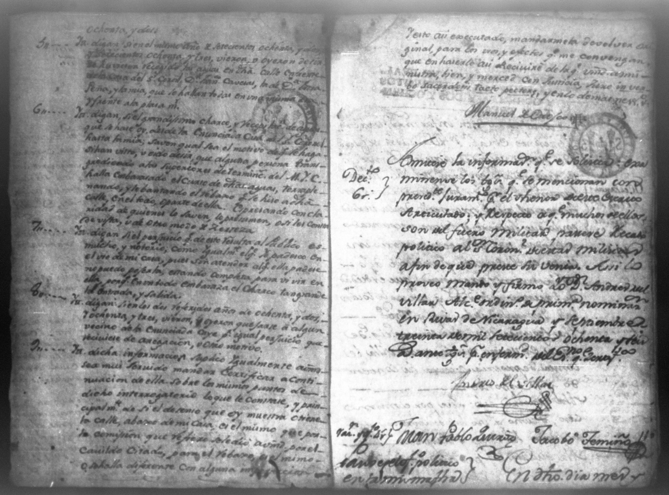 Temática: Nicaragua, 1786. Don Manuel de Orosco, Clerigo Presbítero solicita se admita informe de testigos. Declaraciones bajo juramento de los milicianos: don Melchor Villar, don Juan Joseph Granados, don Melchor de la Cerda, don Francisco Aguilar y de don Salvador Cuende, acerca del paso y uso de aguas por las propiedades de don Francisco Sandoval y don Juan Parody.