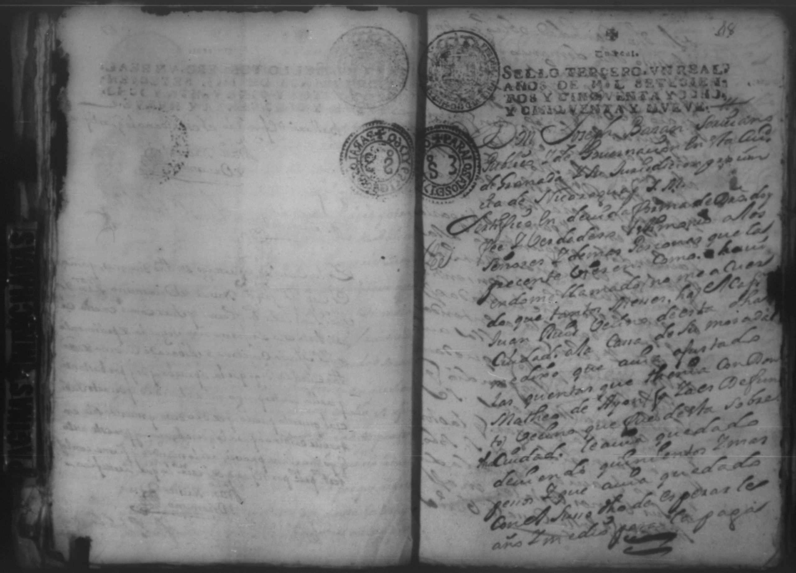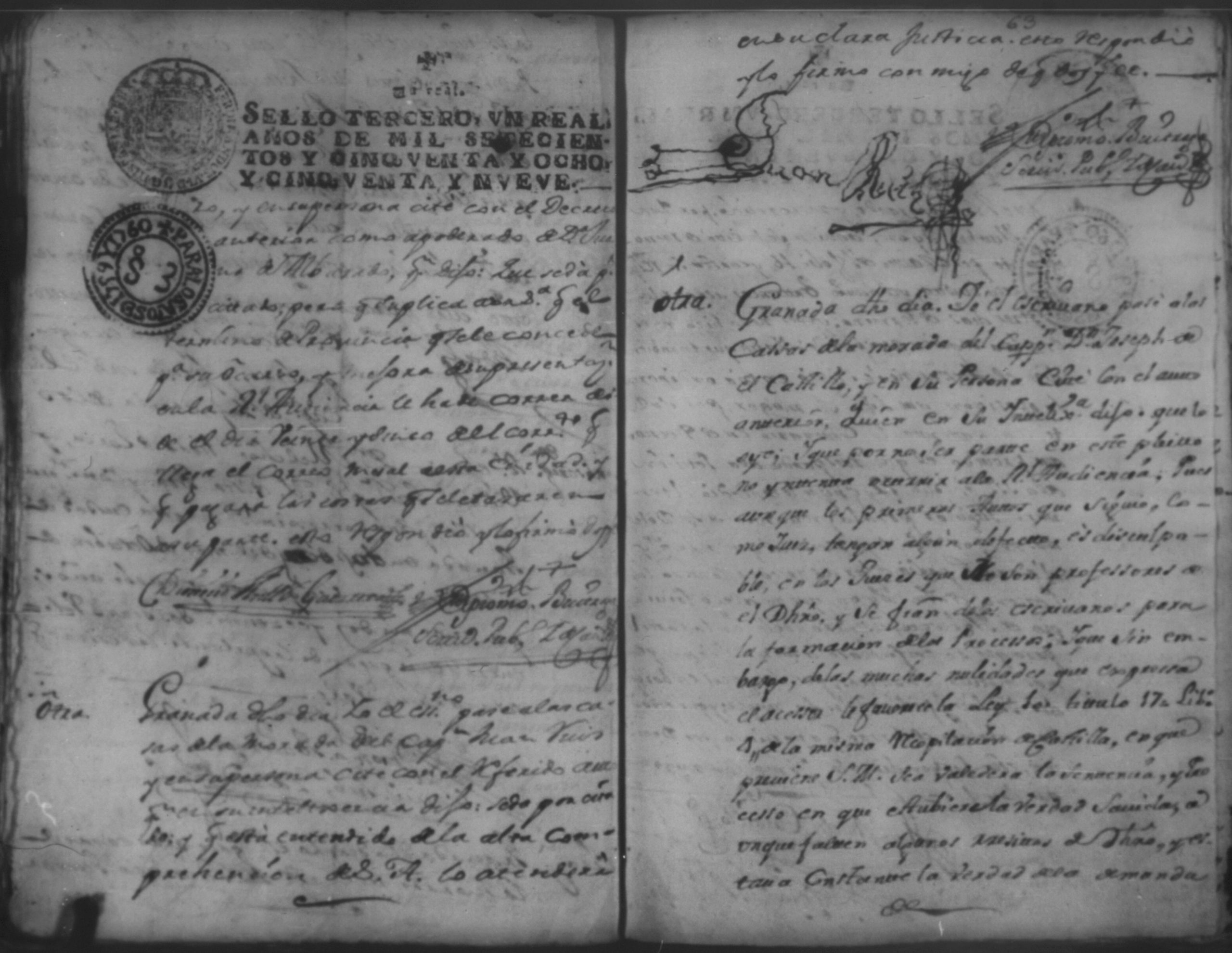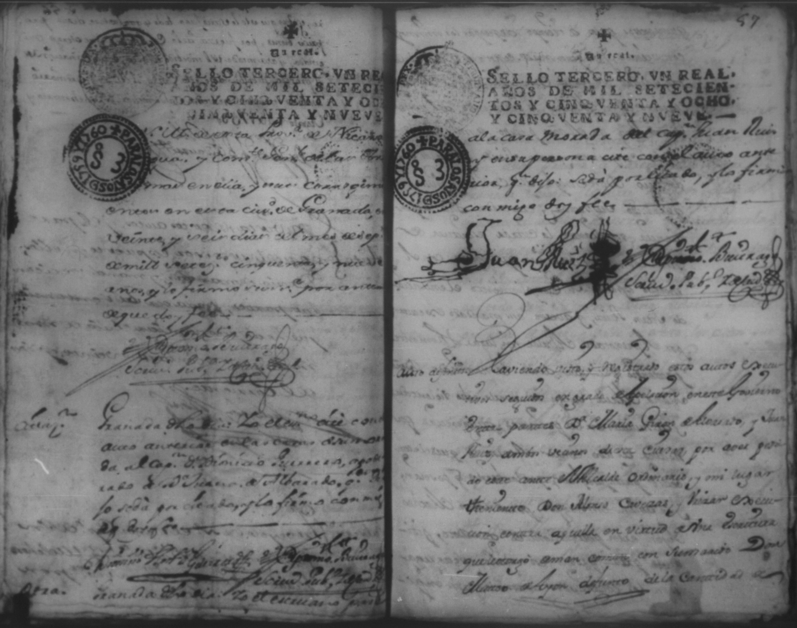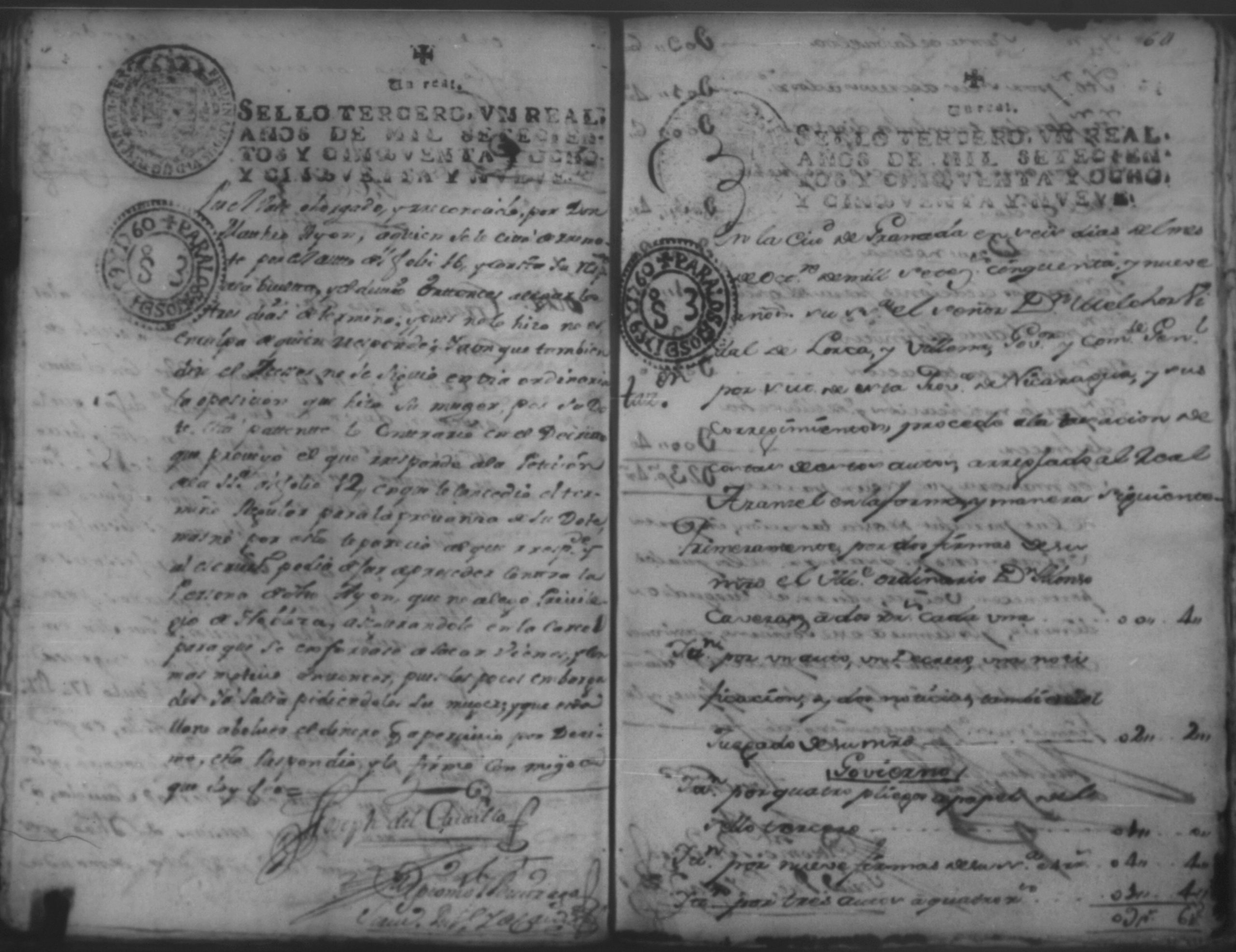 Temática: Año de 1757. Digo yo Don Matheo de Allon vecino de esta ciudad de Granada que devo al Capitan Juan [Ruiz] en cantidad de nobesientos y sincuenta pesos.