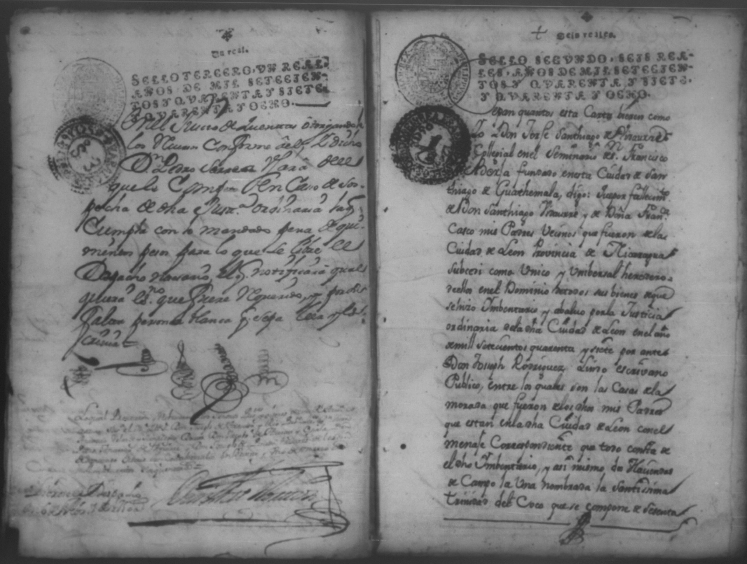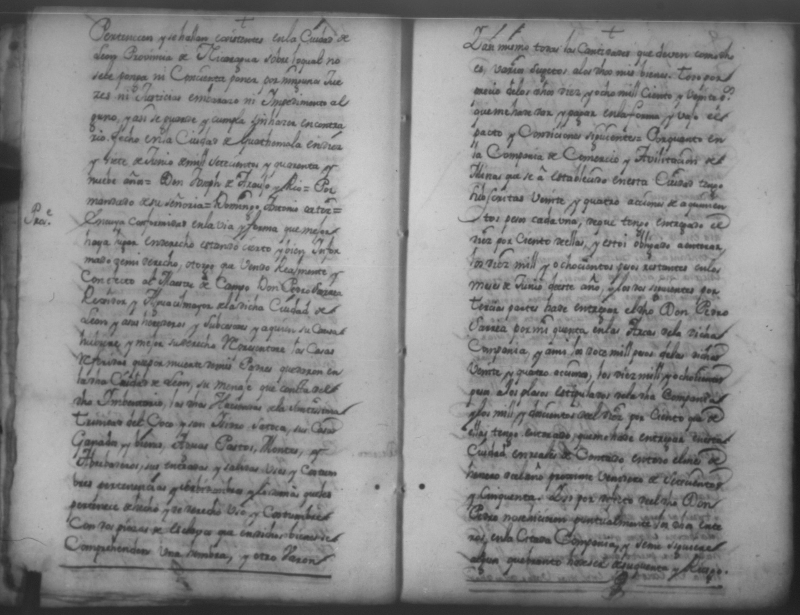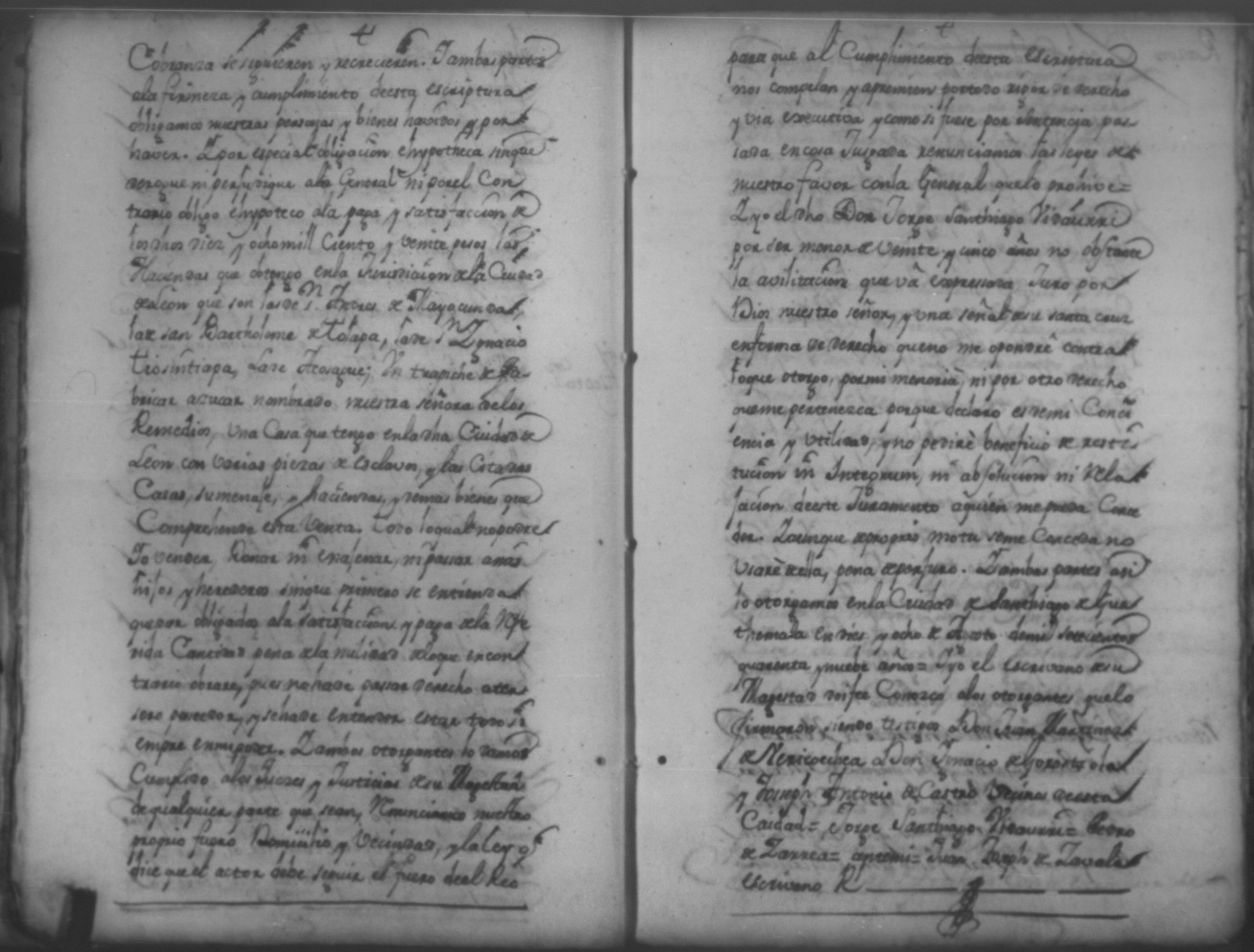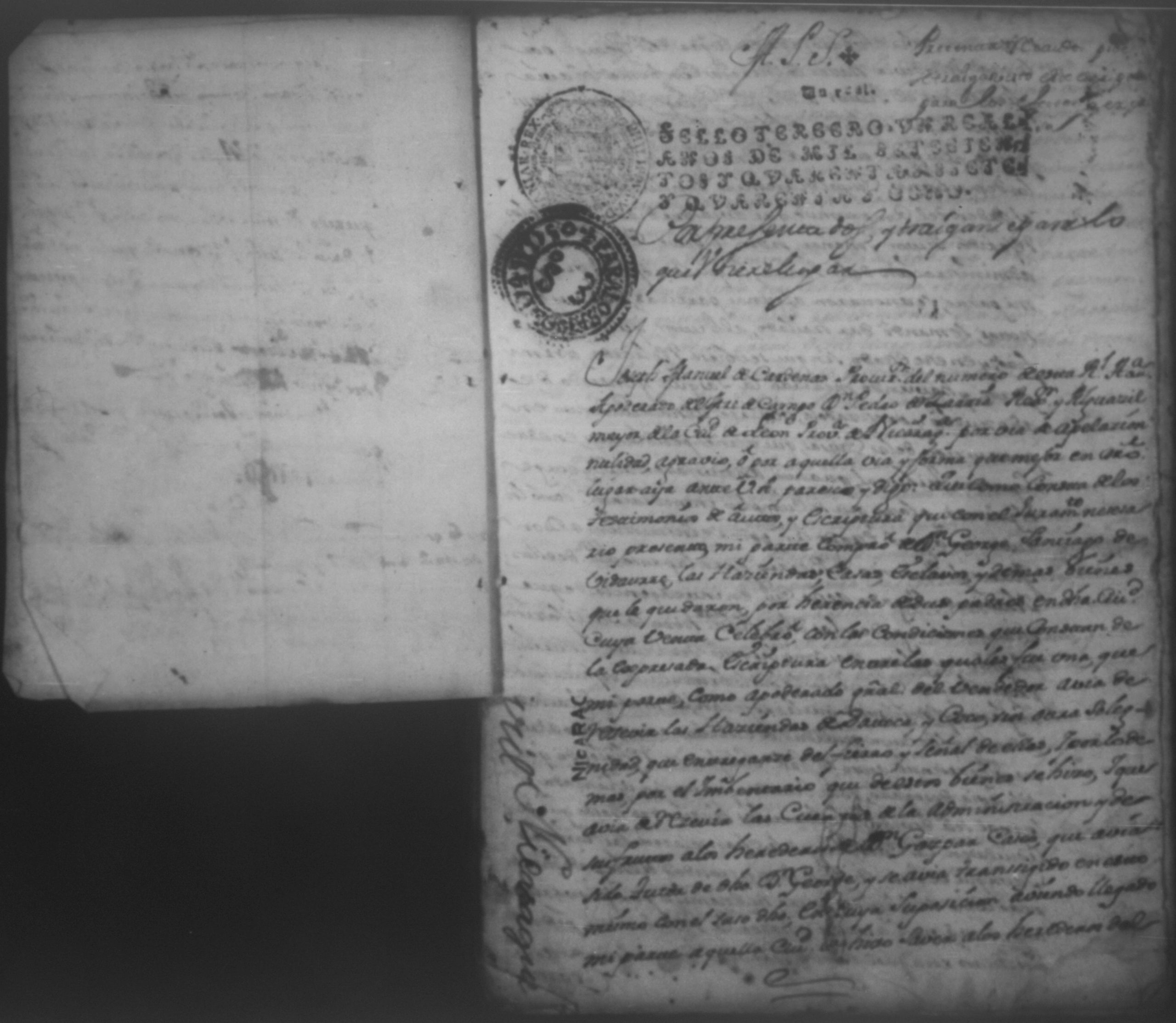 Temática: Año de 1750. Leon. Don Pedro Zarria [Regidor] y Alguacil Mayor de la ciudad de León Provincia de Nicaragua por Vía de Apelación nulidad, agravio por aquella vía y forma que mejor en dicho lugar haya ante usted comparezco y digo como consta de los testimonio de autos y escrituras que con el juramento necesario presento mi parte [...] de Don George Santiago de Vidaurre las haciendas, casas, esclavos y demas bienes que le dieron por herencia.