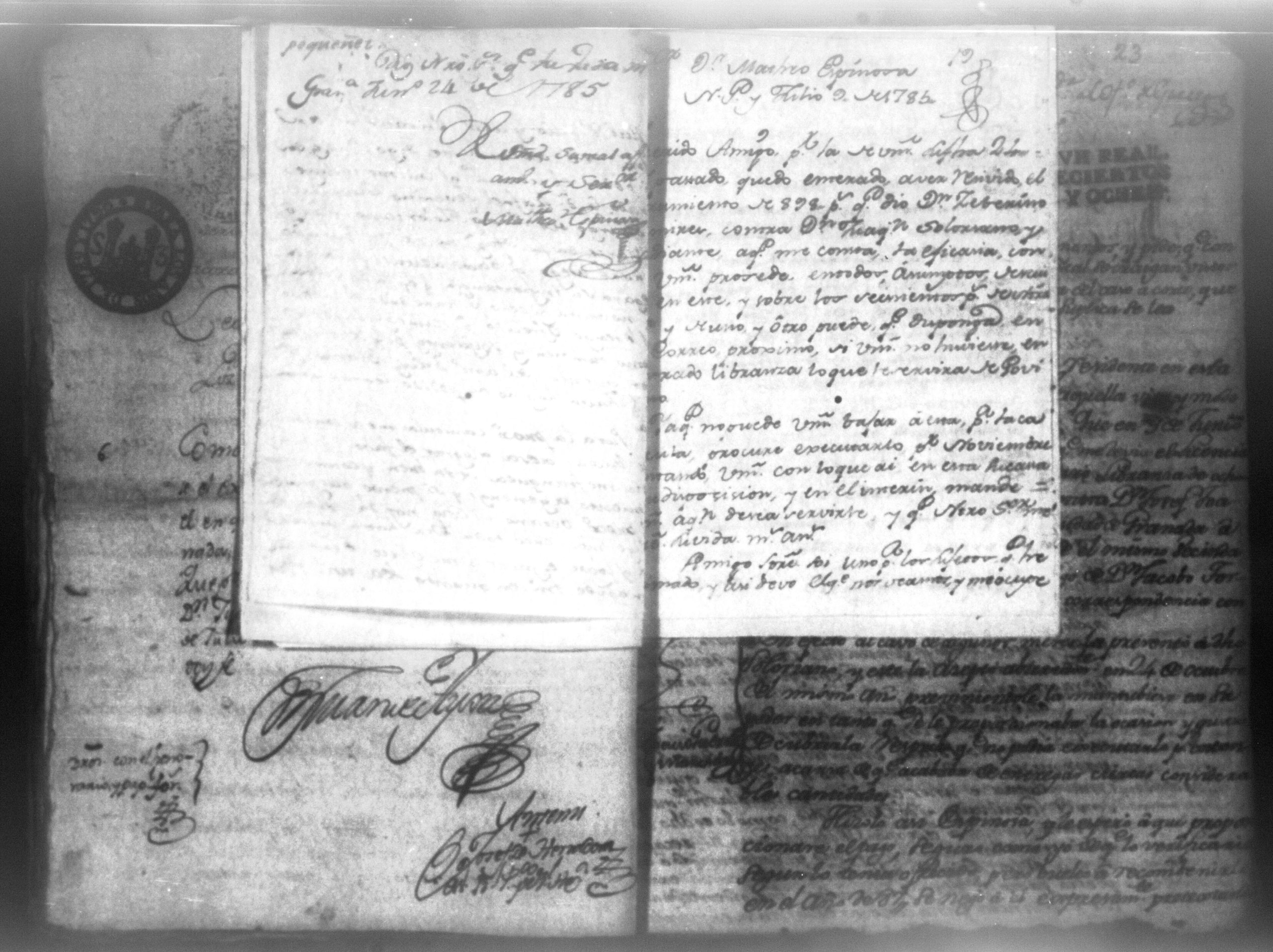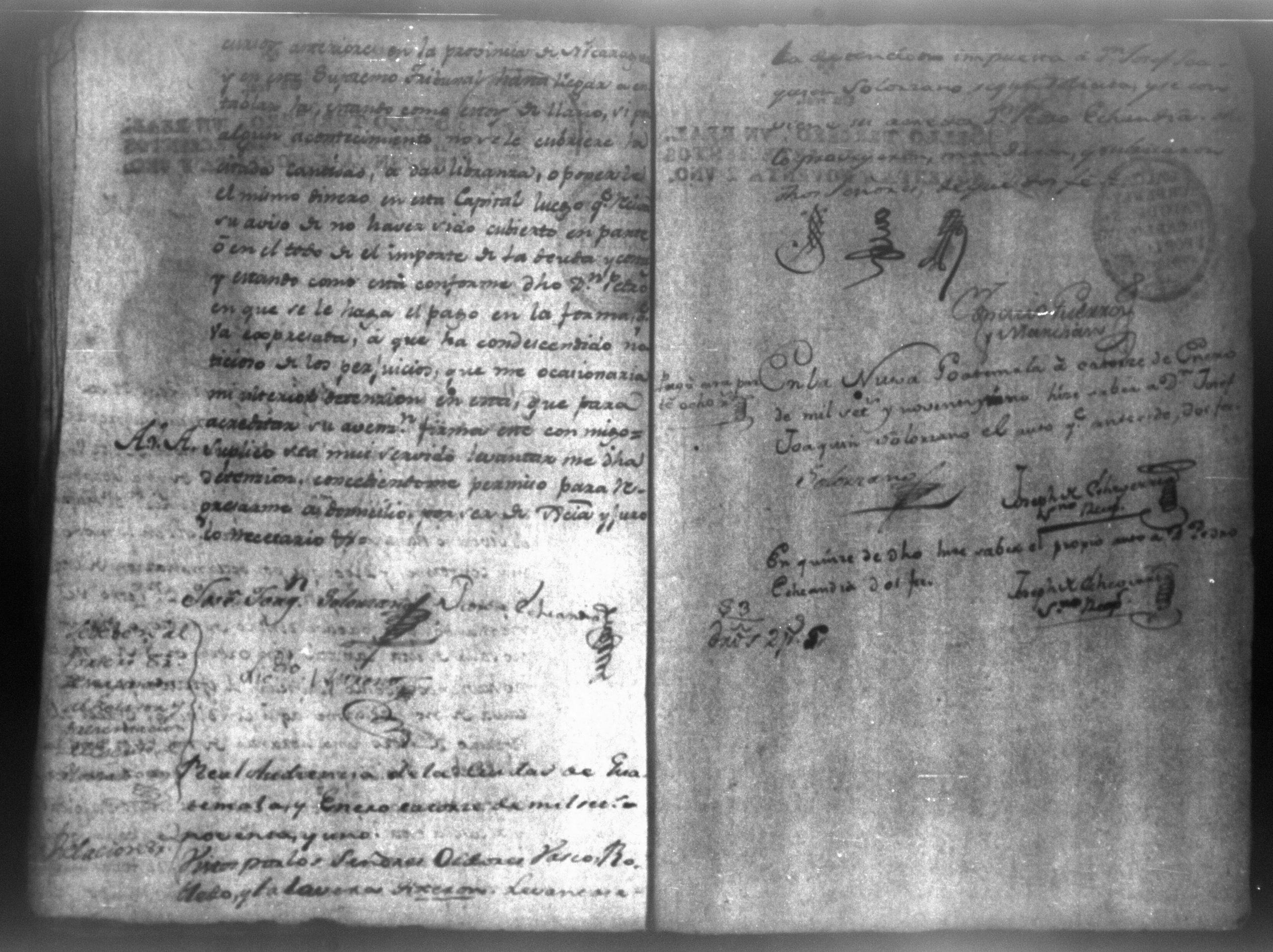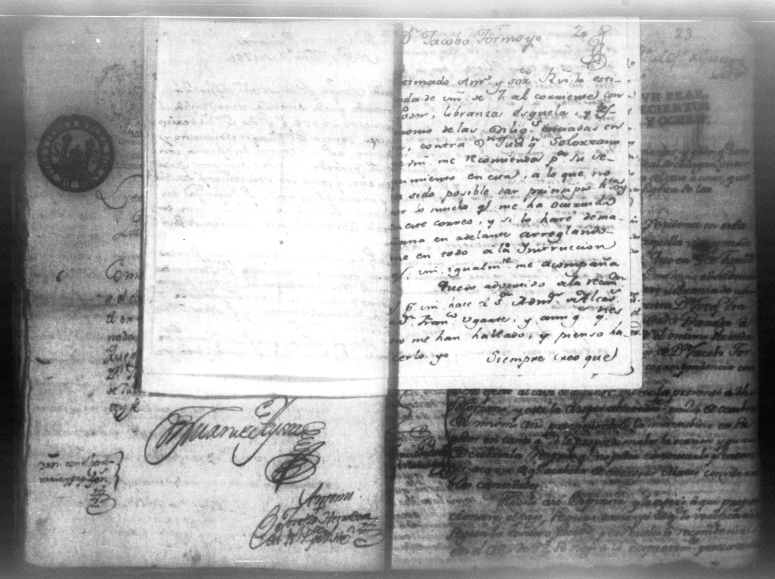 Temática: Audiencia León, 1790. Don Pedro Echandia sobre que se declare caso de corte para el cobro de una libranza que le adeuda don Josef Juaquin Solorzano, alferez real de Granada. "Es en mi poder el Despacho del Supremo Tribunal que Usted me acompaña con oficio de 7 del presnte, para que notifique a Don Juaquin Zolorzano exhiva dentro 3o dia 898 pesos que deve a Don Pedro Echandia crese Comercio y hallandose este sugeto caminando para esa Capital á su ingreso puede la parte repetir su derecho; no obstante en caso de que por algun contingente se debuelva á esta Ciudad procederé en la forma que se me previene, lo participo a Usted para su inteligencia". Firma Roverto Sacasa. (Extracto del folio 29, imagen 36)