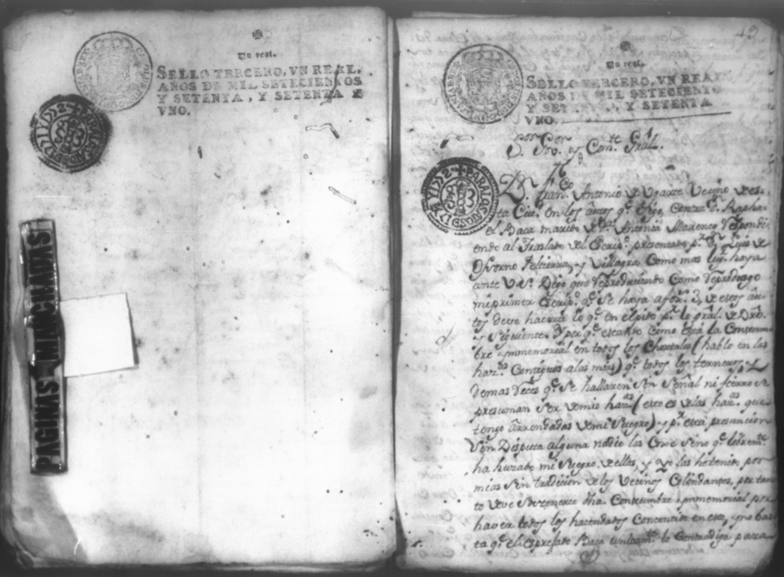 Temática: Don Francisco Antonio Ugarte vecino de Granada, Provincia de Nicaragua dueño de la Hacienda de [Taen] contigua a la de San Bartholome que posee Doña Antonia Marenco casada de terceras nupcias con Don Raphael Diaz Caveza de Baca con testimonio de los autos por contemplarse agraviado del governador de dicha provincia.
