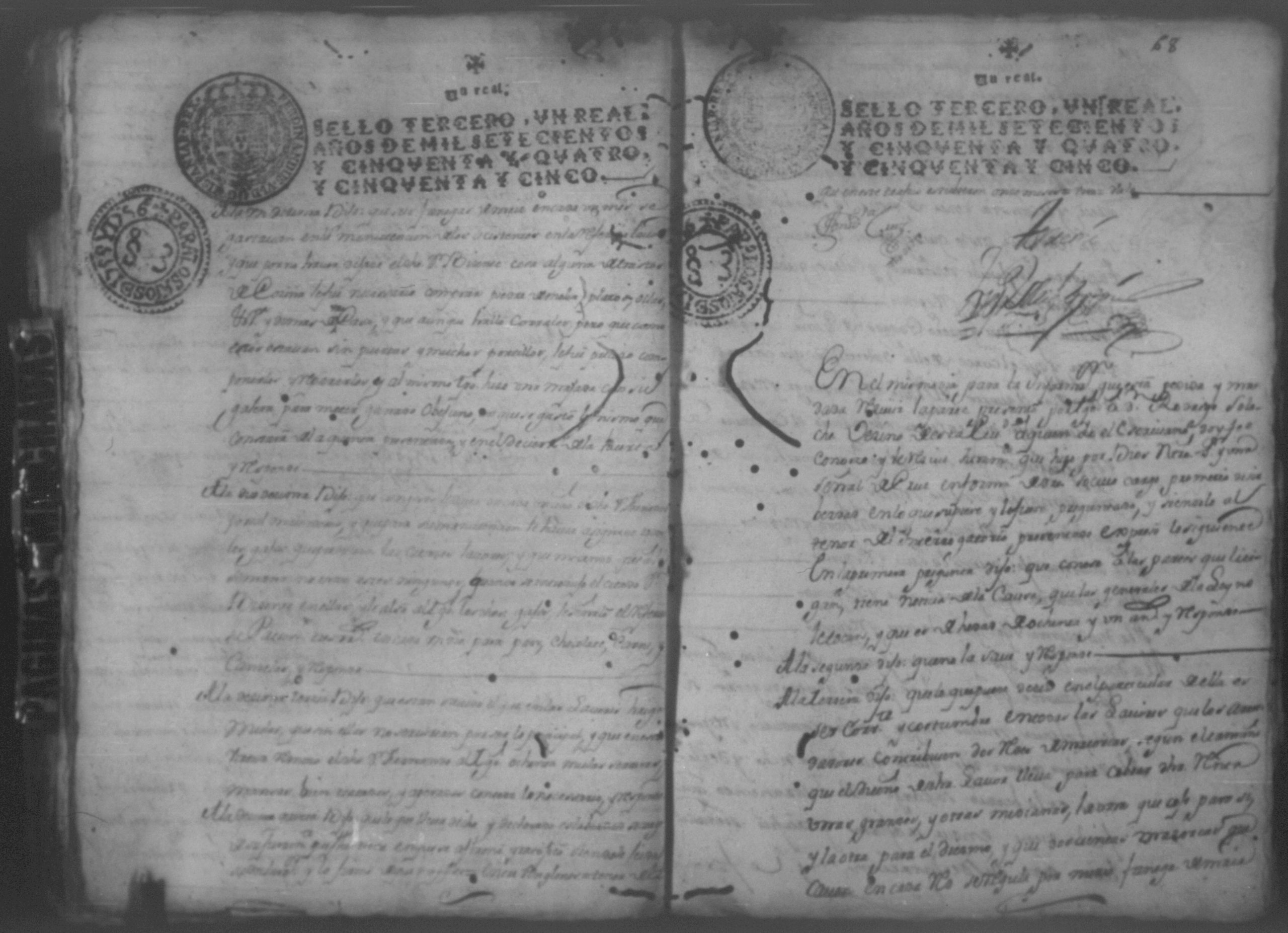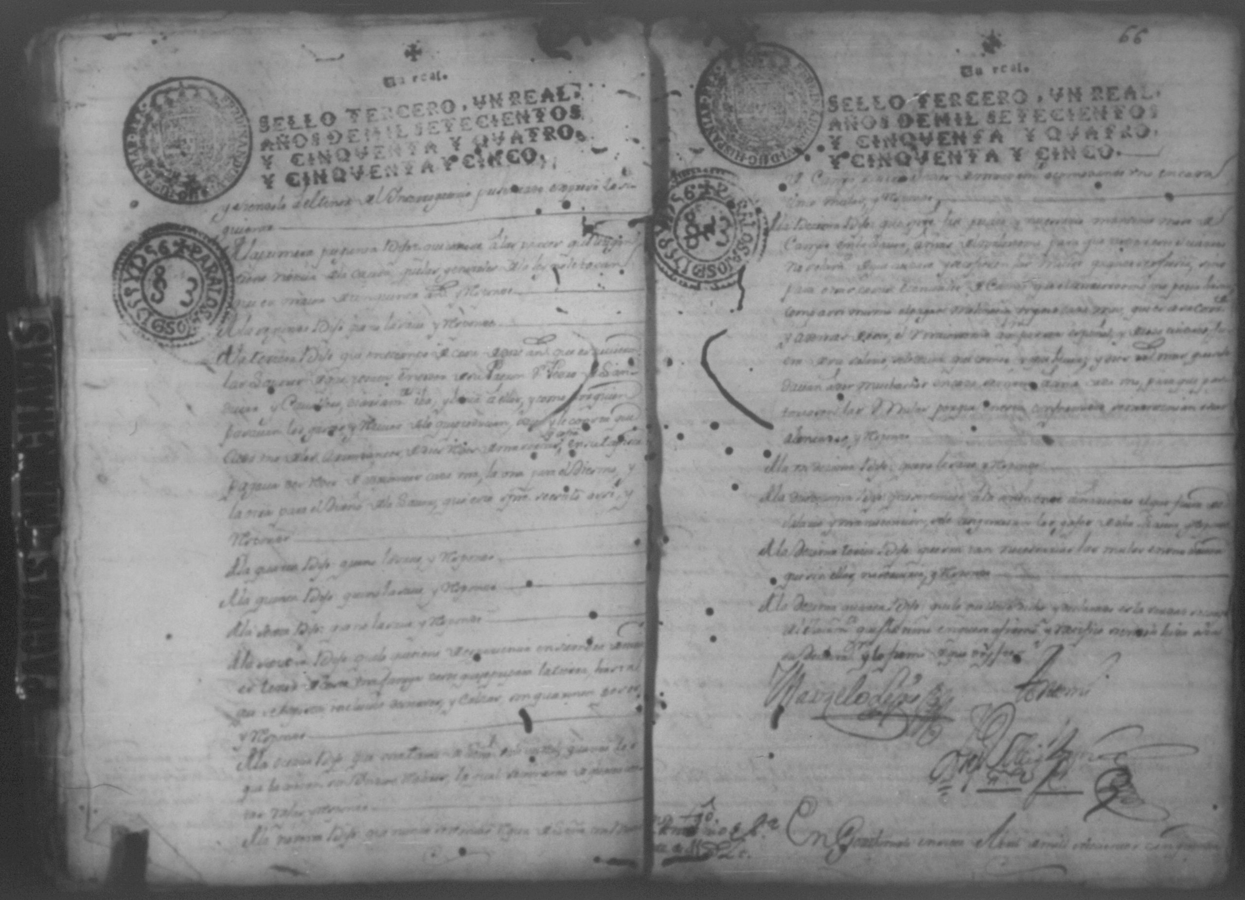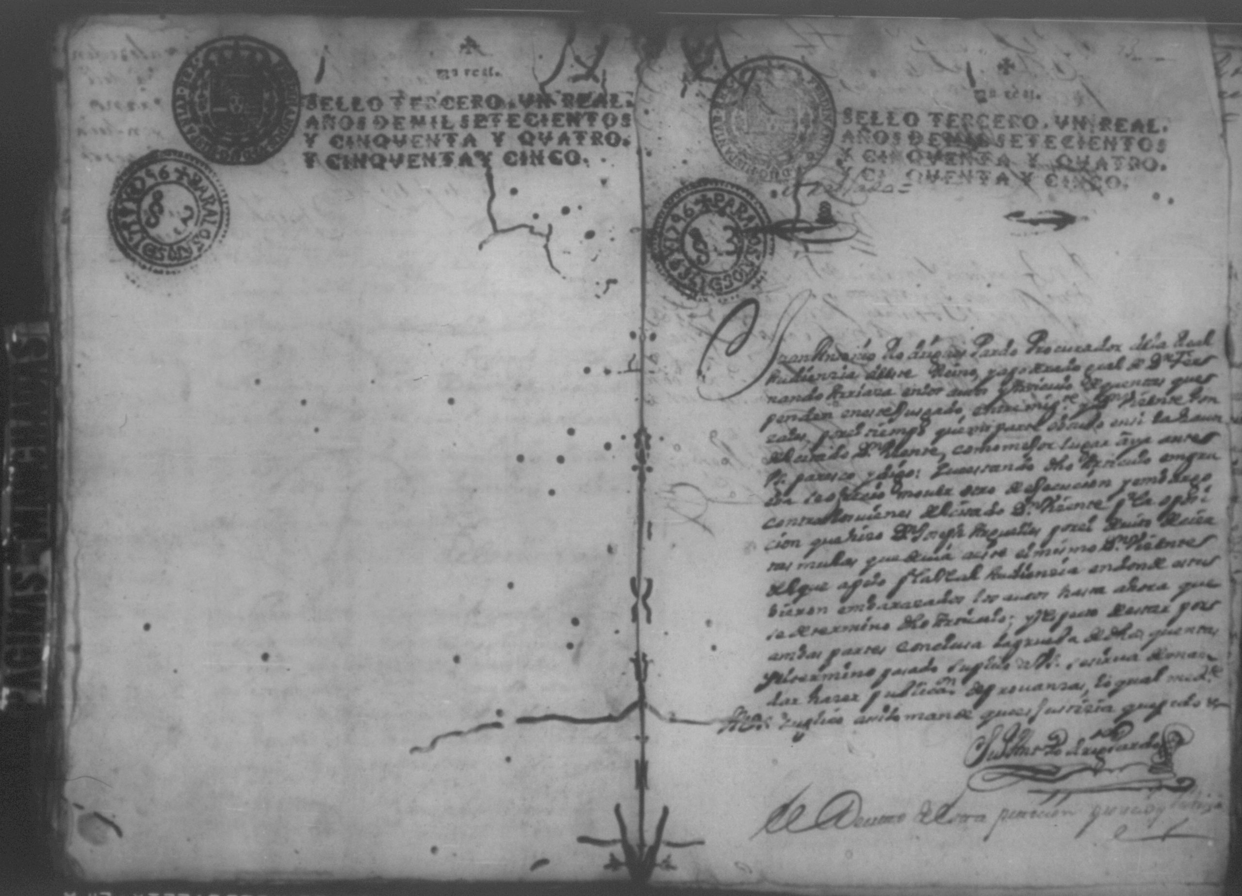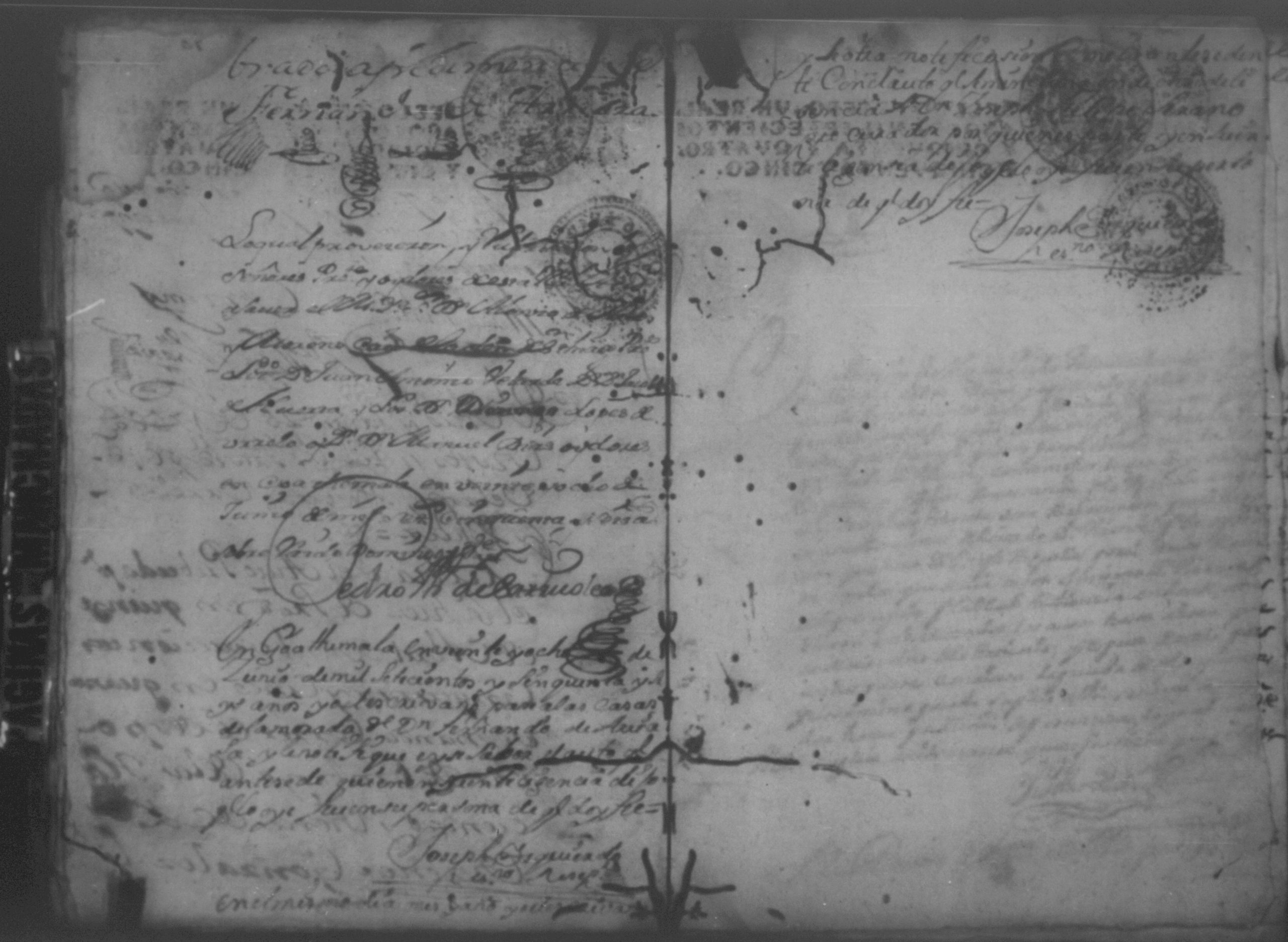 Temática: Año de 1757. Nicaragua. Don Vicente Ignacio Gonzalez reconozca la escriptura que se menciona por lo que toca a su muger Doña Maria Gertrudis Dardon se comette respecto de que de mancomun la otorgaron y firmaron y fecho […].