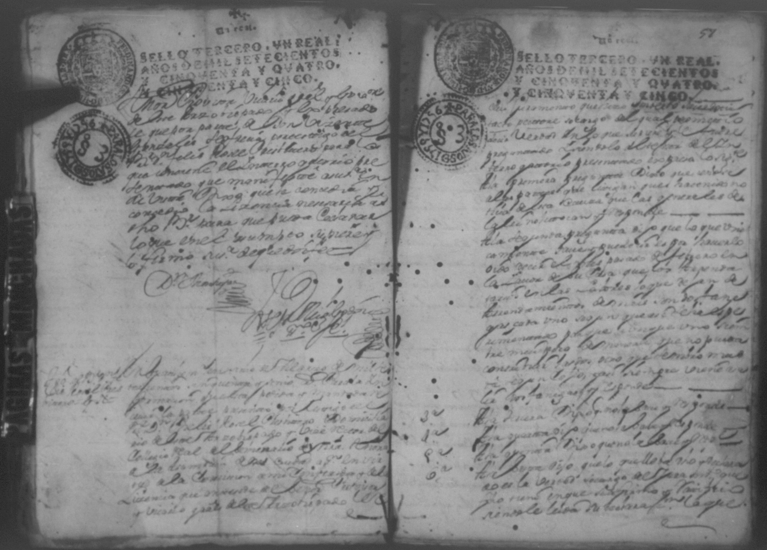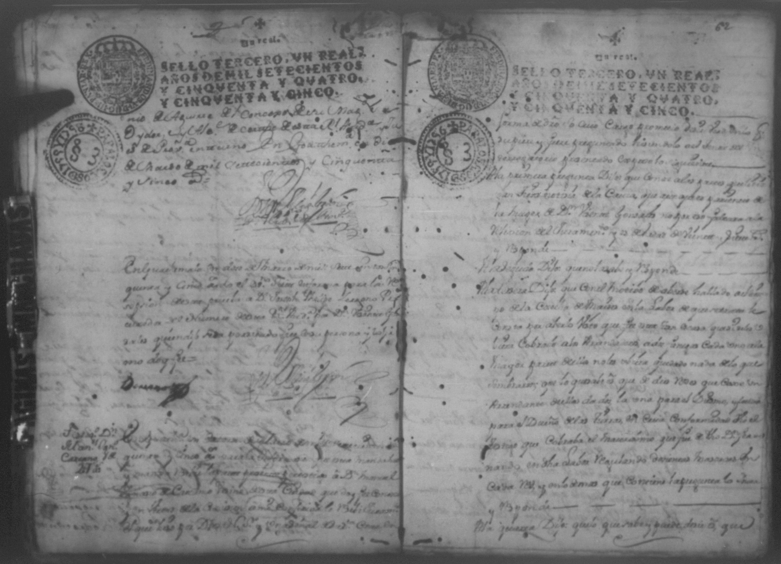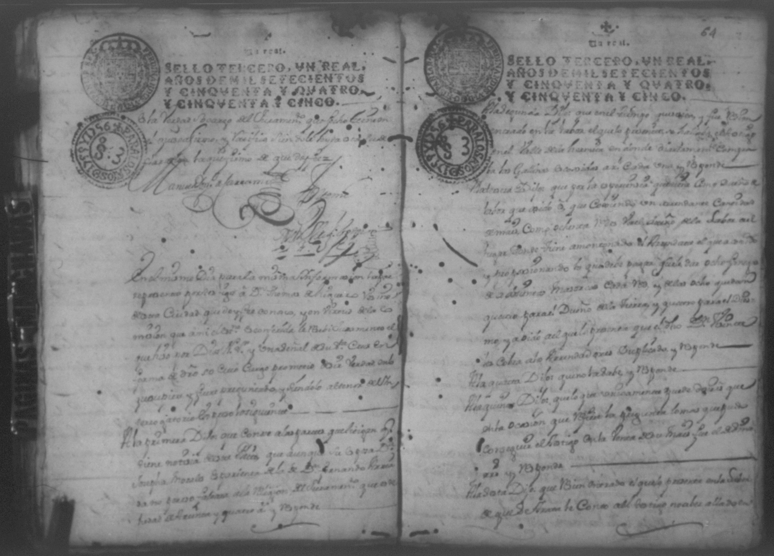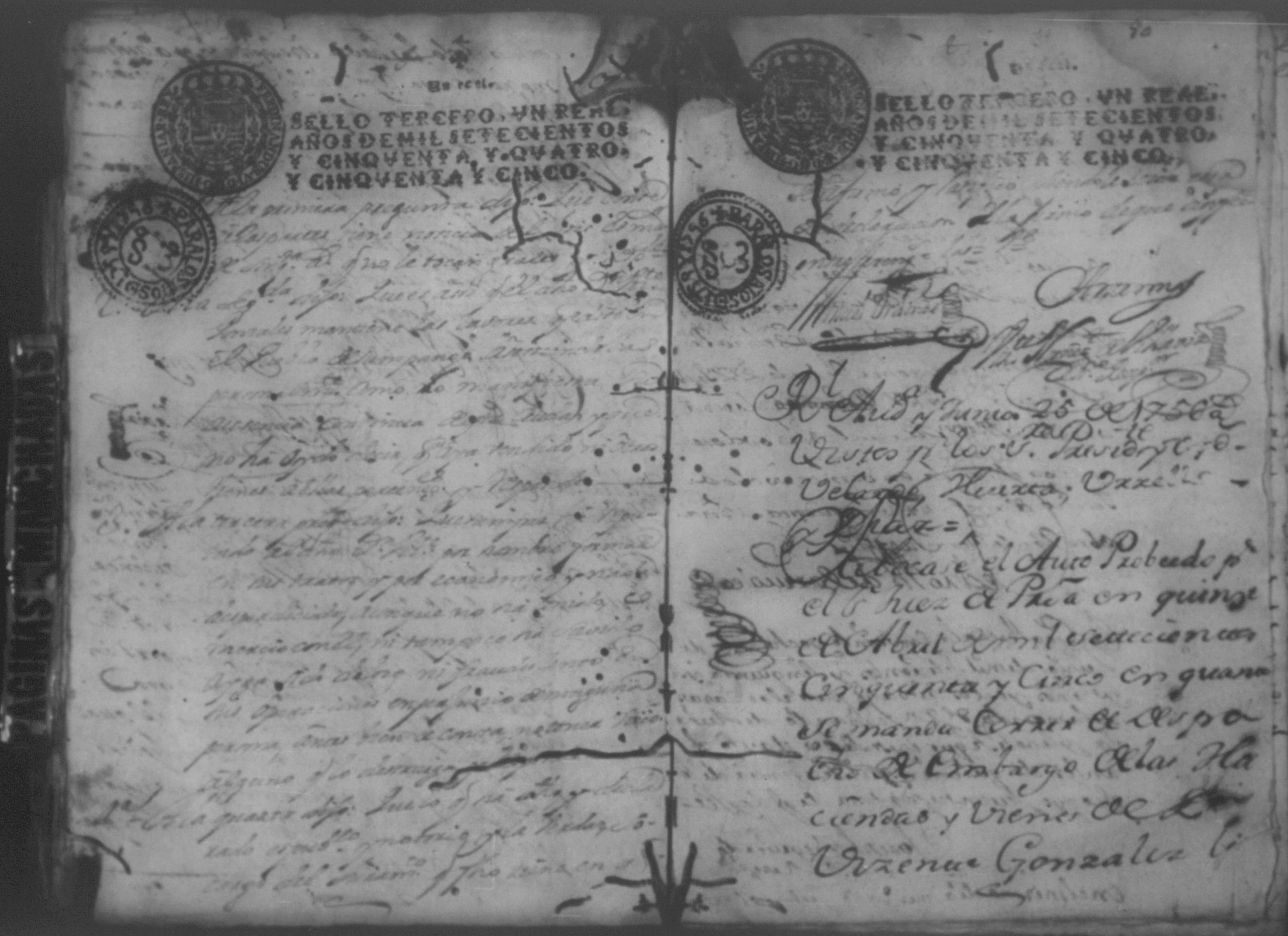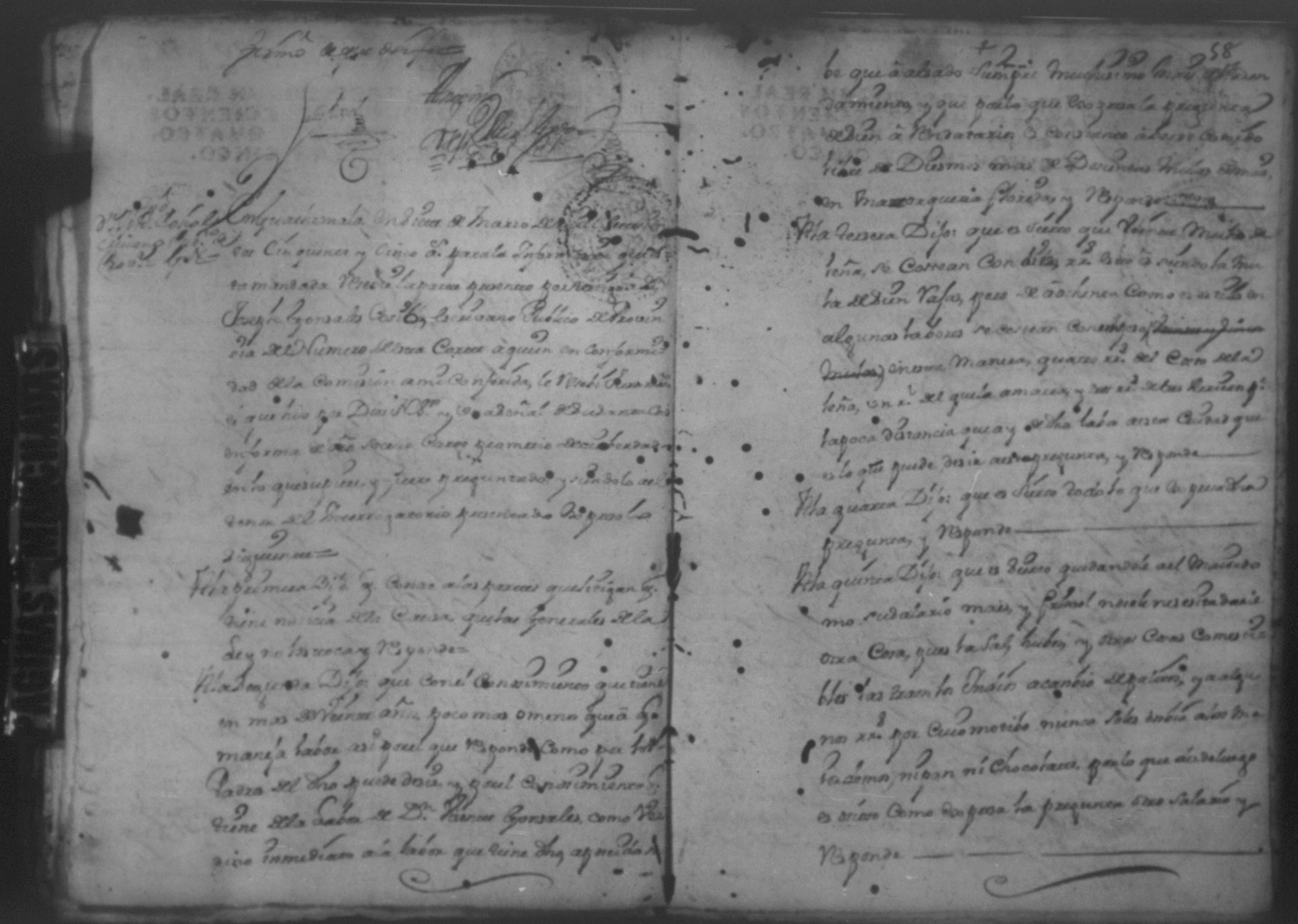 Temática: Año de 1757. Nicaragua. Don Vicente Ignacio Gonzalez reconozca la escriptura que se menciona por lo que toca a su muger Doña Maria Gertrudis Dardon se comette respecto de que de mancomun la otorgaron y firmaron y fecho […].