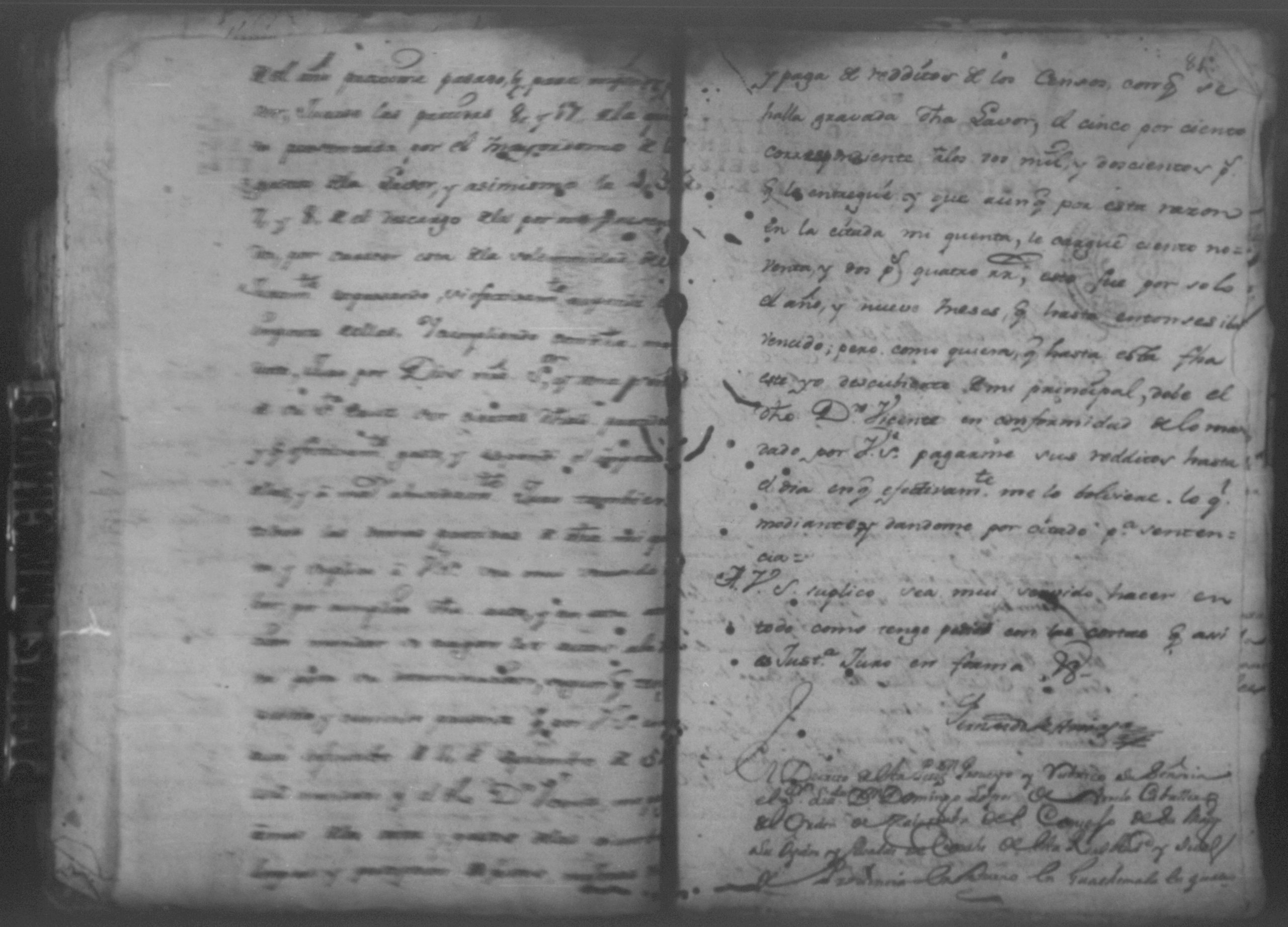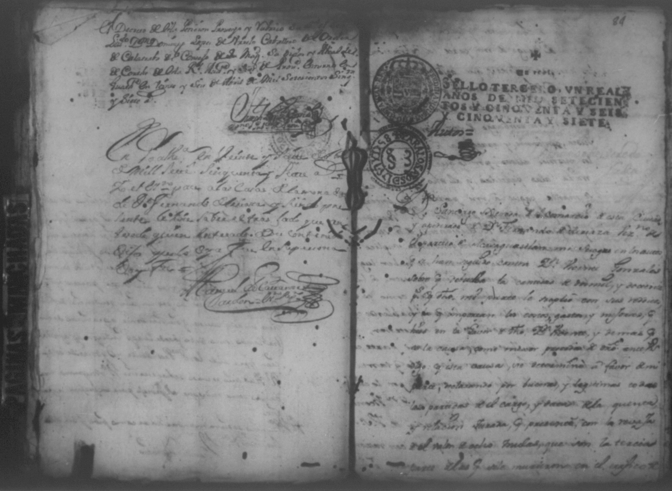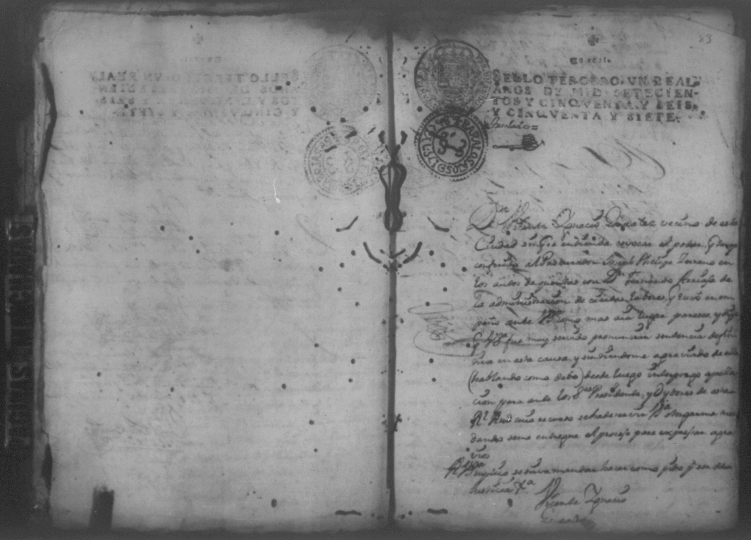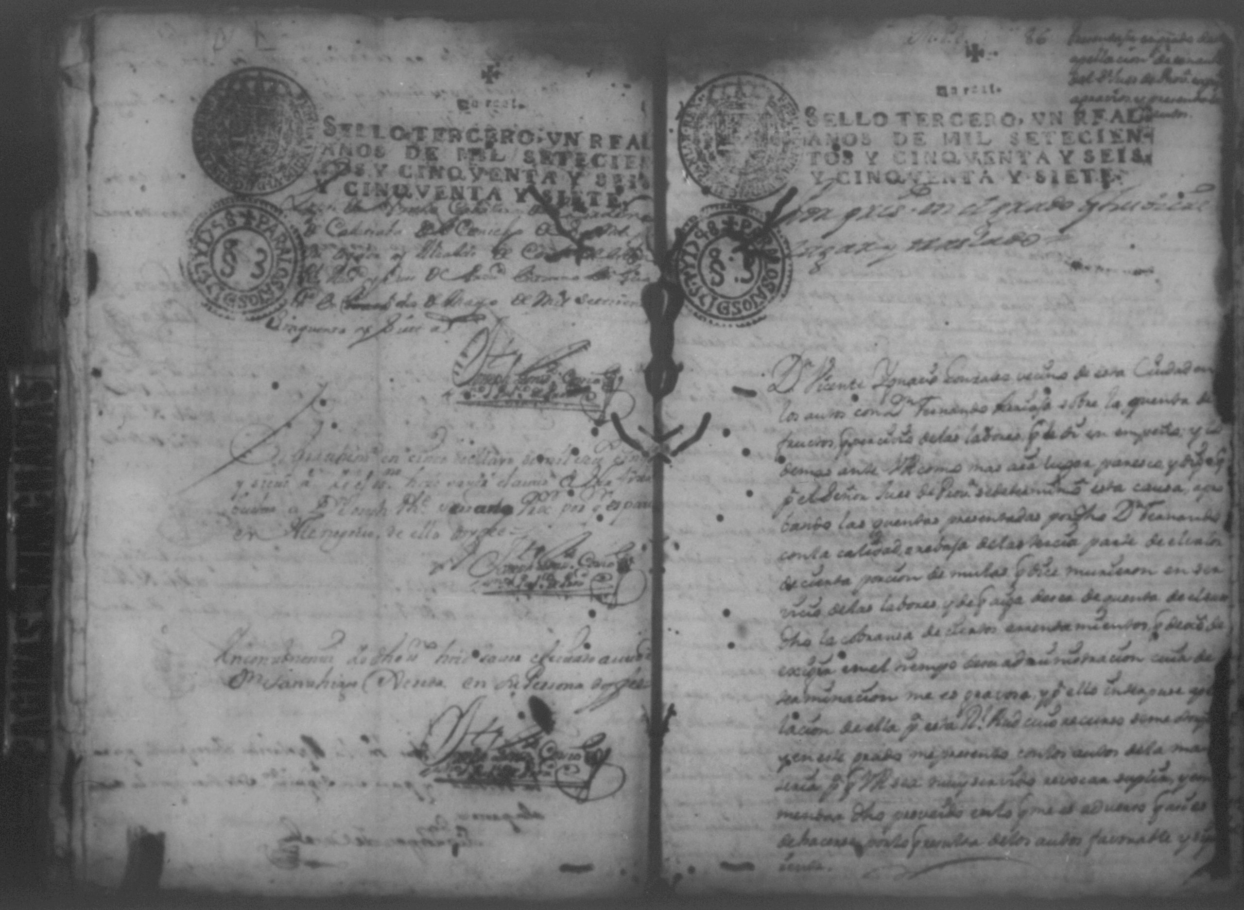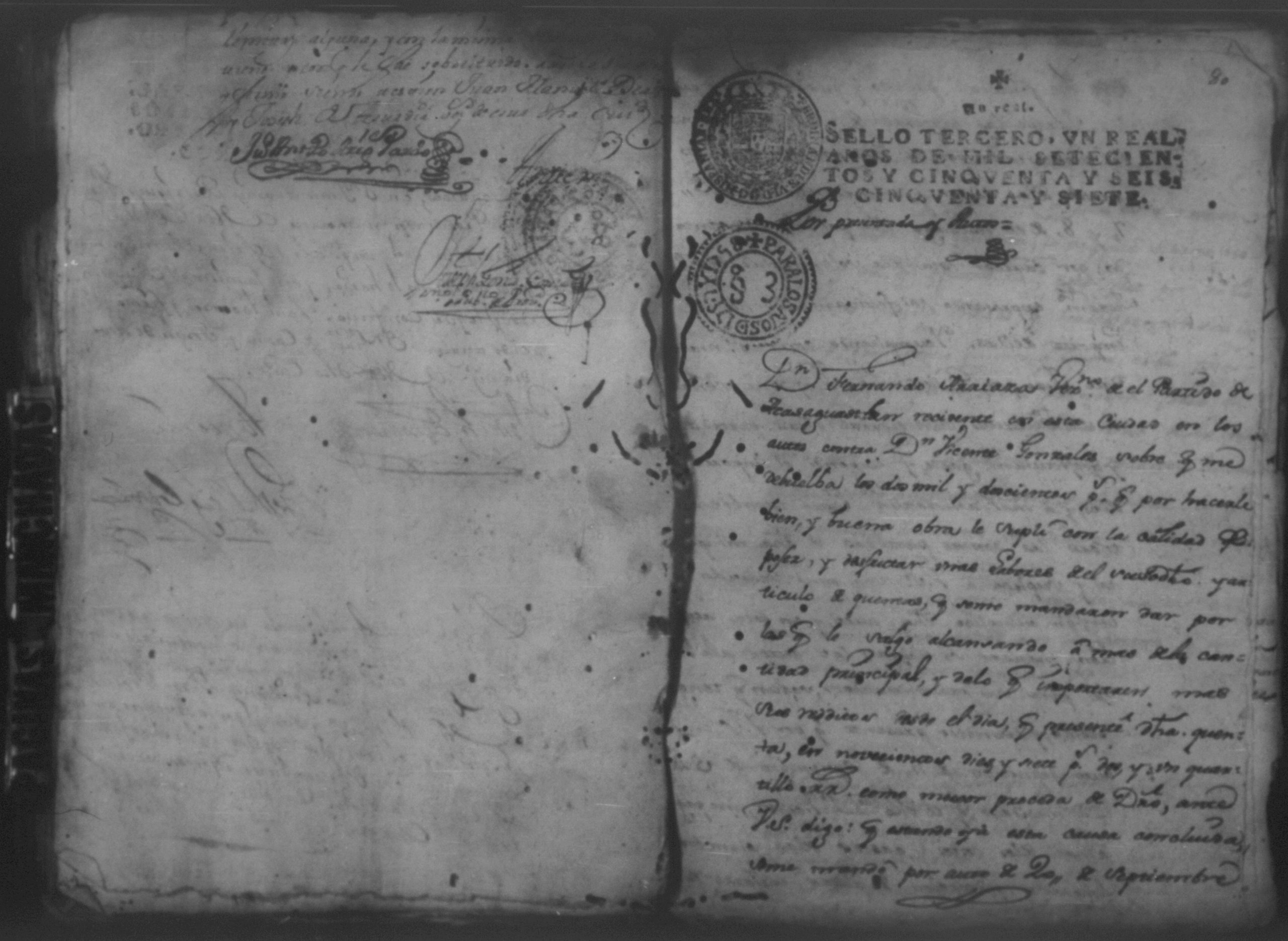 Temática: Año de 1757. Nicaragua. Don Vicente Ignacio Gonzalez reconozca la escriptura que se menciona por lo que toca a su muger Doña Maria Gertrudis Dardon se comette respecto de que de mancomun la otorgaron y firmaron y fecho […].