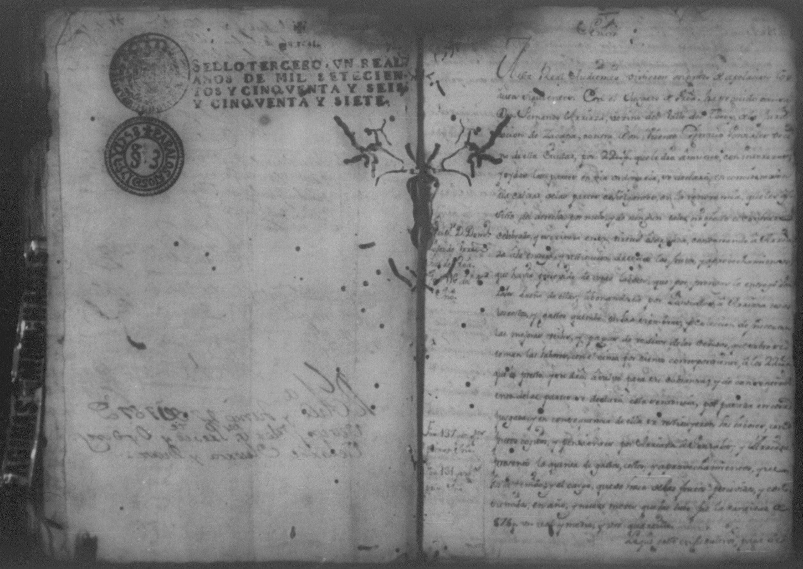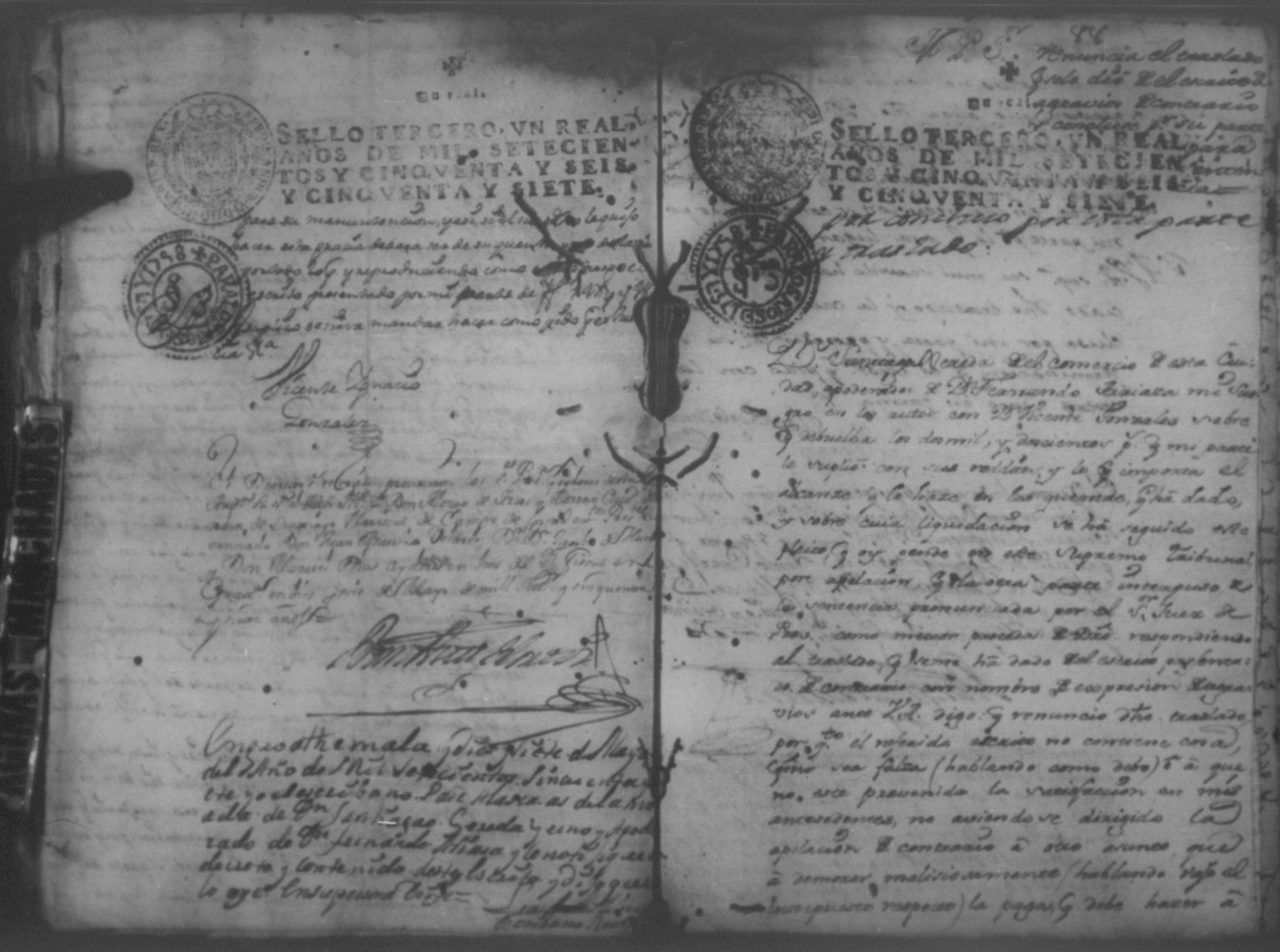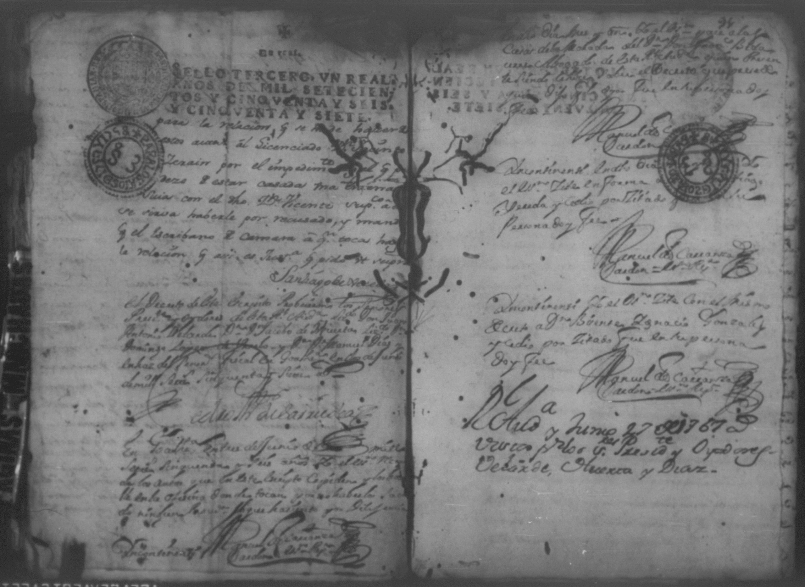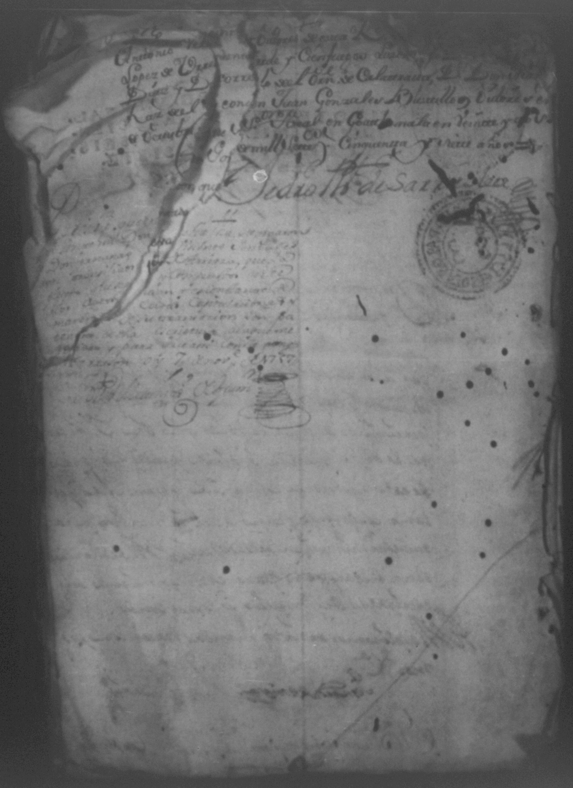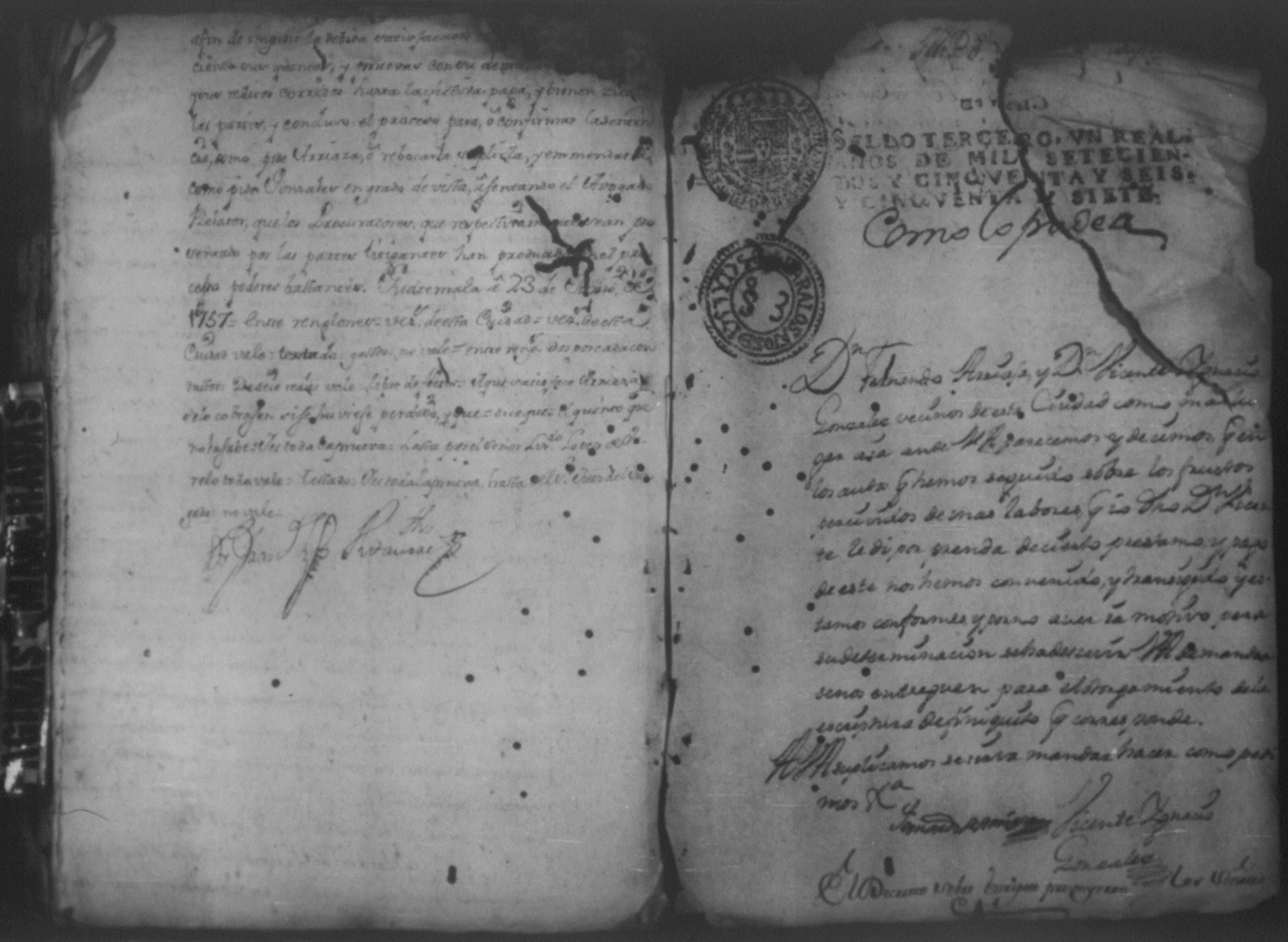 Temática: Año de 1757. Nicaragua. Don Vicente Ignacio Gonzalez reconozca la escriptura que se menciona por lo que toca a su muger Doña Maria Gertrudis Dardon se comette respecto de que de mancomun la otorgaron y firmaron y fecho […].