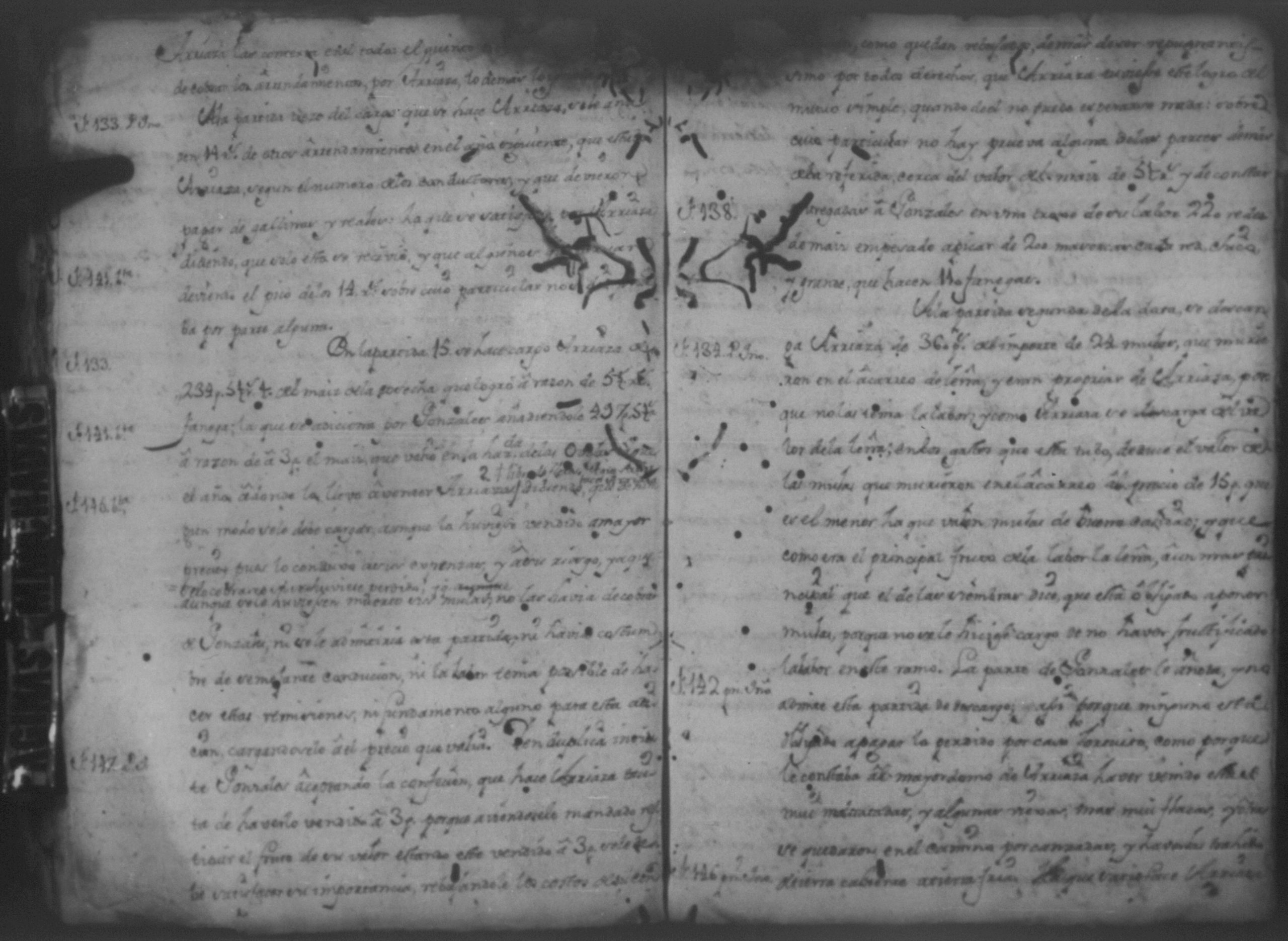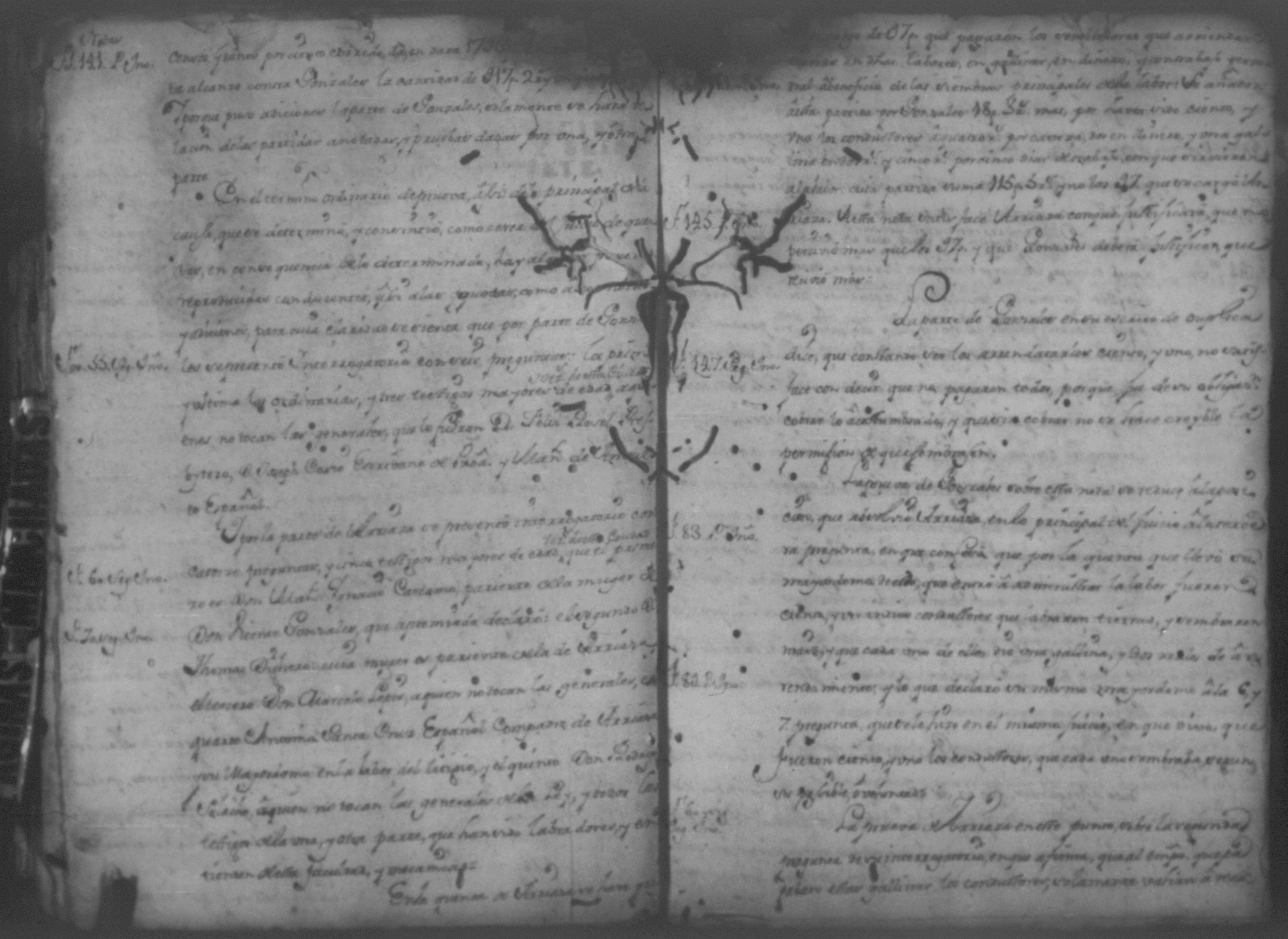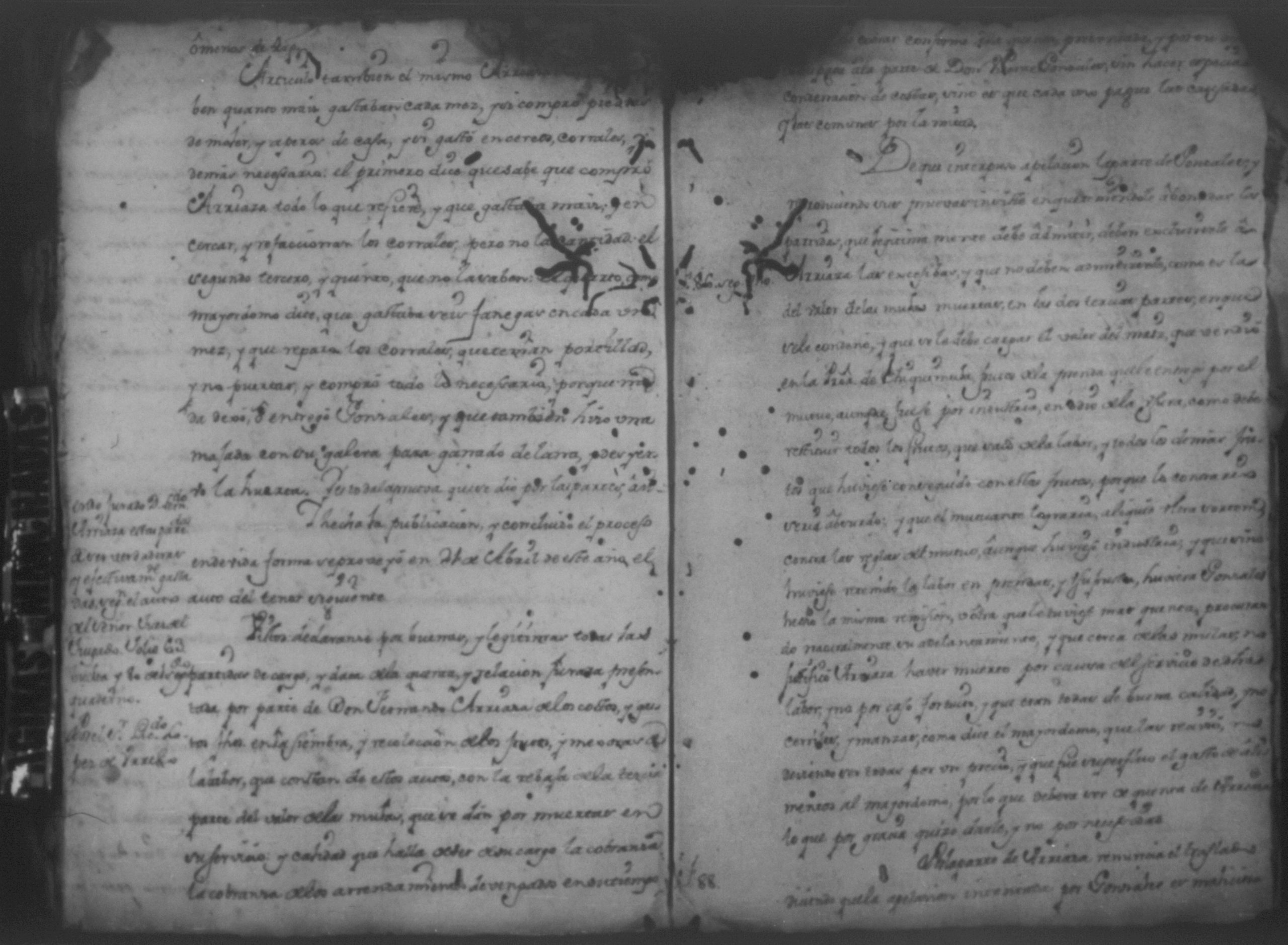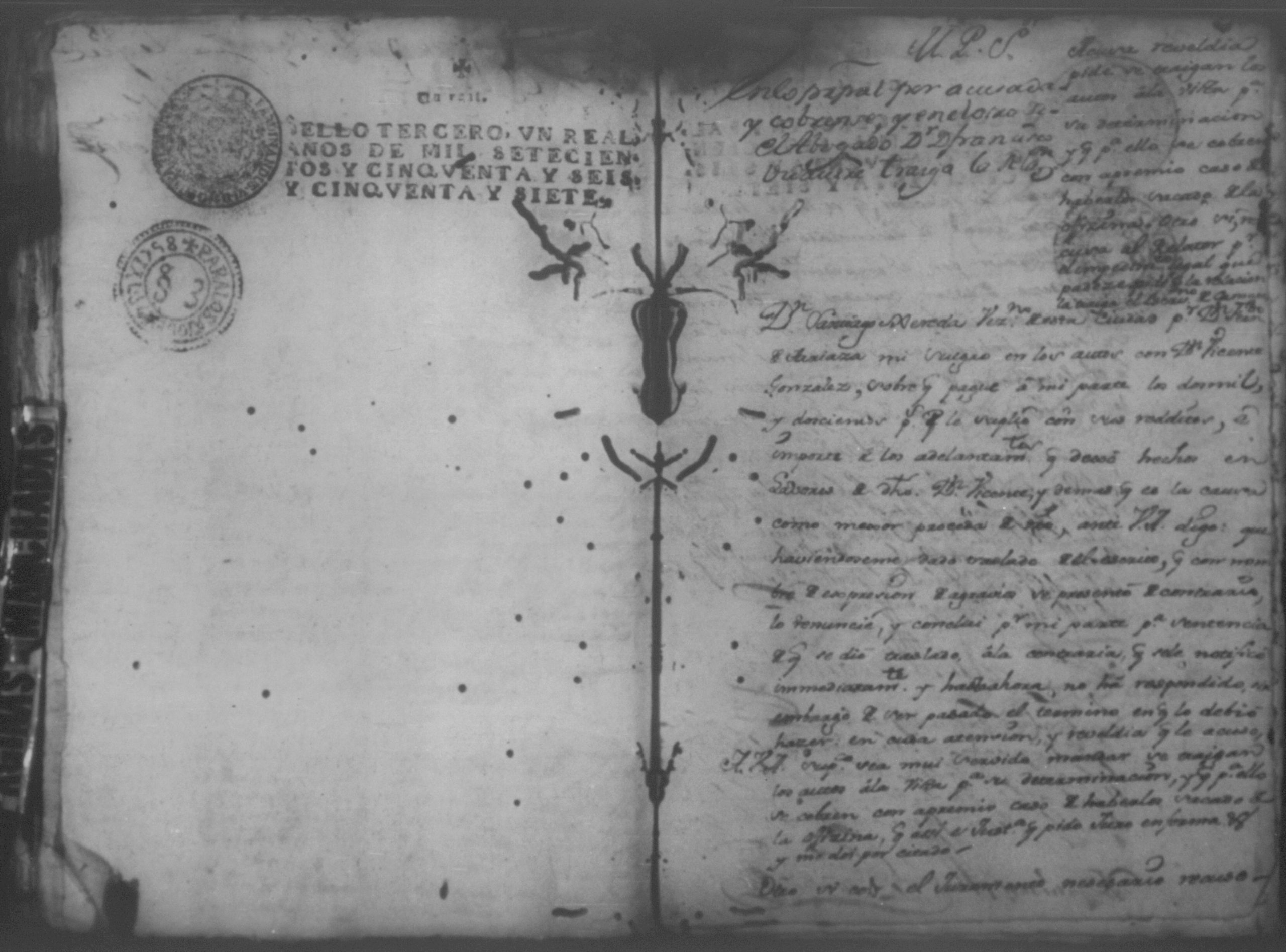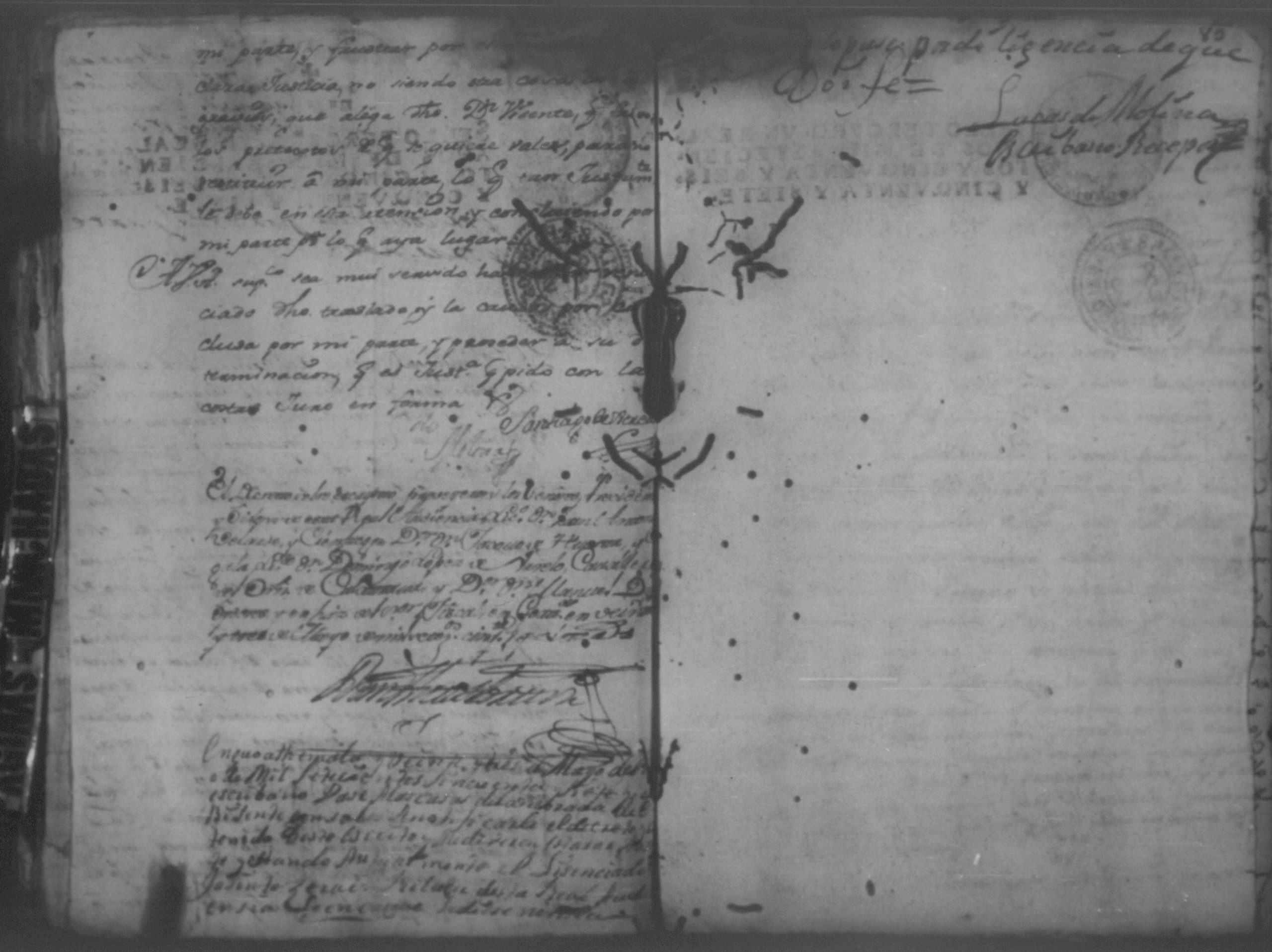 Temática: Año de 1757. Nicaragua. Don Vicente Ignacio Gonzalez reconozca la escriptura que se menciona por lo que toca a su muger Doña Maria Gertrudis Dardon se comette respecto de que de mancomun la otorgaron y firmaron y fecho […].