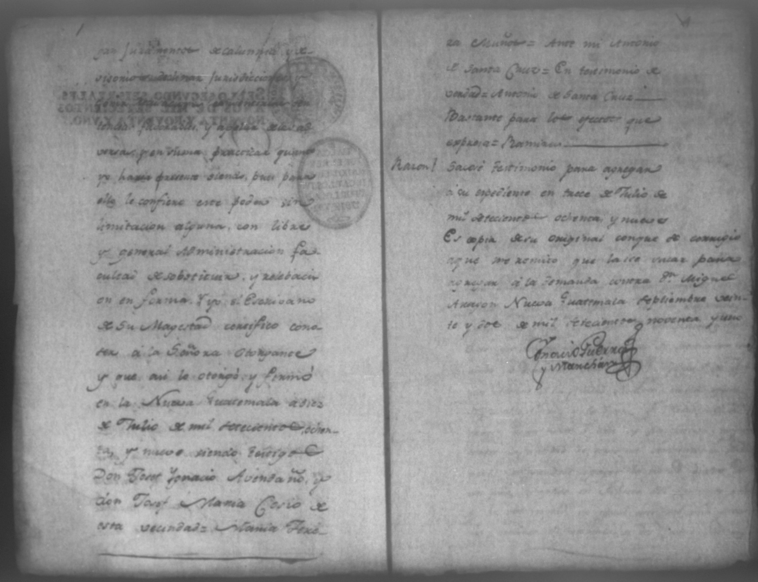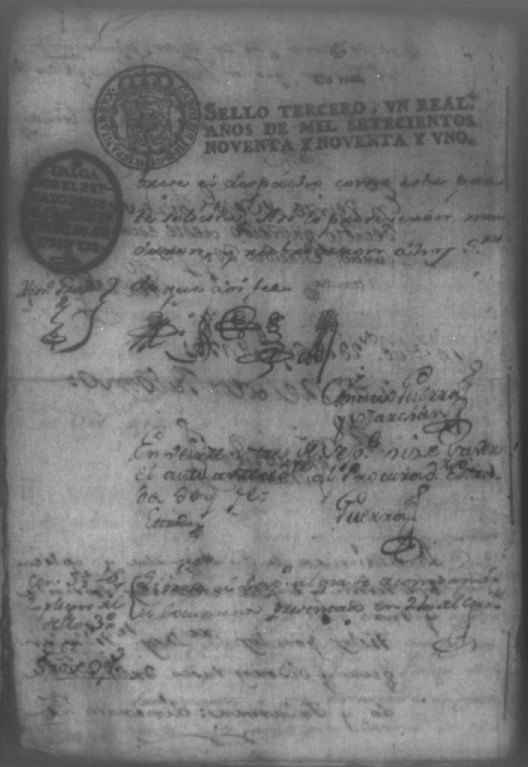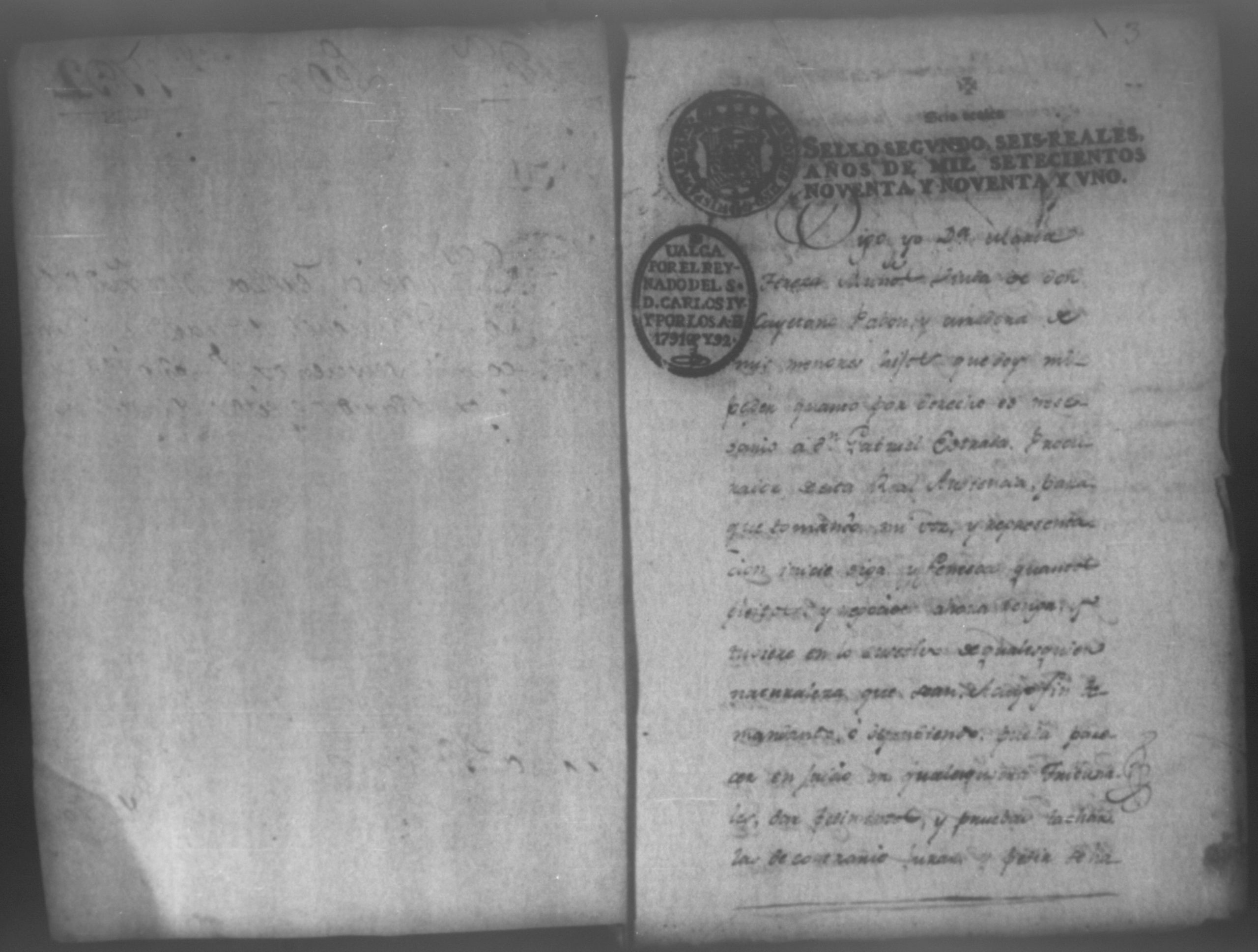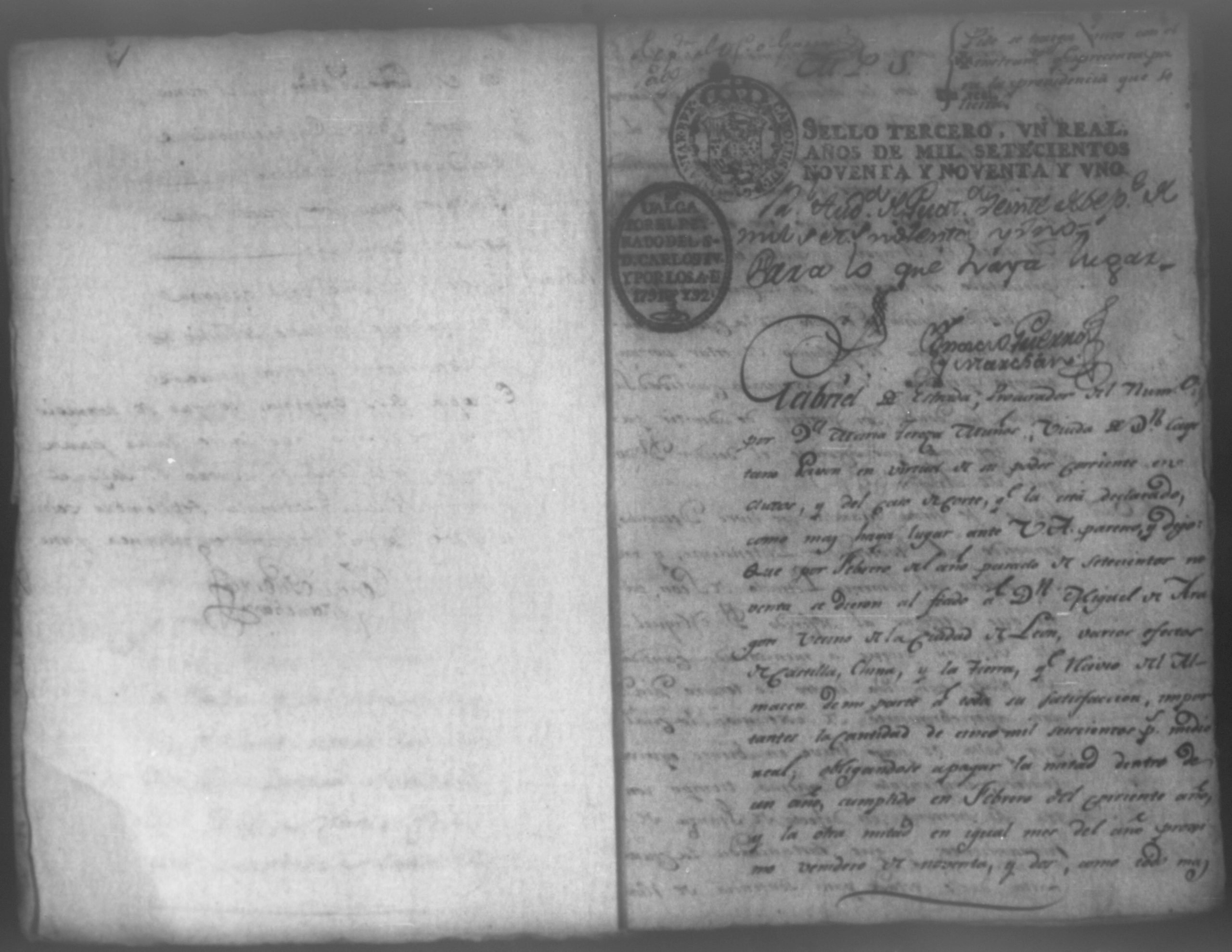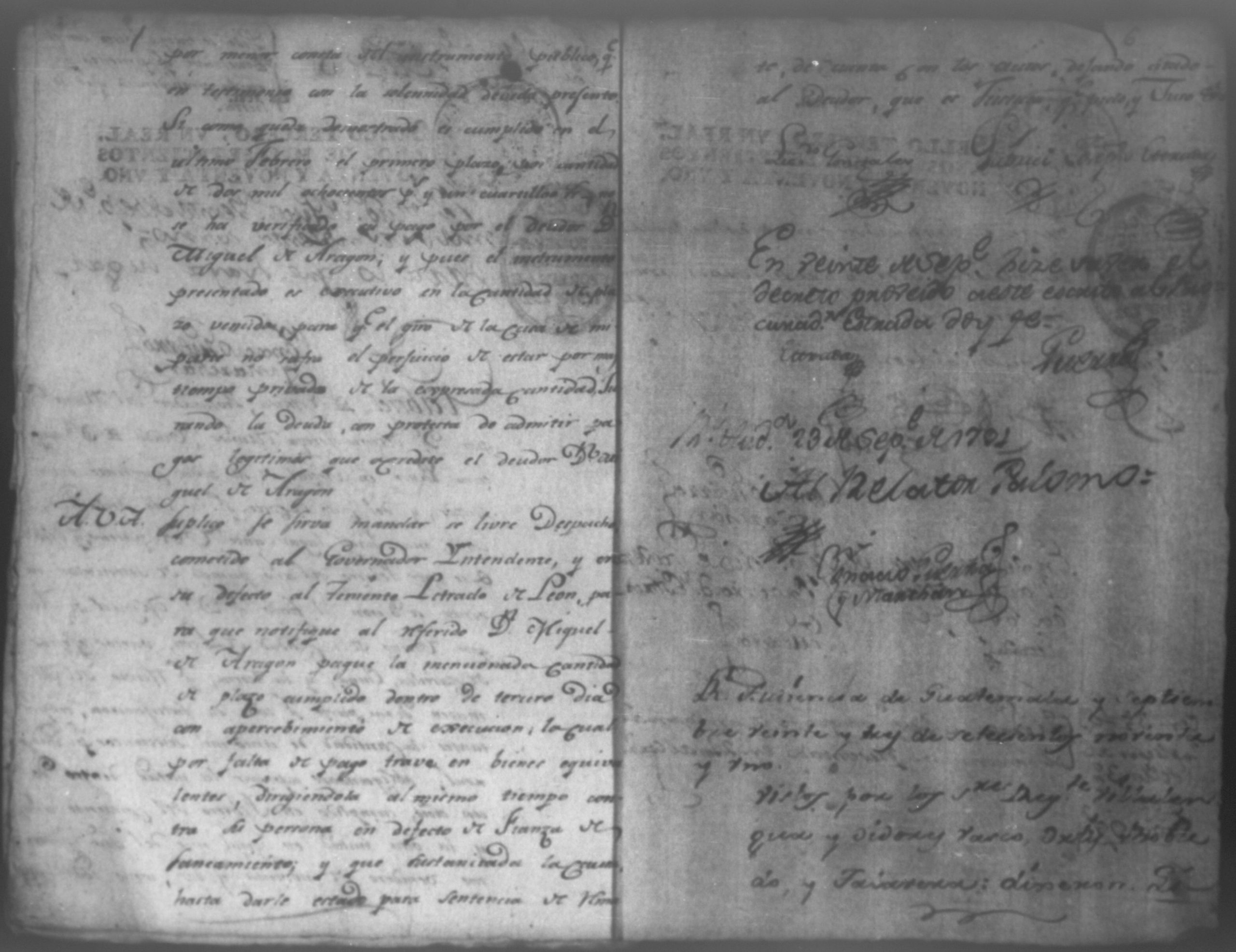 Temática: Audiencia de León, 1792. Doña Maria Teresa Muñoz contra Don Miguel de Aragon, quien le debe cinco mil seiscientos pesos medio real del valor varios efectos de Castilla. "Gabriel de Estrada, Procurador del Numero por Doña Maria Tereza Muñoz, viuda de Don Cayetano Pavon en virtud de su poder corriente en autos, y del caso de corte, que la esta declarado, como muy haya lugar ante Vuestra Alteza paresco y digo: Que por Febrero del año pasado de setecientos noventa dieron al fiado al Don Miguel de Aragon vecino de la Ciudad de Leon, varios efectos de Castilla [Nota: Los efectos de Castilla fueron mercancías importadas principalmente de Europa (España, Francia, Italia) hacia el Virreinato de la Nueva Granada a finales del siglo XVIII, tras el reglamento de libre comercio de 1778], China y la Tierra, que recivio del Almacen de mi parte á toda su satisfaccion, importantes la cantidad de cinco mil seiscientos pesos medio real, obligandose a pagar la mitad dentro de un año, cumplido en Febrero del corriente año, y la otra mitad en igual mes del año proximo venidero de noventa u dos [...]" (Extracto del folio 5, imagen 6)