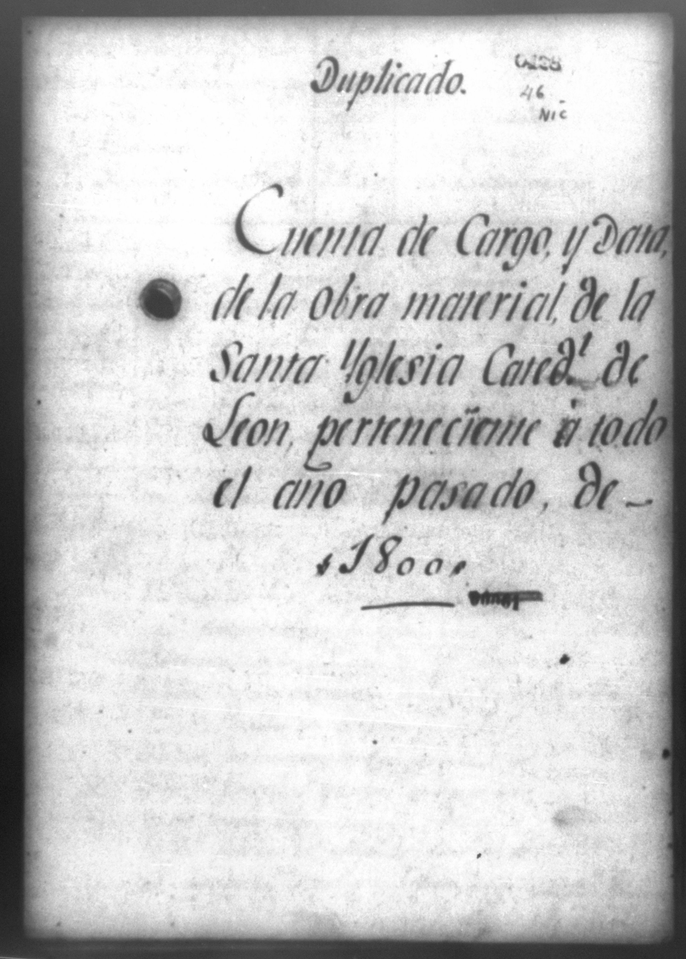 Temática: Duplicado. Cuenta de Cargo, y Data de la obra material, de la Santa Yglesia Catedral de Leon, perteneciente a todo el año pasado, de 1800.