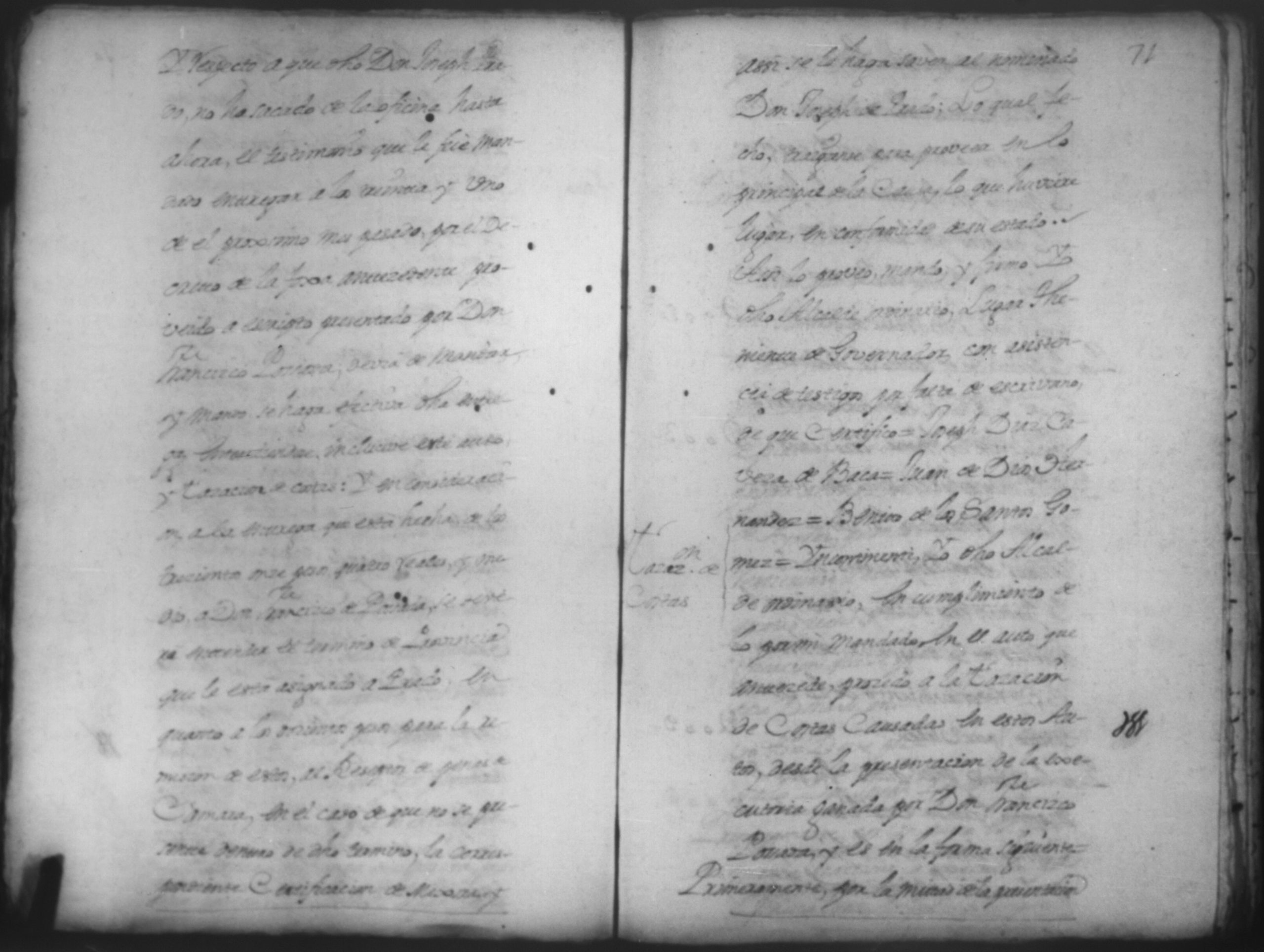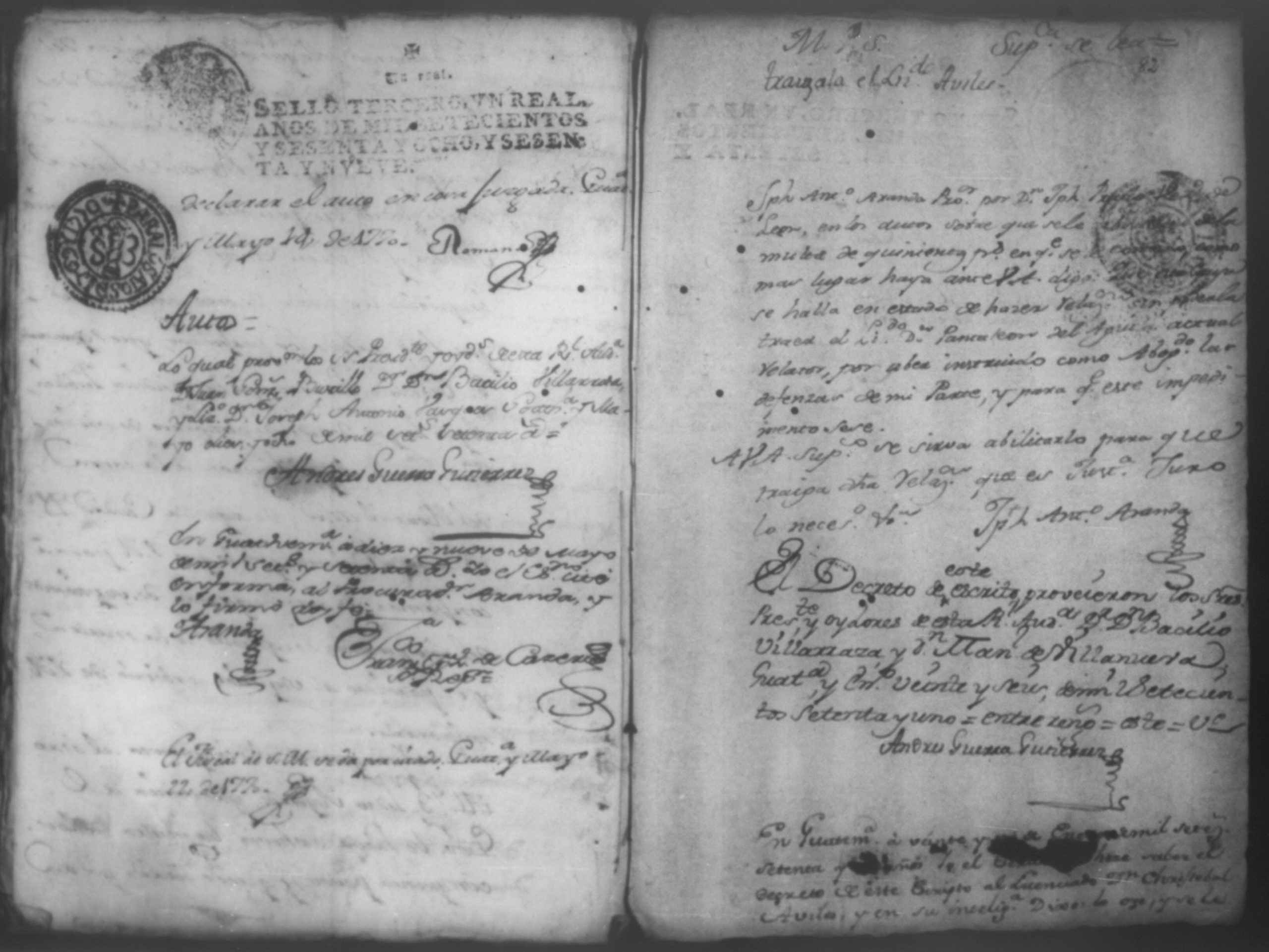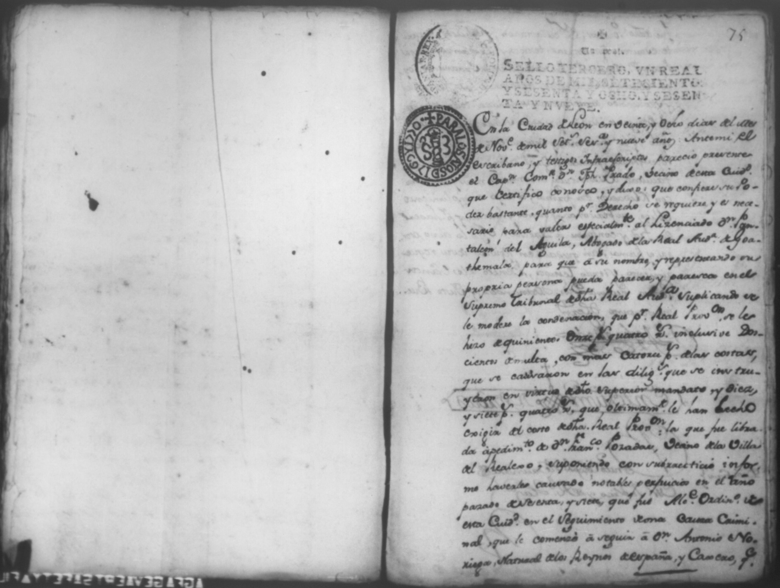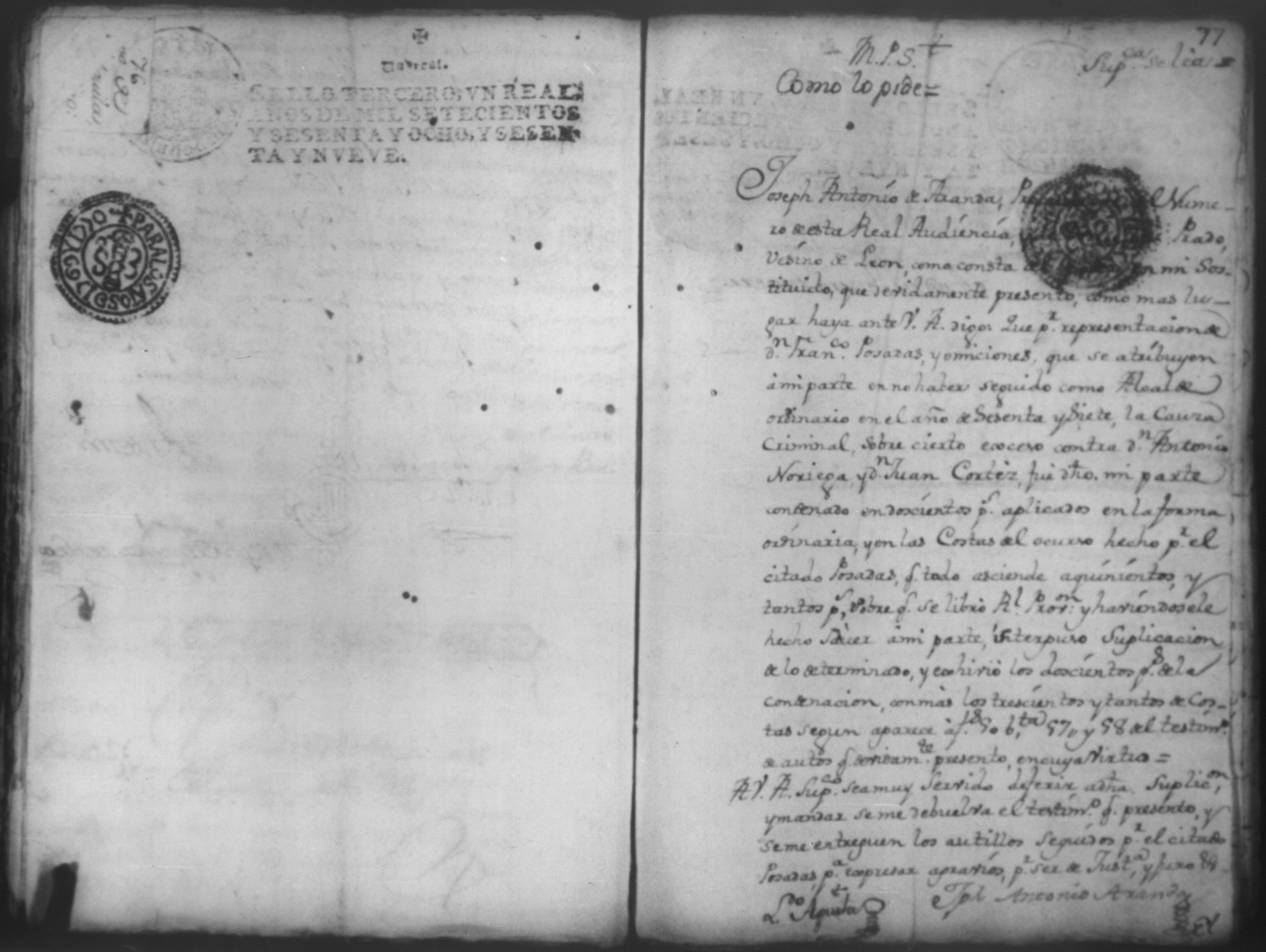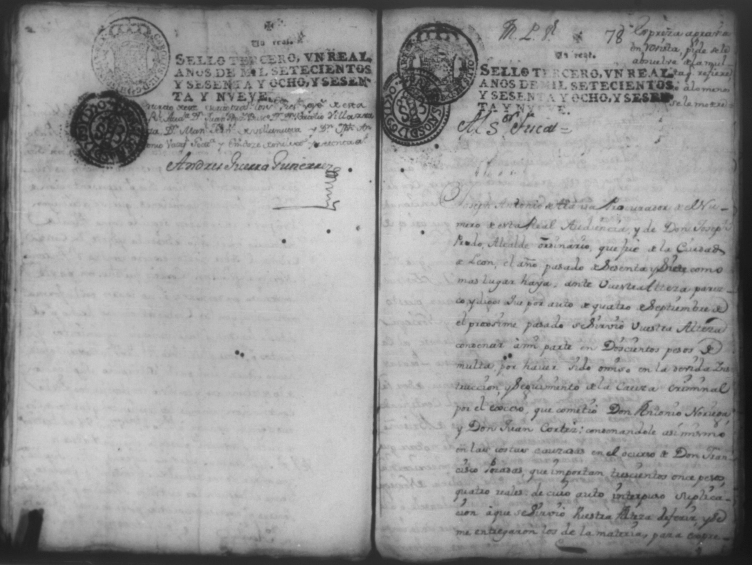 Temática: Año de 1769- 1771. Leon.Testimonio de Autos de las primeras diligencias por el practicadas por el Capitan Don Joseph de Prado el año pasado de 1767 siendo Alcalde ordinario de primer voto Contra Don Antonio Noriega, Don Juan Cortez, en la causa criminal al que en este se hase mencion y cometieron en la Causa del Capitan Don Antonio Narbaez asi mismo se incluye en este la Real provicion ganada por Don Francisco Posadas condenacion importa en ella y demas diligecias asu continuacion practicada contra contra dicho Prado y el Capitan Don Pedro Manuel Ayerdi.