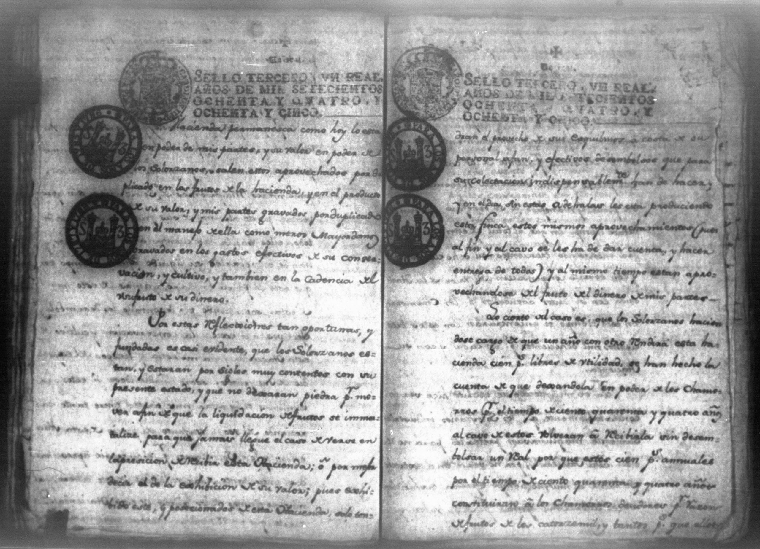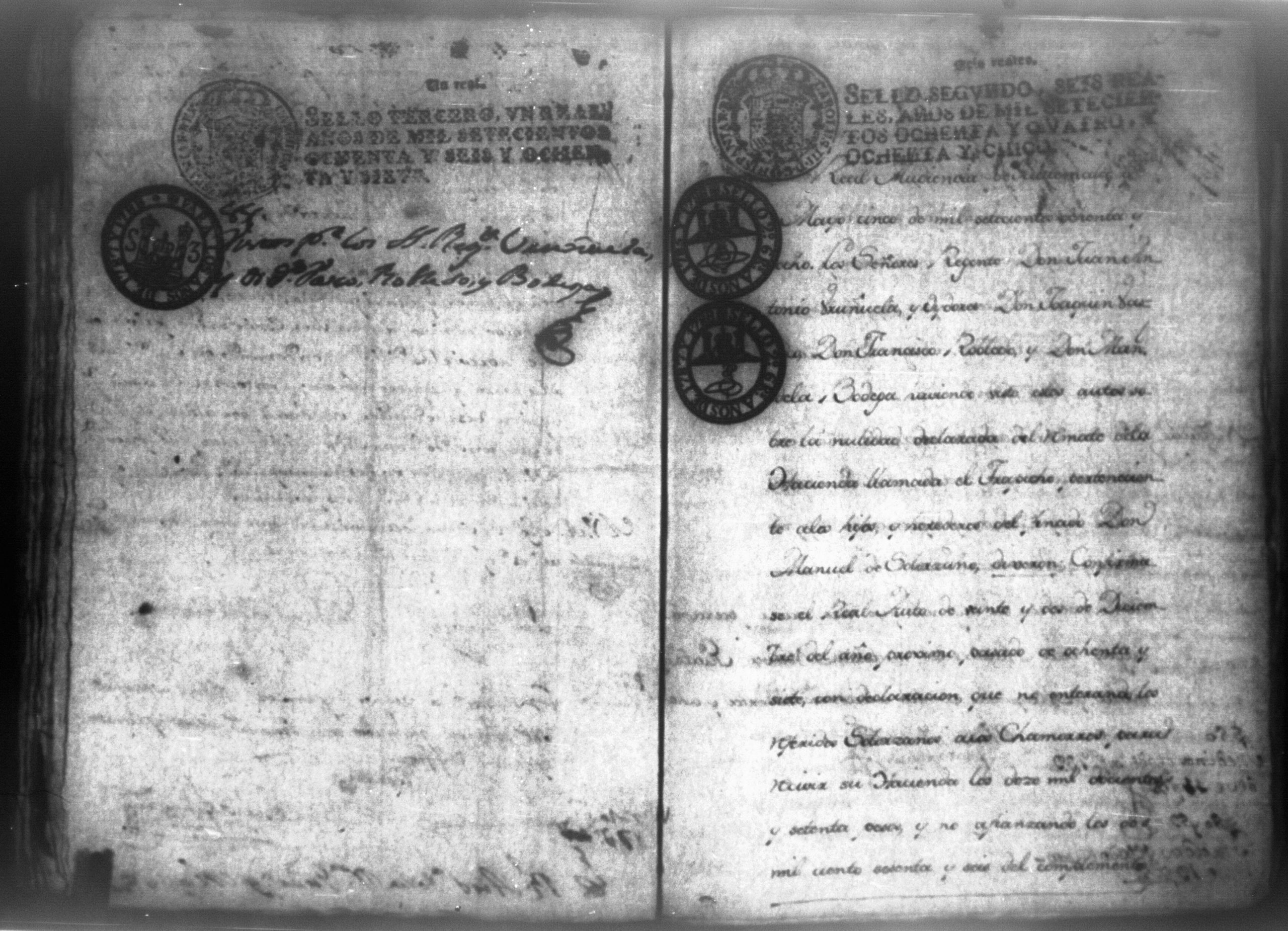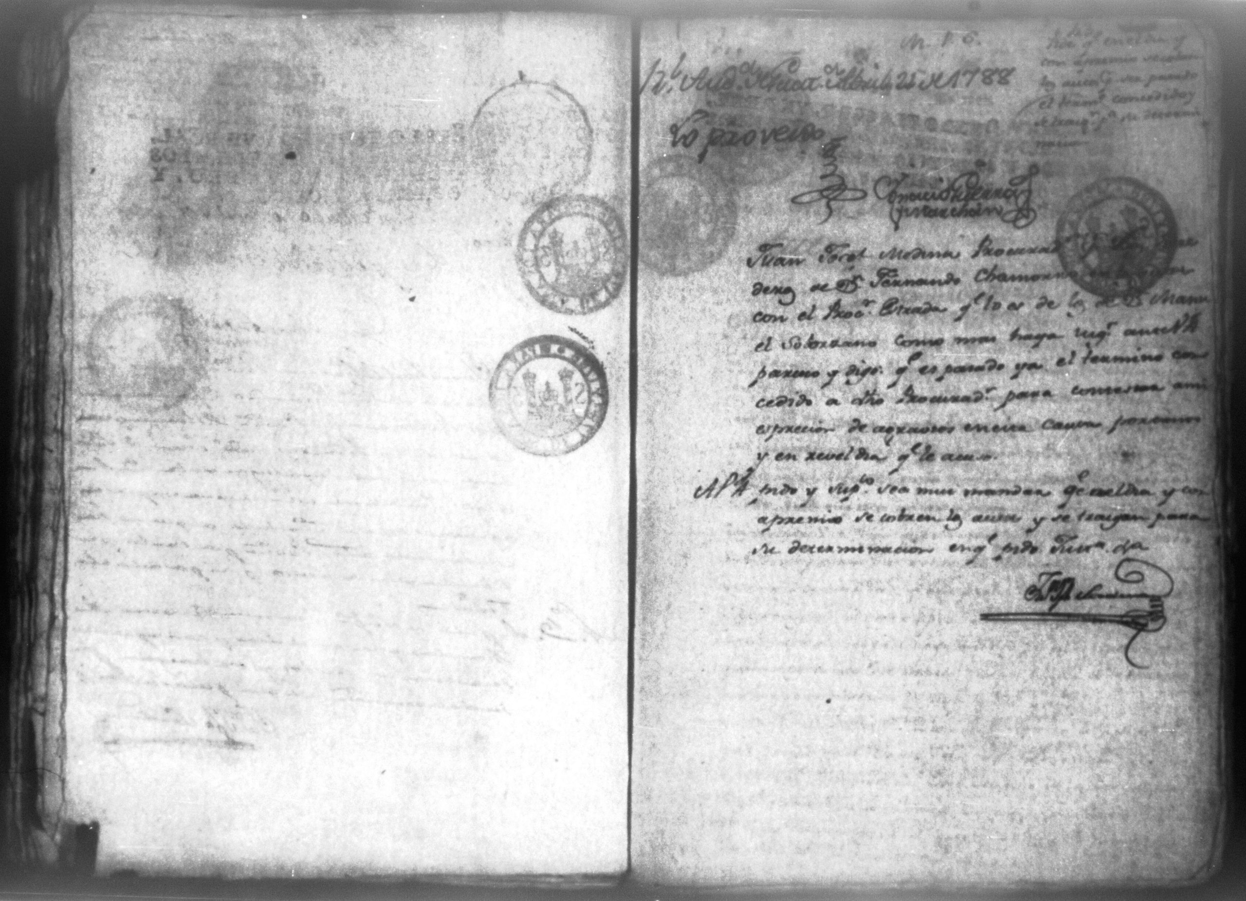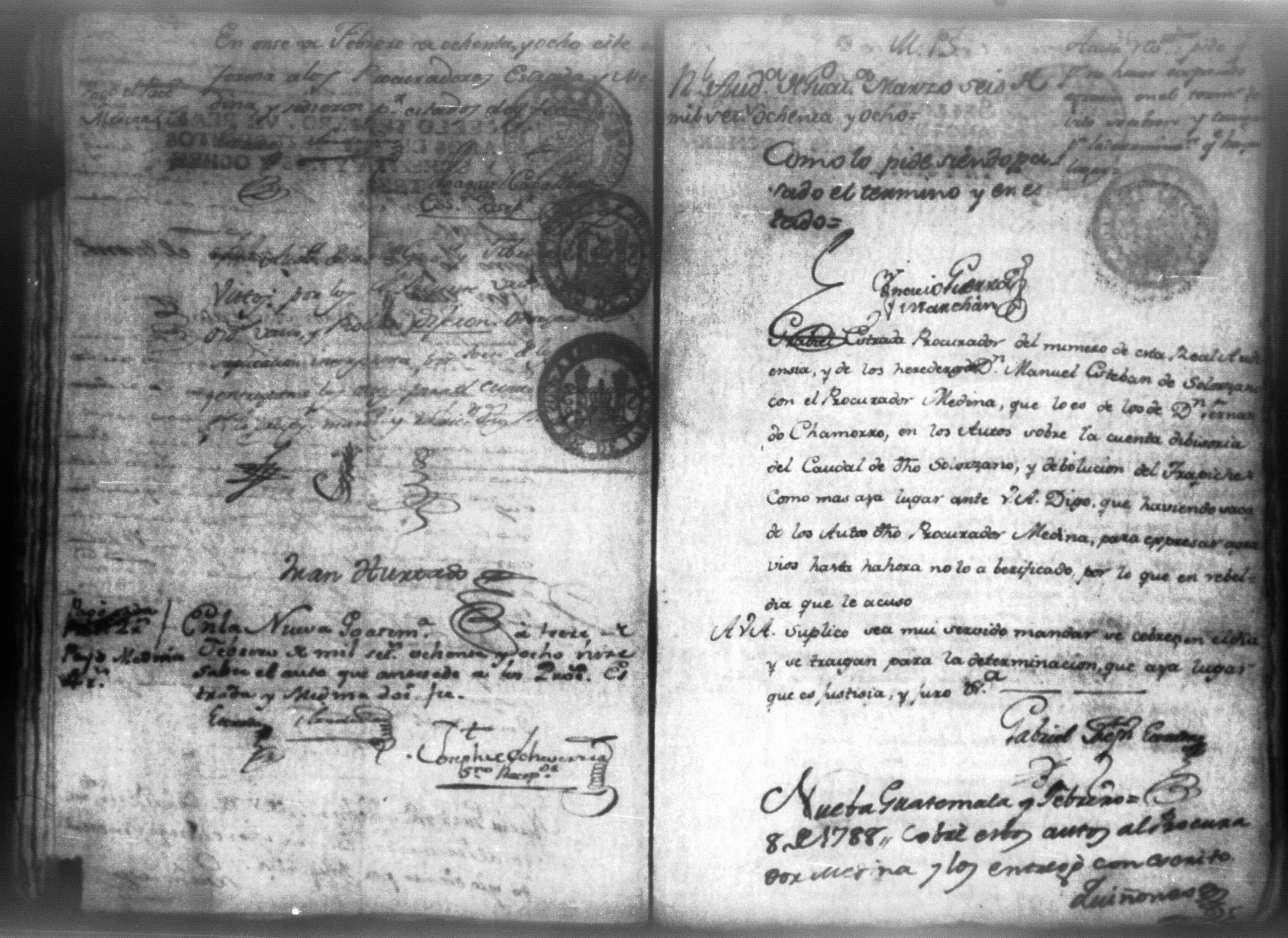 Temática: Audiencia, León 1788. Lo actuado con la executoria del Pleito que siguieron los Solorzanos contra los Chamorros sobre nulidad del remate de la Hazienda del Trapiche. Gabriel de Estada Procurador de los del numero de esta Real Audiencia y de Don Joseph Juachin de Solorzano Alferez Real del Noble Ayuntamiento de la ciudad de Granada, de más hermanas, hijos y herederos del finado Don Manuel de Navas de Solorzano como lugar haya en derecho, ante v.a. parezco y digo: que en los autos seguidos en este Supremo Tribunal en virtud del caso por coste que en las [...] a mi partes conta el Procurador Juan Joseph Medina que lo [...] Don Fernando Chamorro sobre nulidad de la venta de la Hacienda de Cacao nombrada El Trapiche...
