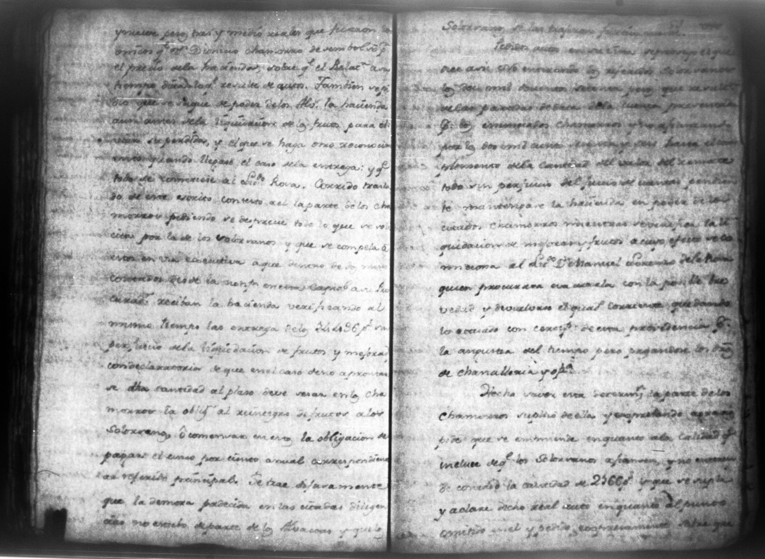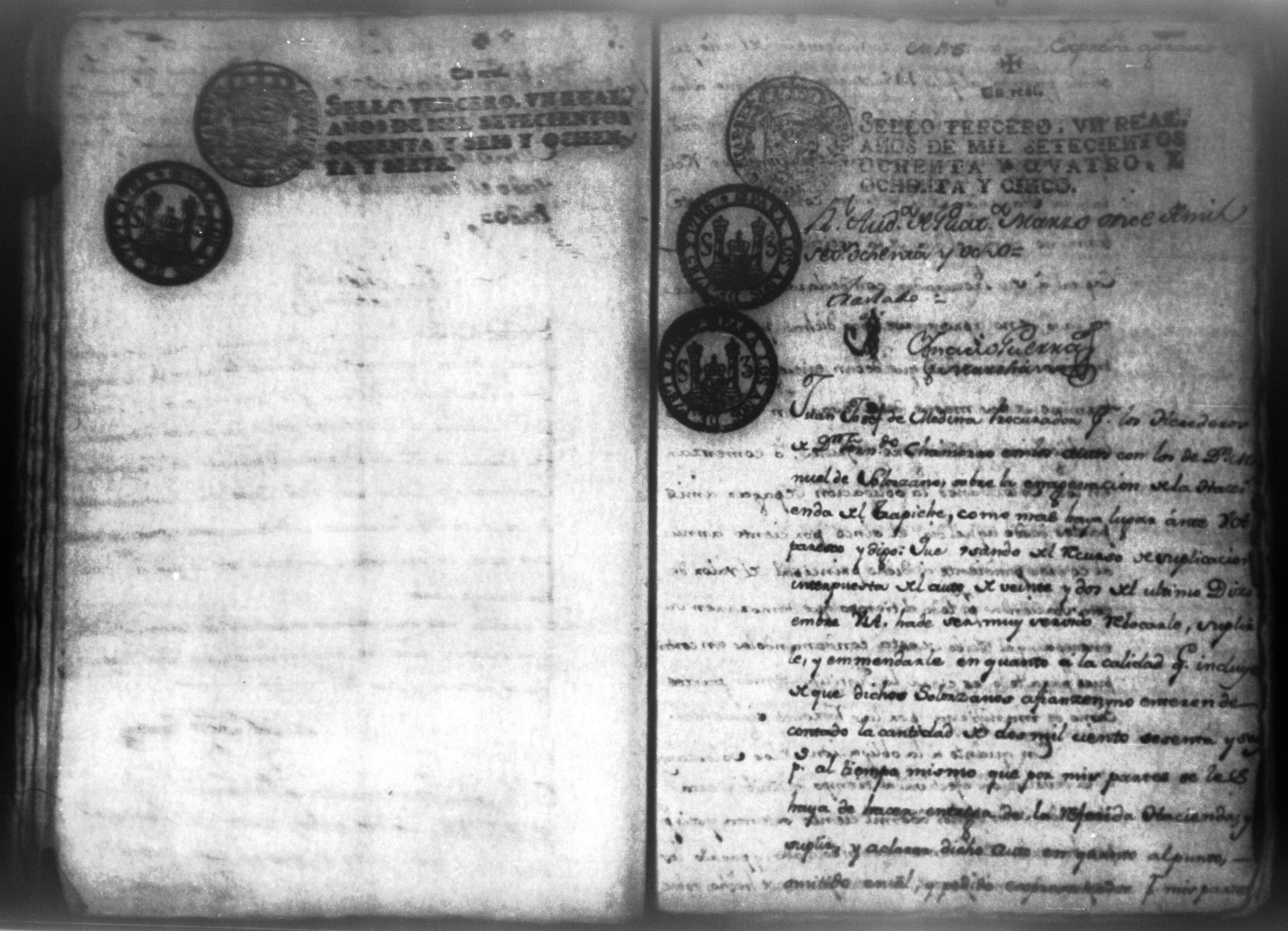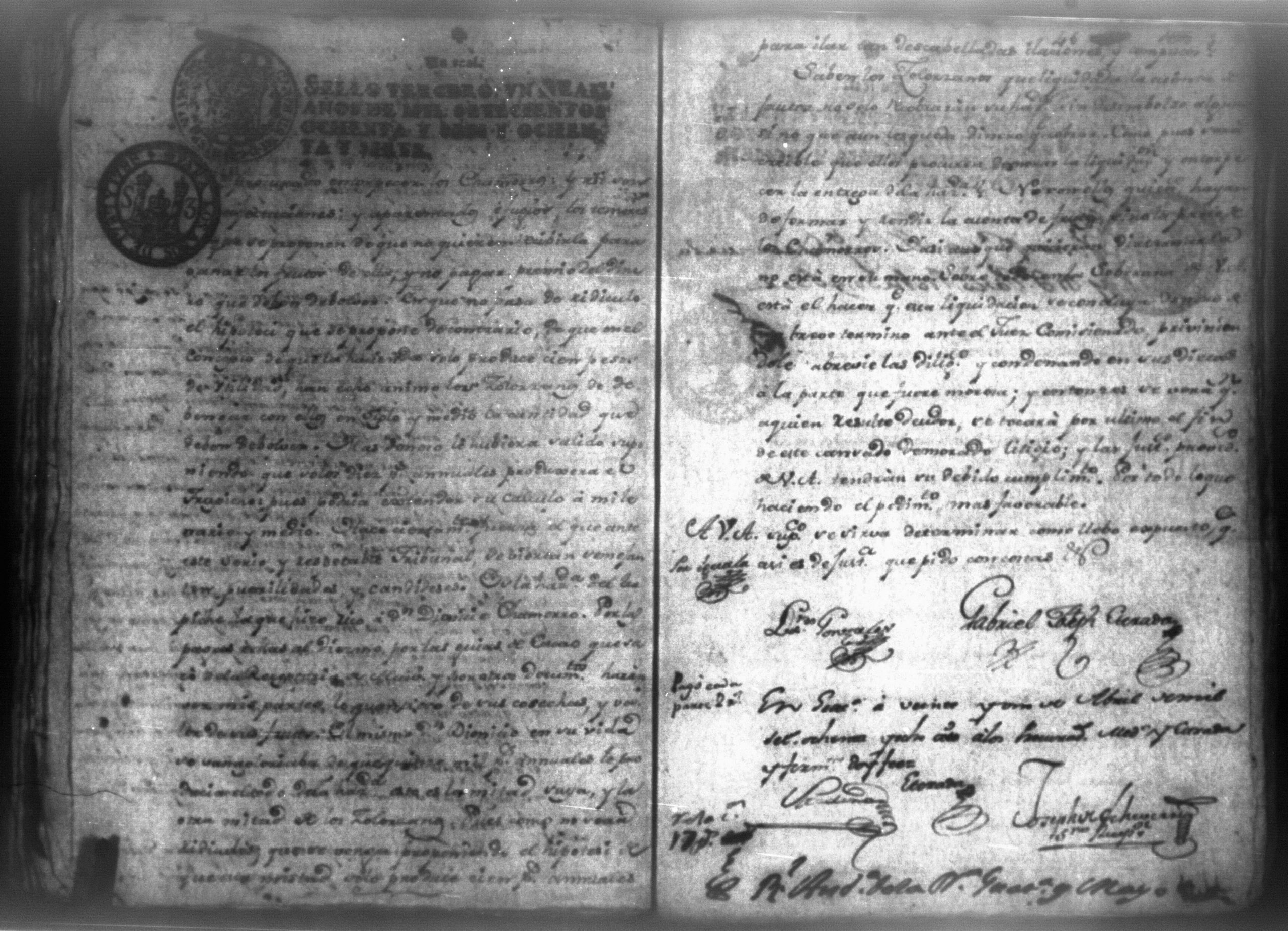 Temática: Audiencia, León 1788. Lo actuado con la executoria del Pleito que siguieron los Solorzanos contra los Chamorros sobre nulidad del remate de la Hazienda del Trapiche. Gabriel de Estada Procurador de los del numero de esta Real Audiencia y de Don Joseph Juachin de Solorzano Alferez Real del Noble Ayuntamiento de la ciudad de Granada, de más hermanas, hijos y herederos del finado Don Manuel de Navas de Solorzano como lugar haya en derecho, ante v.a. parezco y digo: que en los autos seguidos en este Supremo Tribunal en virtud del caso por coste que en las [...] a mi partes conta el Procurador Juan Joseph Medina que lo [...] Don Fernando Chamorro sobre nulidad de la venta de la Hacienda de Cacao nombrada El Trapiche...