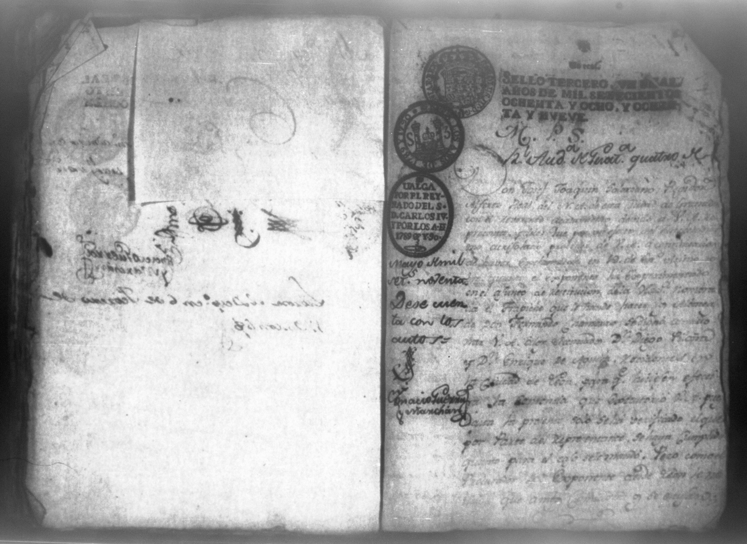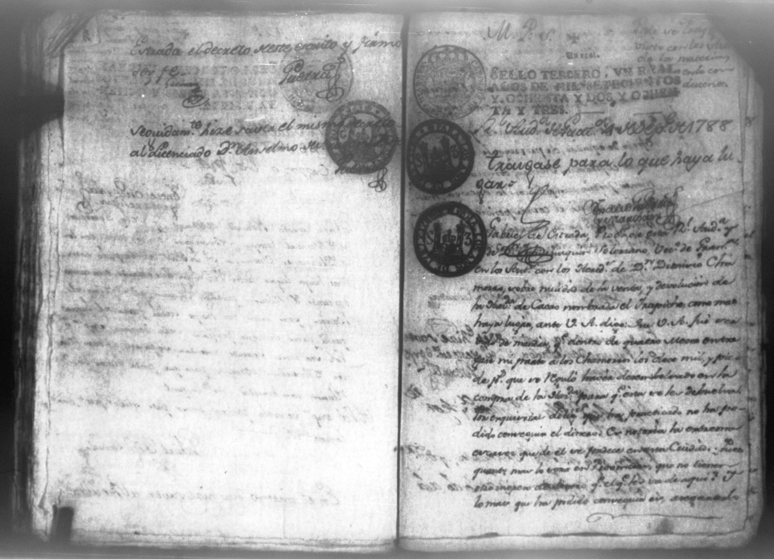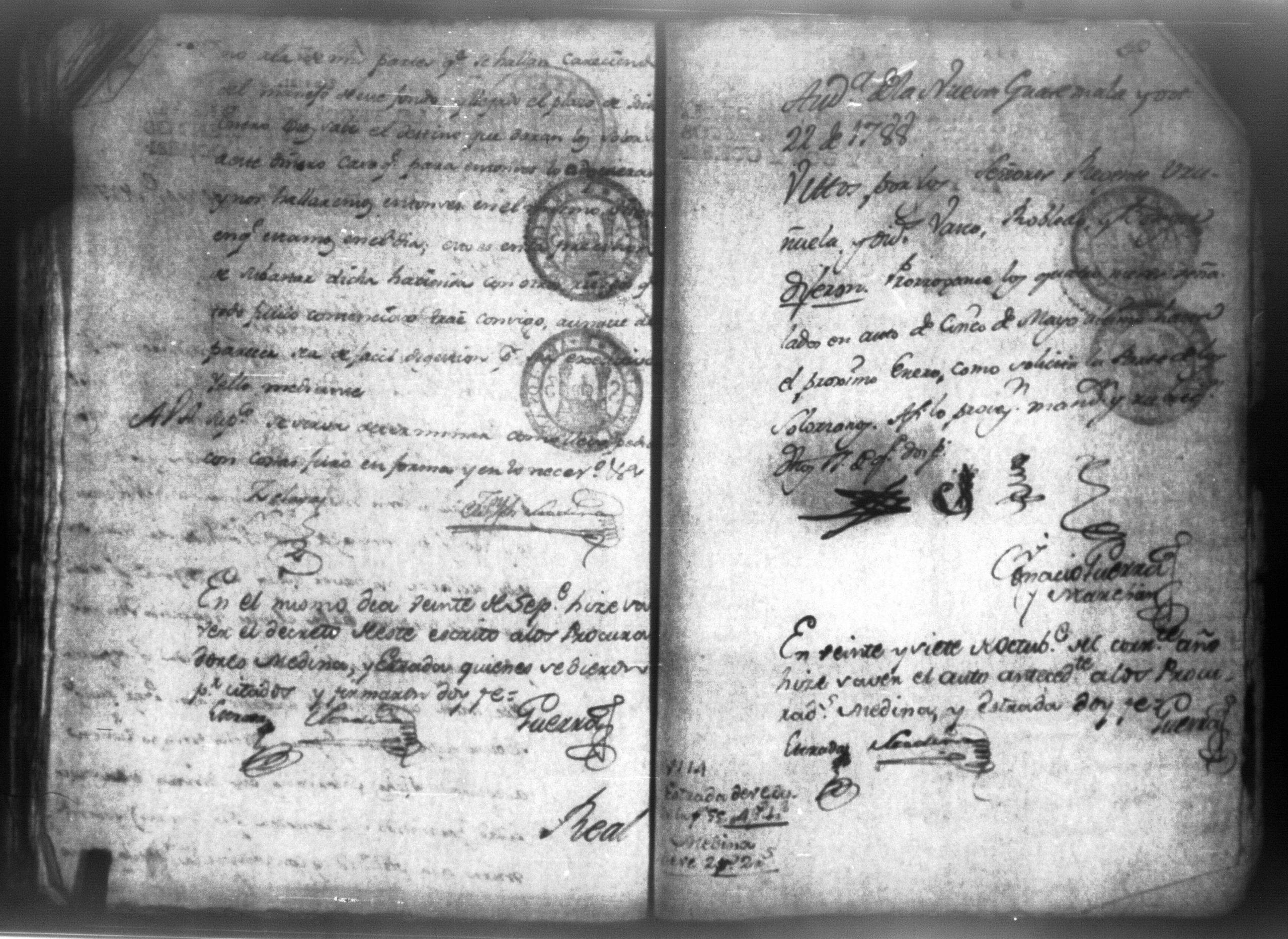 Temática: Audiencia, León 1788. Lo actuado con la executoria del Pleito que siguieron los Solorzanos contra los Chamorros sobre nulidad del remate de la Hazienda del Trapiche. Gabriel de Estada Procurador de los del numero de esta Real Audiencia y de Don Joseph Juachin de Solorzano Alferez Real del Noble Ayuntamiento de la ciudad de Granada, de más hermanas, hijos y herederos del finado Don Manuel de Navas de Solorzano como lugar haya en derecho, ante v.a. parezco y digo: que en los autos seguidos en este Supremo Tribunal en virtud del caso por coste que en las [...] a mi partes conta el Procurador Juan Joseph Medina que lo [...] Don Fernando Chamorro sobre nulidad de la venta de la Hacienda de Cacao nombrada El Trapiche...