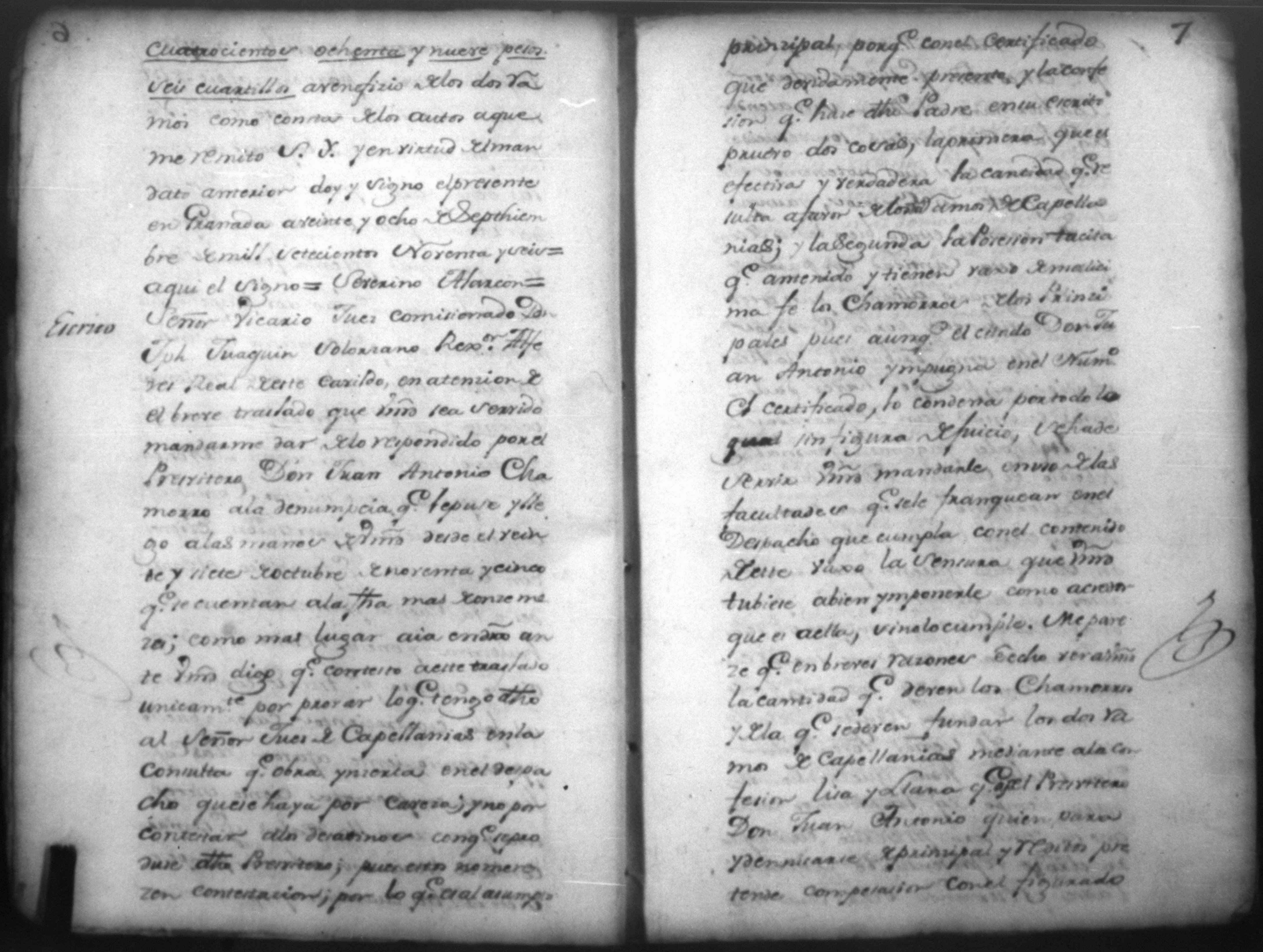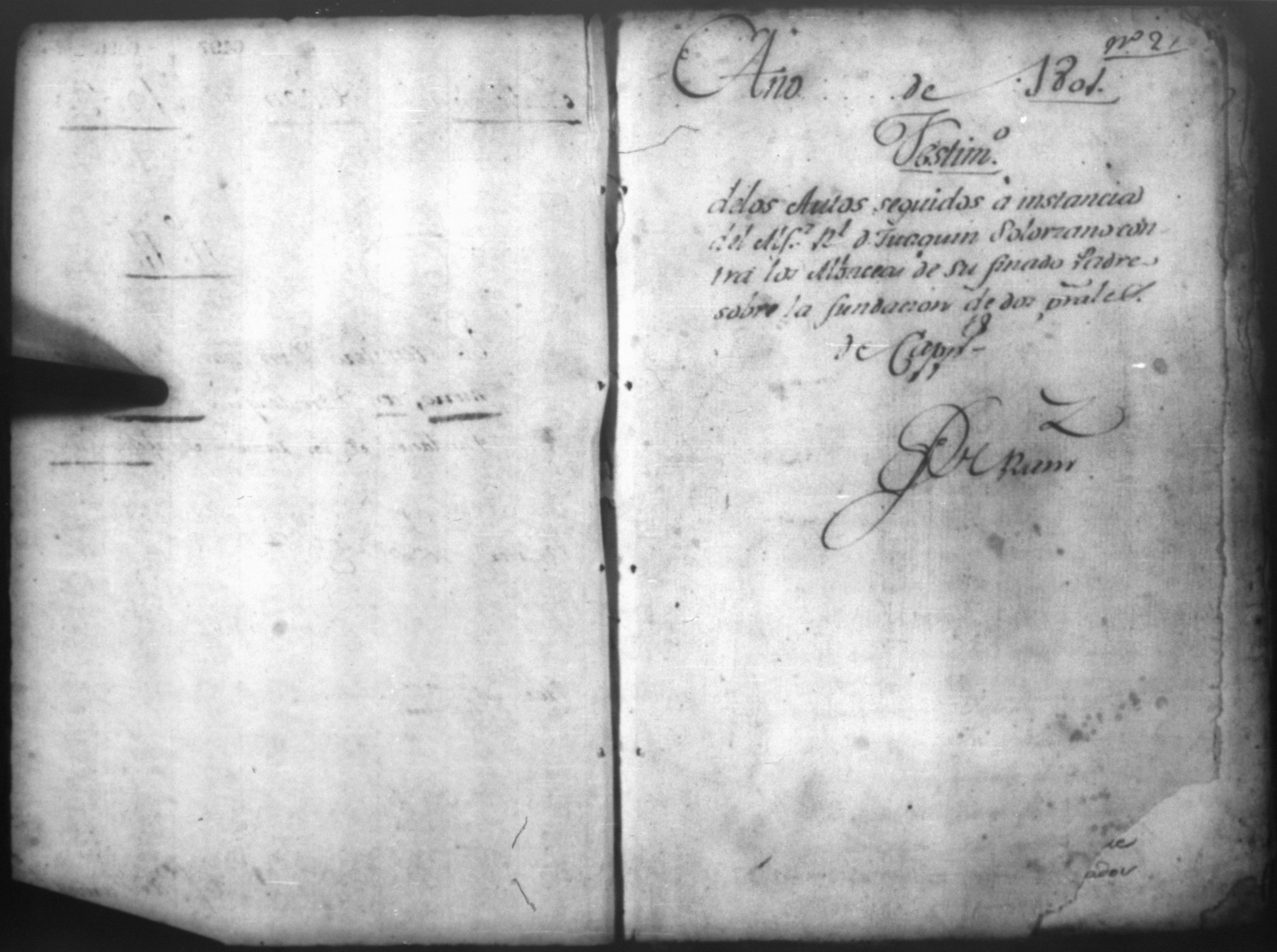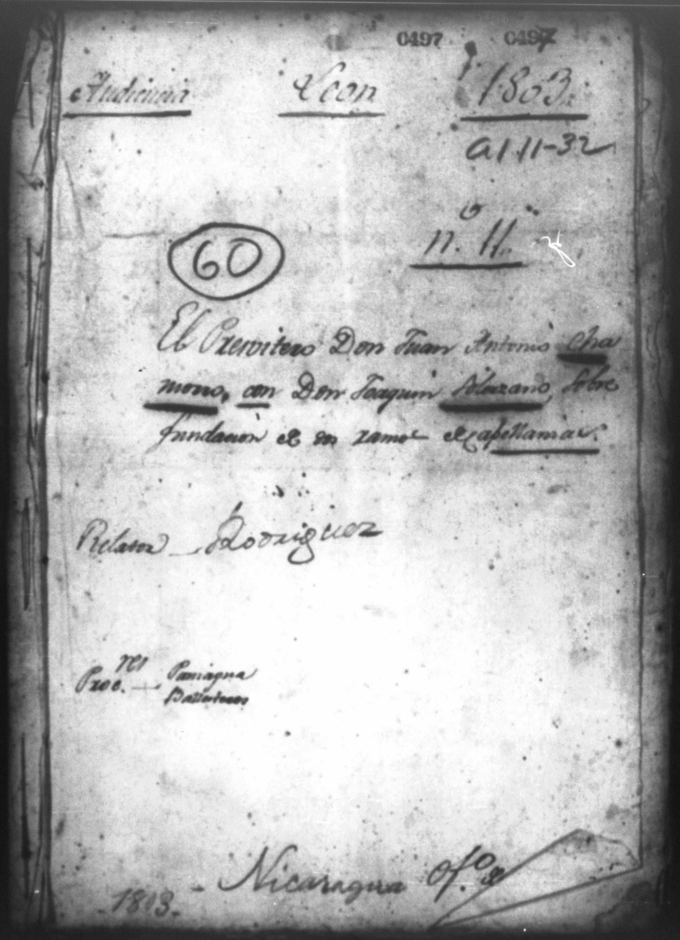 Temática: Audiencia, León 1803. El Presbítero Don Juan Antonio Chamorro, con Don Joaquin Solorzano, sobre fundación de dos ramos de capellanías. Relator Rodriguez