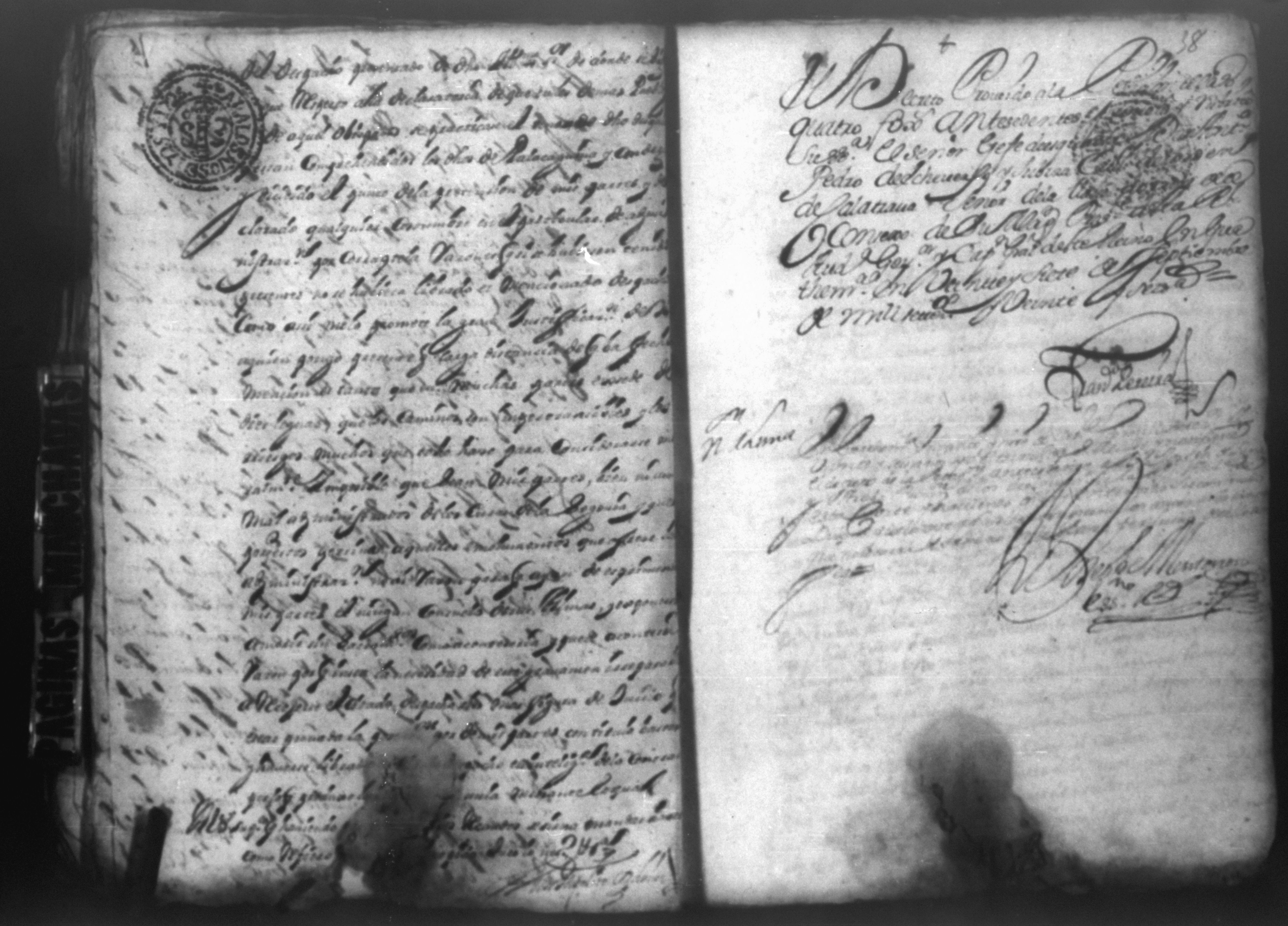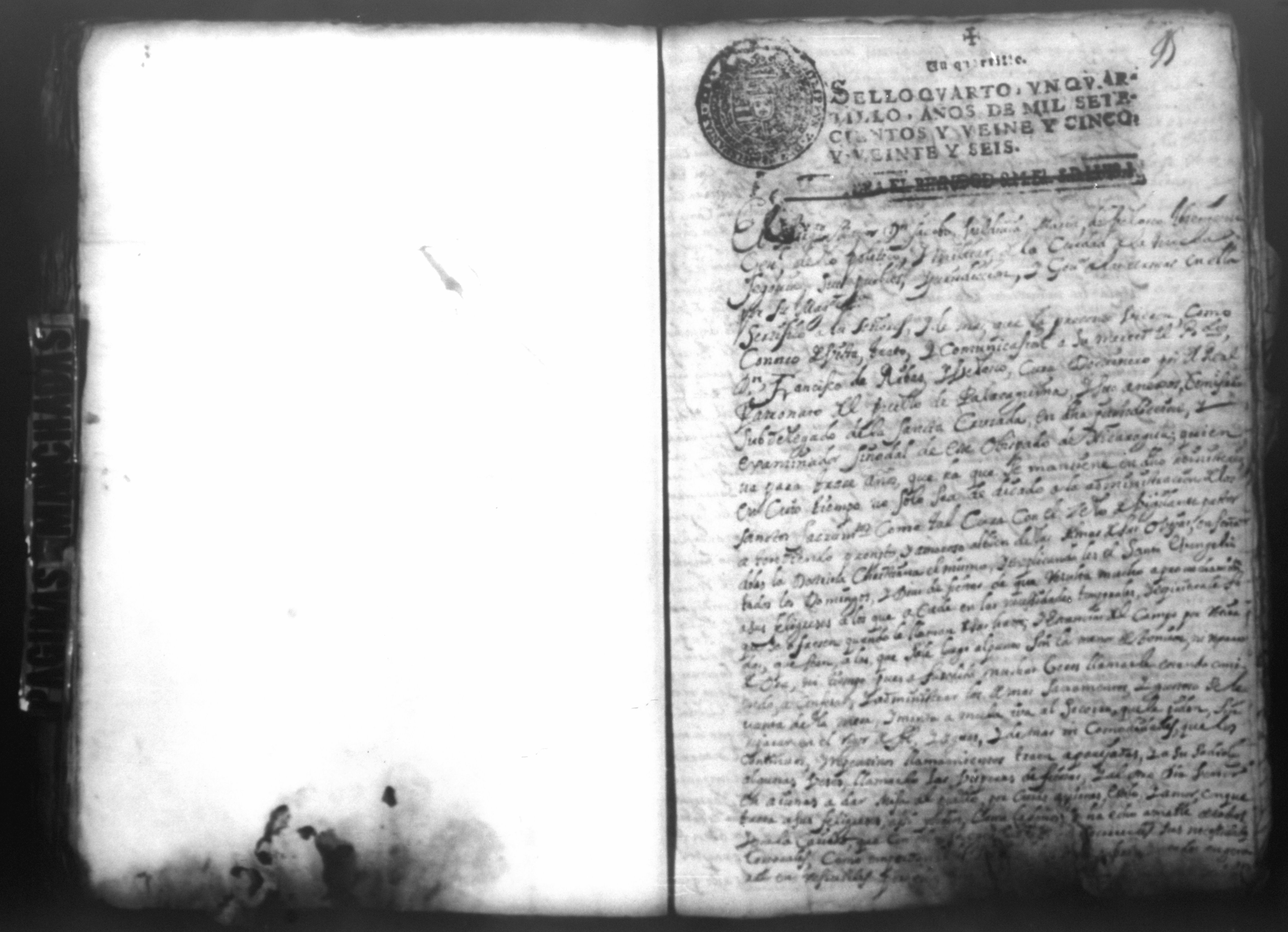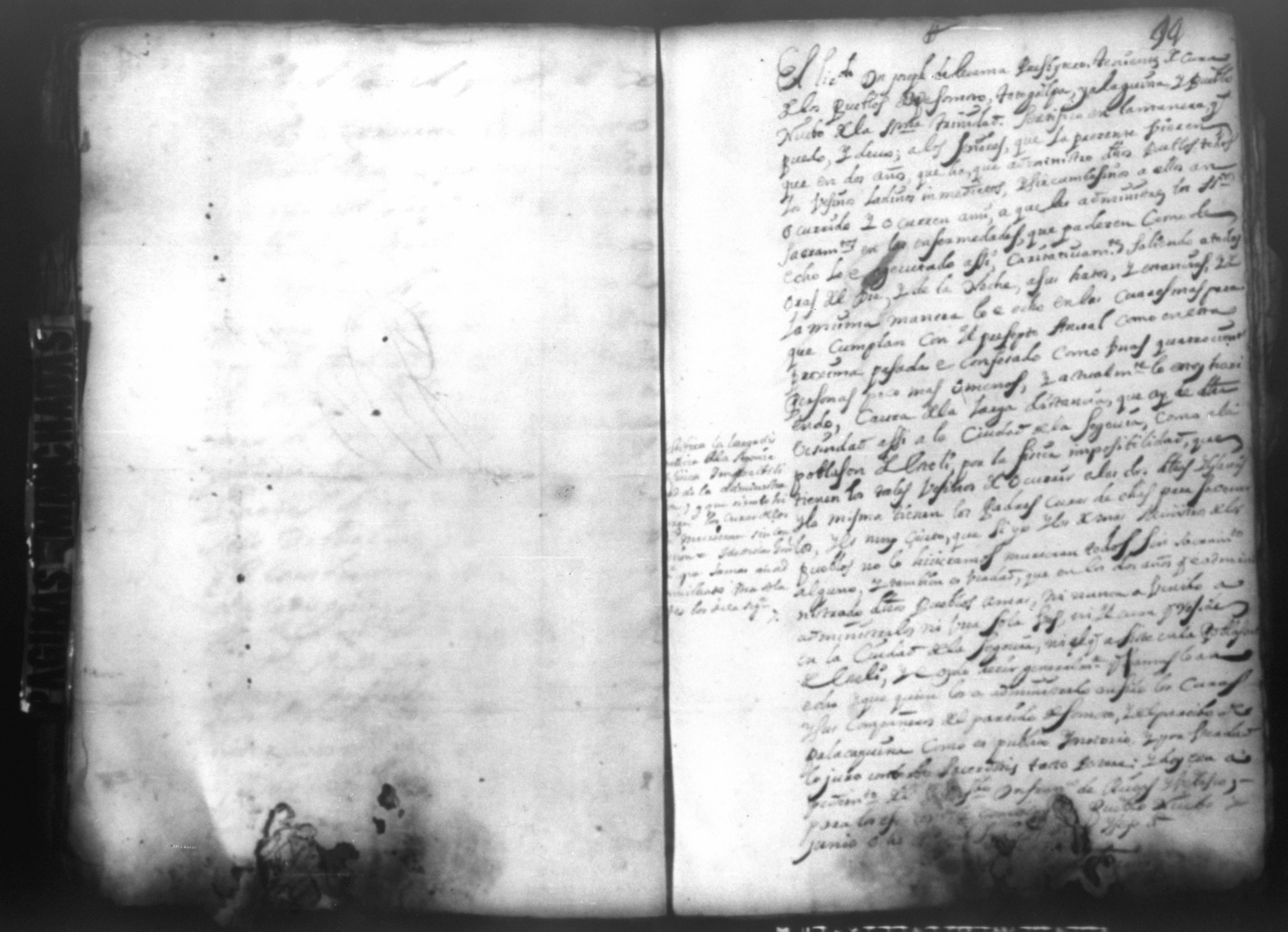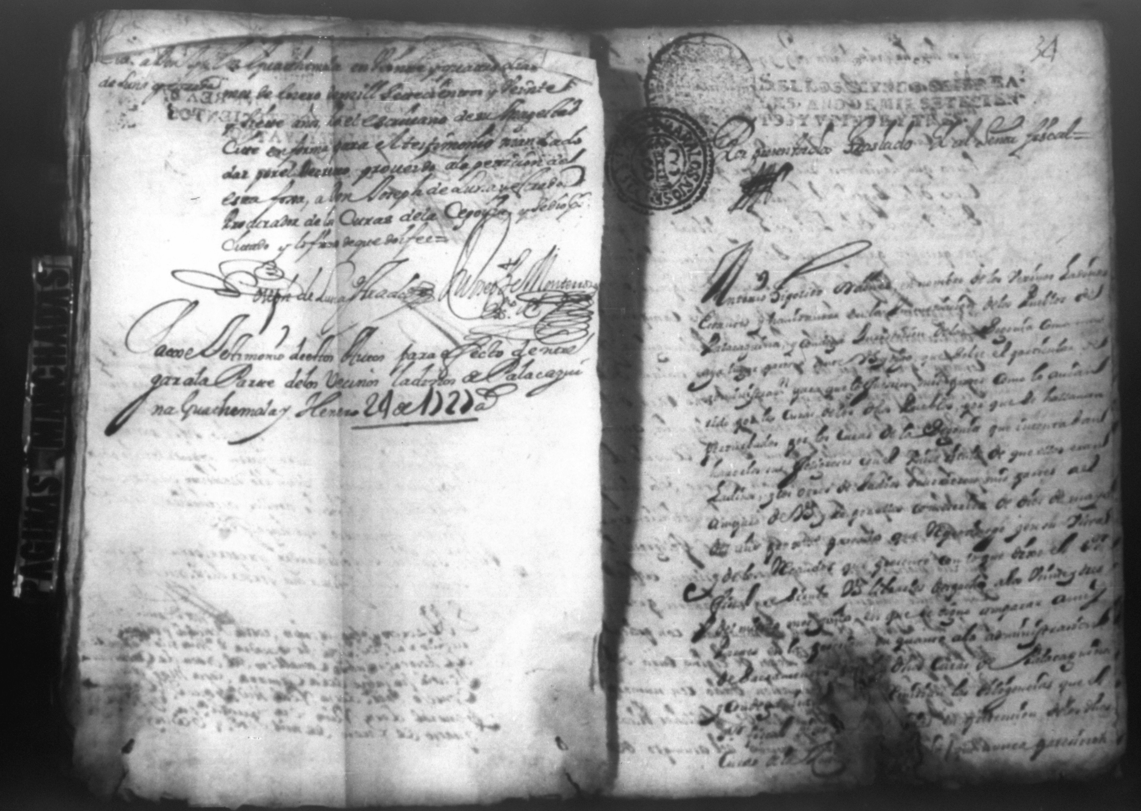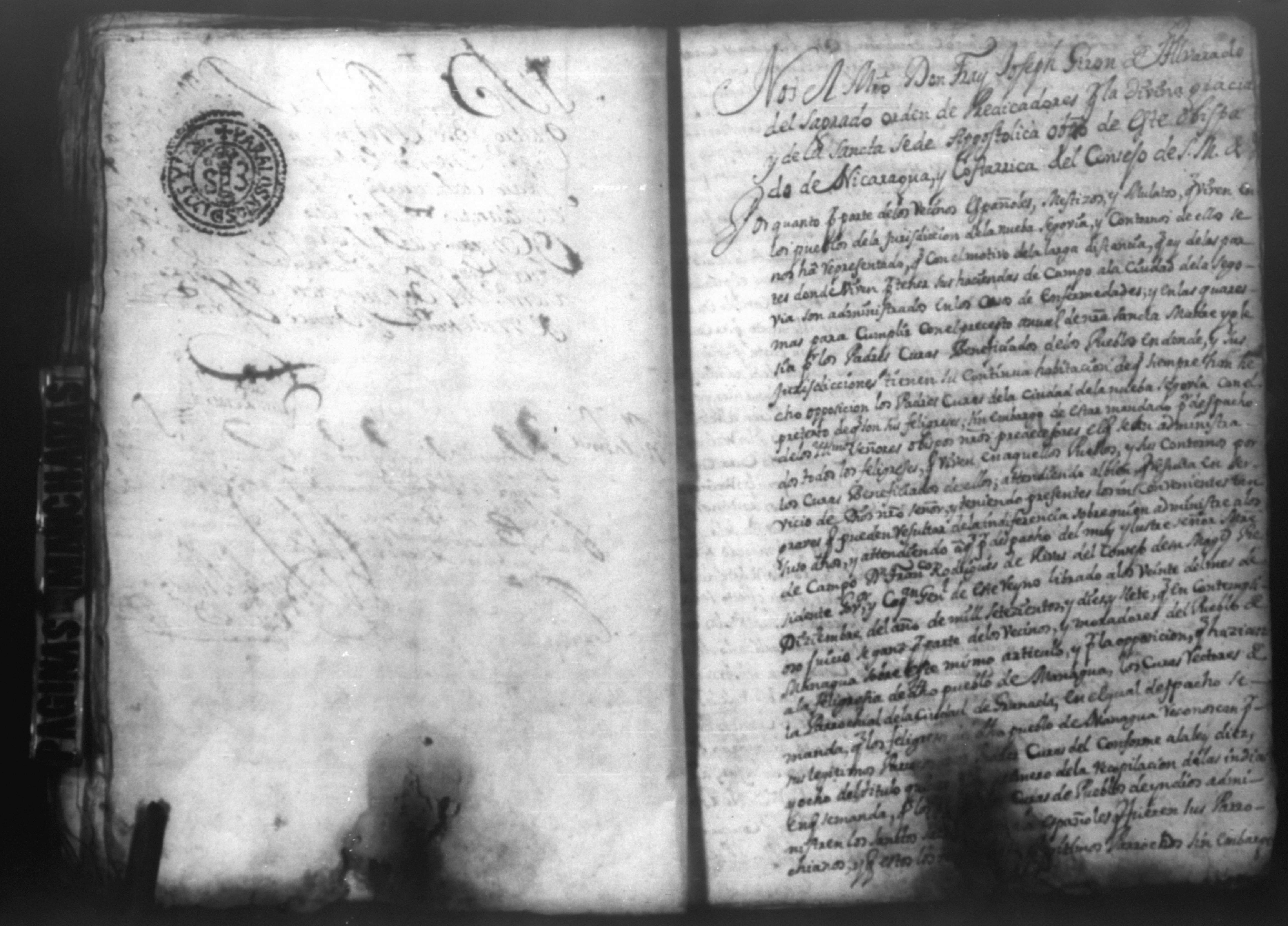 Temática: PÁGINAS MANCHADAS. Nueva Segovia Provincia de Nicaragua. Palacio y Abril 18 de 1725. Al Señor fiscal con los auttos […] El fiscal con vista de este ynforme y escrito presentado por los […] vesinos de la Ciudad de Segovia…