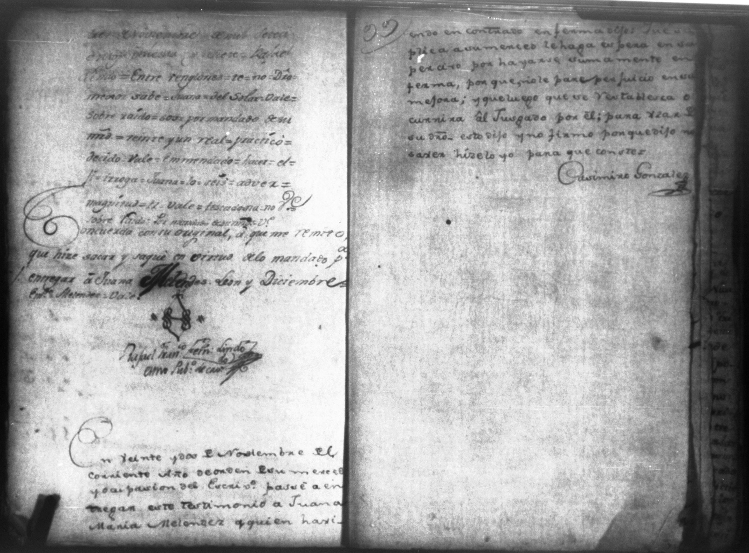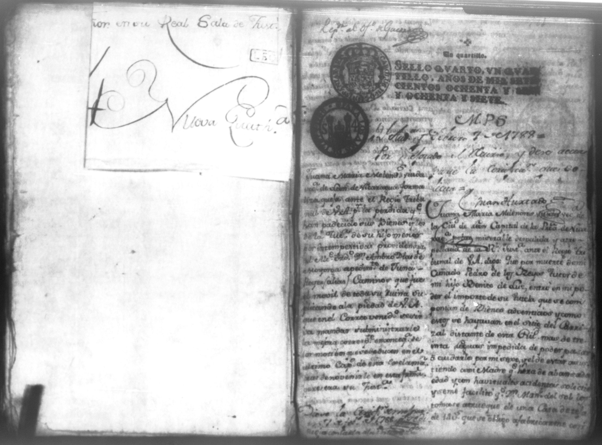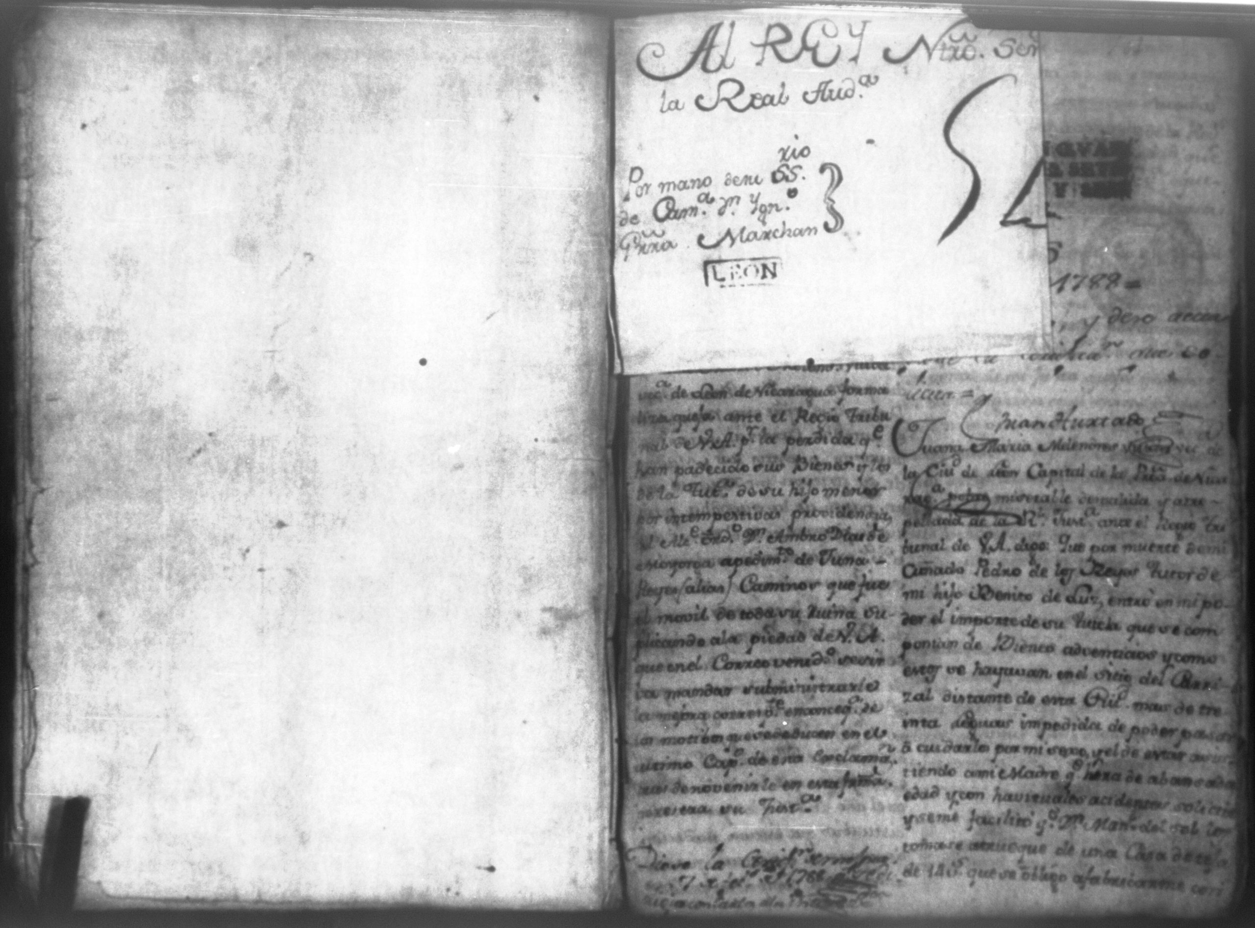 Temática: Audiencia León, 1794. Testimonio de Juana María Melendes por el litigio de un solar contra Juana de los Reyes. "Autos y vistos, y en Locucion a lo respondido por estas partes, llevece a puro, y devido efecto el Auto de fecha de dos del que corre, y en su conseguencia hagacele saver a Juana de los Reyes ... en este Juzgado los (diez) y siete pesos seis rreales que importan las ocho onzas siete octavos de Solar que le pertenece a Juana Melendez y cumplido que sea se le otorgará la escriptura de venta correspondiente que satisfará la consavida Reyes [...]" (Extracto de los folios 19v. y 20, imagen 35)