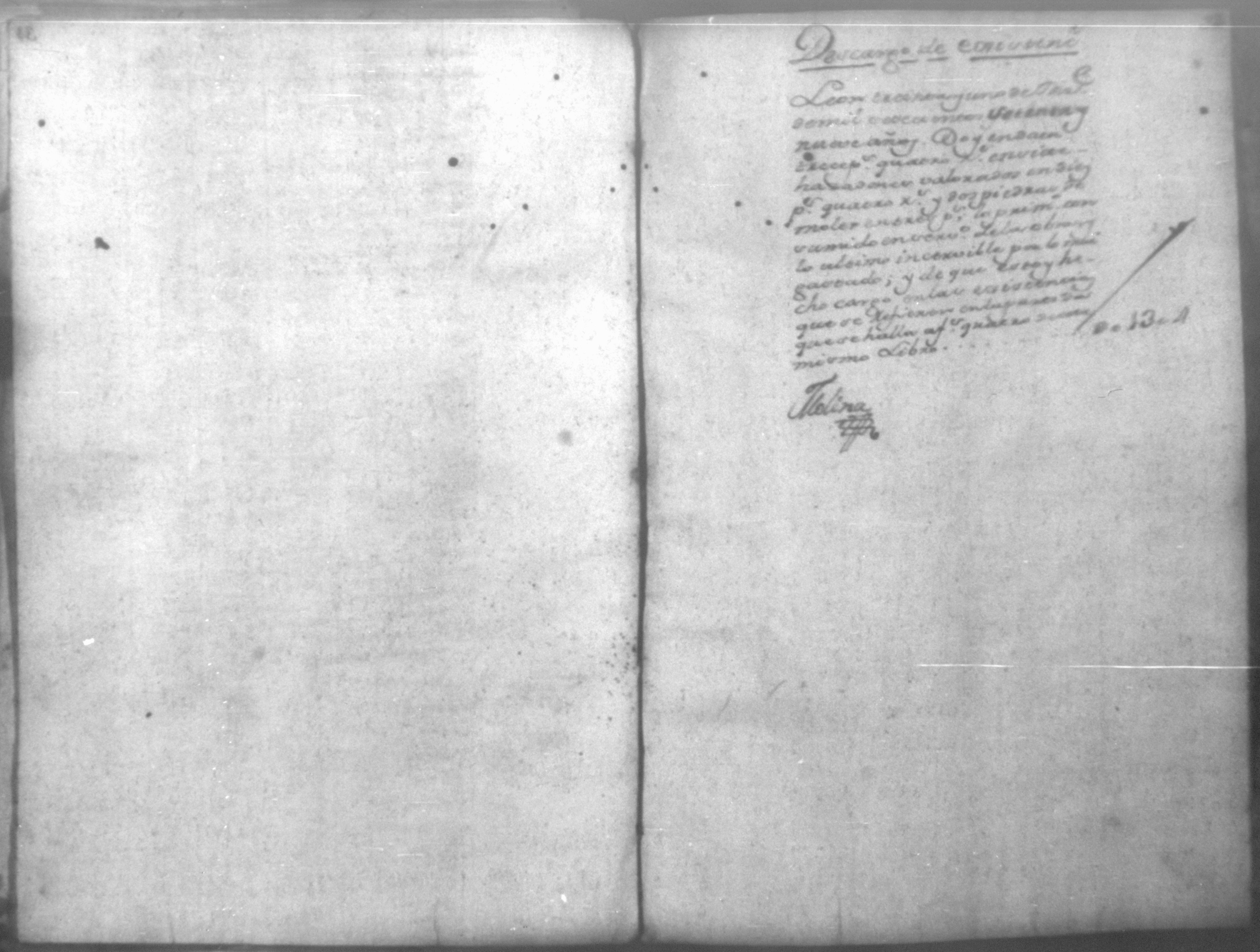 Temática: Libro numerado en quarenta y quatro foxas para el asiento de cargo y data pertenecientes a la economia de la fabrica matherial de esta Santa Iglesia Cathedral que administro; cuyas partidas eran ciertas y verdaderas, lo que juro a Dios Nuestro Señor y una señal de su santa cruz y lo firmo en esta ciudad de León en dos de enero de mil setecientos y nueve años Manuel Joseph de Molina (Rubrica).