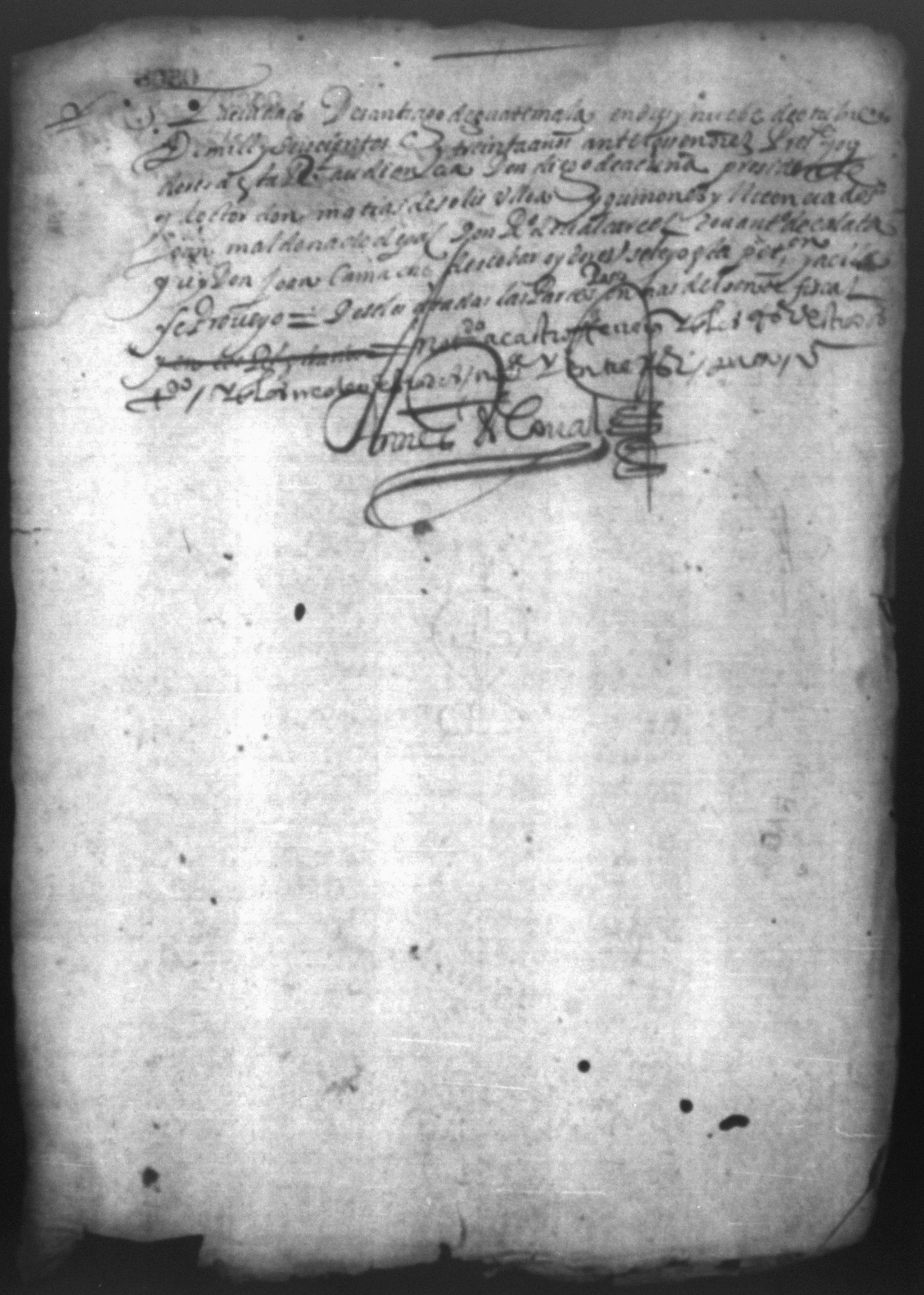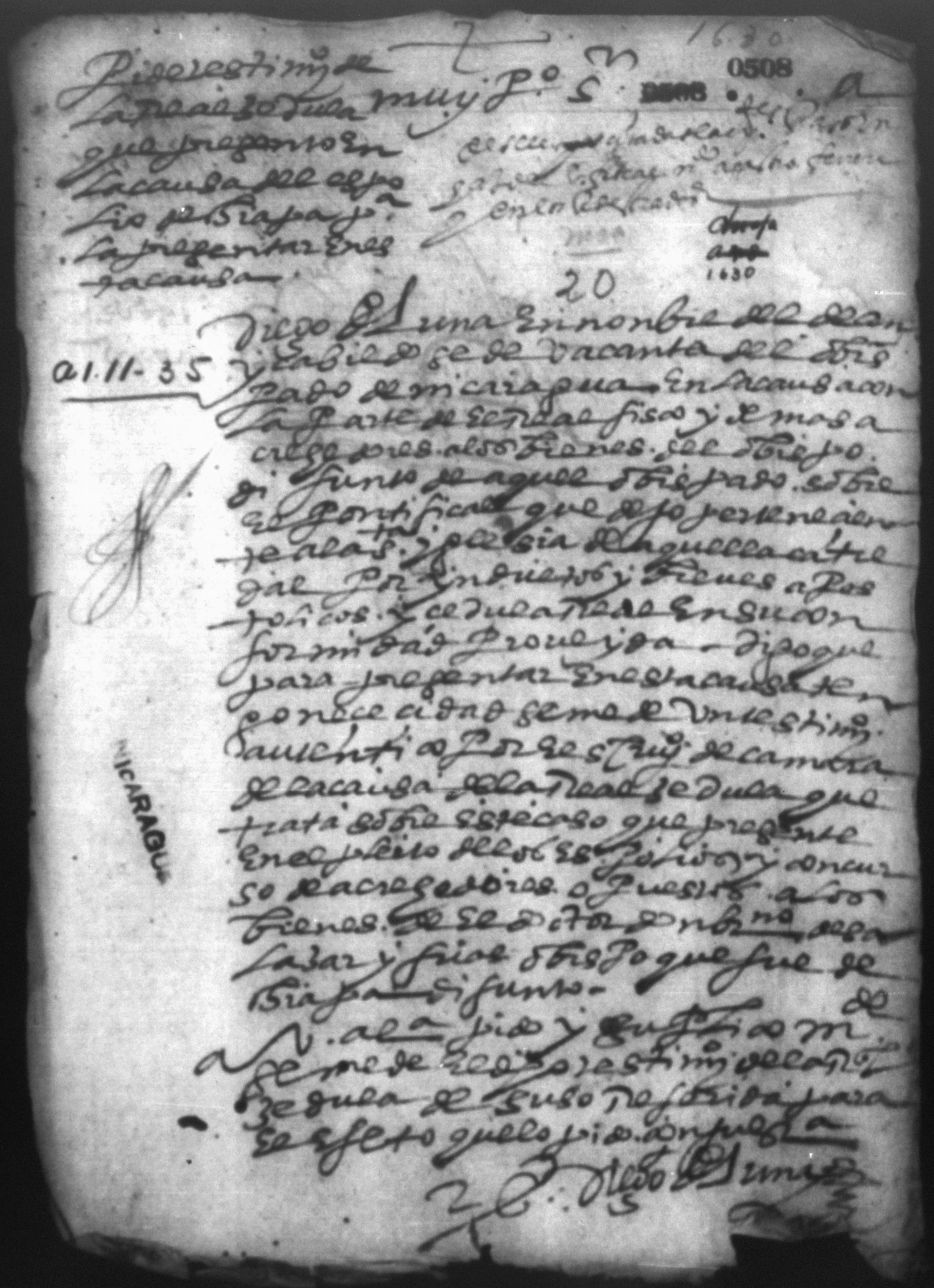 Temática: Pedimiento de Don Diego de Luna año 1630. Pide testimonio de la Real (…) Audiencia que pregunto (sic) en la causa del expolio del obispo (sic) para la presentacion en esta causa