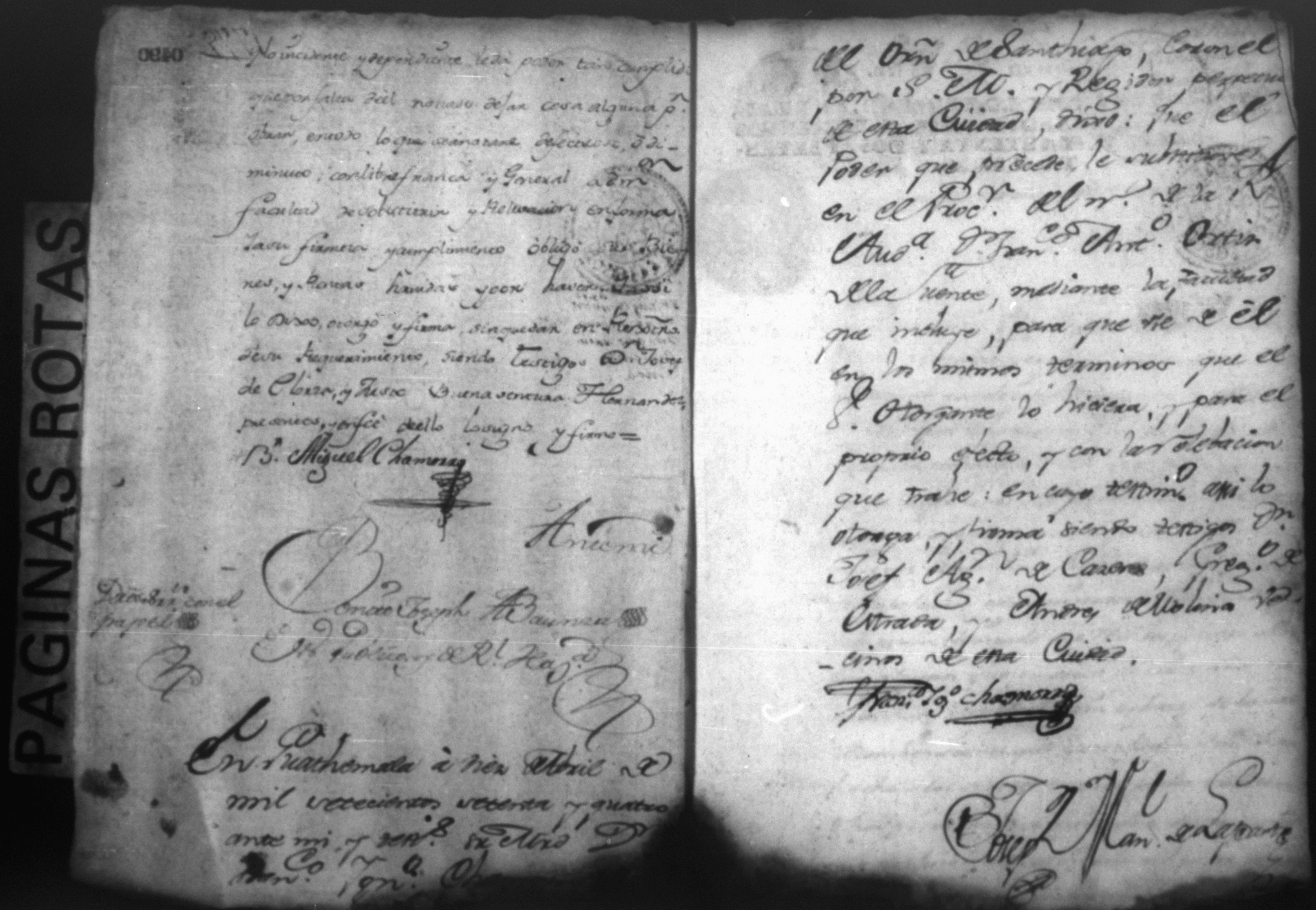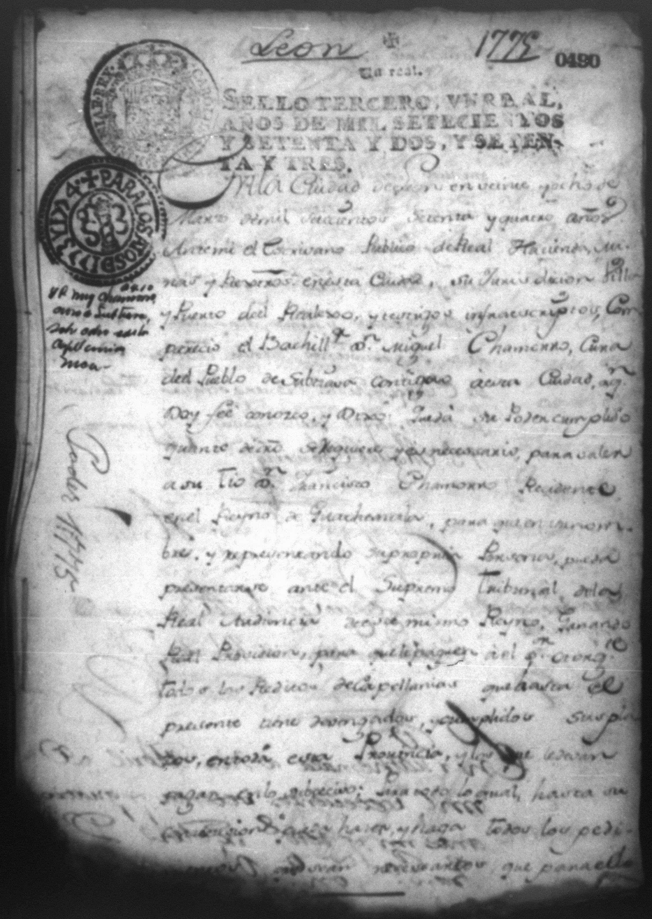 Temática: Escritura de poder otorgado por el Bachiller Don Miguel Chamorro, Cura del pueblo de [Subtiava] a su tío Don Francisco Chamorro para que lo represente.