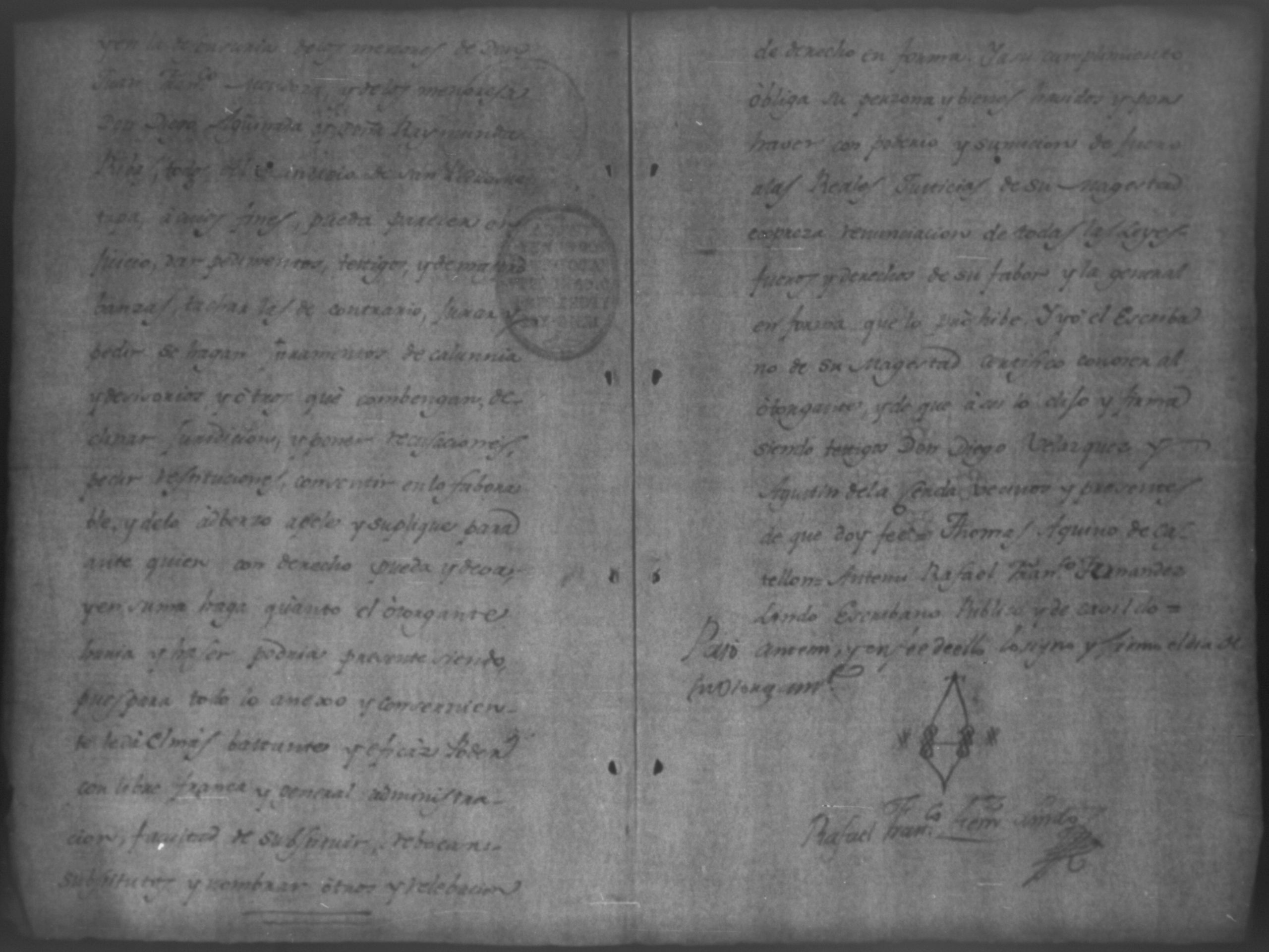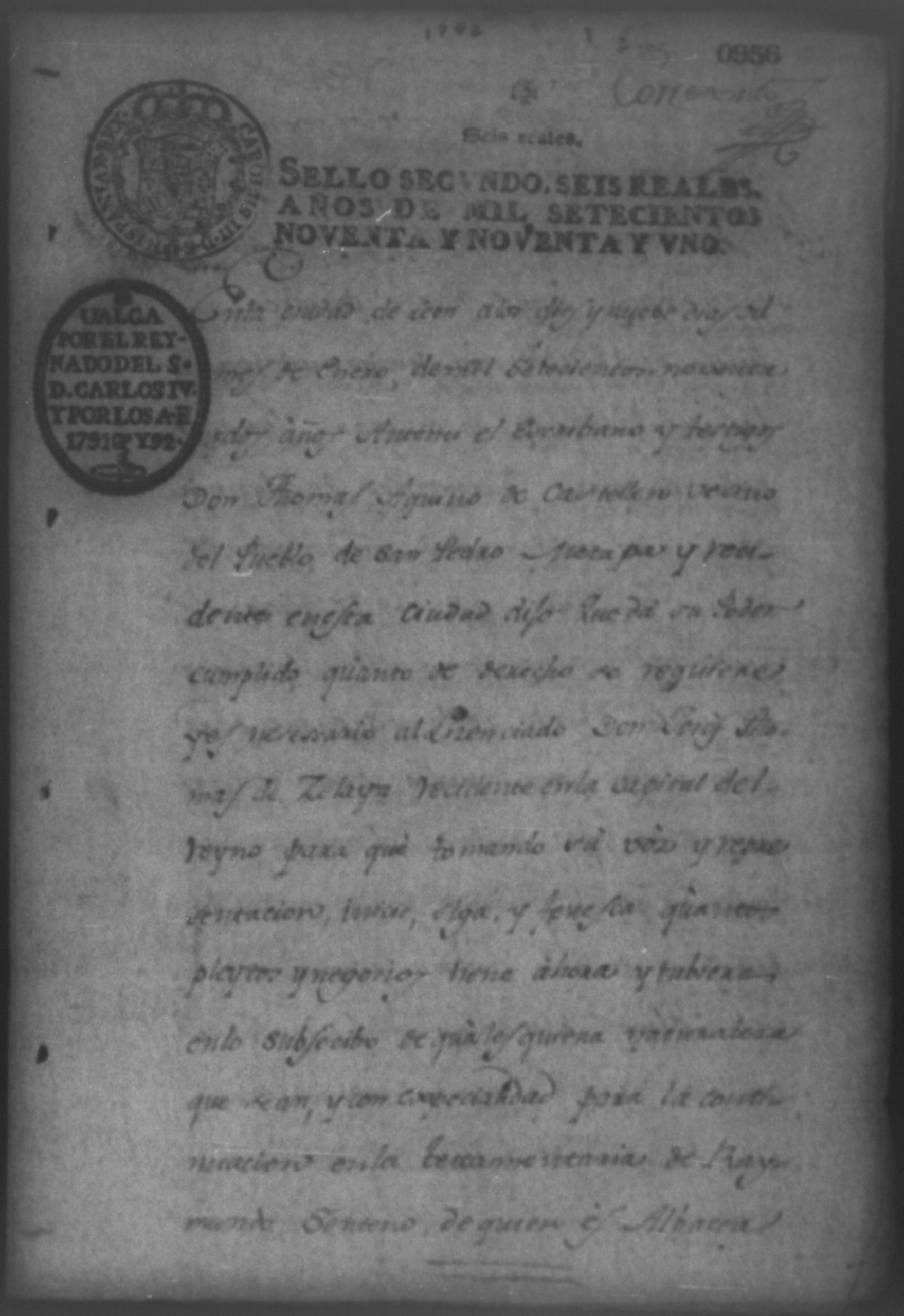 Temática: León, 1792. Poder que otorga Thomas Aquino de Castellón al licenciado Josef Thomas de Zelaya, para que sea su representante legal en todos sus asuntos y negocios. "En la ciudad de Leon a los dies y nuebe dias del mes de enero, de mil setecientos noventa y dos años. Ante mi el Escribano y testigos Don Thomas Aquino de Castellon vecino del pueblo de San Pedro Metapa y recidente en esa ciudad dijo que da su poder cumplido quanto de derecho se requiere y es necesario al Lizenciado Don Josef Thomas de Zelaya, recidente en la capital del reino para que tomando su voz y representacion, inicie, siga, y fenesca quantos pleitos y negocios tiene ahora y tubiera en lo subsecivo de quales quiera naturaleza que sean, y con expecialidad para la continuacion en la testamentaria de quien es Albacea y en la [desisioria] de los menores de Don Juan Francisco Mendoza, y de los menores de don Diego Aguinada y doña Raymunda Ribas [...]." (Extracto de los folios 1 y 1v.).