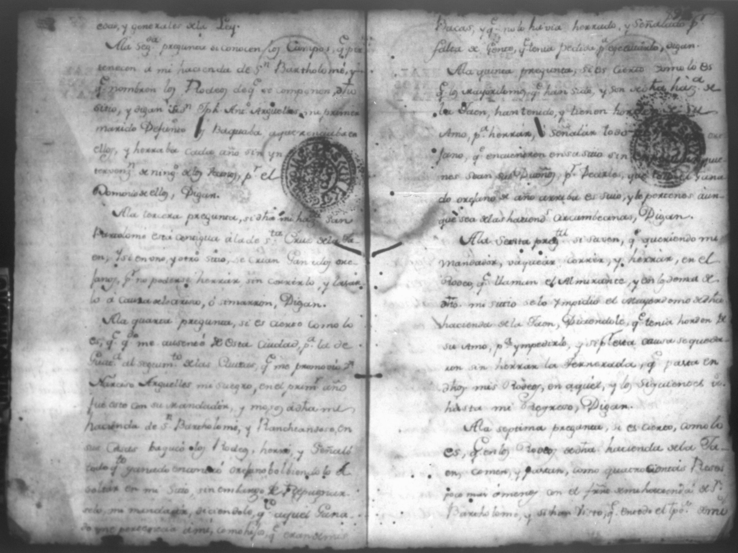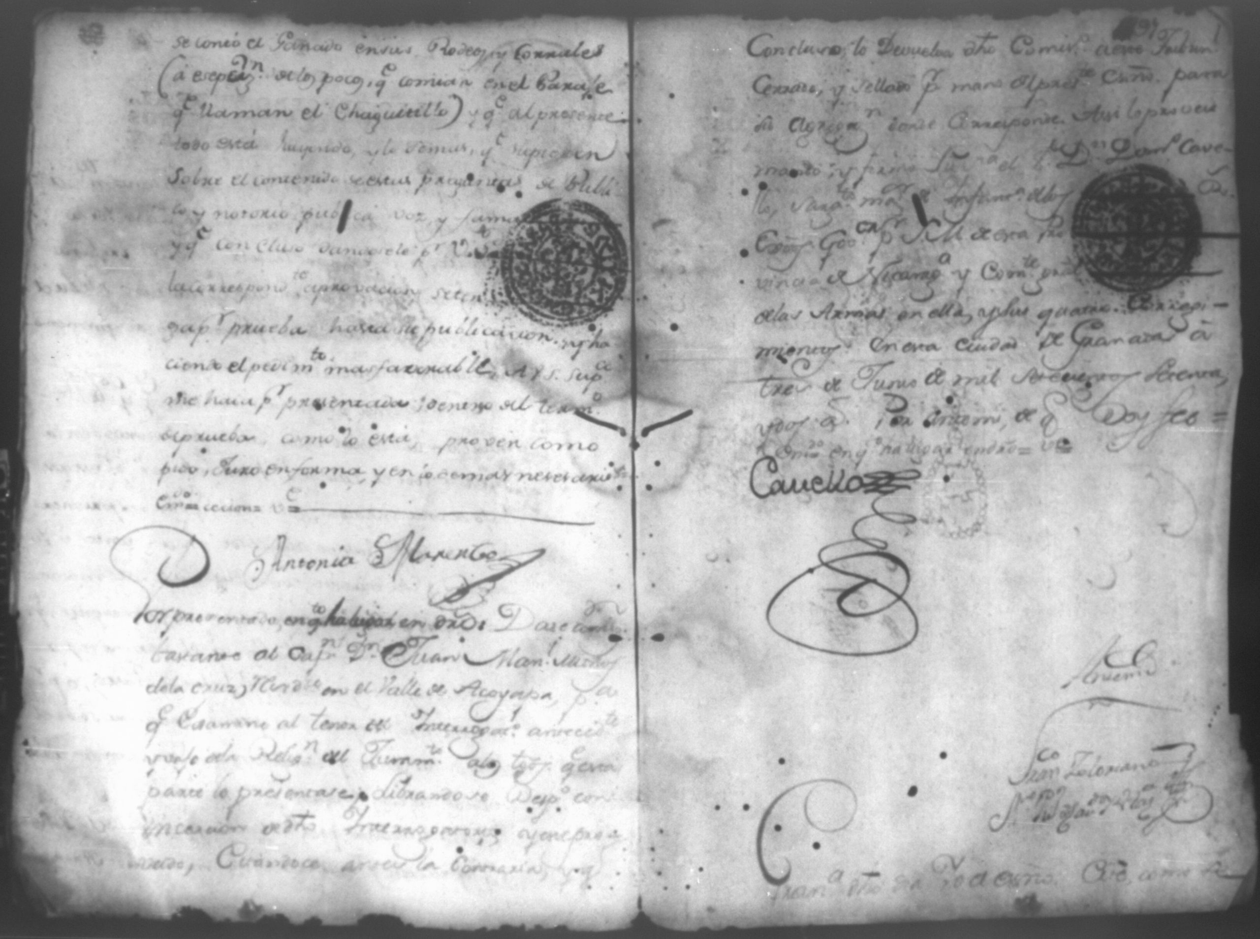 Temática: Pruebas de la parte de Don Rafael Dias Cabeza de Baca en la causa que en contra el señor Don Francisco Antonio de Ugarte. Doña Antonia Marenco vecina de la ciudad de Leon y residente en esta de Granada, mujer legitima del señor Raphael Dias Caveza de Baca, de que tengo poder constante para el seguimiento de la causa que en contra el sigue Don Francisco Antonio de Ugarte de este vecindario en el tribunal de vuestra señoria por haber horcado dos toros orejanos en su stero de San Bartolome.