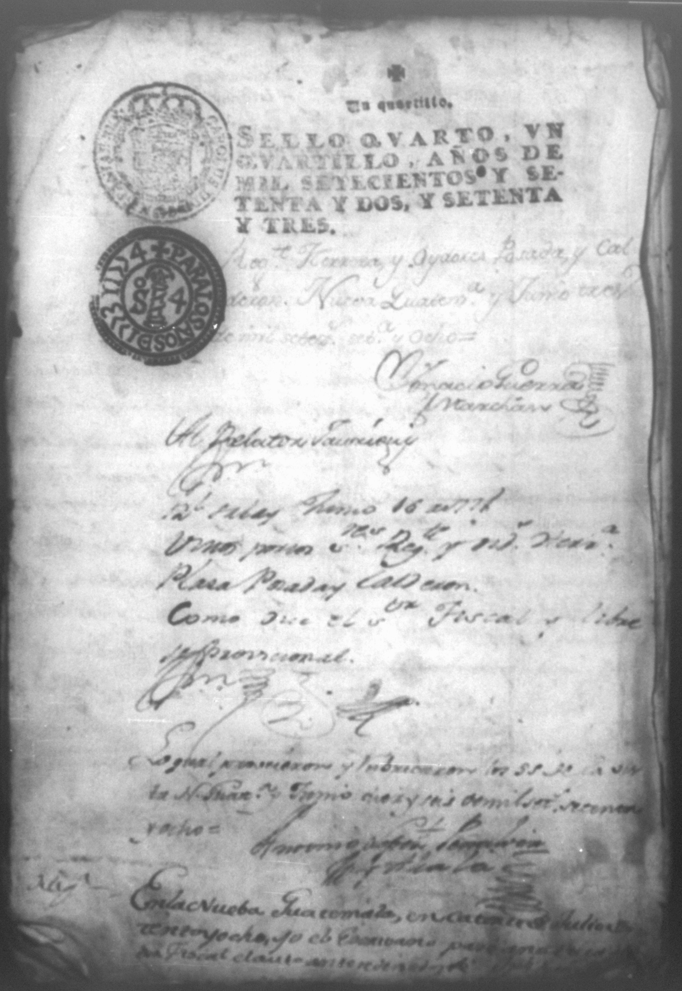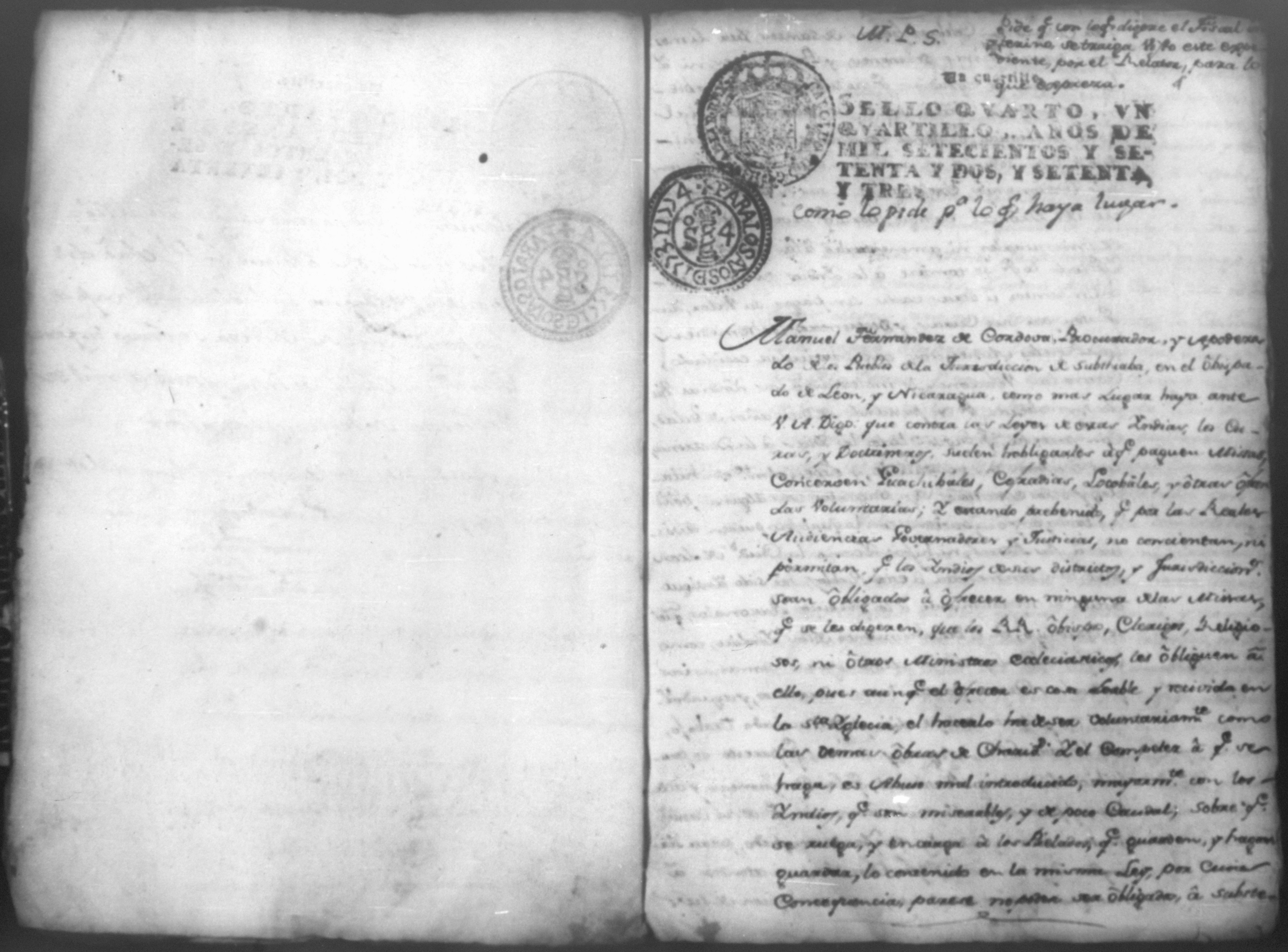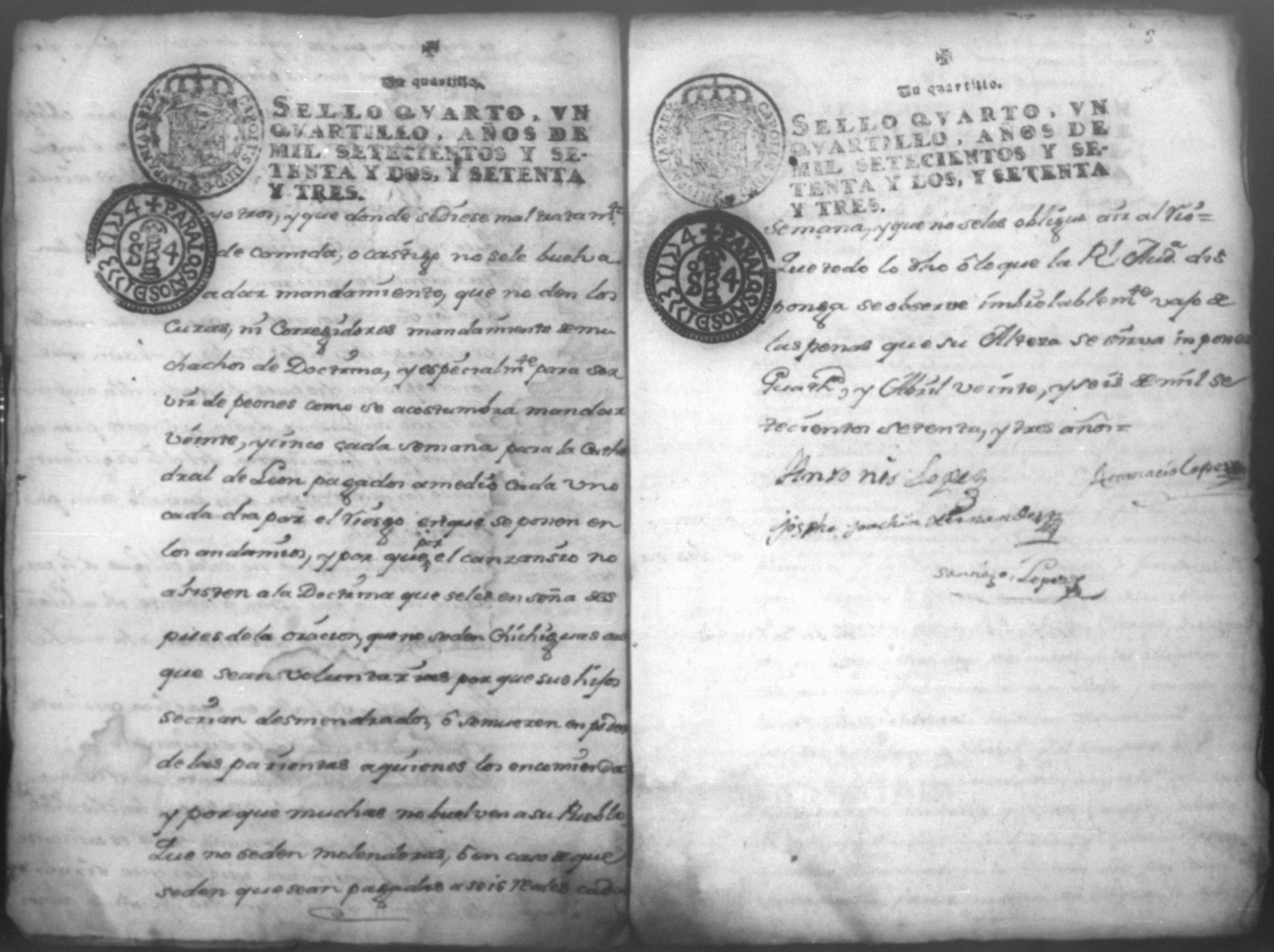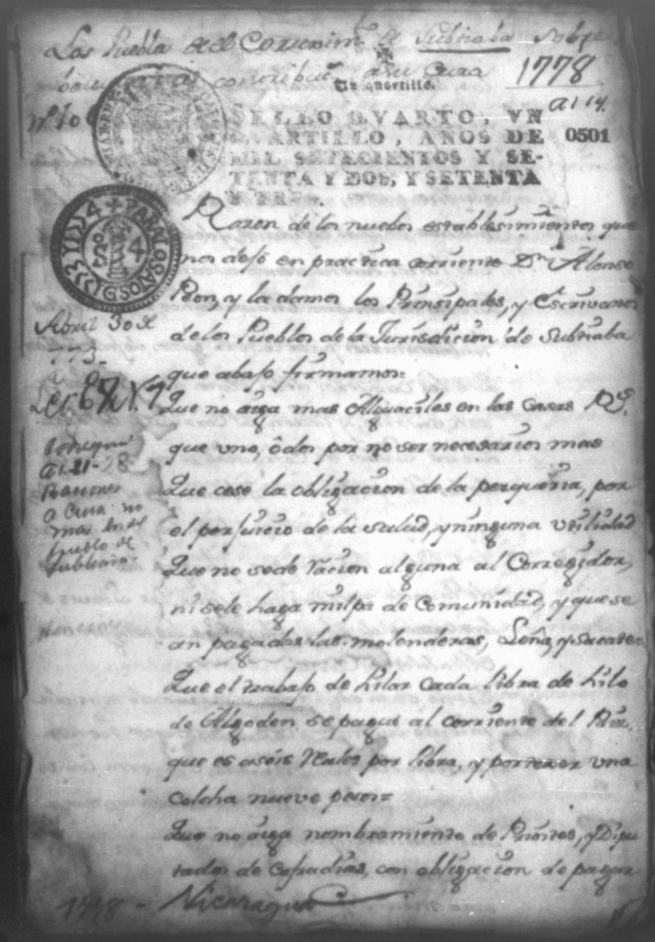 Temática: Razón de los nuevos establesimientos que nos dejó en practica corriente Don Alonso Peon y la damos los Principales y Escribanos de los pueblos de la jurisdicción de Subtiaba. Abril 30 de 1773. Firmas: Santiago Lopez