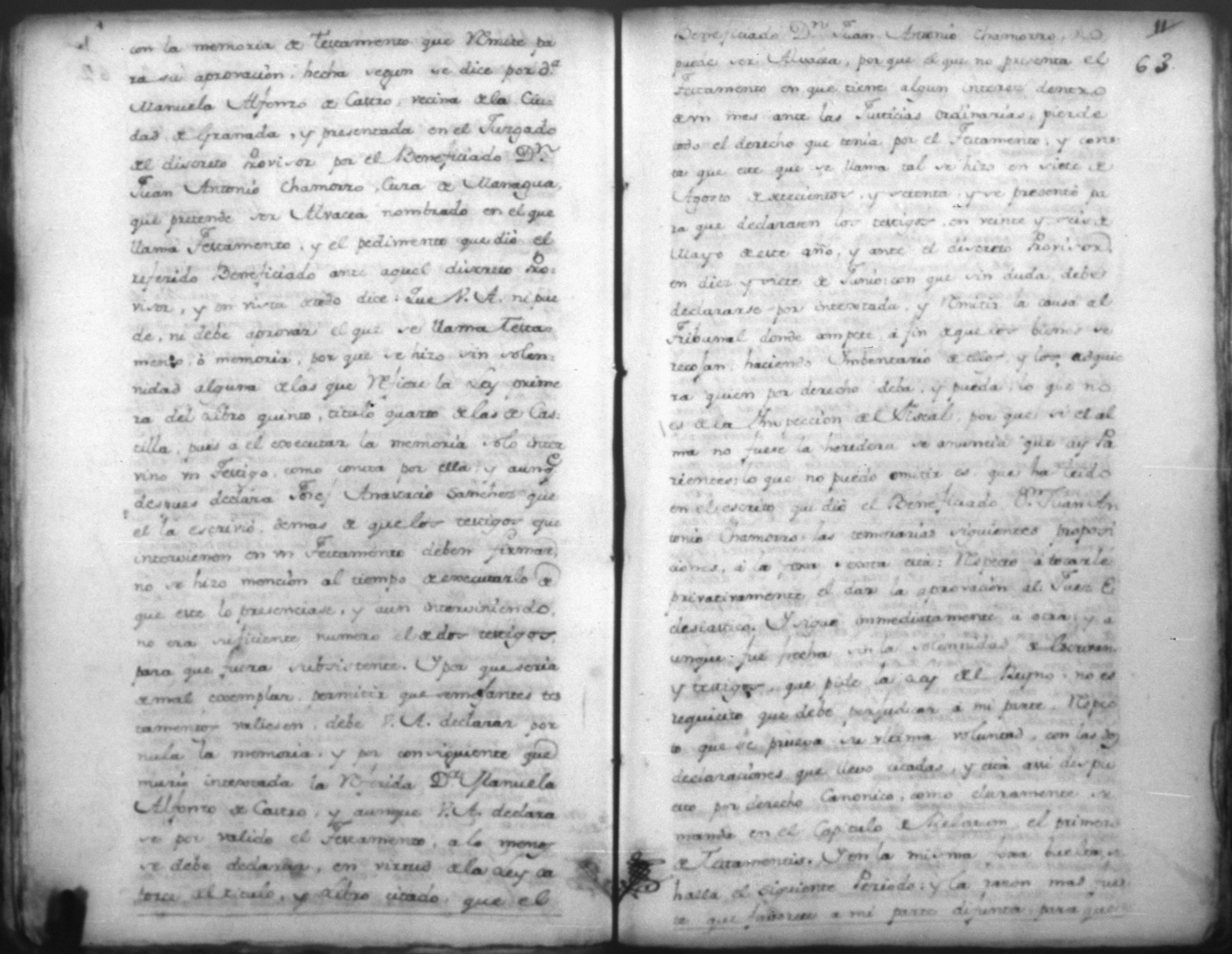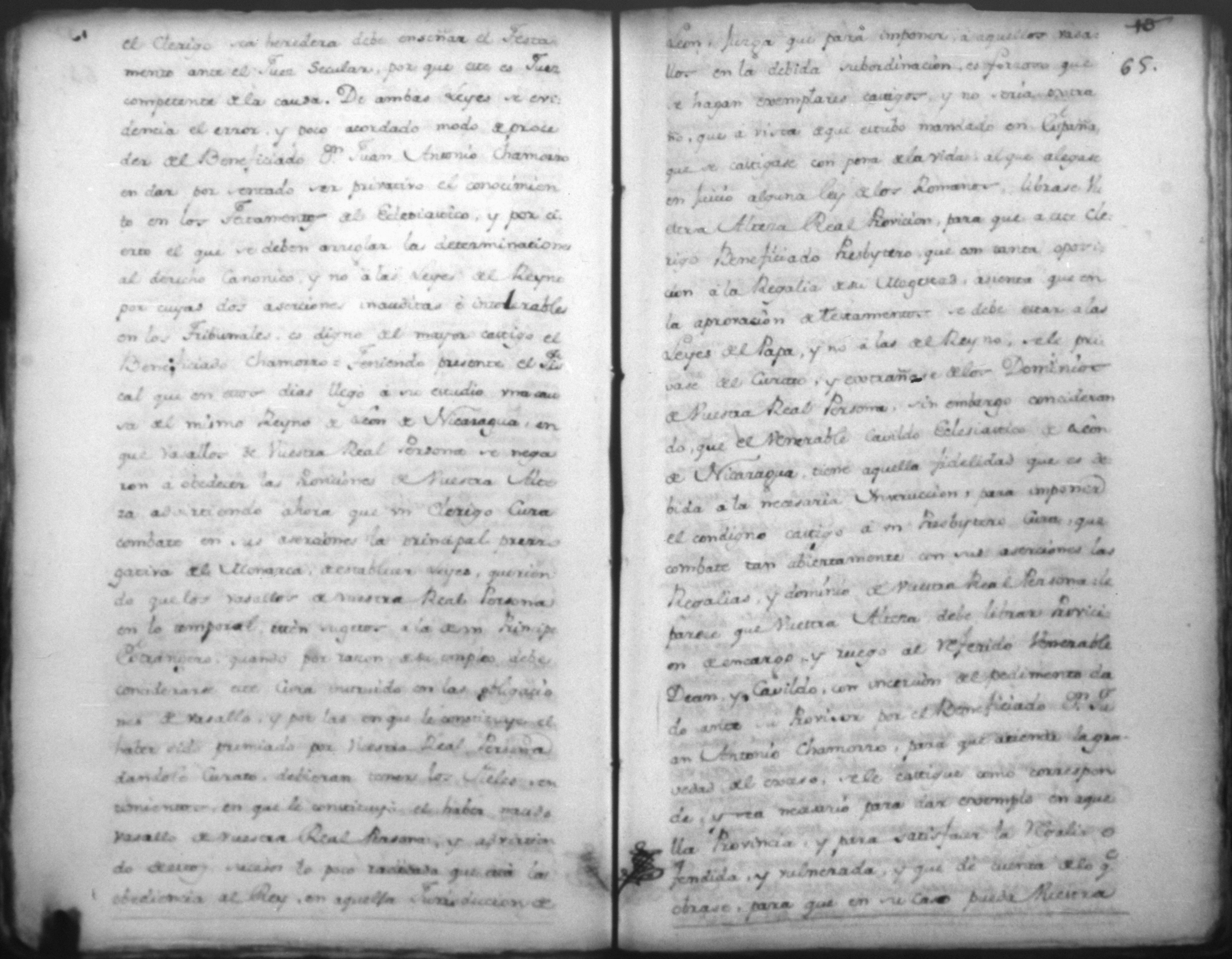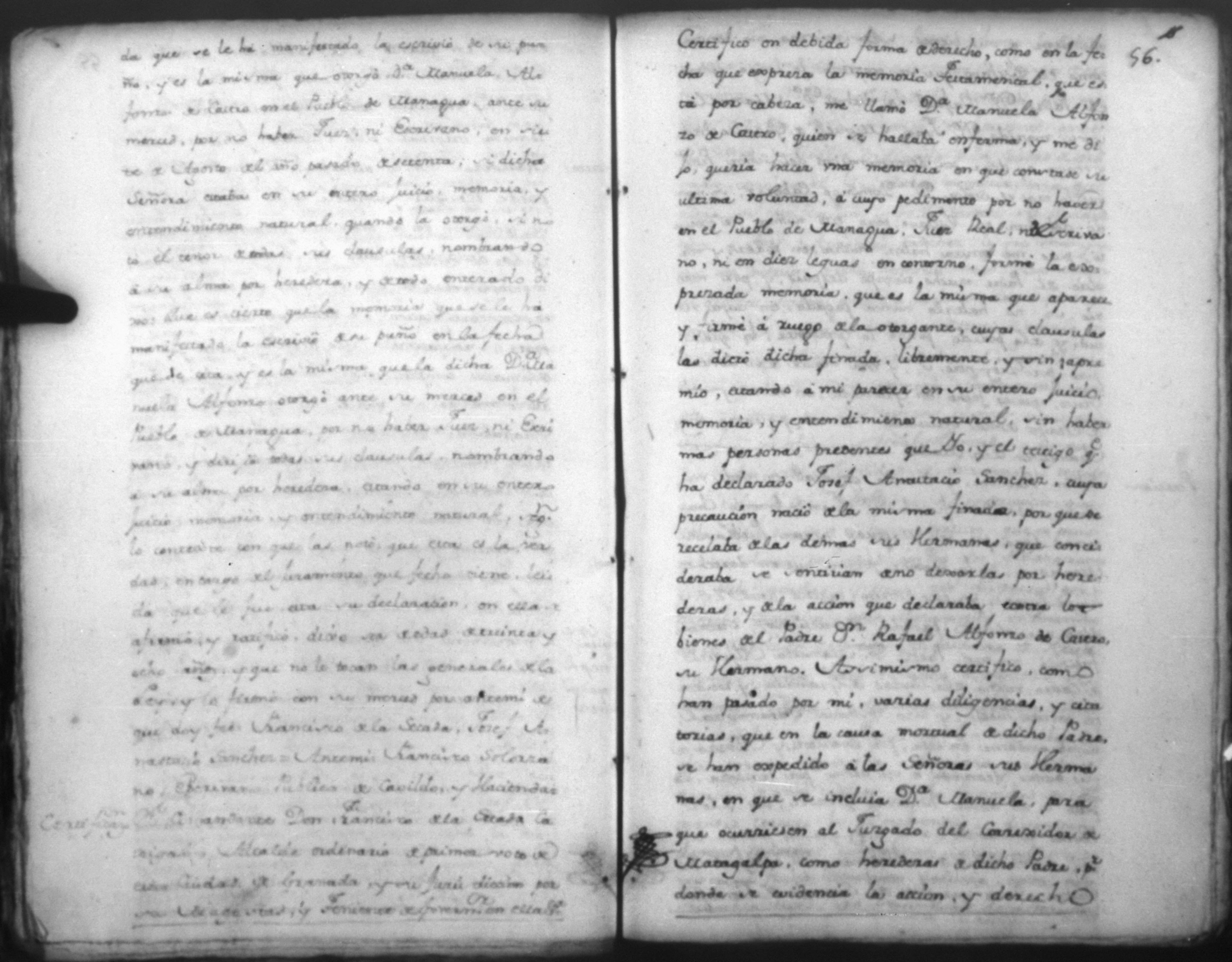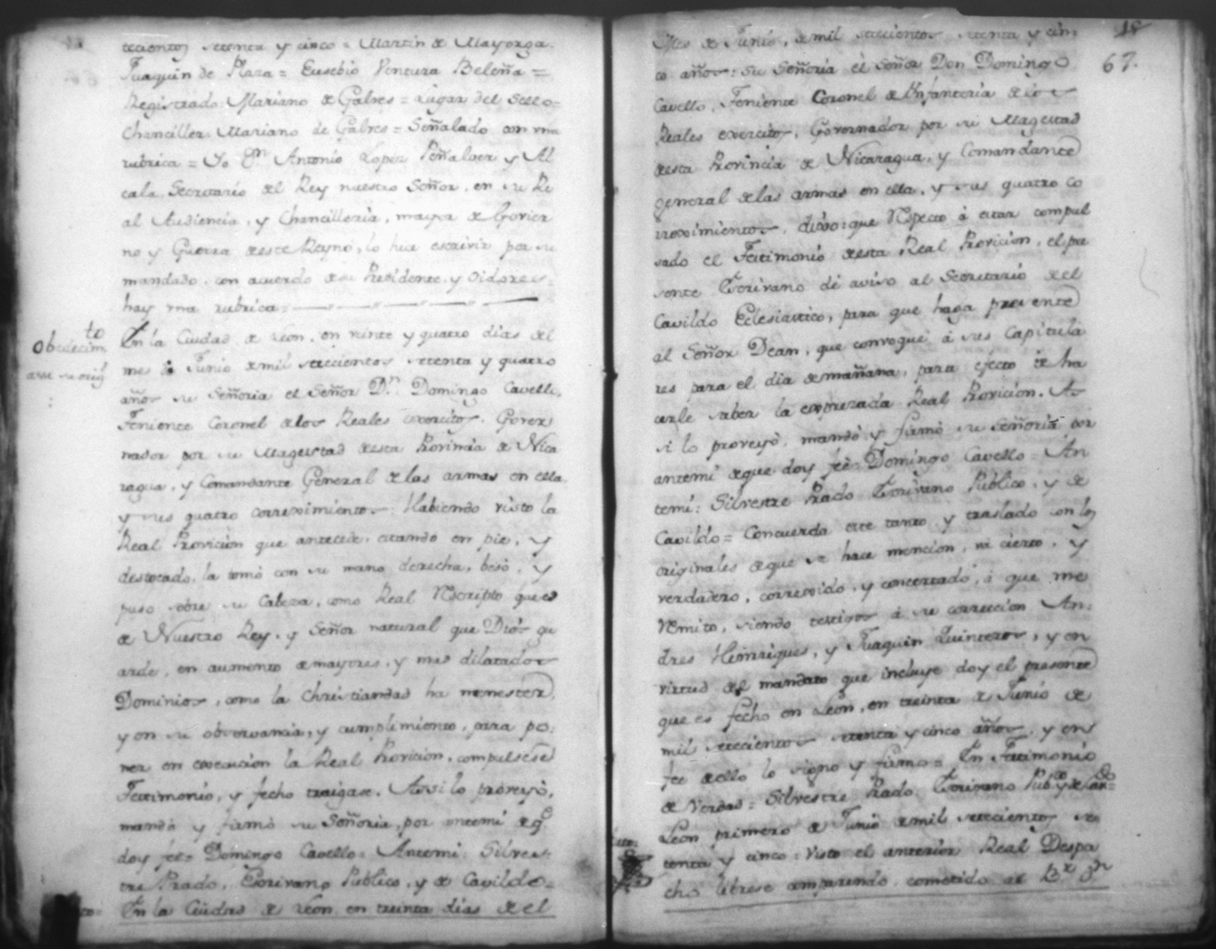 Temática: Real Provición de ruego y encargo librada al Cavildo cede vacante de la Santa Iglesia Catedral de la Ciudad de León para que castigue como corresponde al Cura [Benefiado] del Pueblo de Managua y como consecuencia del haberse declarado intestada a Doña Manuela Alfonso de Castro y Provisión librada en que se hace al (...)General de Primer voto de [Nicaragua]. Oficio Peñalver.
